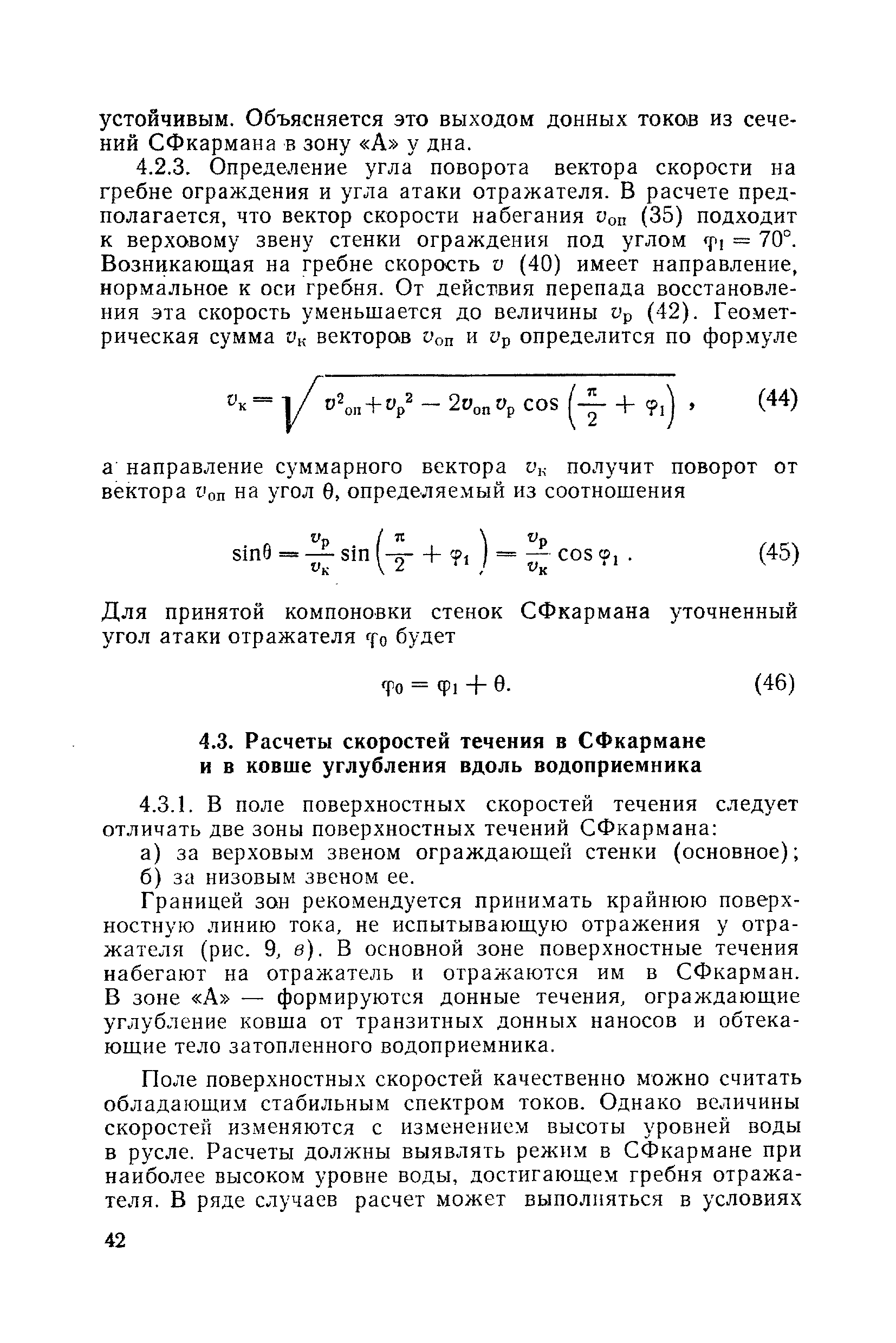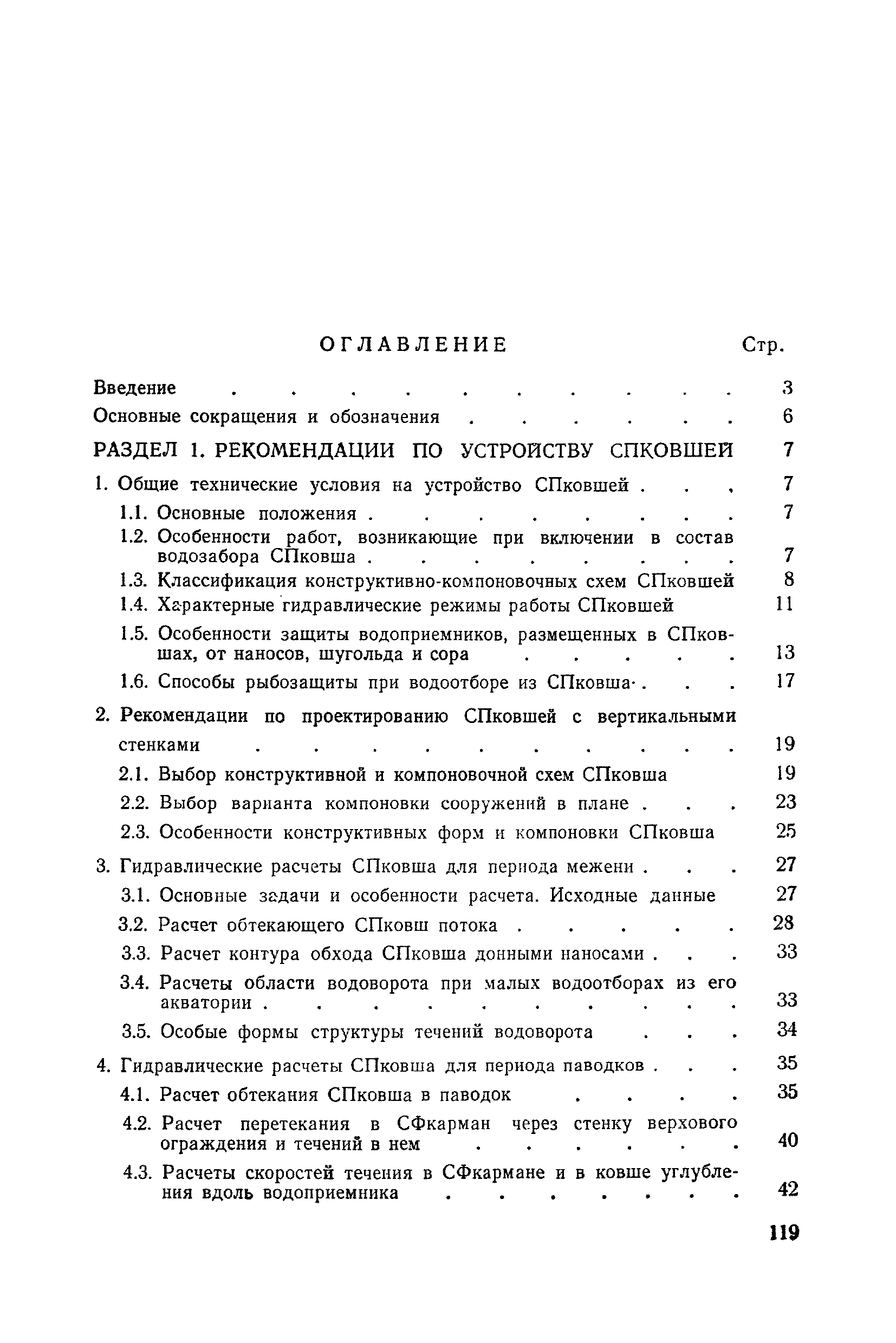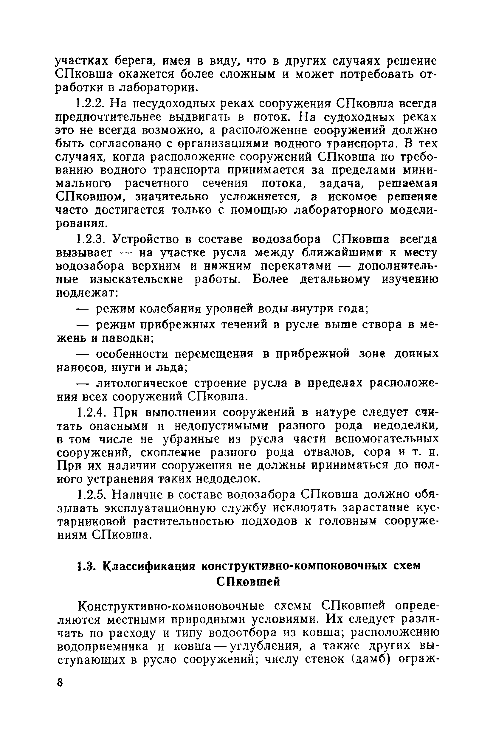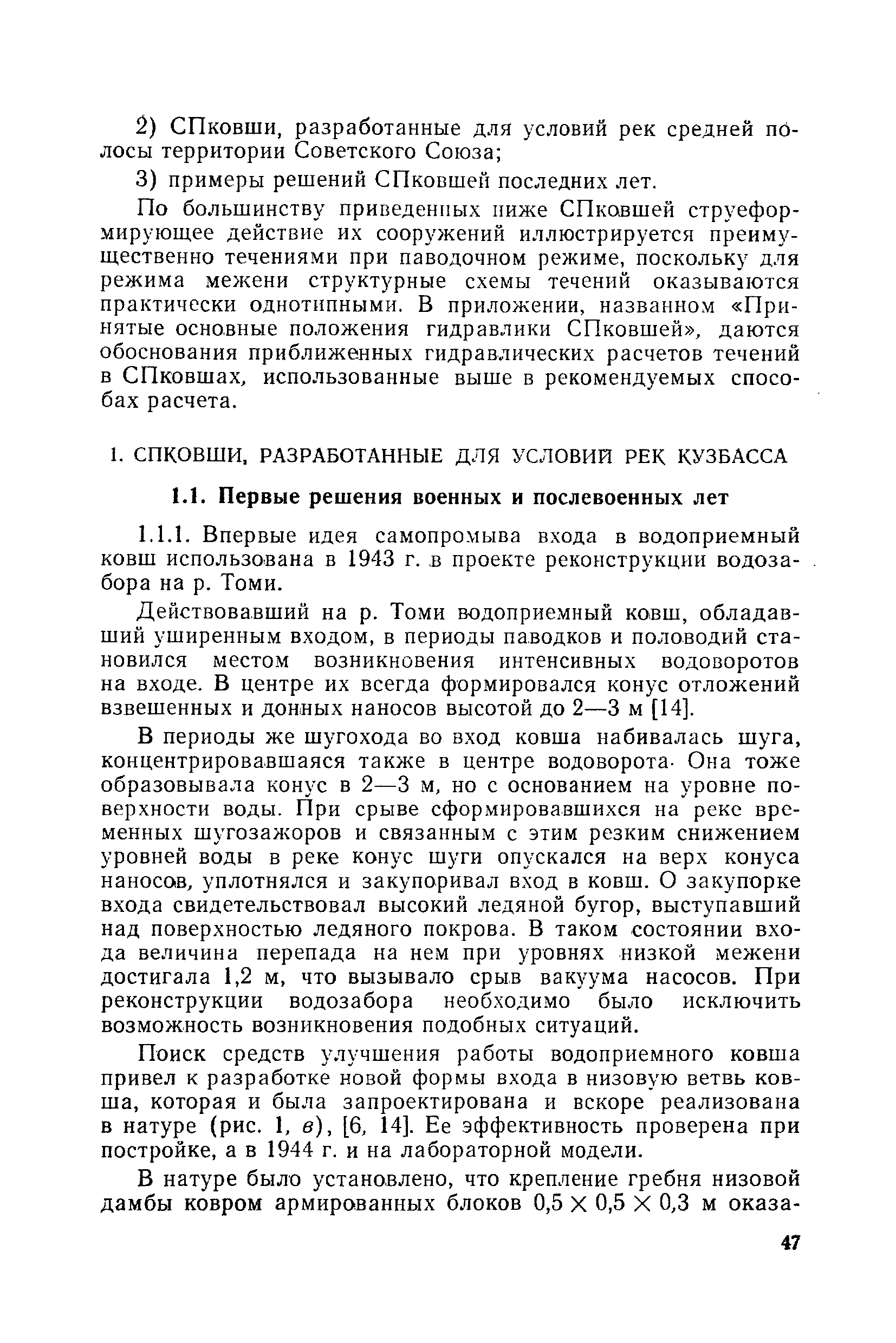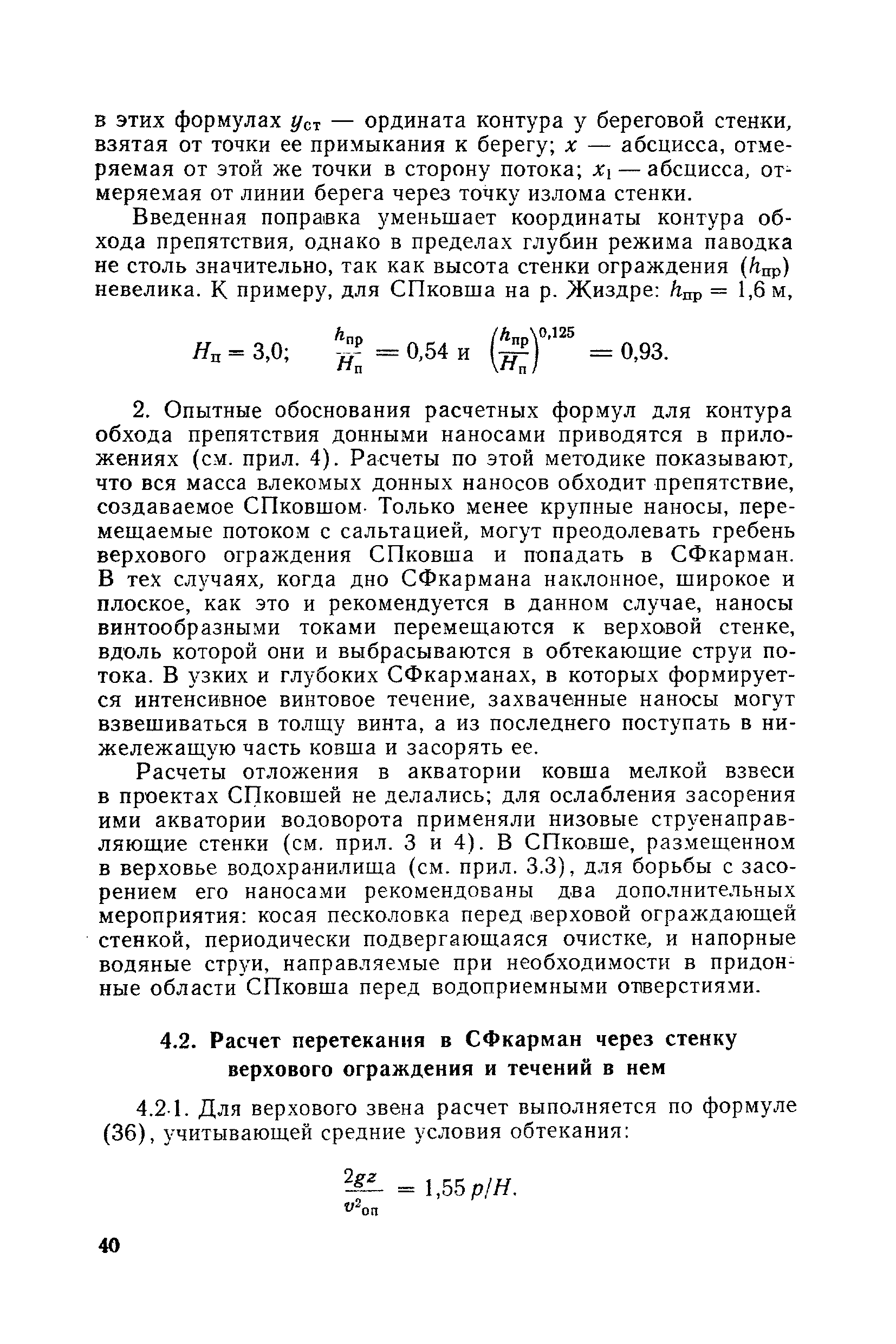 Рекомендации по проектированию самопромывающихся ковшей у затопленных водоприемников| Статус: | справочные материалы, мп, тпр | | Название рус.: | Рекомендации по проектированию самопромывающихся ковшей у затопленных водоприемников | | Дата добавления в базу: | 21.05.2015 | | Дата актуализации: | 01.01.2021 | | Область применения: | Рекомендации составлены на основе обобщения результатов исследований, выполненных во ВНИИ ВОДГЕО с 1944 года в связи с проектированием и постройкой водозаборов для водоснабжения промышленных предприятий. Методика гидравлического расчета Спковшей разработана для более усовершенствованной схемы Спковша с вертикальными стенками, предлагаемой для предстоящего составления типового проекта. Все результаты разработок прежних лет, которые не потеряли практического интереса и могут использоваться как примеры для проектирования, а также результаты исследований последних лет приведены в приложениях | | Оглавление: | Введение Основные сокращения и обозначения Раздел 1. Рекомендации по устройству СПковшей 1. Общие технические условия на устройство СПковшей 1.1. Основные положения 1.2. Особенности работ, возникающие при включении в состав водозабора СПковша 1.3. Классификация конструктивно-компоновочных схем СПковшей 1.4. Характерные гидравлические режимы работы СПковшей 1.5. Особенности защиты водоприемников, размещенных в СПковшах, от наносов, шугольда и сора 1.6. Способы рыбозащиты при водоотборе из СПковша 2. Рекомендации по проектированию СПковшей с вертикальными стенками 2.1. Выбор конструктивной и компоновочной схем СПковша 2.2. Выбор варианта компоновки сооружений в плане 2.3. Особенности конструктивных форм и компоновки СПковша 3. Гидравлические расчеты СПковша для периода межени 3.1. Основные задачи и особенности расчета. Исходные данные 3.2. Расчет обтекающего СПковша потока 3.3. Расчет контура обхода СПковша донными износами 3.4. Расчеты области водоворота при малых водоотборах из его акватории 3.5. Особые формы структуры течений водоворота 4. Гидравлические расчеты СПковша для периода паводков 4.1. Расчет обтекания СПковша в паводок 4.2. Расчет перетекания в СФкарман через стенку верхового ограждения и течений в нем 4.3. Расчеты скоростей течения в СФкармане и в ковше углубления вдоль водоприемника Раздел 2. Приложения. Материалы для проектирования СПковшей Предварительные замечания 1. СПковши, разработанные для условий рек Кузбасса 1.1. Первые решения военных и послевоенных лет 1.2. Решения, найденные для реконструкции действующих водоприемных ковшей традиционных типов 1.3. Самопромывающийся вход ковша у пойменного берега ниже Новокузнецка 2. СПковши, разработанные для условий рек средней полосы территории Советского Союза 2.1. СПковши, огражденные одной верховой шпорой выдвинутой в русло реки 2.2. СПковши, огражденные двумя дамбами, выдвинутыми в русло с бычком-отражателем между ними 2.3. СПковши, вынесенные из русла с откосными отражателями 2.4. СПковши, размещенные в местном уширении русла судоходной реки, с косыми вертикальным отражателем и каналом на береговом откосе 2.5. СПковши, огражденные вертикальными стенками 2.6. СПковши с индивидуальными конструктивными схемами 2.7. Краткие выводы 3. Примеры решений СПковша последних лет 3.1. На одной из рек Белоруссии (1982 год) 3.2. На р. Амуре у г. Хабаровска (1979 год) 3.3. На реке Волге у г