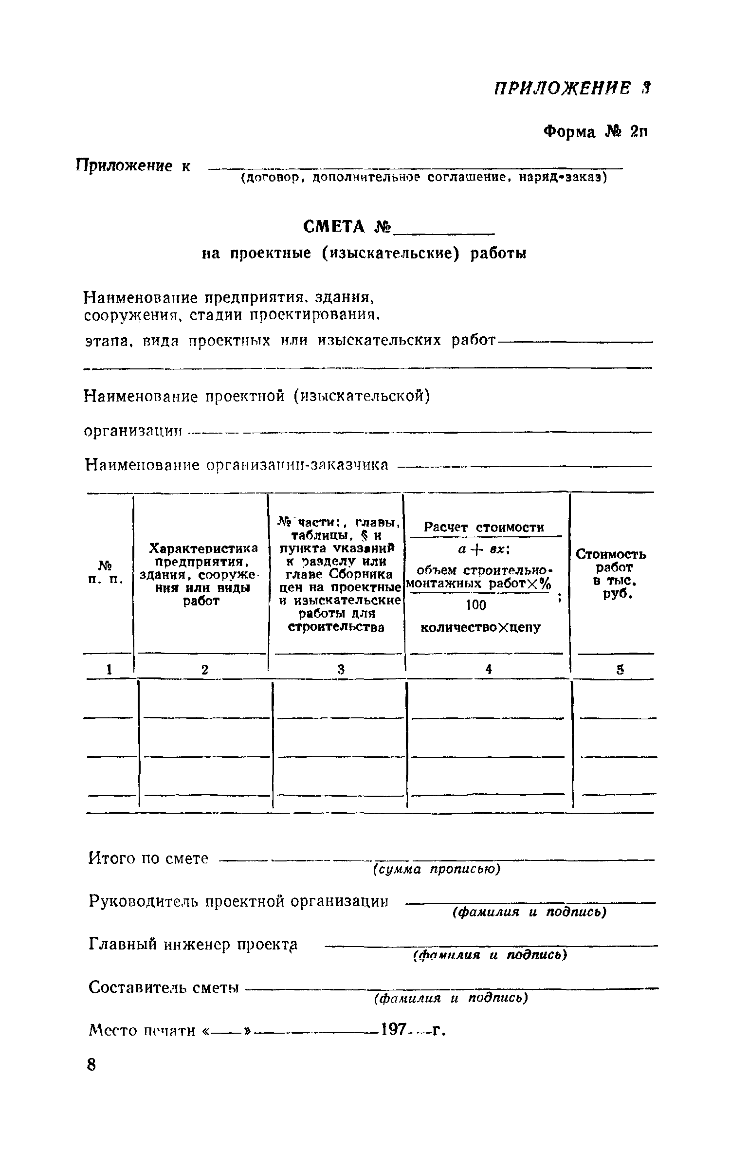 | Оглавление: | Приложение 1. Сводная смета (форма 1п) Приложение 2. Смета на проектные и изыскательские работы (форма 1пс) Приложение 3. Смета на проектные (изыскательские) работы (форма 2п) Приложение 4. Смета на проектные (изыскательские) работы (форма 3п) |