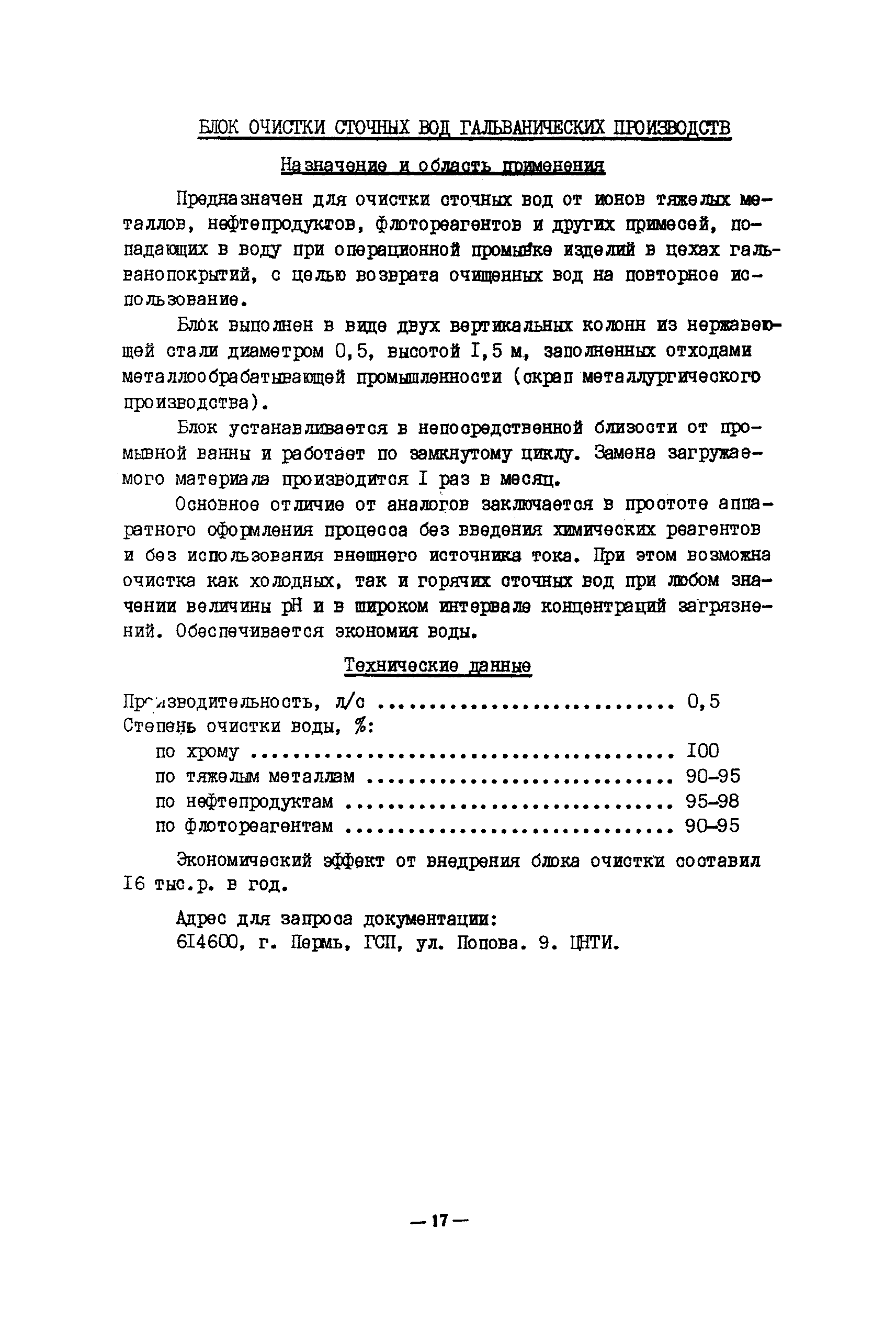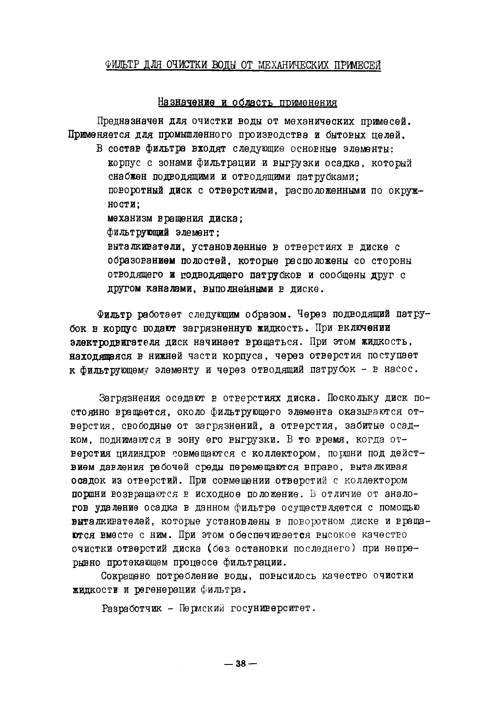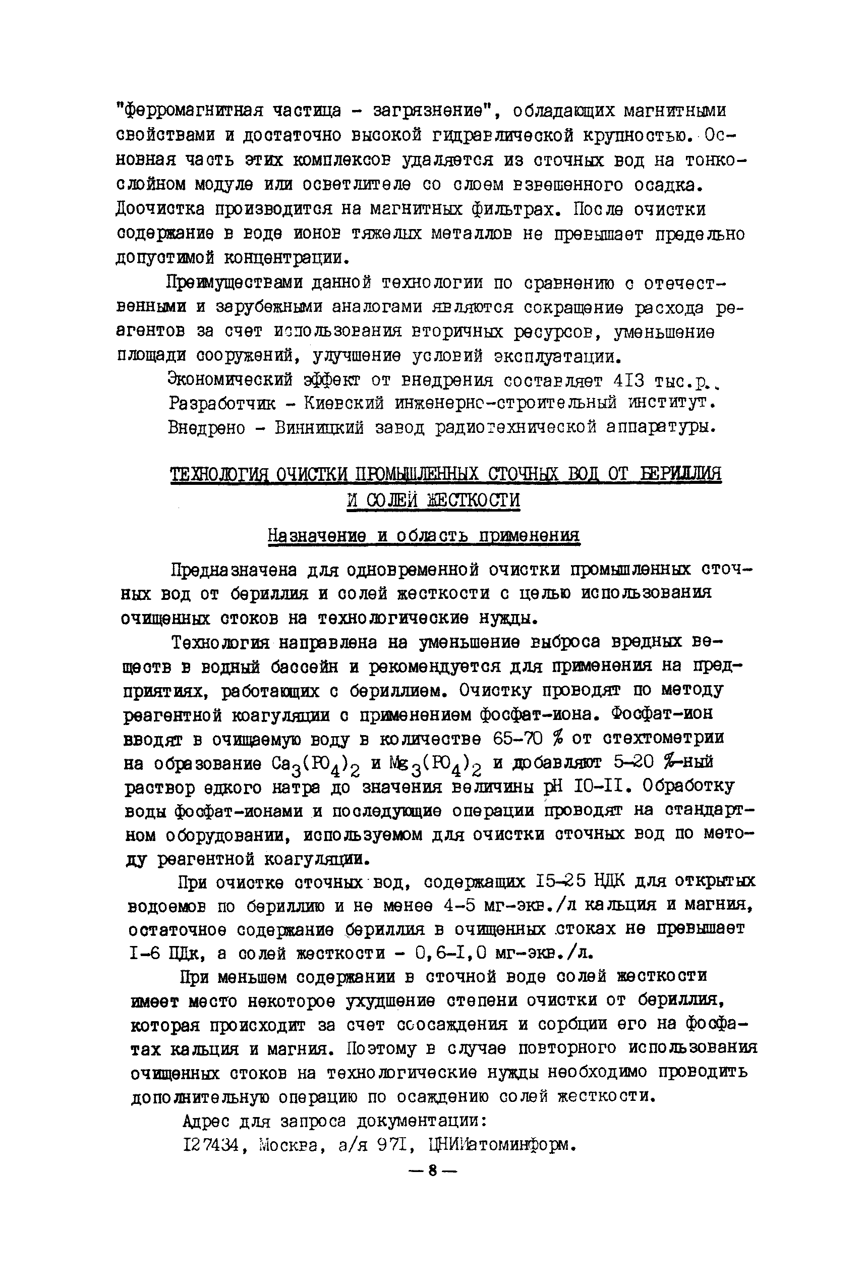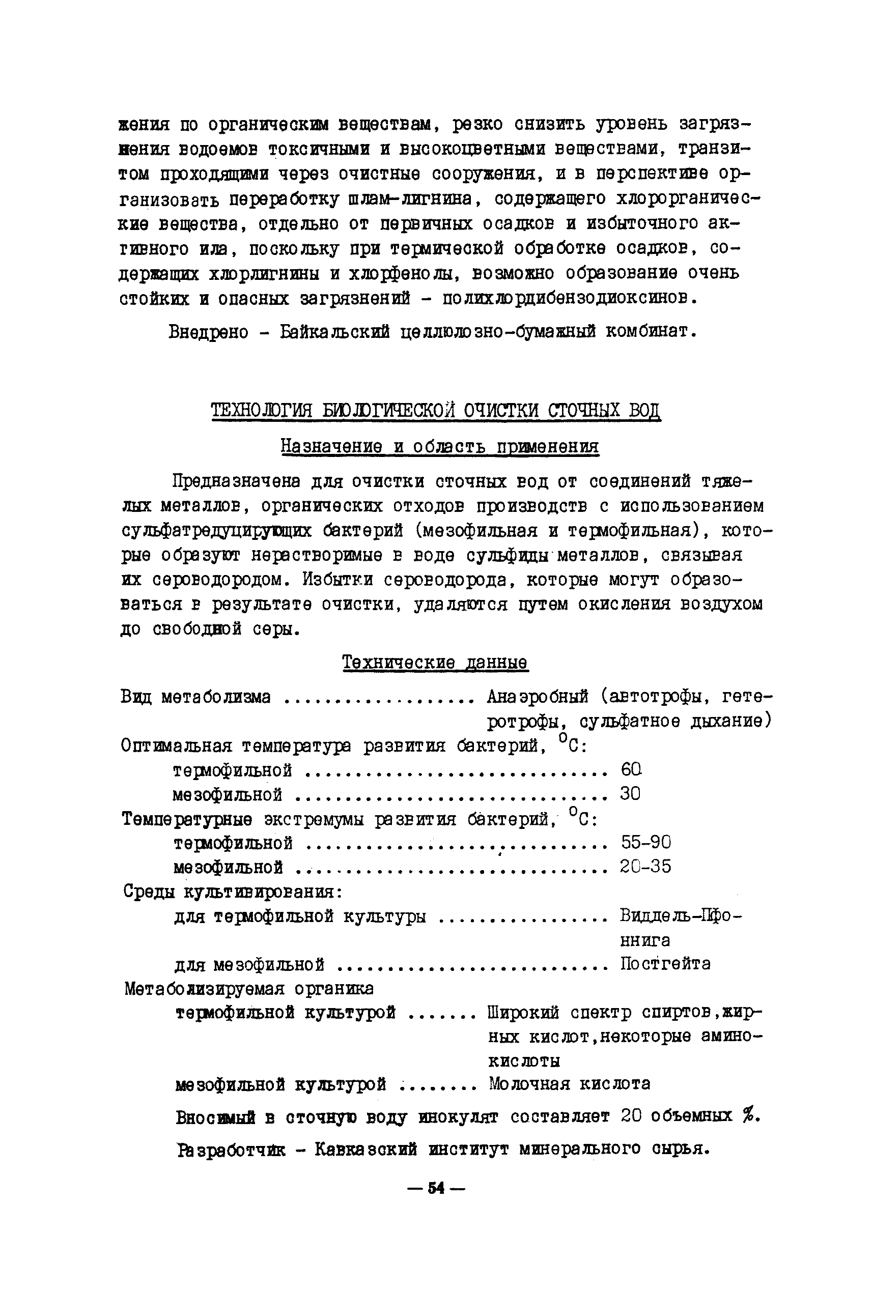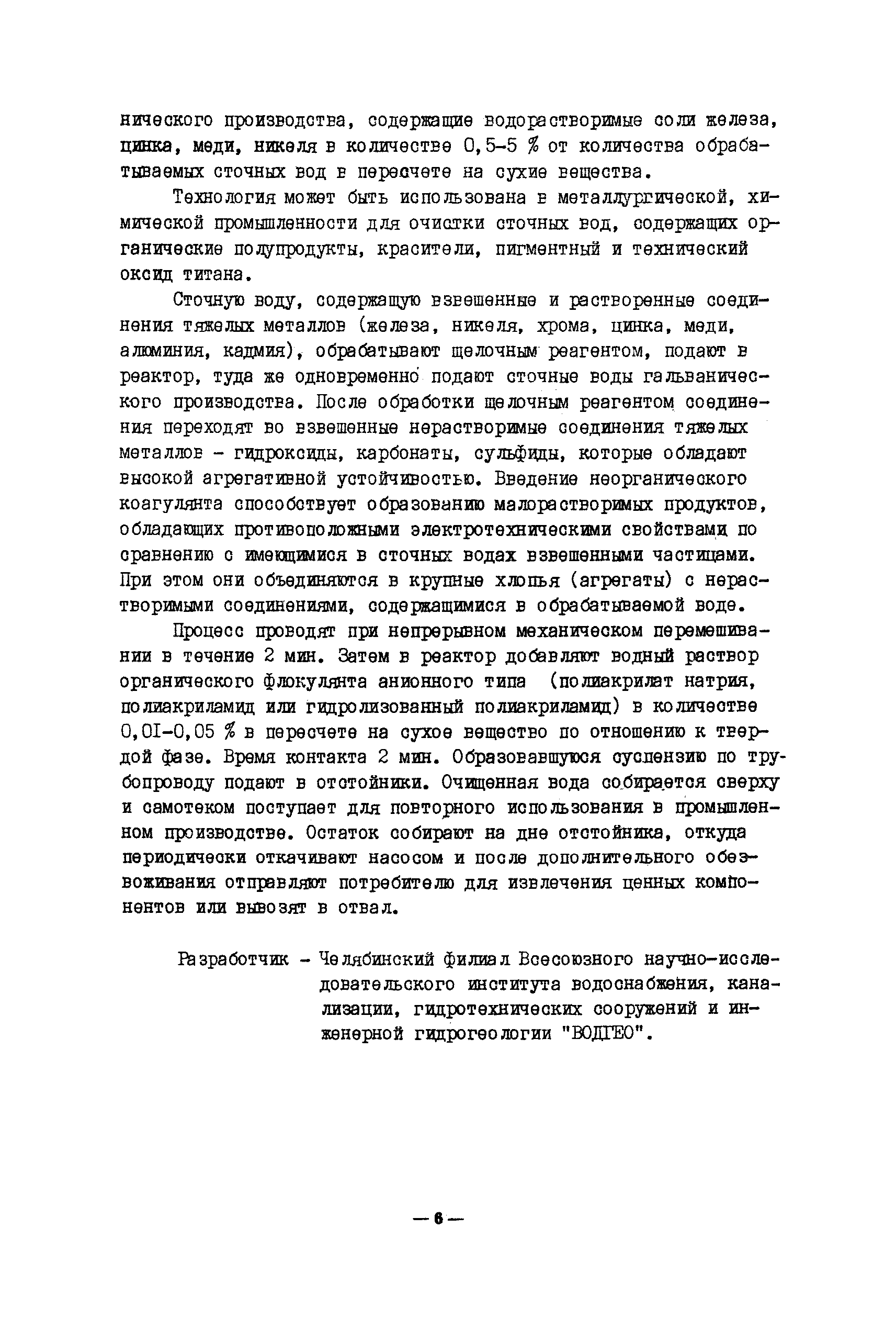 Технология и оборудование для очистки промышленных и бытовых стоков. Альбом| Статус: | заменен | | Название рус.: | Технология и оборудование для очистки промышленных и бытовых стоков. Альбом | | Дата добавления в базу: | 21.05.2015 | | Дата актуализации: | 01.01.2021 | | Область применения: | Альбом подготовлен по новым поступлениям и содержит сведения о методах, технологиях и оборудовании для обработки промышленных и бытовых стоков. | | Оглавление: | I. Введение II. Технологические процессы и оборудование для очистки сточных вод от соединений тяжелых металлов, кислот, щелочей Технология очистки сточных вод от шестивалентного хрома Технология очистки сточных вод от соединений тяжелых металлов Технология мембранной очистки сточных вод Технология очистки сточных вод производства печатных плат Технология очистки промышленных сточных вод от бериллия и солей жесткости Технология очистки сточных вод от мышьяка Комплексы водоочистки автоматизированные модели КВ-III, КВ-112, КВ-113, КВ-211 Установка для очистки гальвано стоков модель ИКФЦ 50-070 Электрохимический модуль глубокой очистки сточных вод Установка обезвреживания сточных вод Устройство для очистки сточных вод Блок очистки сточных вод гальванических производств III. Технологические процессы и оборудование для очистки сточных вод от органических соединений (масел, ПАВ, нефтепродуктов) Технология глубокой очистки промышленных сточных вод от органических соединений Технология очистки сточных вод от нефтепродуктов Электролитическая очистка маслосодержащих сточных вод Технология очистки нефтесодержащих сточных вод Технология очистки сточных вод от масел и смол Технология очистки сточных вод от катионных красителей Электрофлотокоагулятор Вертикальный тонкослойный отстойник Аппарат обратного осмоса "Labro" Агрегат очистки воды обратноосмотический модель АОМ-10 Биореактор Сорбент для очистки сточных вод IV. Оборудование для фильтрации Установка для очистки сточных вод с использованием дисковых биофильтров Емкостные листовые фильтры модель BS Фильтр-концентратор модель ZEF Фильтры модель PEF Камерный фильтр-пресс модель KFP 1000 Фильтр для очистки воды от механических примесей Фильтр непрерывно действующий самопромывающийся Мембранные фильтры МИФИЛ—I—2 на основе капрона V. Системы водоснабжения для промышленных предприятий Бессточная система водоснабжения предприятия Замкнутая система водного хозяйства производства пенополиуретанов VI. Оборудование для очистки бытовых сточных вод Станция биологической очистки сточных вод c автоматизированным технологическим процессом Станция фильтрации с плавающим слоем Циклонный осветлитель VII. Прочее оборудование Технология электрокоагуляционной очистки сточных вод отбельных производств целлюлозно—бумажной промышленности Технология биологической очистки сточных вод Мембраны гетерогенные анионообменные марок МА-41ИЭ и МА-41ИЭ(Л) Установка регенерации хромового ангидрида УРХД 01.00.000 Технология извлечения меди из промывных стоков электролитического меднения Лимеда Им —I VIII. Выводы | | Разработан: | ВНИИТЭМР