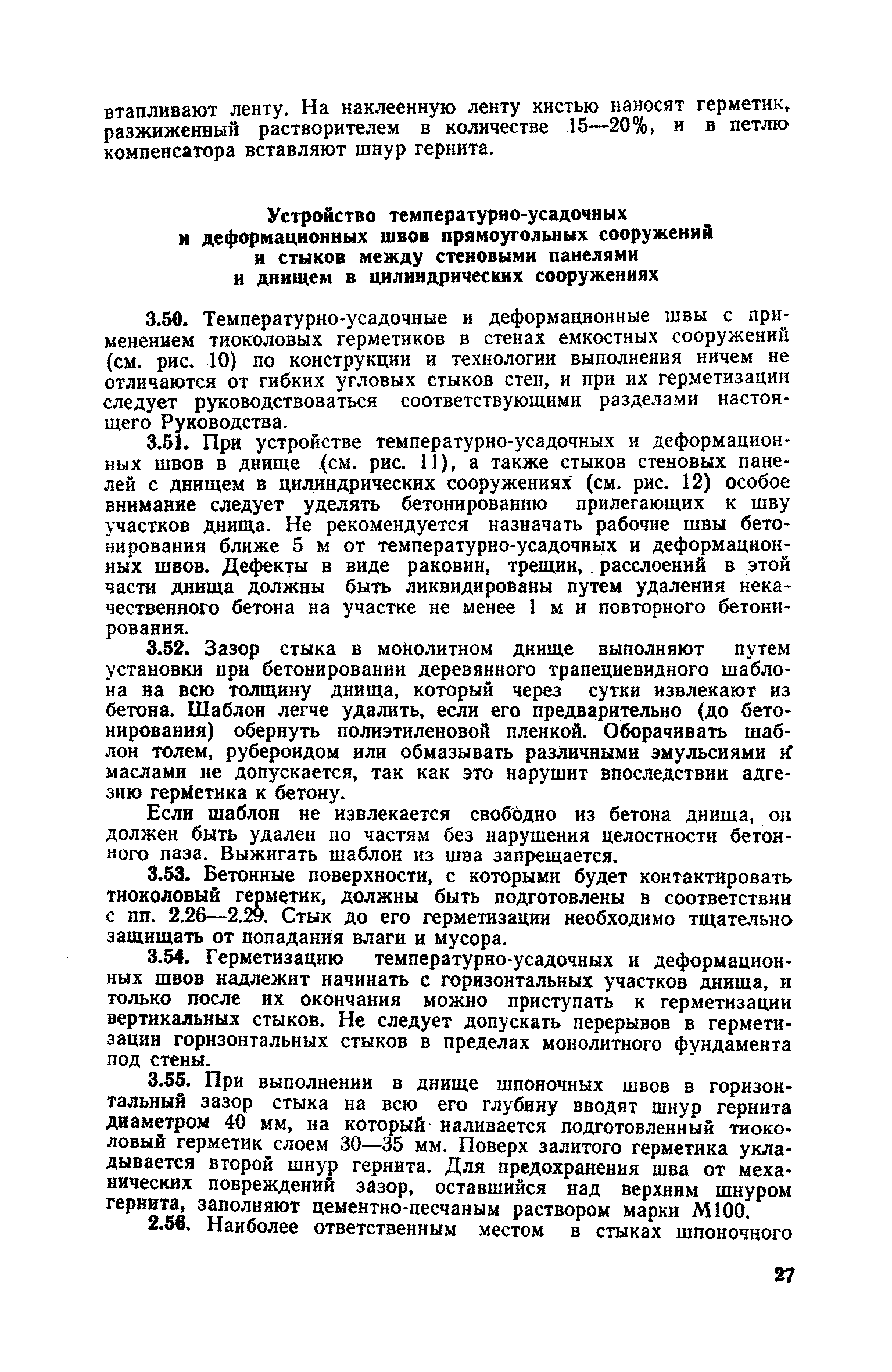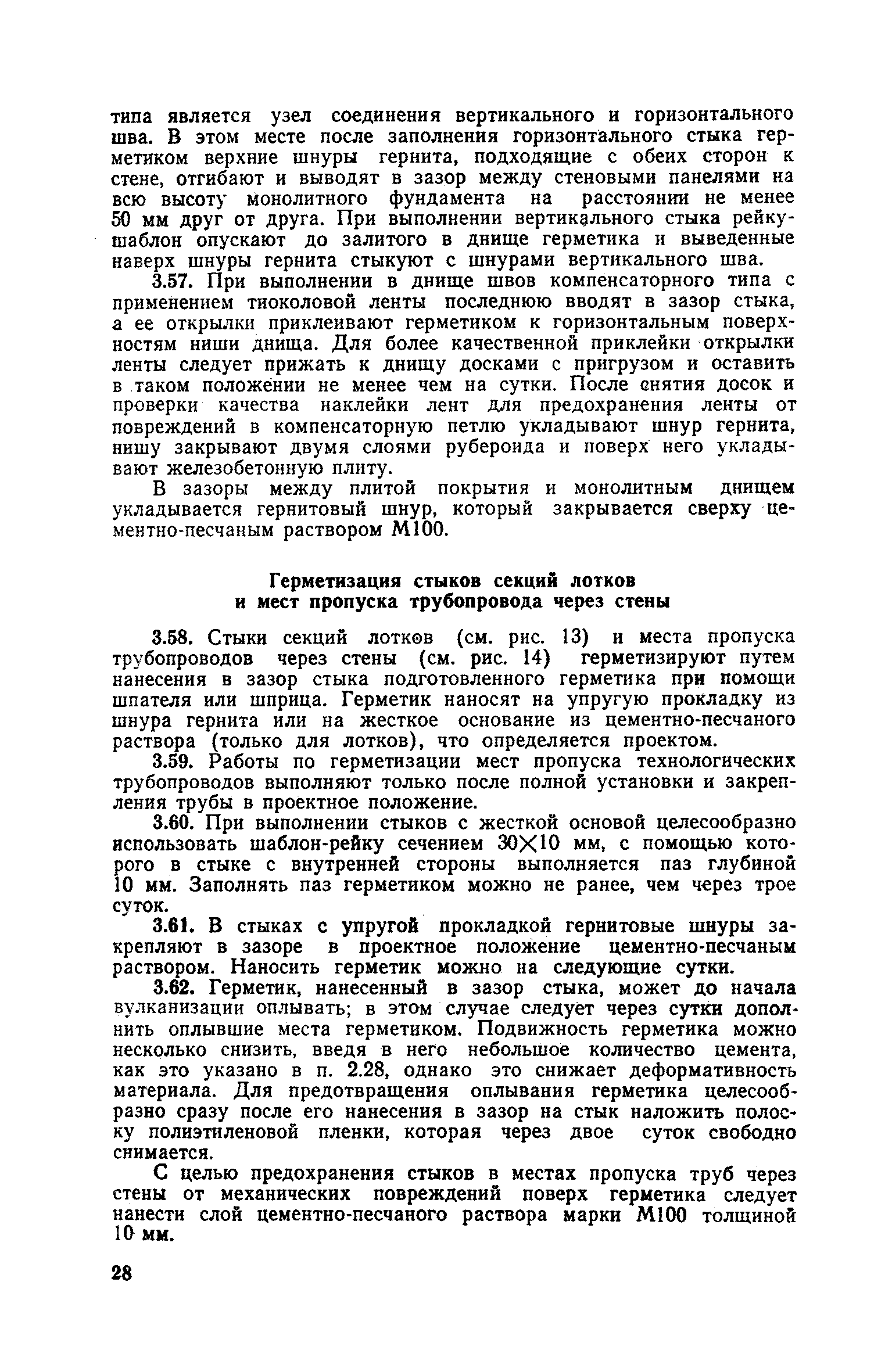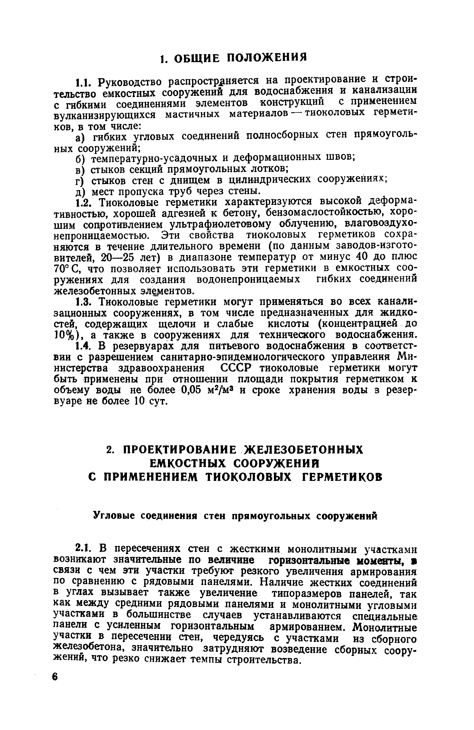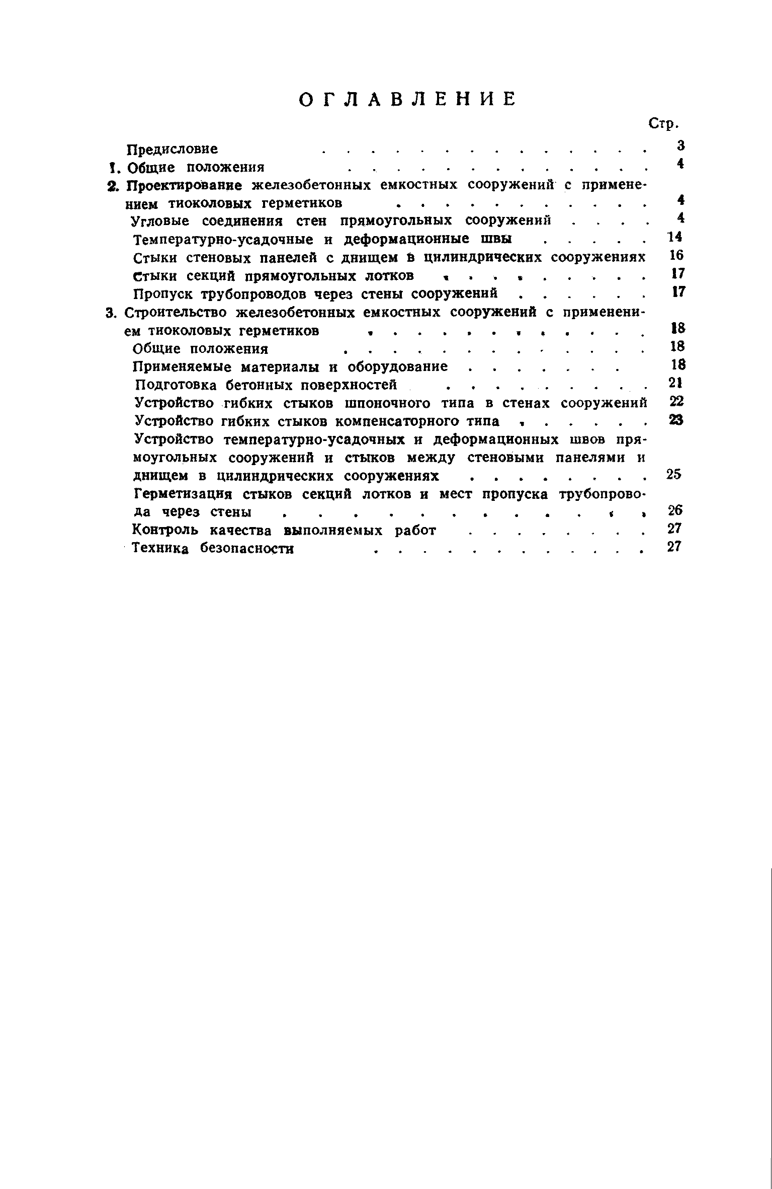 | Оглавление: | Предисловие 1. Общие положения 2. Проектирование железобетонных емкостных сооружений с применением тиоколовых герметиков Угловые соединения стен прямоугольных сооружений Температурно-усадочные и деформационные швы Стыки стеновых панелей с днищем в цилиндрических сооружениях стыки секций прямоугольных лотков Стыки секций прямоугольных лотков Пропуск трубопроводов через стены сооружений 3. Строительство железобетонных емкостных сооружений с применением тиоколовых герметиков Общие положения Применяемые материалы и оборудование Подготовка бетонных поверхностей Устройство гибких стыков шпоночного типа в стенах сооружений Устройство гибких стыков компенсаторного типа Устройство температурно-усадочных и деформационных швов прямоугольных сооружений и стыков между стеновыми панелями и днищем в цилиндрических сооружениях Герметизация стыков секций лотков и мест пропуска трубопровода через стены Контроль качества выполняемых работ Техника безопасности |