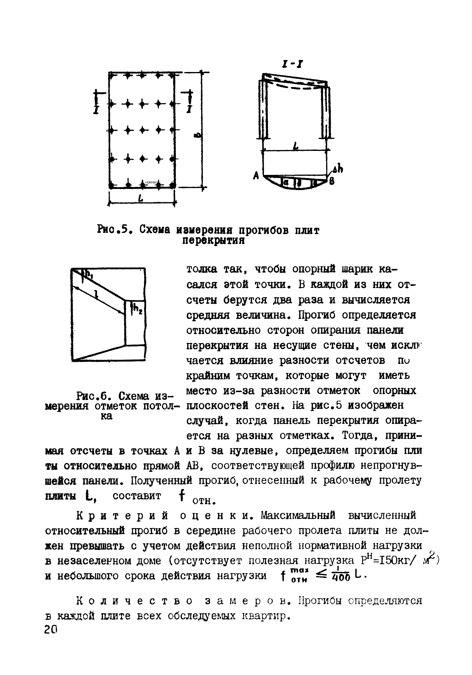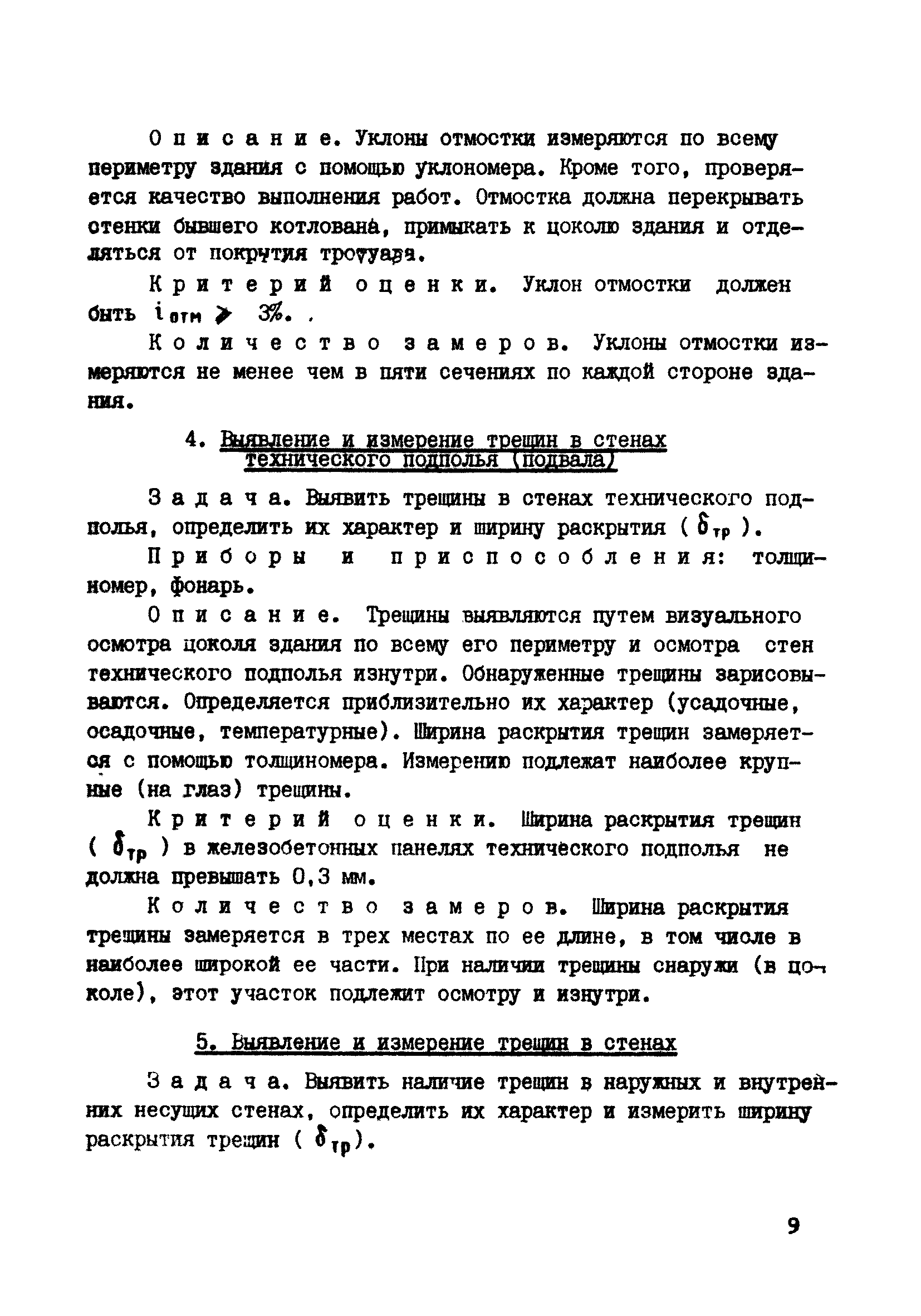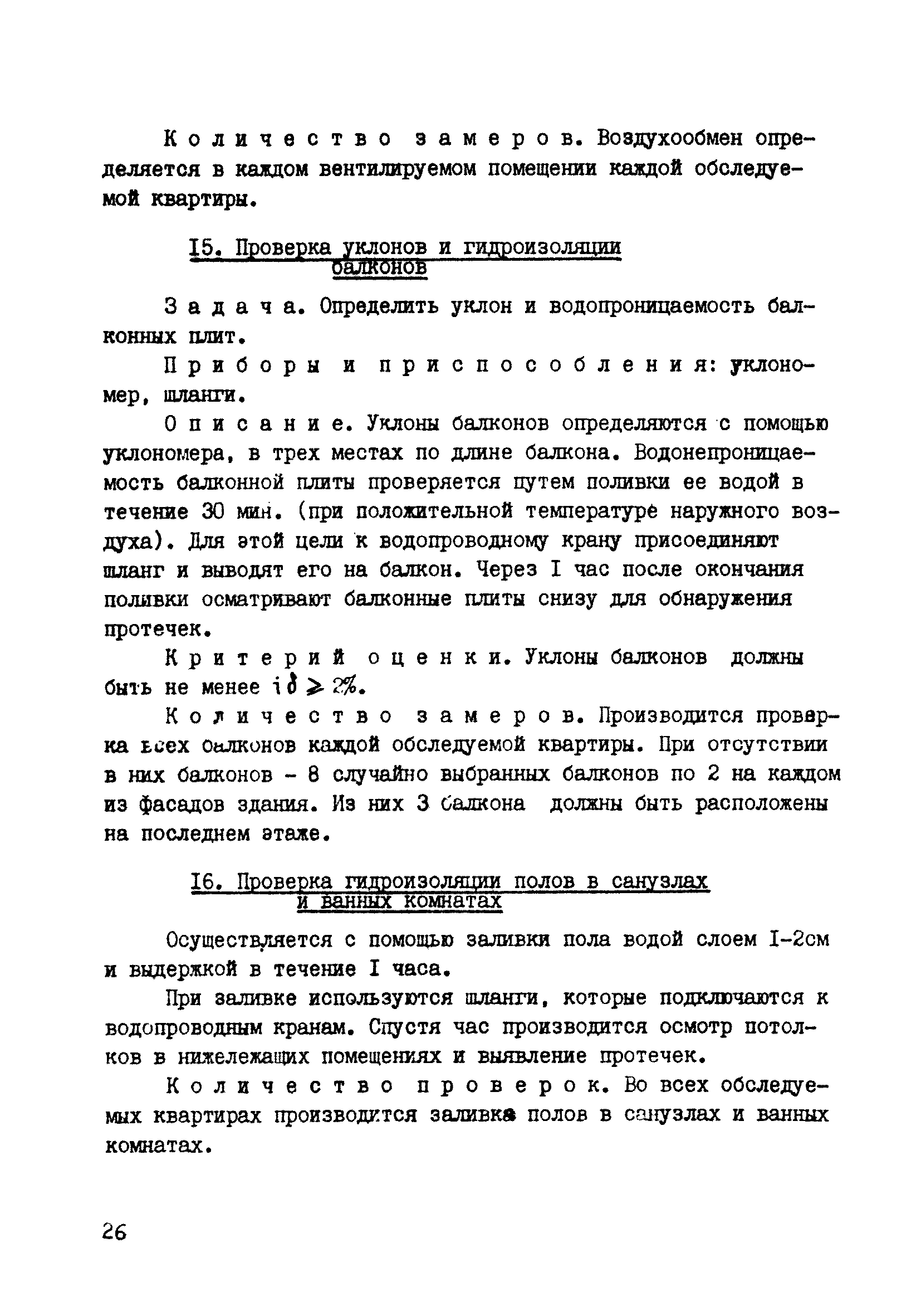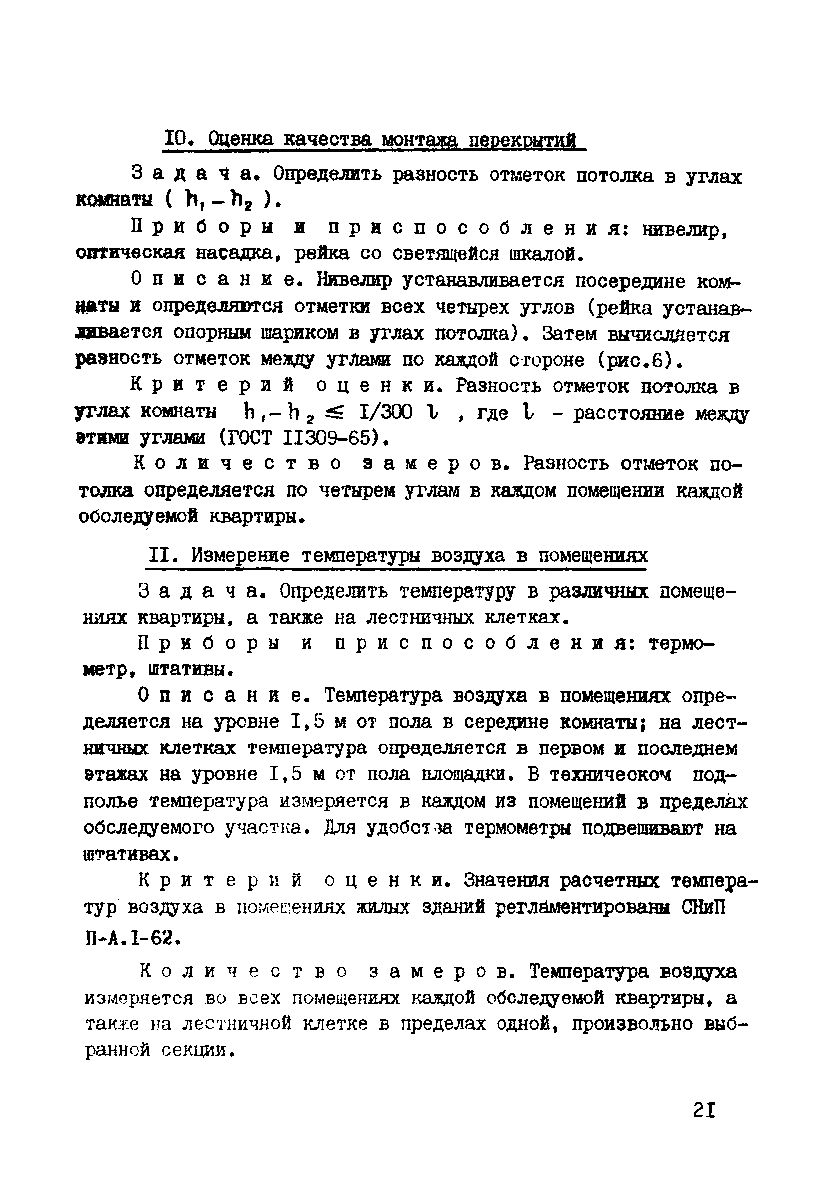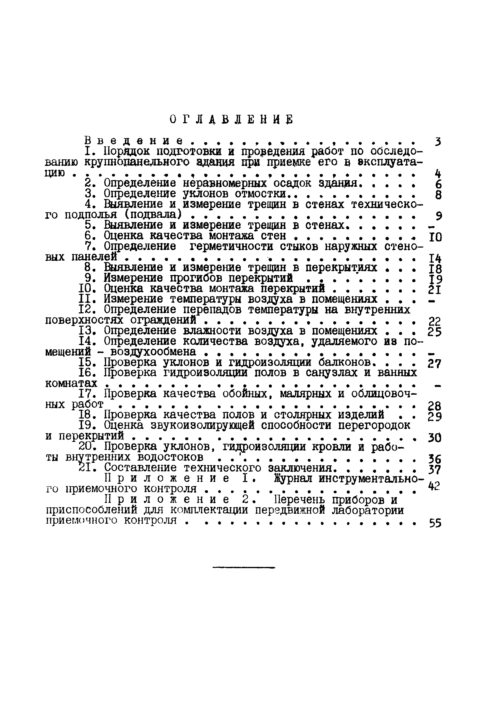 | Оглавление: | Введение 1. Порядок подготовки и проведения работ по обследованию крупнопанельного здания при приемке его в эксплуатацию 2. Определение неравномерных осадок здания 3. Определение уклонов отмостки 4. Выявление и измерение трещин в стенах технического подполья (подвала) 5. Выявление и измерение трещин в стенах. 6. Оценка качества монтажа стен 7. Определение герметичности стыков наружных стеновых панелей 8. Выявление и измерение трещин в перекрытиях 9. Измерение прогибов перекрытий 10. Оценка качества монтажа перекрытий 11. Измерение температуры воздуха в помещениях 12. Определение перепадов температуры на внутренних поверхностях ограждений 13. Определение влажности воздуха в помещениях 14. Определение количества воздуха, удаляемого из помещений—воздухообмена 15. Проверка уклонов и гидроизоляции балконов 16. Проверка гидроизоляции полов в санузлах и ванных комнатах 17. Проверка качества обойных, малярных и облицовочных работ 18. Проверка качества полов и столярных изделий 19. Оценка звукоизолирующей способности перегородок и перекрытий 20. Проверка уклонов, гидроизоляции кровли и работы внутренних водостоков 21. Составление технического заключения Приложение 1. Журнал инструментального приемочного контроля Приложение 2. Перечень приборов и приспособлений для комплектации передвижной лаборатории приемочного контроля |