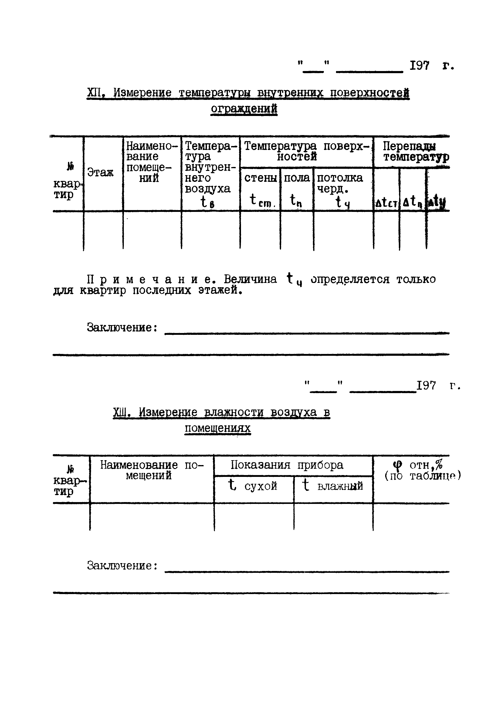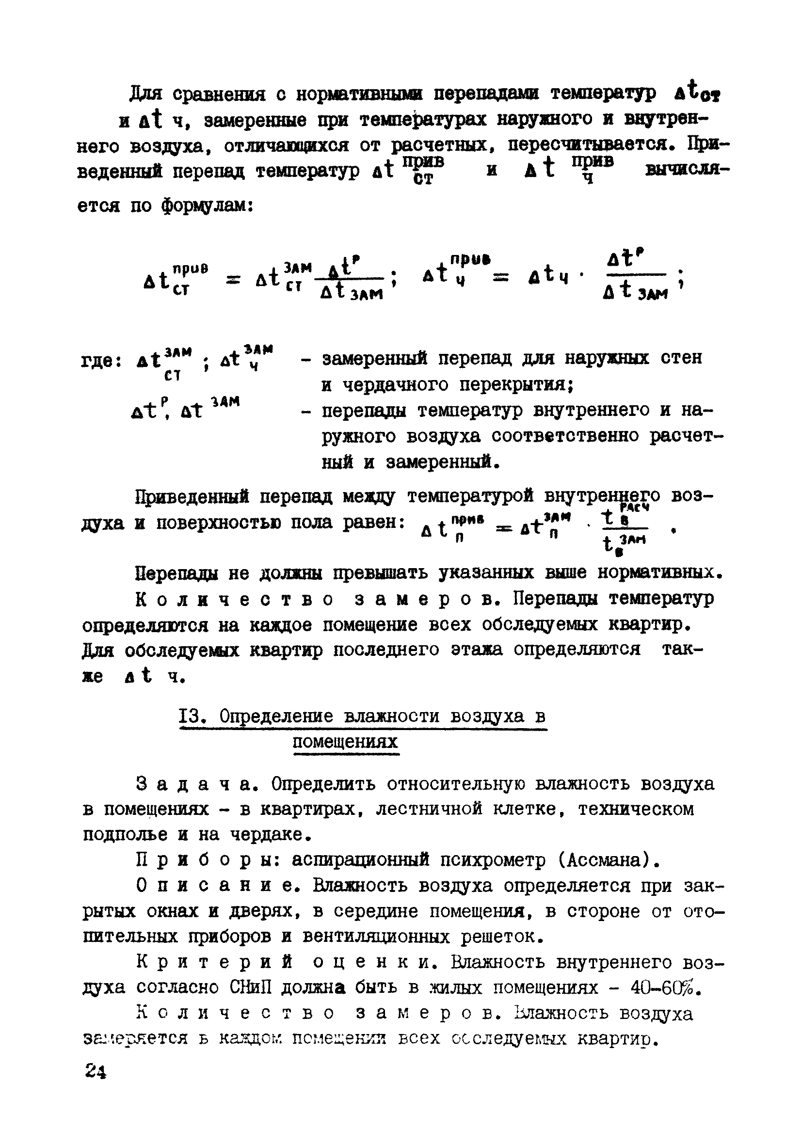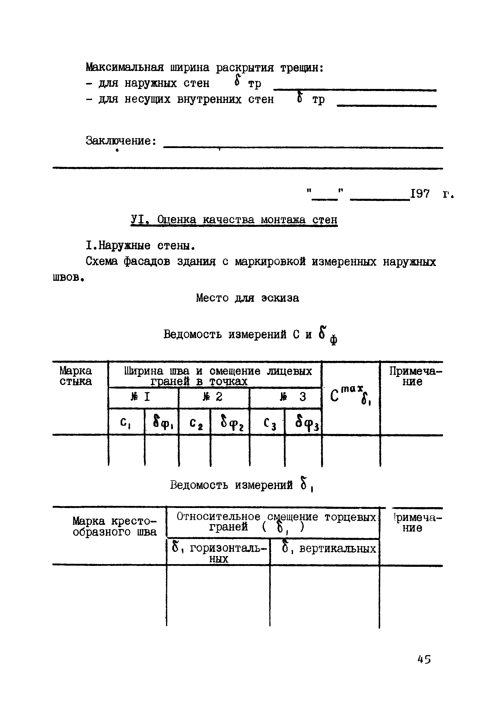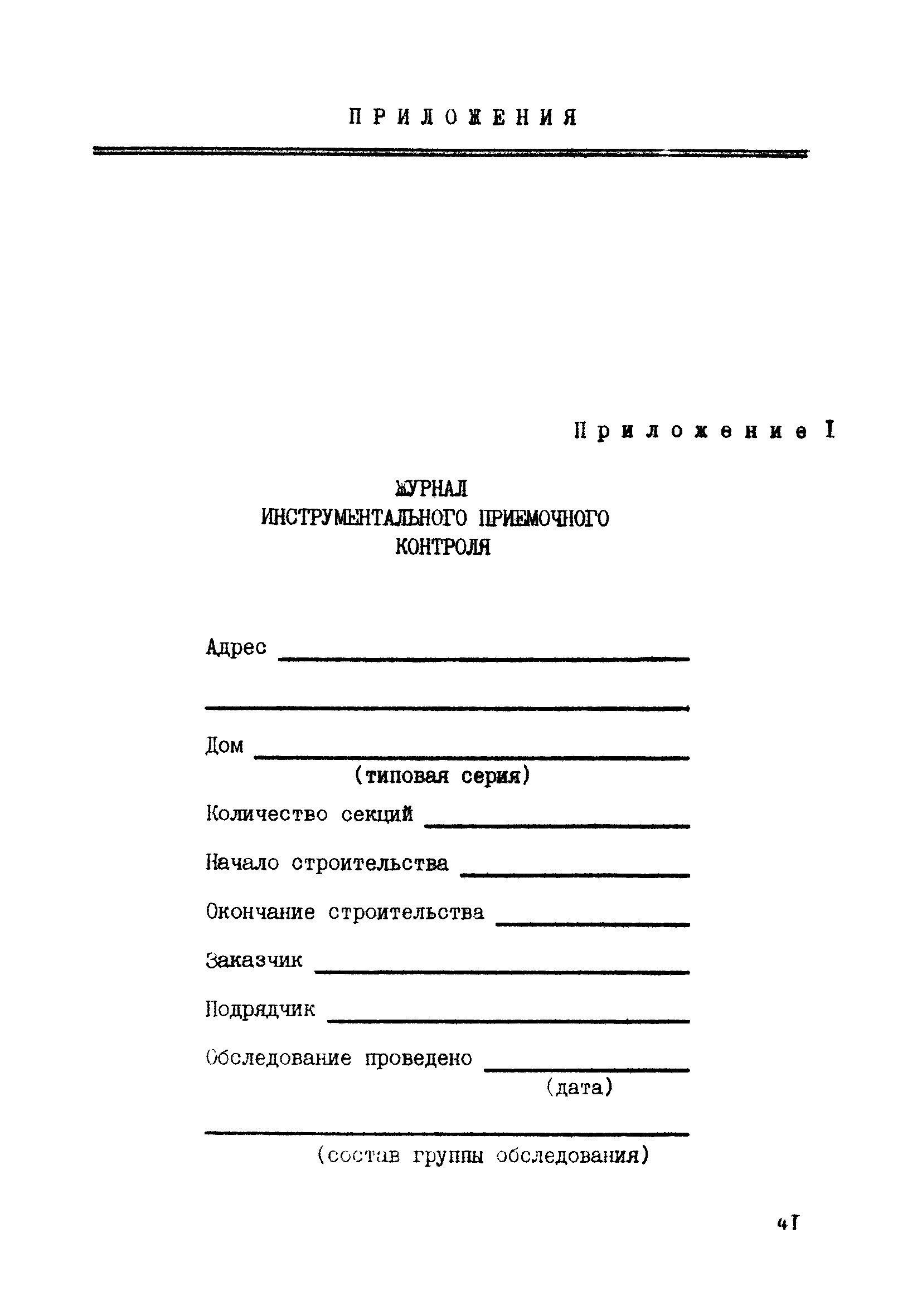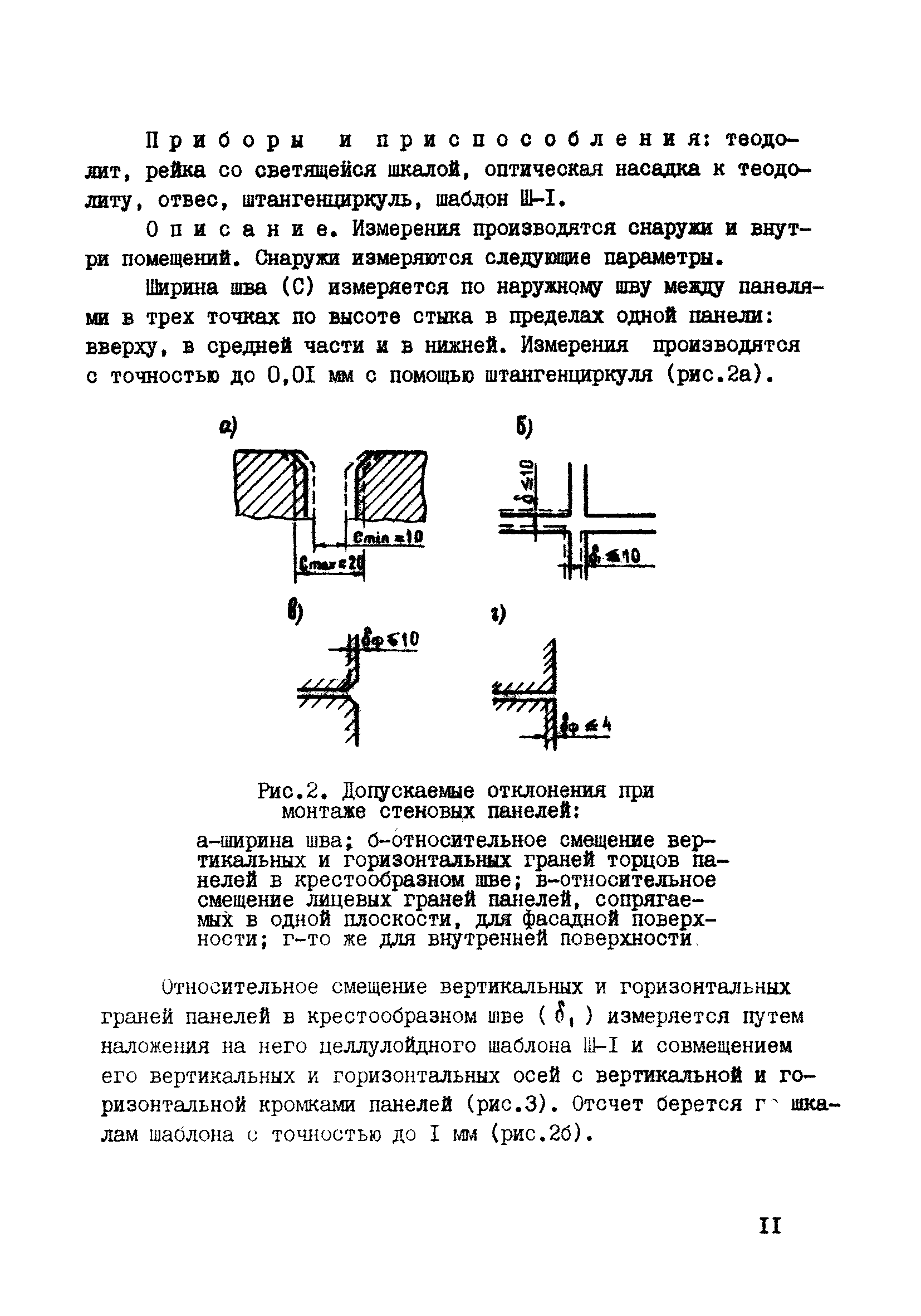 | Оглавление: | Введение 1. Порядок подготовки и проведения работ по обследованию крупнопанельного здания при приемке его в эксплуатацию 2. Определение неравномерных осадок здания 3. Определение уклонов отмостки 4. Выявление и измерение трещин в стенах технического подполья (подвала) 5. Выявление и измерение трещин в стенах. 6. Оценка качества монтажа стен 7. Определение герметичности стыков наружных стеновых панелей 8. Выявление и измерение трещин в перекрытиях 9. Измерение прогибов перекрытий 10. Оценка качества монтажа перекрытий 11. Измерение температуры воздуха в помещениях 12. Определение перепадов температуры на внутренних поверхностях ограждений 13. Определение влажности воздуха в помещениях 14. Определение количества воздуха, удаляемого из помещений—воздухообмена 15. Проверка уклонов и гидроизоляции балконов 16. Проверка гидроизоляции полов в санузлах и ванных комнатах 17. Проверка качества обойных, малярных и облицовочных работ 18. Проверка качества полов и столярных изделий 19. Оценка звукоизолирующей способности перегородок и перекрытий 20. Проверка уклонов, гидроизоляции кровли и работы внутренних водостоков 21. Составление технического заключения Приложение 1. Журнал инструментального приемочного контроля Приложение 2. Перечень приборов и приспособлений для комплектации передвижной лаборатории приемочного контроля |