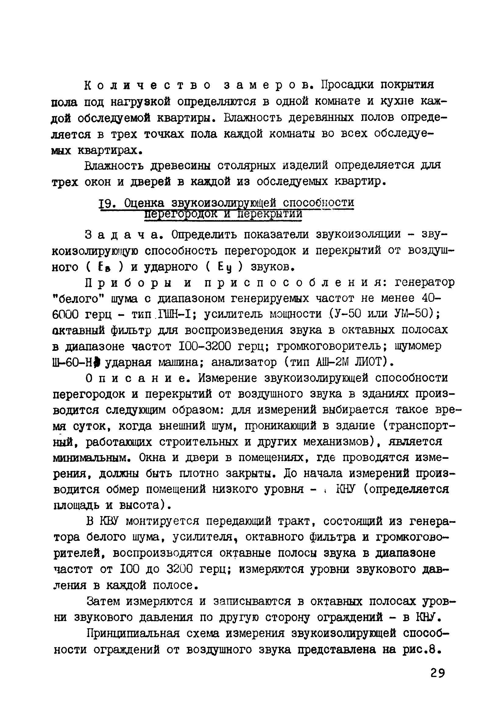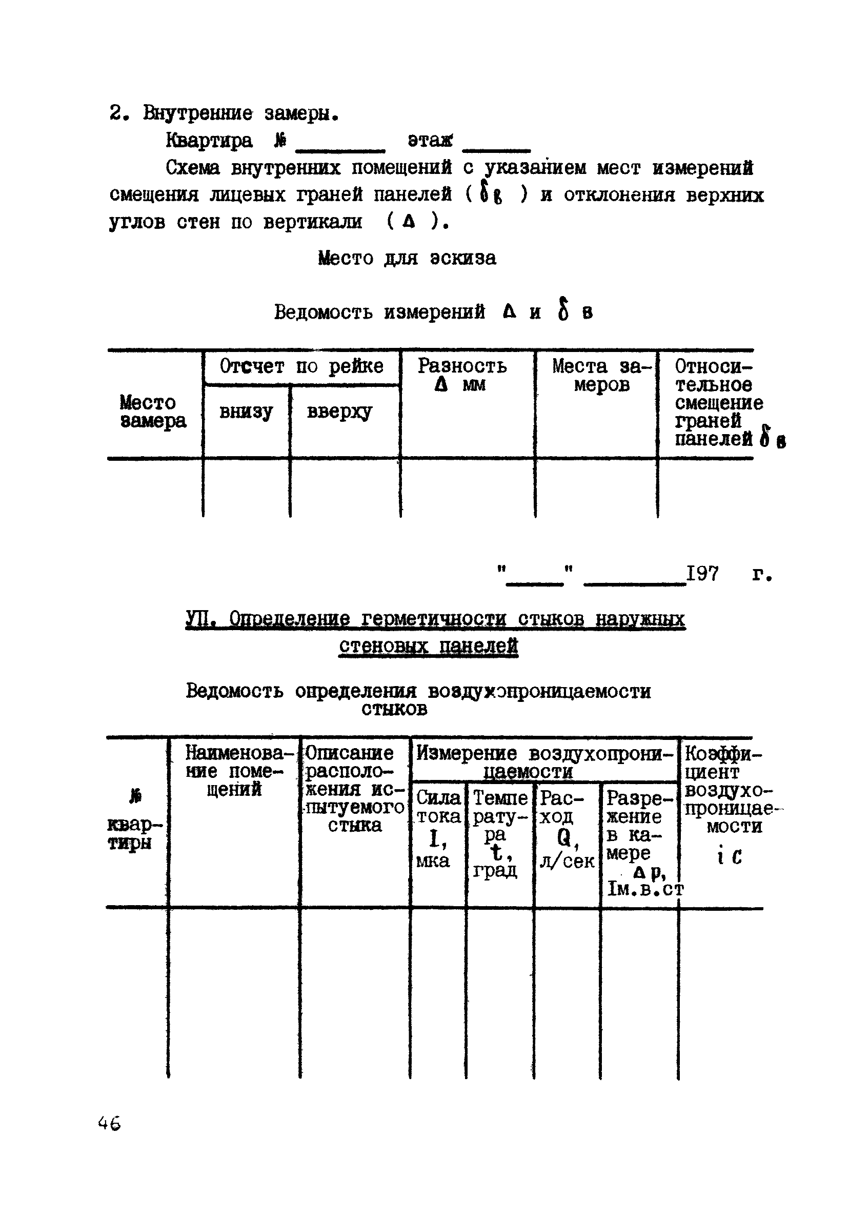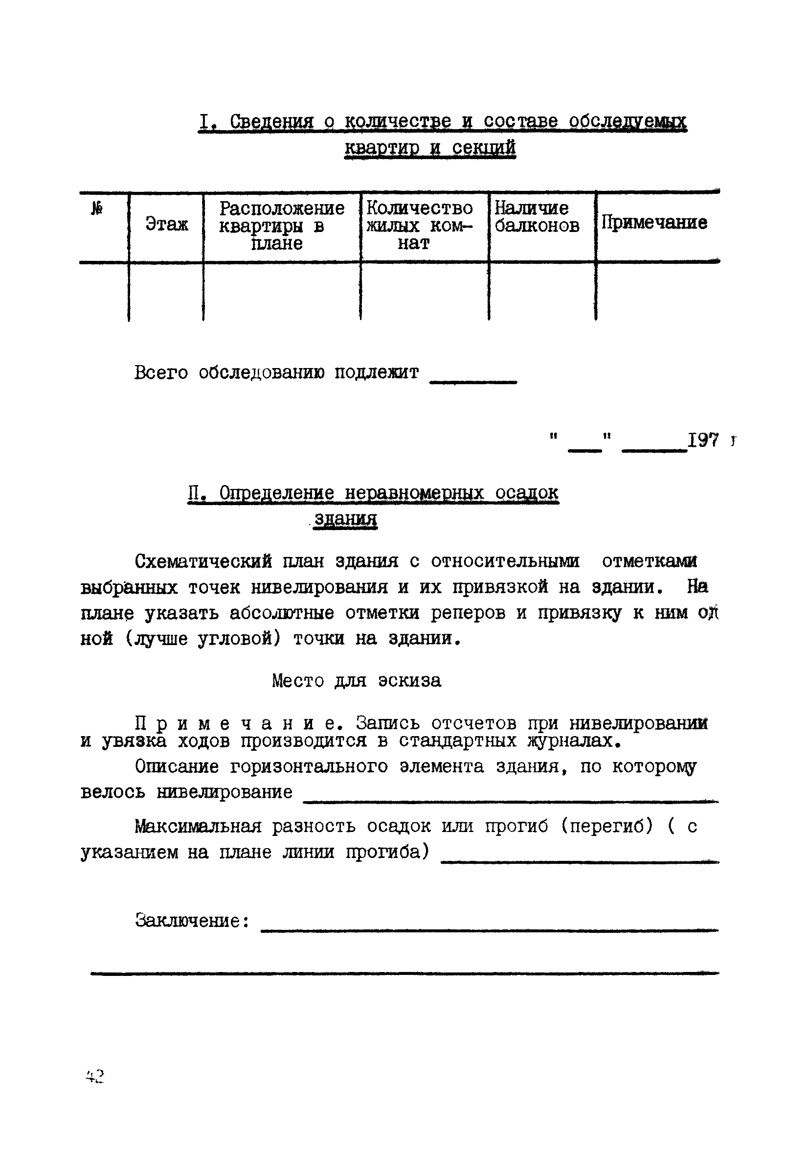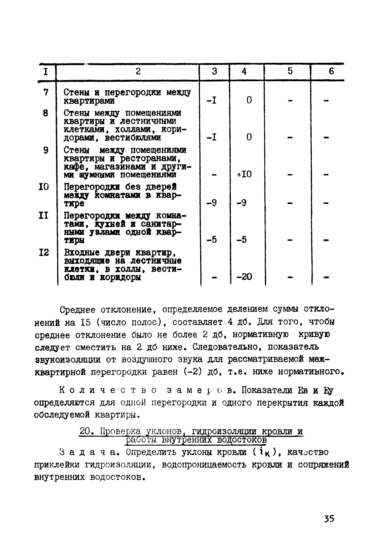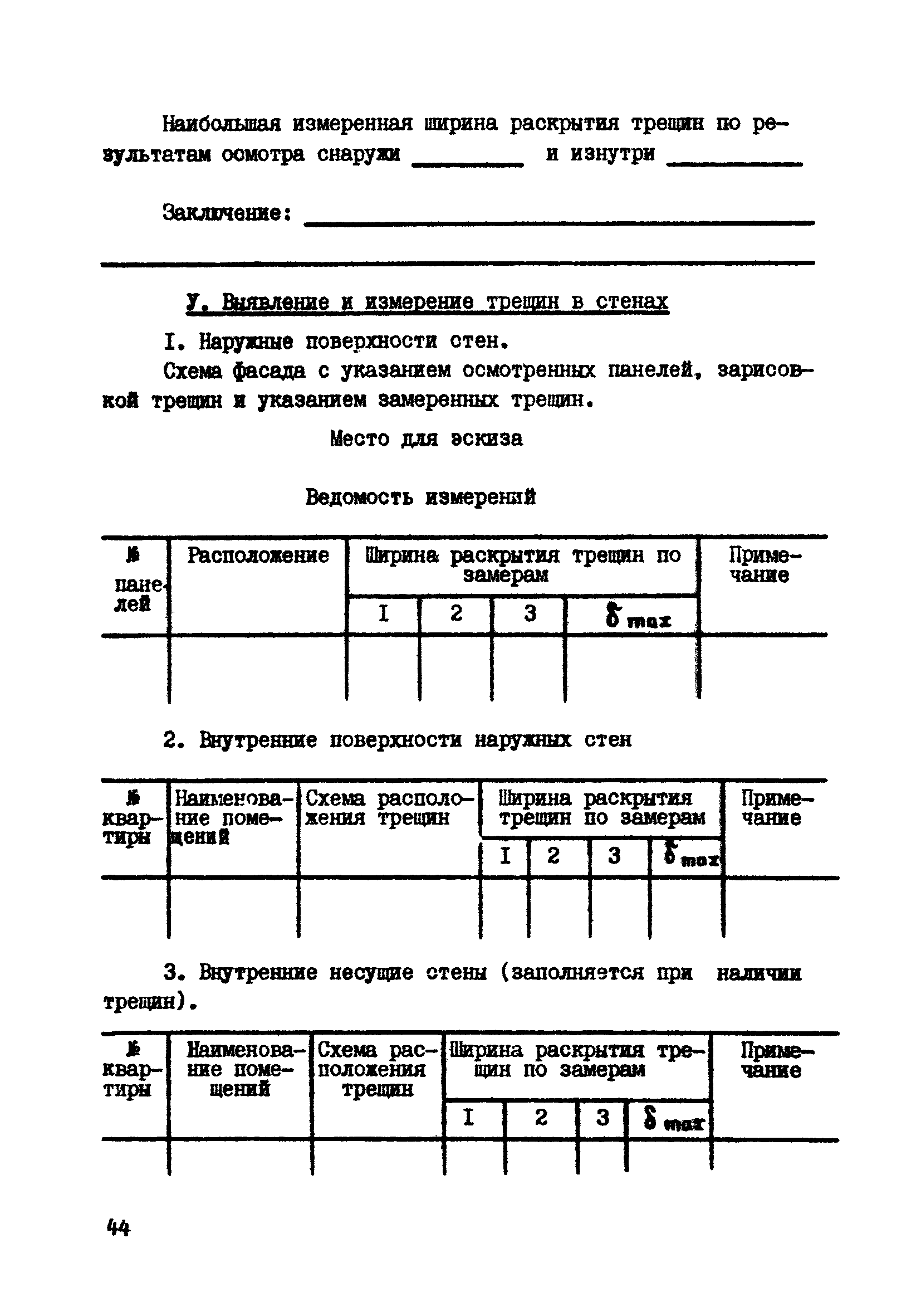 | Оглавление: | Введение 1. Порядок подготовки и проведения работ по обследованию крупнопанельного здания при приемке его в эксплуатацию 2. Определение неравномерных осадок здания 3. Определение уклонов отмостки 4. Выявление и измерение трещин в стенах технического подполья (подвала) 5. Выявление и измерение трещин в стенах. 6. Оценка качества монтажа стен 7. Определение герметичности стыков наружных стеновых панелей 8. Выявление и измерение трещин в перекрытиях 9. Измерение прогибов перекрытий 10. Оценка качества монтажа перекрытий 11. Измерение температуры воздуха в помещениях 12. Определение перепадов температуры на внутренних поверхностях ограждений 13. Определение влажности воздуха в помещениях 14. Определение количества воздуха, удаляемого из помещений—воздухообмена 15. Проверка уклонов и гидроизоляции балконов 16. Проверка гидроизоляции полов в санузлах и ванных комнатах 17. Проверка качества обойных, малярных и облицовочных работ 18. Проверка качества полов и столярных изделий 19. Оценка звукоизолирующей способности перегородок и перекрытий 20. Проверка уклонов, гидроизоляции кровли и работы внутренних водостоков 21. Составление технического заключения Приложение 1. Журнал инструментального приемочного контроля Приложение 2. Перечень приборов и приспособлений для комплектации передвижной лаборатории приемочного контроля |