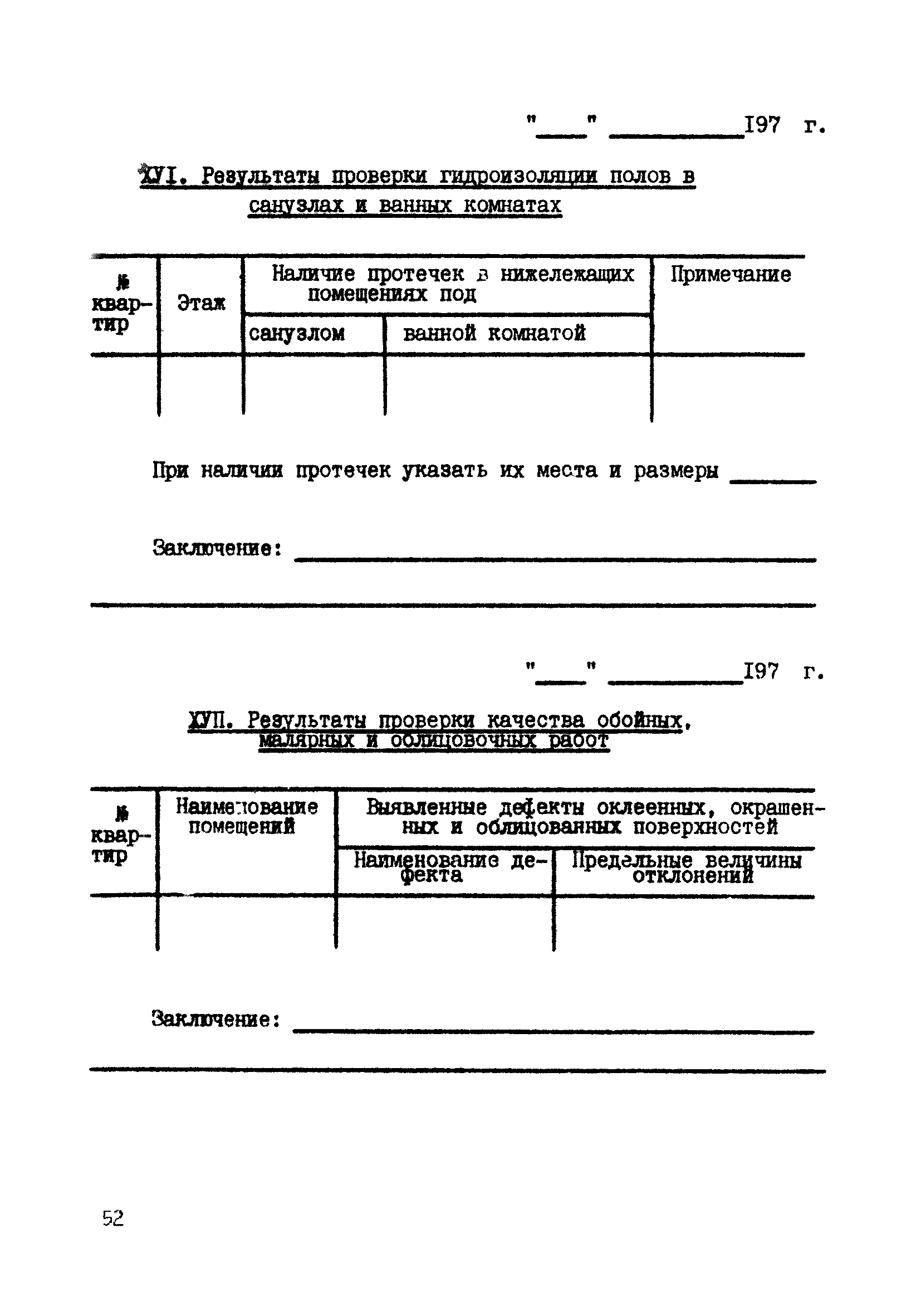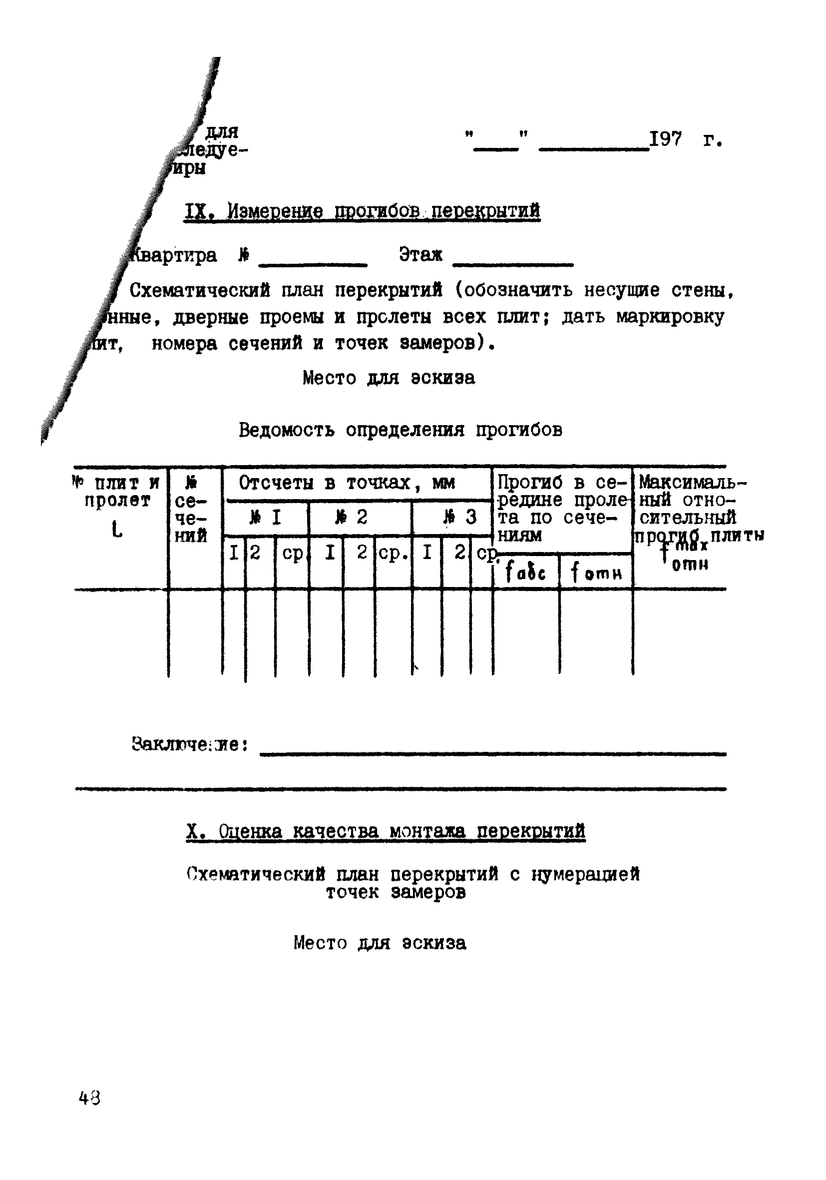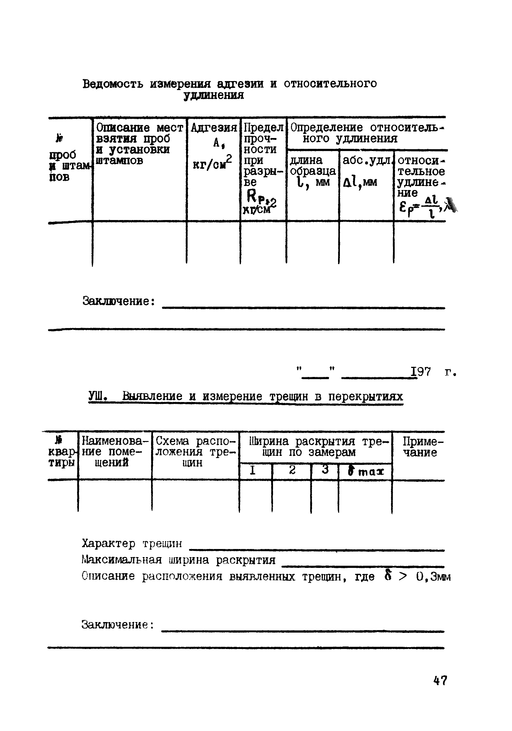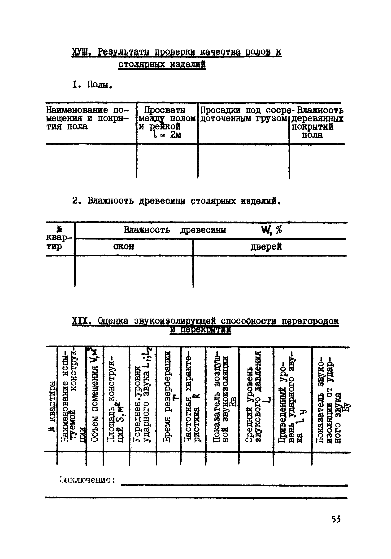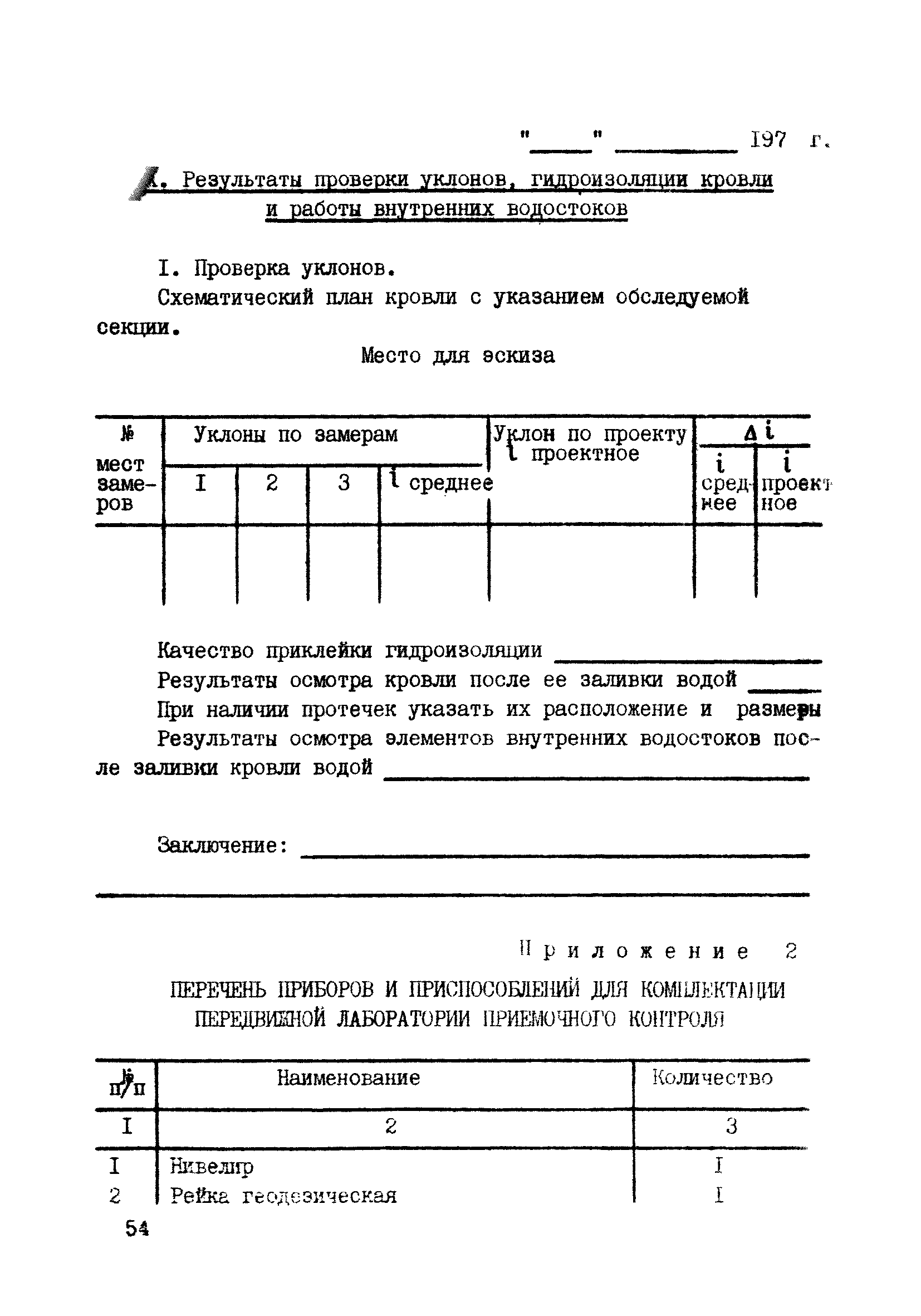 | Оглавление: | Введение 1. Порядок подготовки и проведения работ по обследованию крупнопанельного здания при приемке его в эксплуатацию 2. Определение неравномерных осадок здания 3. Определение уклонов отмостки 4. Выявление и измерение трещин в стенах технического подполья (подвала) 5. Выявление и измерение трещин в стенах. 6. Оценка качества монтажа стен 7. Определение герметичности стыков наружных стеновых панелей 8. Выявление и измерение трещин в перекрытиях 9. Измерение прогибов перекрытий 10. Оценка качества монтажа перекрытий 11. Измерение температуры воздуха в помещениях 12. Определение перепадов температуры на внутренних поверхностях ограждений 13. Определение влажности воздуха в помещениях 14. Определение количества воздуха, удаляемого из помещений—воздухообмена 15. Проверка уклонов и гидроизоляции балконов 16. Проверка гидроизоляции полов в санузлах и ванных комнатах 17. Проверка качества обойных, малярных и облицовочных работ 18. Проверка качества полов и столярных изделий 19. Оценка звукоизолирующей способности перегородок и перекрытий 20. Проверка уклонов, гидроизоляции кровли и работы внутренних водостоков 21. Составление технического заключения Приложение 1. Журнал инструментального приемочного контроля Приложение 2. Перечень приборов и приспособлений для комплектации передвижной лаборатории приемочного контроля |