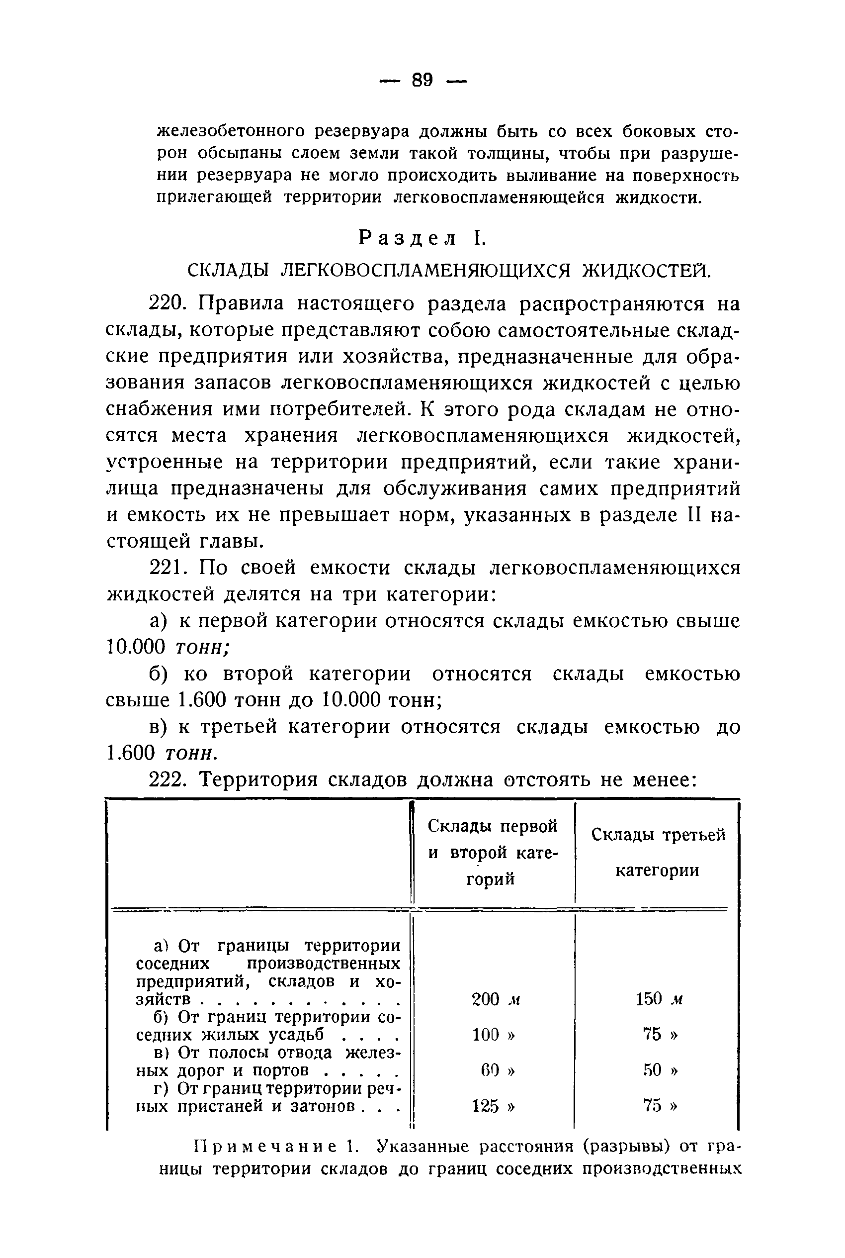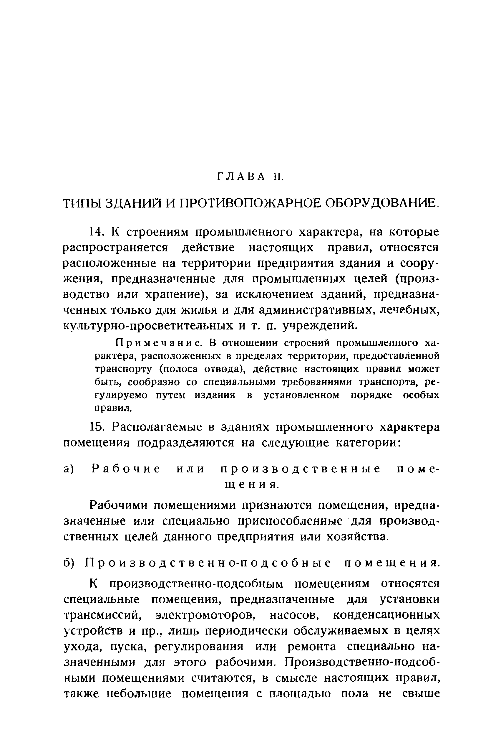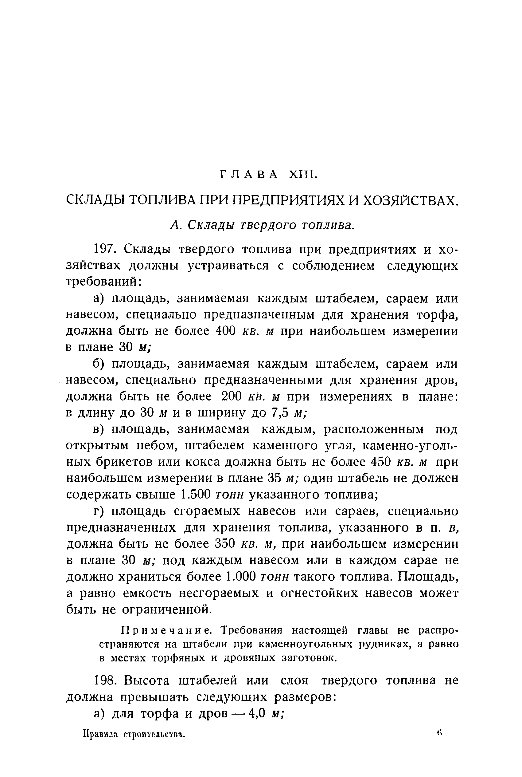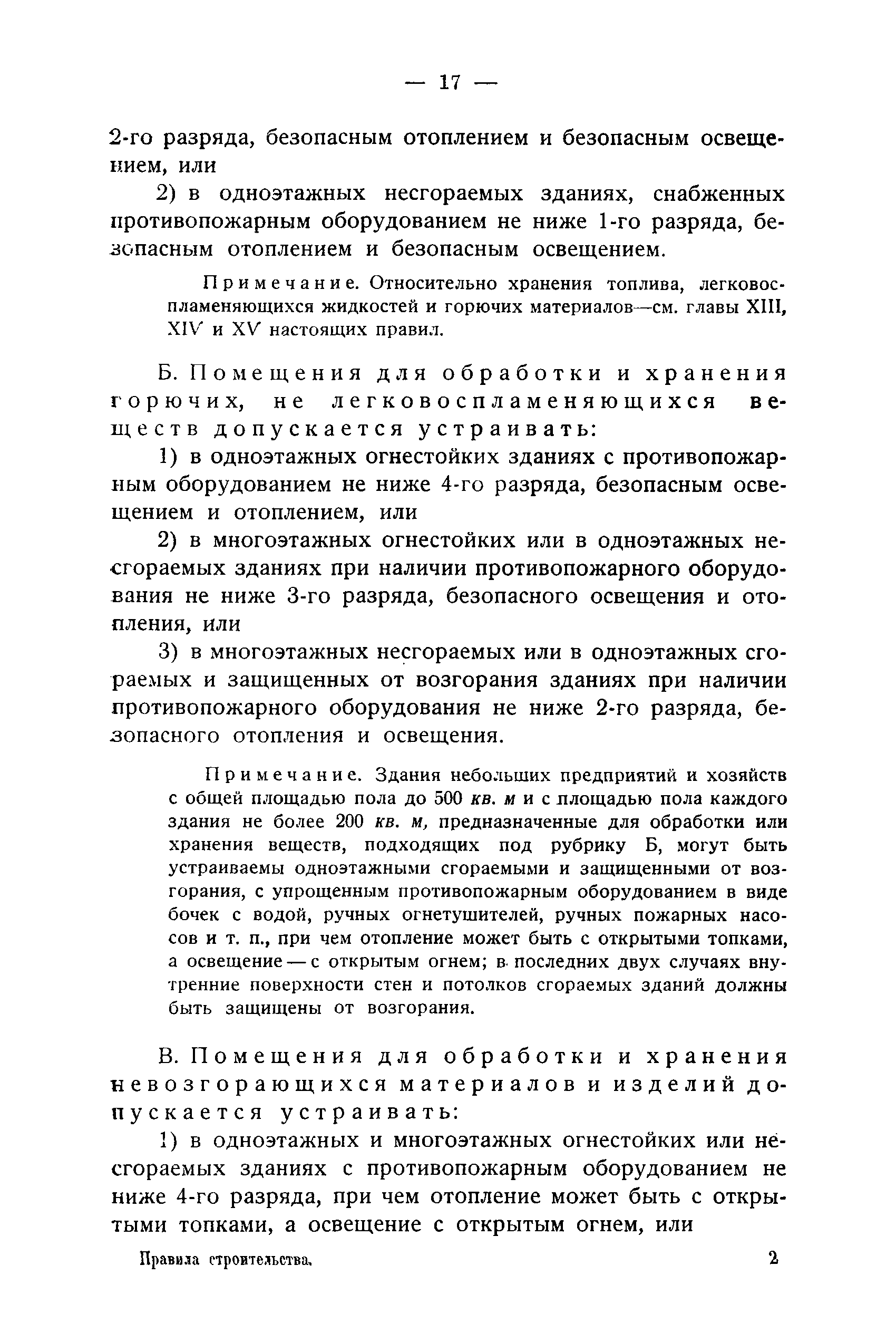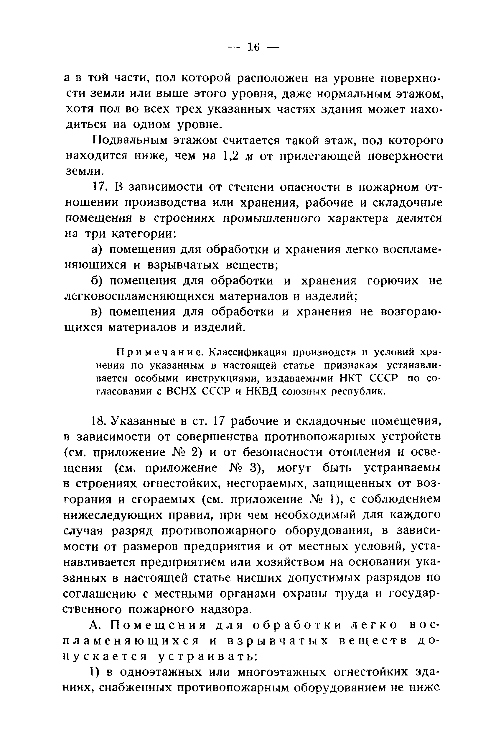 Правила и нормы для промышленного строительства| Статус: | не действует | | Название рус.: | Правила и нормы для промышленного строительства | | Дата добавления в базу: | 21.05.2015 | | Дата актуализации: | 01.01.2021 | | Область применения: | Правила распространяются на промышленное строительство, осуществляемое государственными, коммунальными, кооперативными и концессионными предприятиями и хозяйствами, а равно государственными и частными акционерными обществами и частными лицами, а именно: на постройку новых производственных и складочных предприятий и хозяйств с числом рабочих, занятых в одной смене, не менее 25 человек; на капитальное переустройство и переоборудование производственных и складочных предприятий и хозяйств с числом рабочих, занятых в одной смене, не менее 25 человек; на постройку отдельных зданий и сооружений промышленного характера, возводимых на территории существующих производственных и складочных предприятий и хозяйств с числом рабочих, занятых в одной смене, не менее 25 человек. | | Оглавление: | Постановление КомСТО по строительству Предисловие Вводная часть Глава I Территория производственных предприятий и хозяйств Глава II Типы зданий и противопожарное оборудование Рабочие или производственные помещения Производственно-подсобные помещения Складочные помещения Вспомогательные помещения Глава III Размеры зданий и число этажей Глава IV Расположение зданий на участке Глава V Брандмауэры и выходы Здания сгораемые и защищенные от возгорания Здания смешанные Здания несгораемые Здания огнестойкие Мансардные и чердачные этажи Глава VI Лестницы Глава VII Полы Глава VIII Вспомогательные помещения для рабочих Глава IХ Освещение помещений естественным и искусственным светом Освещение помещений окнами в наружных стенах Освещение помещений путем световых фонарей Искусственное освещение Глава Х Отопление и вентиляция Глава ХI Шахты подъемников Глава ХII Помещения для постоянных паровых котлов Глава ХIII Склады топлива при предприятиях и хозяйствах А. Склады твердого топлива Б. Склады жидкого топлива Глава ХIV Хранение легковоспламеняющихся жидкостей Раздел I Склады легковоспламеняющихся жидкостей Хранение в надземных резервуарах Хранение в подземных резервуарах Хранение в таре Раздел II Места хранения легковоспламеняющихся жидкостей на территории предприятия или хозяйства Хранение в надземных резервуарах Хранение в подземных резервуарах Хранение в таре Глава ХV Хранение горючих материалов Приложение 1. Классификация строительных материалов, а также зданий и их конструктивных элементов в отношении пожарной безопасности Приложение 2. Классификация противопожарного оборудования Приложение 3. Классификация систем отопления и освещения с точки зрения пожарной безопасности Приложение 4. Данные о разрывах для складов жидкого топлива | | Утверждён: | 05.03.1929 Народный Комиссариат Труда Союза ССР
