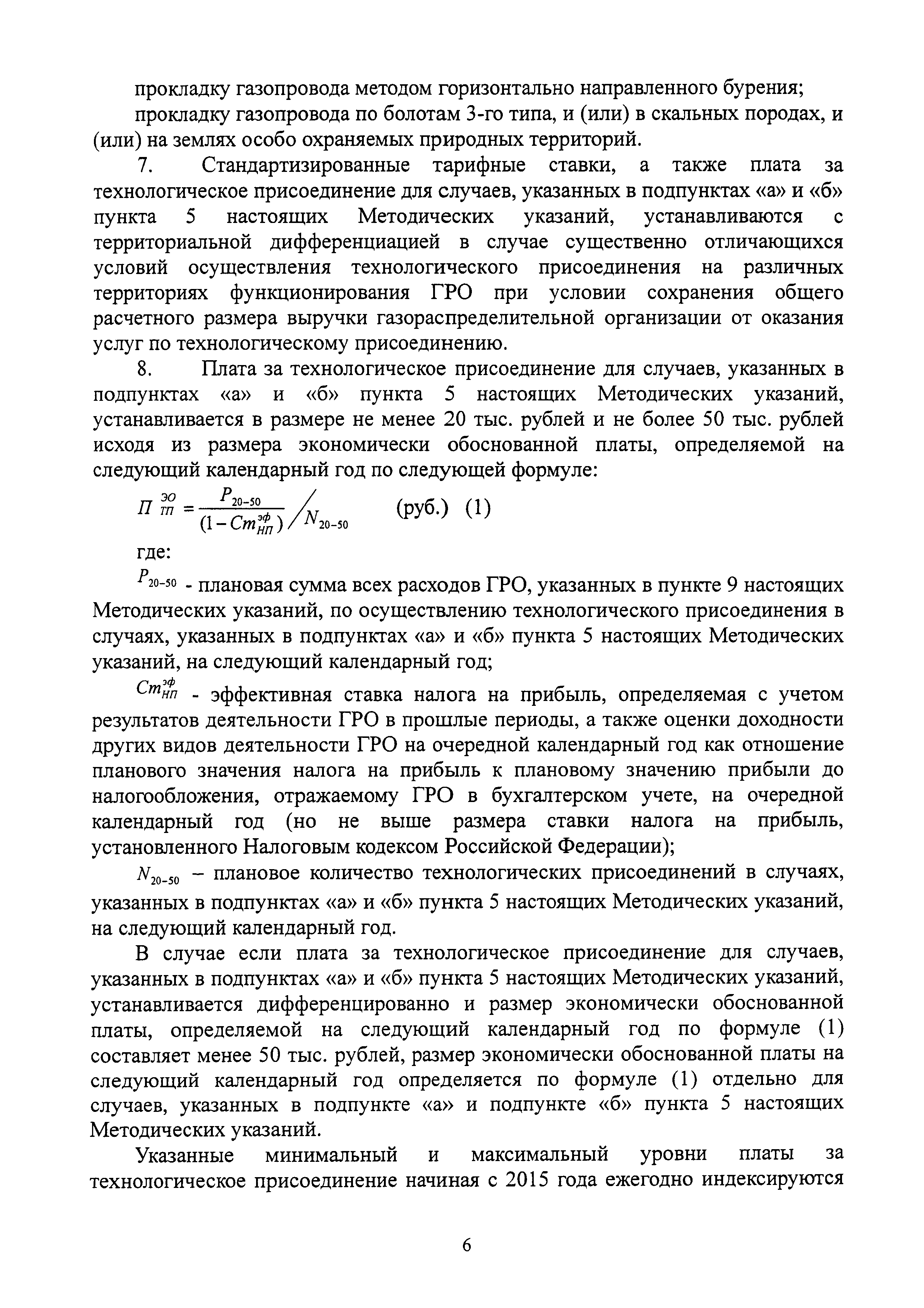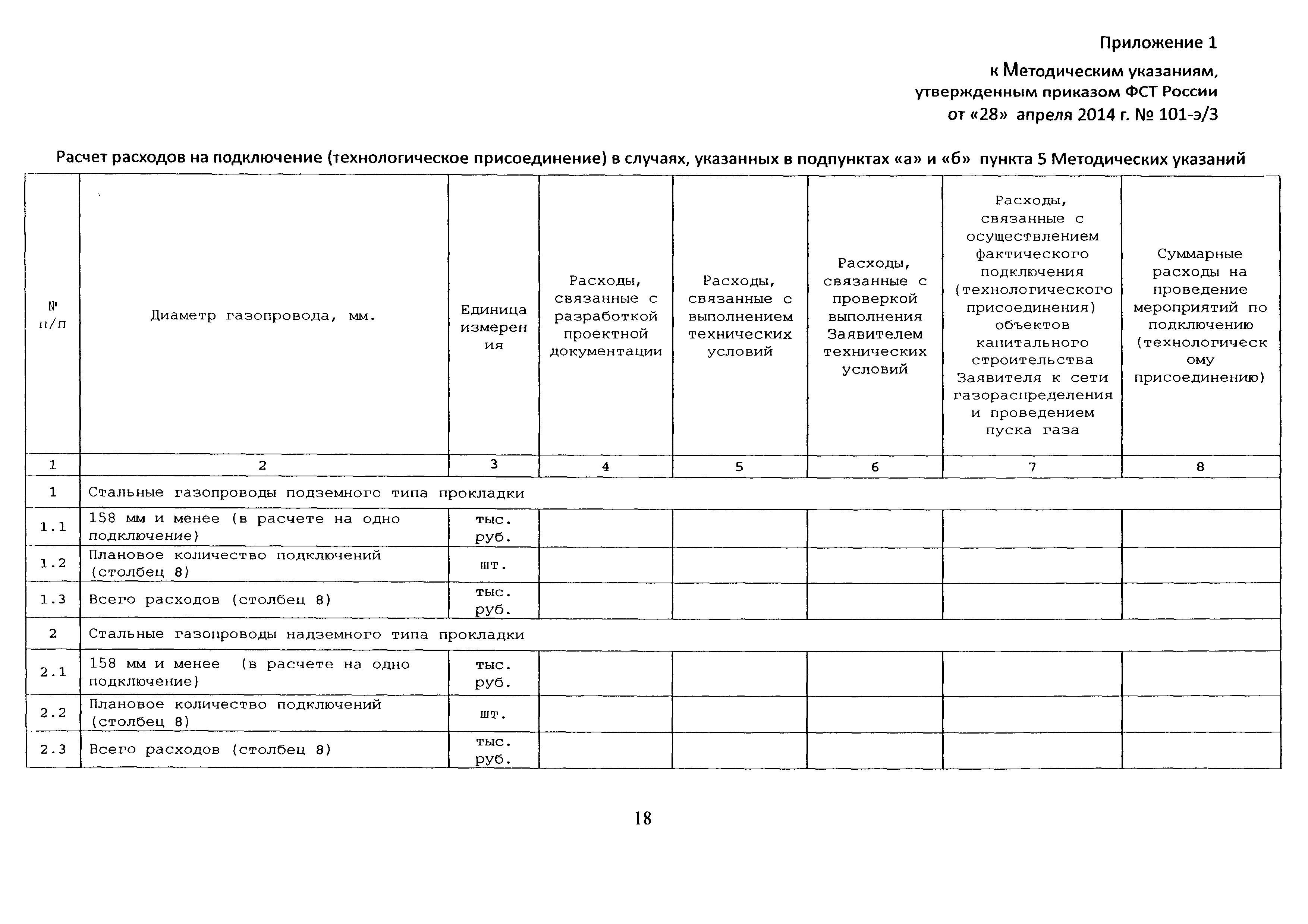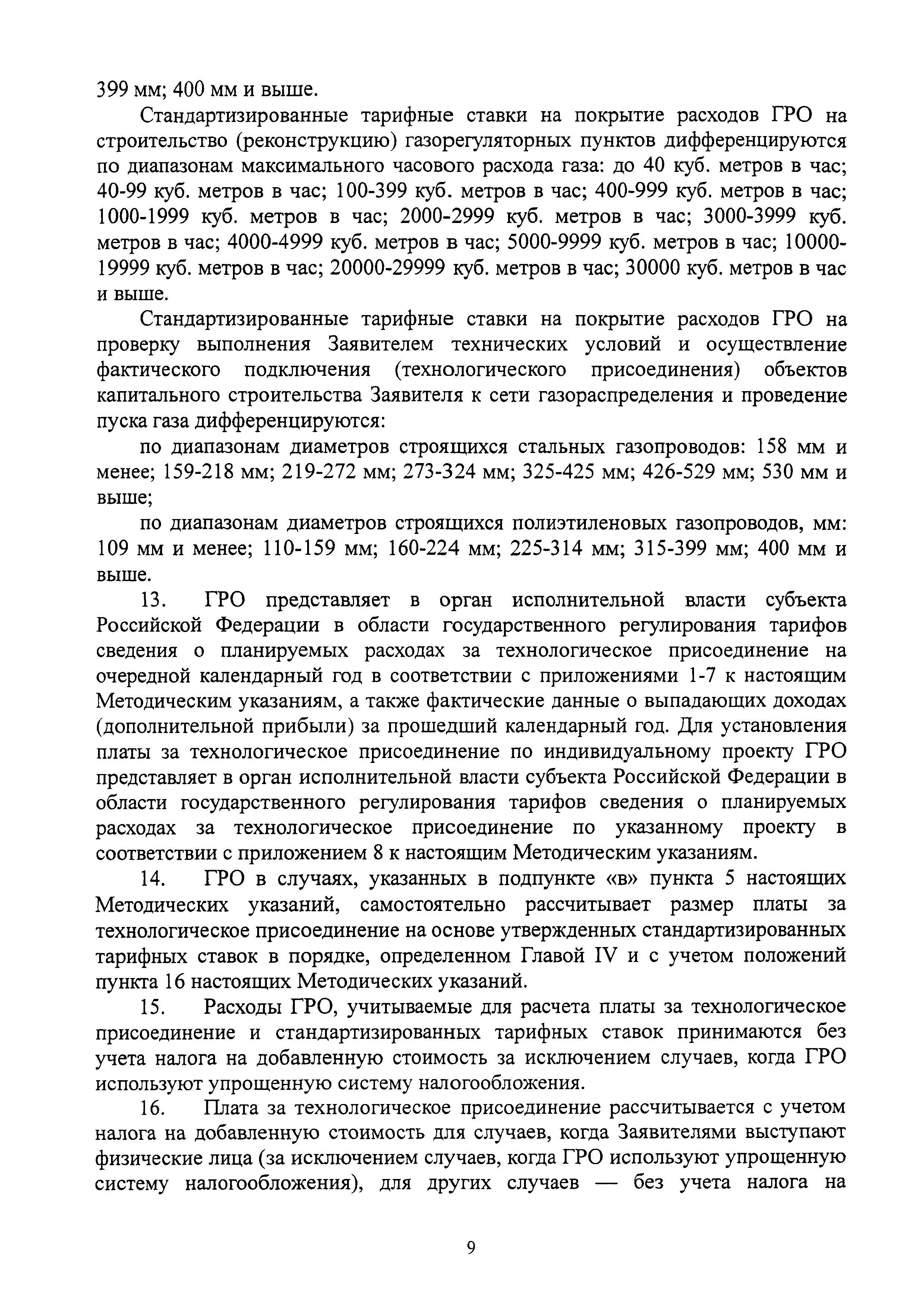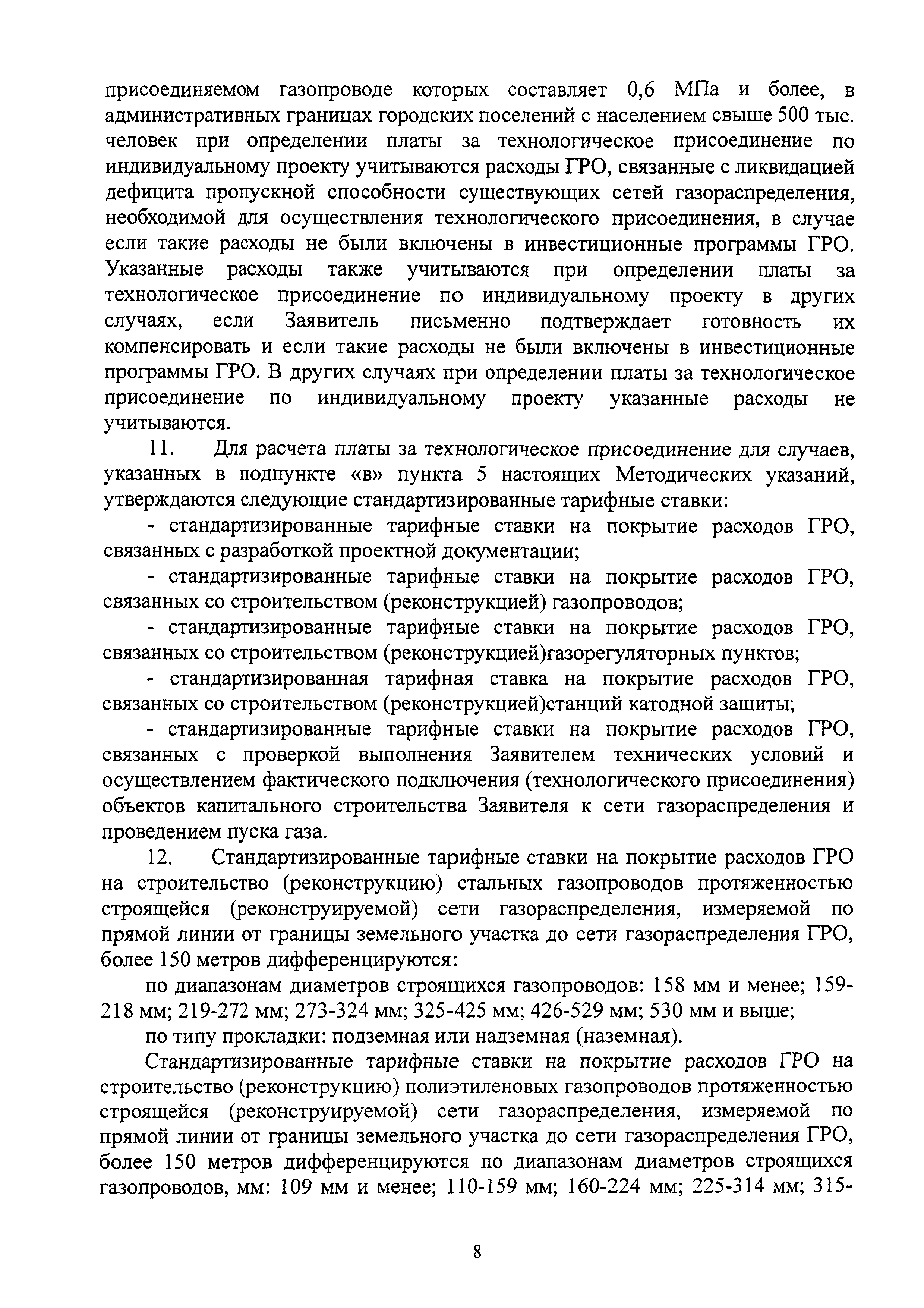 | Оглавление: | I. Общие положения II. Расчет размера платы за технологическое присоединение исходя из стоимости мероприятий по технологическому присоединению, определенной по индивидуальному проекту III. Расчет стандартизированных тарифных ставок IV. Определение величины платы за технологическое присоединение на основании утвержденных стандартизированных тарифных ставок Приложение 1. Расчет расходов на подключение (технологическое присоединение) в случаях, указанных в подпунктах "а" и "б" пункта 5 Методических указаний Приложение 2. Расчет стандартизированной тарифной ставки на покрытие расходов ГРО, связанных с разработкой проектной документации Приложение 3. Расчет стандартизированных тарифных ставок на покрытие расходов ГРО, связанных со строительством (реконструкцией) газопроводов, для случаев, когда протяженность строящейся (реконструируемой) сети газораспределения, измеряемая по прямой линии от границы земельного участка до сети газораспределения ГРО, составляет более 150 метров Приложение 4. Расчет стандартизированной тарифной ставки на покрытие расходов ГРО, связанных со строительством (реконструкцией) газопроводов, для случаев, когда протяженность строящейся (реконструируемой) сети газораспределения, измеряемая по прямой линии от границы земельного участка до сети газораспределения ГРО, составляет 150 метров и менее Приложение 5. Расчет стандартизированных тарифных ставок на покрытие расходов ГРО, связанных со строительством (реконструкцией) газорегуляторных пунктов Приложение 6. Расчет стандартизированной тарифной ставки на покрытие расходов, связанных со строительством (реконструкцией) станций катодной защиты Приложение 7. Расчет стандартизированных тарифных ставок на покрытие расходов ГРО, связанных с проверкой выполнения Заявителем технических условий и осуществлением фактического подключения (технологического присоединения) объектов капитального строительства Заявителя к сети газораспределения Приложение 8. Расчет платы за технологическое присоединение газоиспользующего оборудования по индивидуальному проекту |