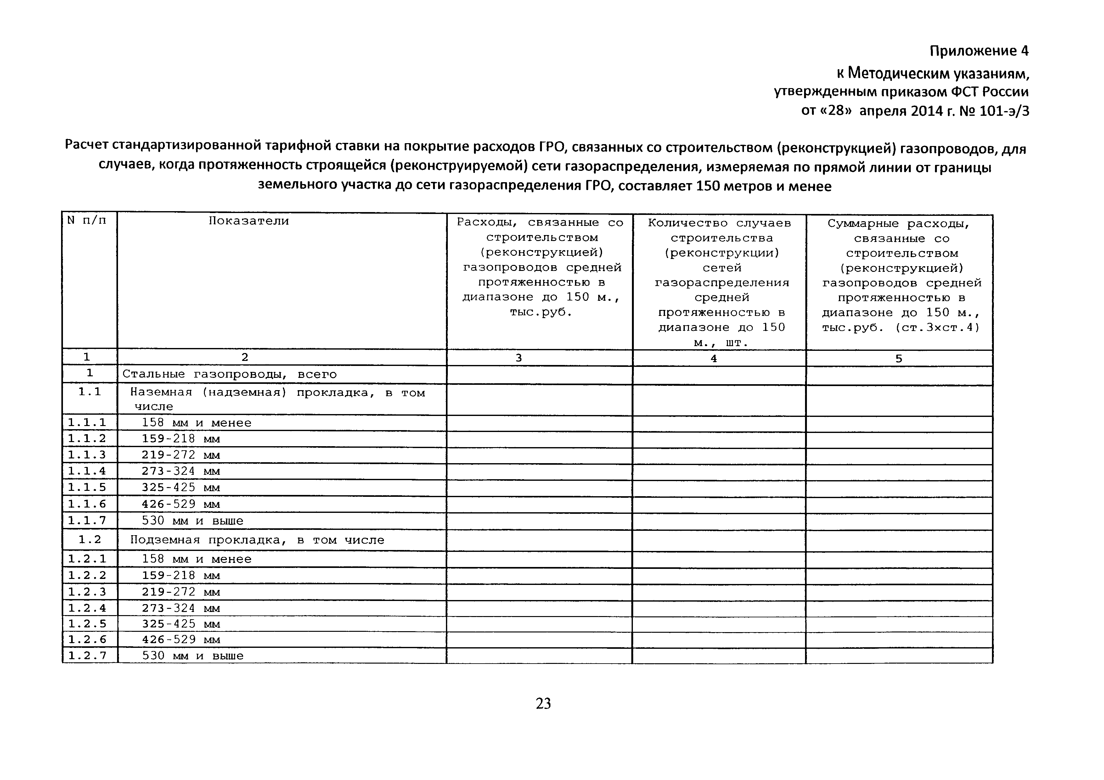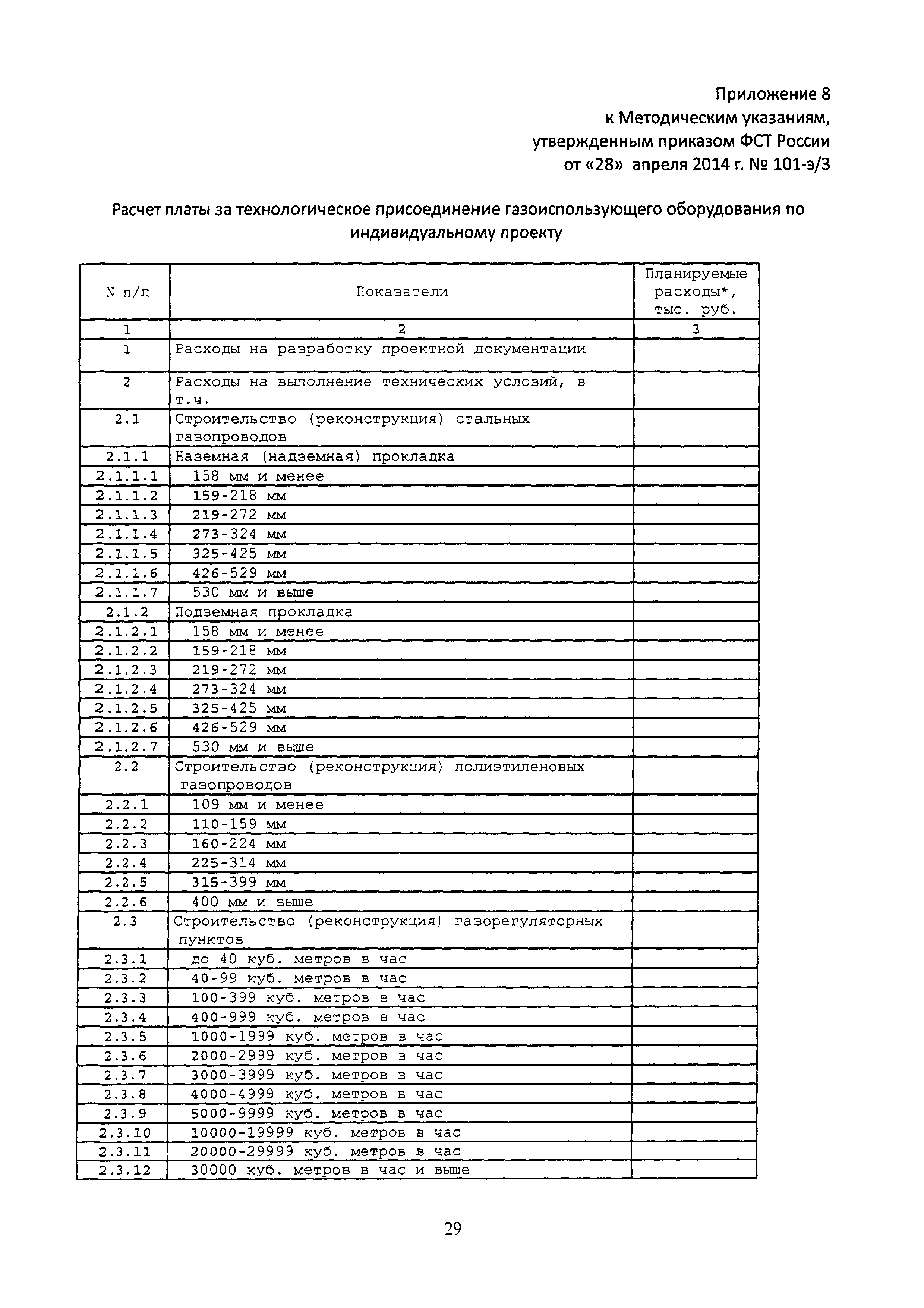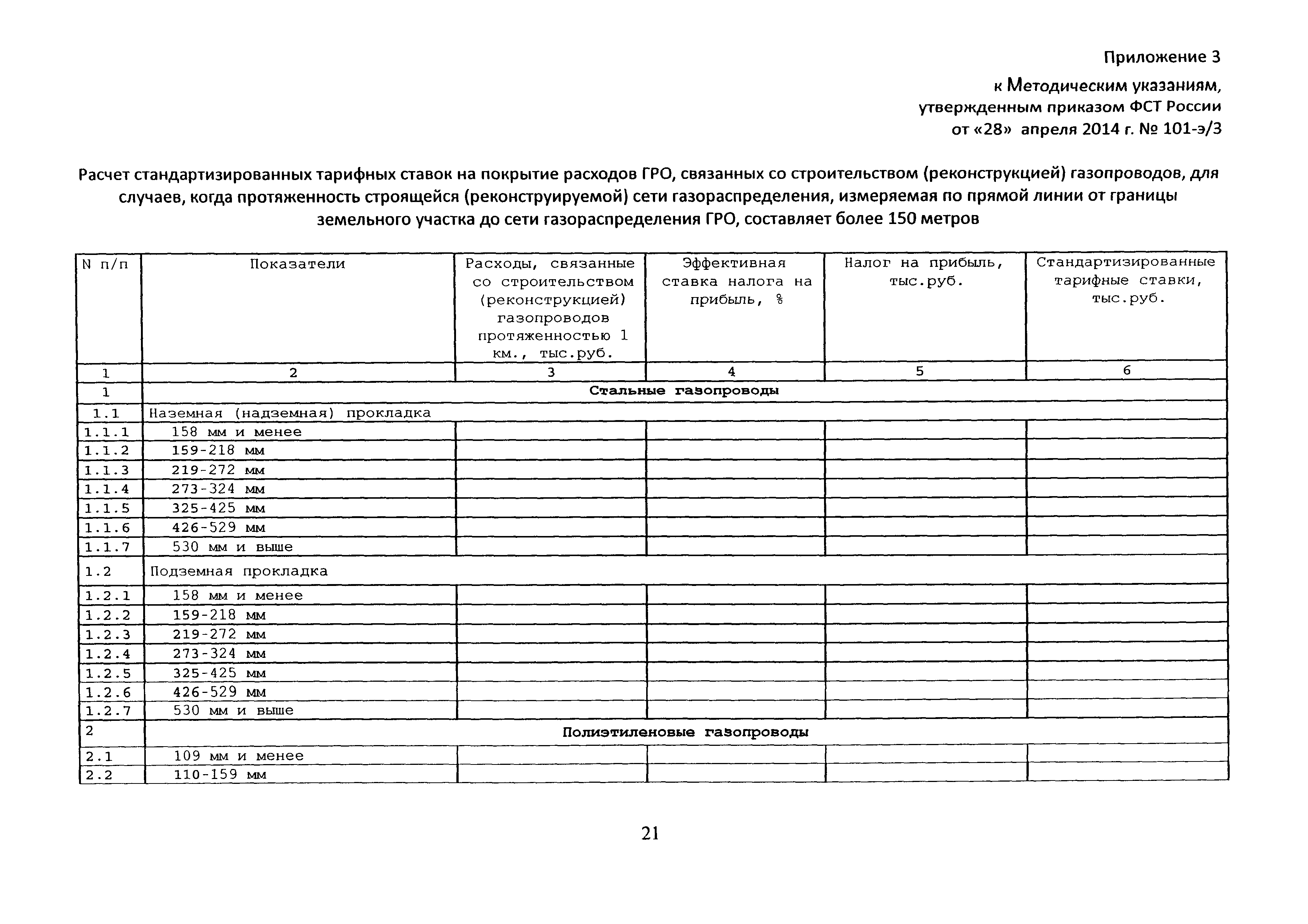 | Оглавление: | I. Общие положения II. Расчет размера платы за технологическое присоединение исходя из стоимости мероприятий по технологическому присоединению, определенной по индивидуальному проекту III. Расчет стандартизированных тарифных ставок IV. Определение величины платы за технологическое присоединение на основании утвержденных стандартизированных тарифных ставок Приложение 1. Расчет расходов на подключение (технологическое присоединение) в случаях, указанных в подпунктах "а" и "б" пункта 5 Методических указаний Приложение 2. Расчет стандартизированной тарифной ставки на покрытие расходов ГРО, связанных с разработкой проектной документации Приложение 3. Расчет стандартизированных тарифных ставок на покрытие расходов ГРО, связанных со строительством (реконструкцией) газопроводов, для случаев, когда протяженность строящейся (реконструируемой) сети газораспределения, измеряемая по прямой линии от границы земельного участка до сети газораспределения ГРО, составляет более 150 метров Приложение 4. Расчет стандартизированной тарифной ставки на покрытие расходов ГРО, связанных со строительством (реконструкцией) газопроводов, для случаев, когда протяженность строящейся (реконструируемой) сети газораспределения, измеряемая по прямой линии от границы земельного участка до сети газораспределения ГРО, составляет 150 метров и менее Приложение 5. Расчет стандартизированных тарифных ставок на покрытие расходов ГРО, связанных со строительством (реконструкцией) газорегуляторных пунктов Приложение 6. Расчет стандартизированной тарифной ставки на покрытие расходов, связанных со строительством (реконструкцией) станций катодной защиты Приложение 7. Расчет стандартизированных тарифных ставок на покрытие расходов ГРО, связанных с проверкой выполнения Заявителем технических условий и осуществлением фактического подключения (технологического присоединения) объектов капитального строительства Заявителя к сети газораспределения Приложение 8. Расчет платы за технологическое присоединение газоиспользующего оборудования по индивидуальному проекту |