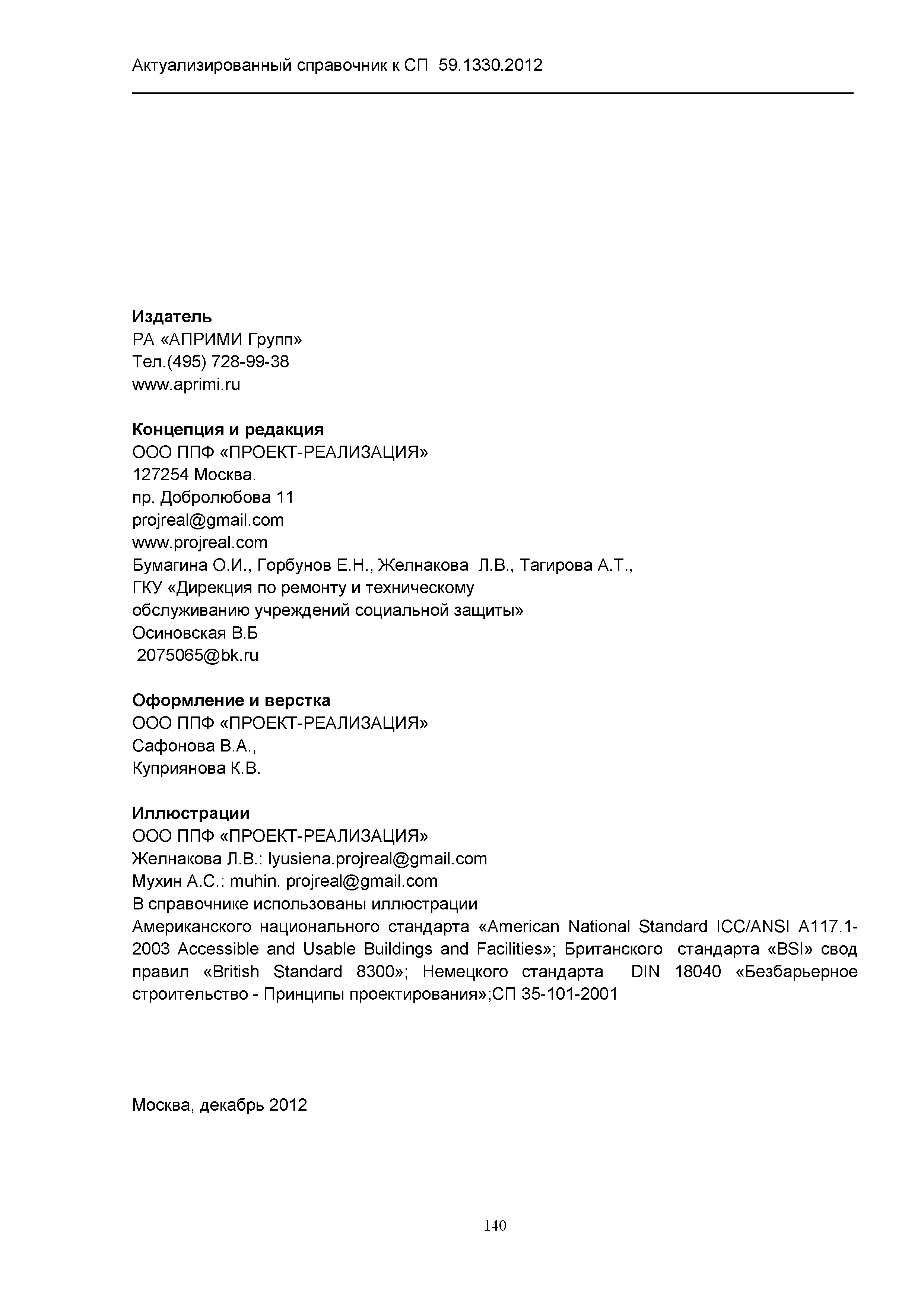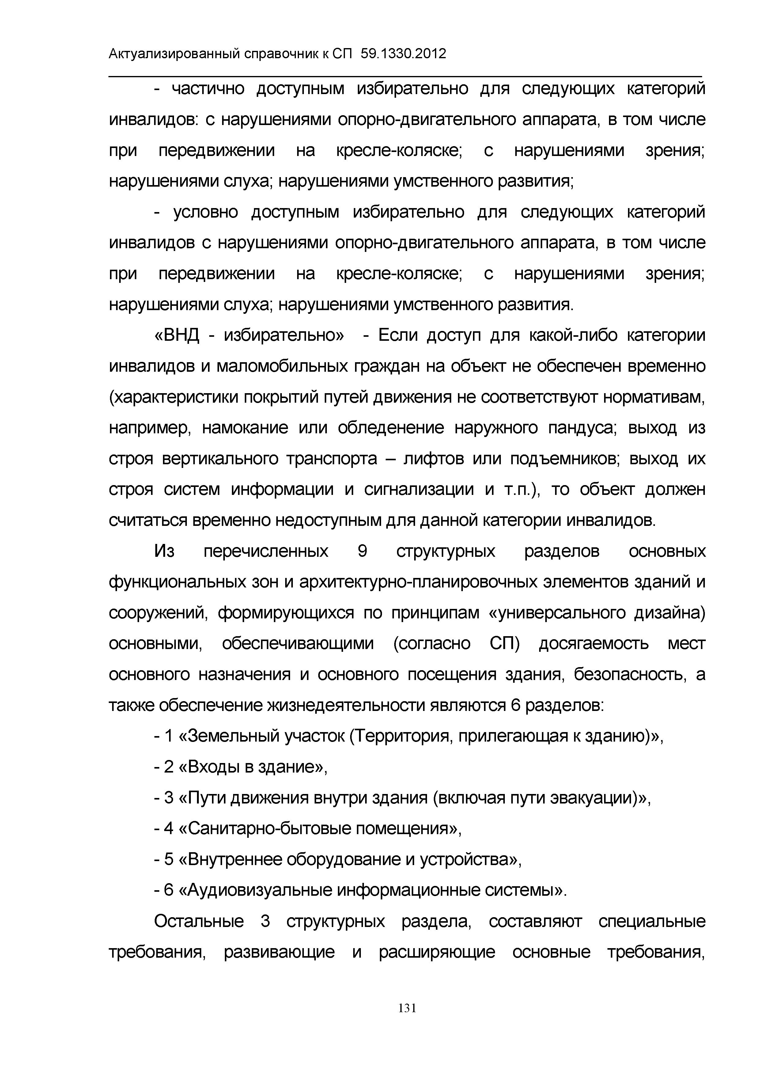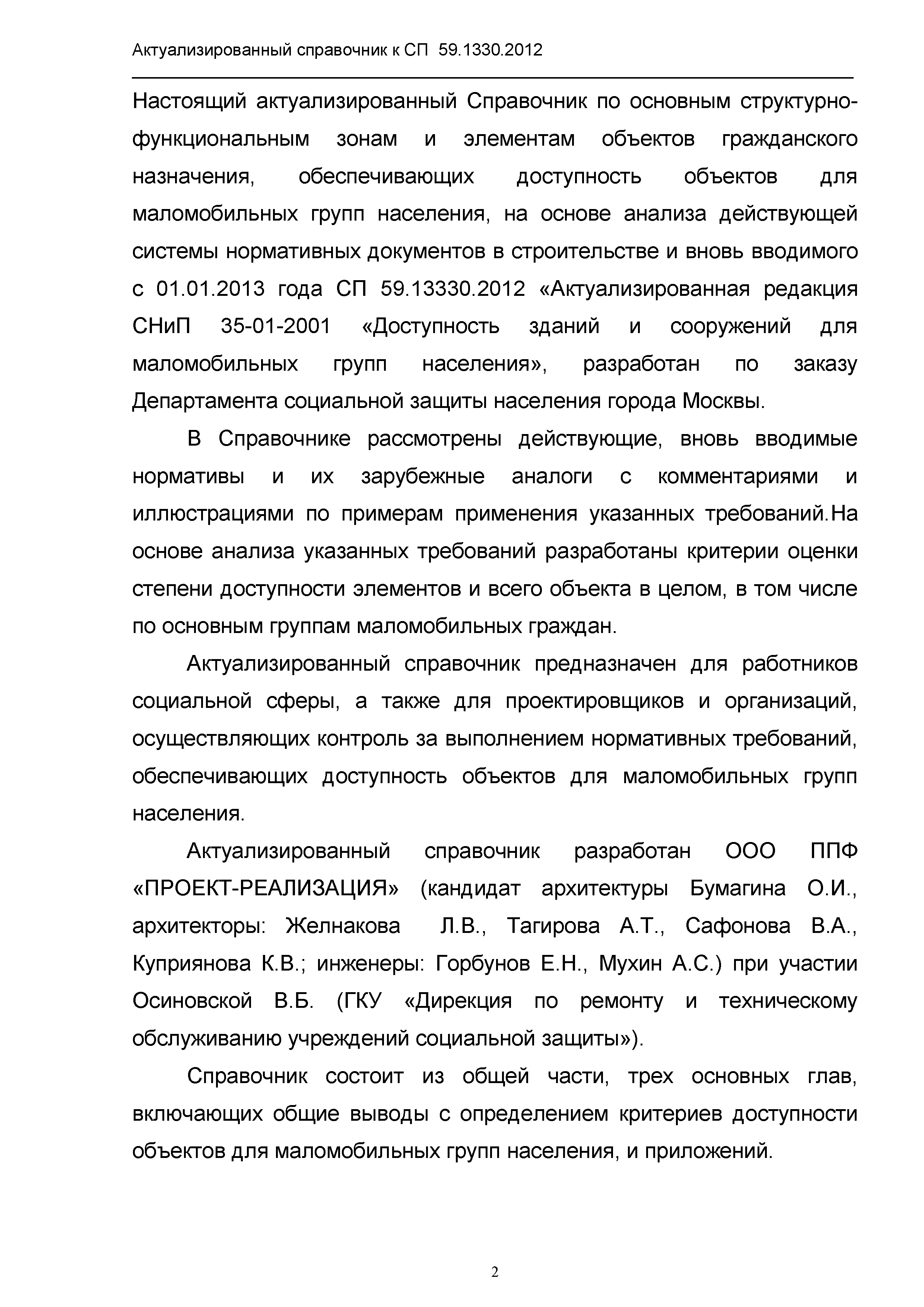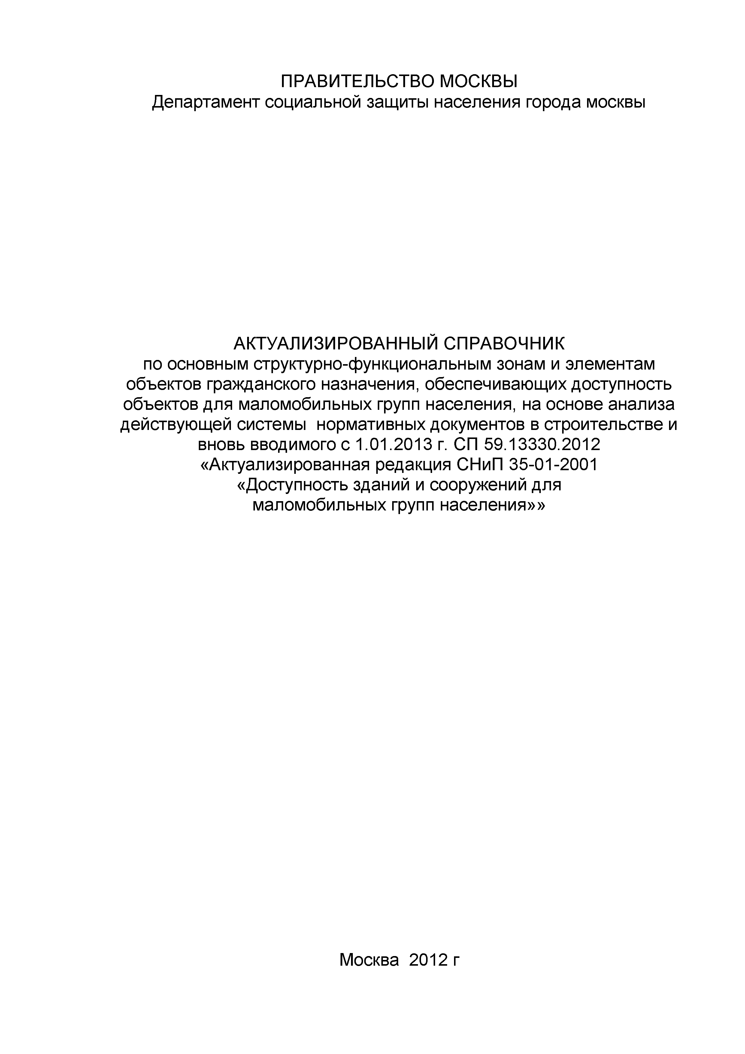 | Название рус.: | Актуализированный справочник по основным структурно-функциональным зонам и элементам объектов гражданского назначения, обеспечивающих доступность объектов для маломобильных групп населения, на основе анализа действующей системы нормативных документов в строительстве и вновь вводимого с 1.01.2013 г. СП 59.13330.2012 "Актуализированная редакция СНиП 35-01-2001 "Доступность зданий и сооружений для маломобильных групп населения" |