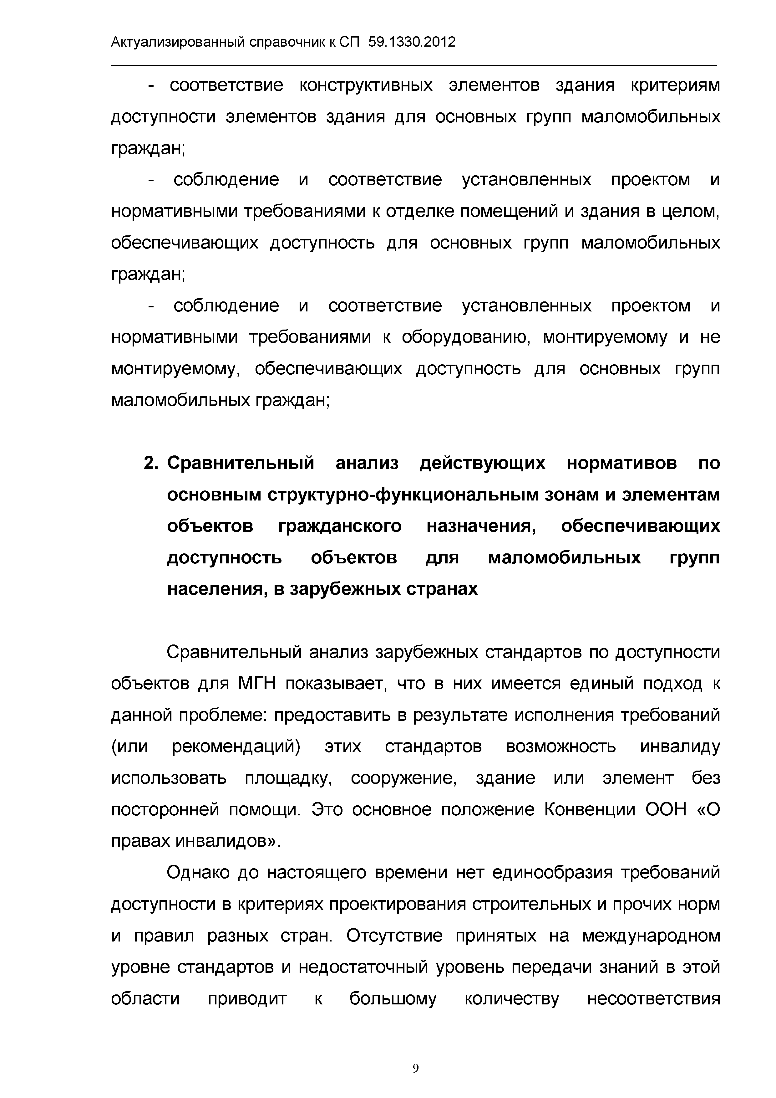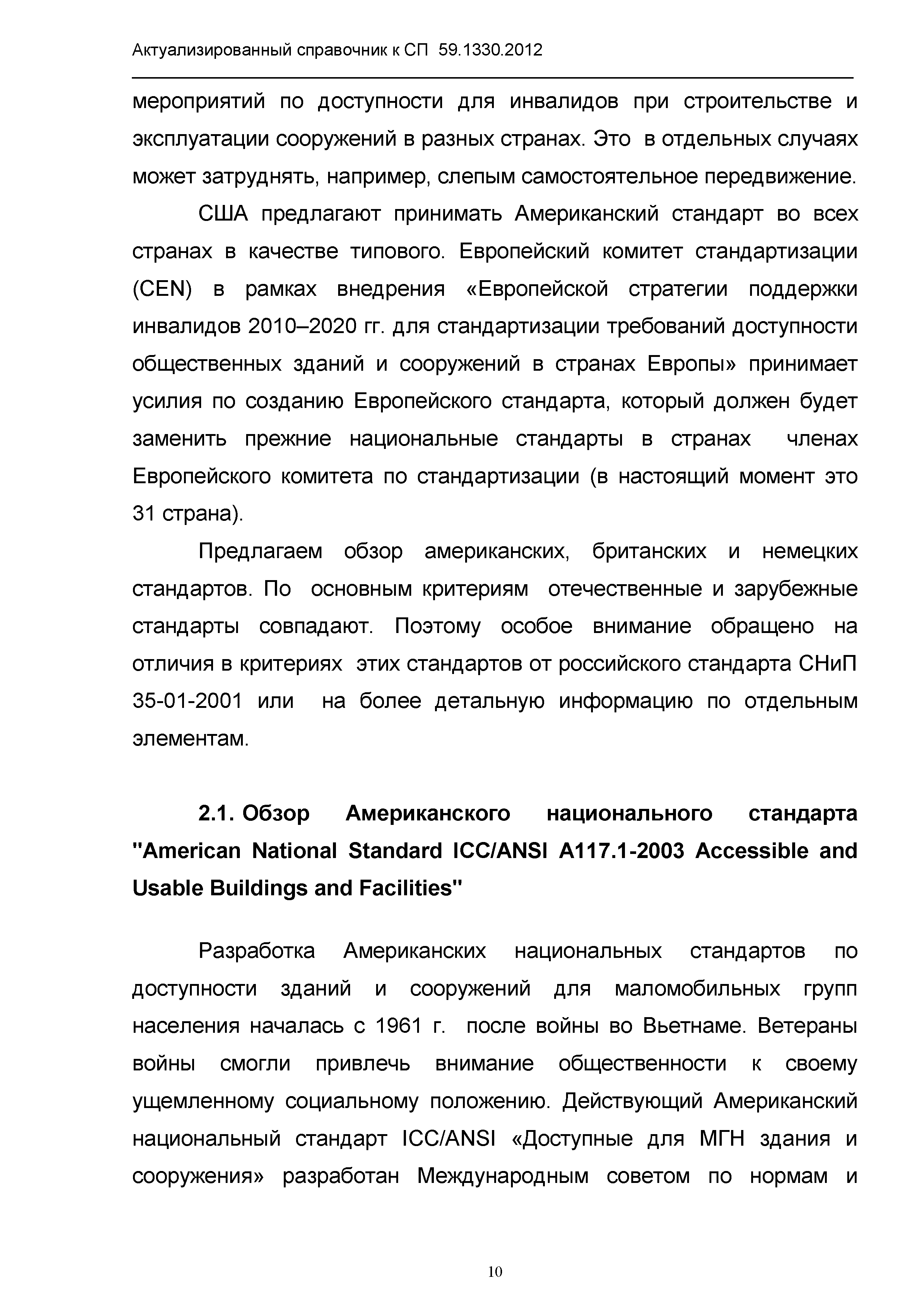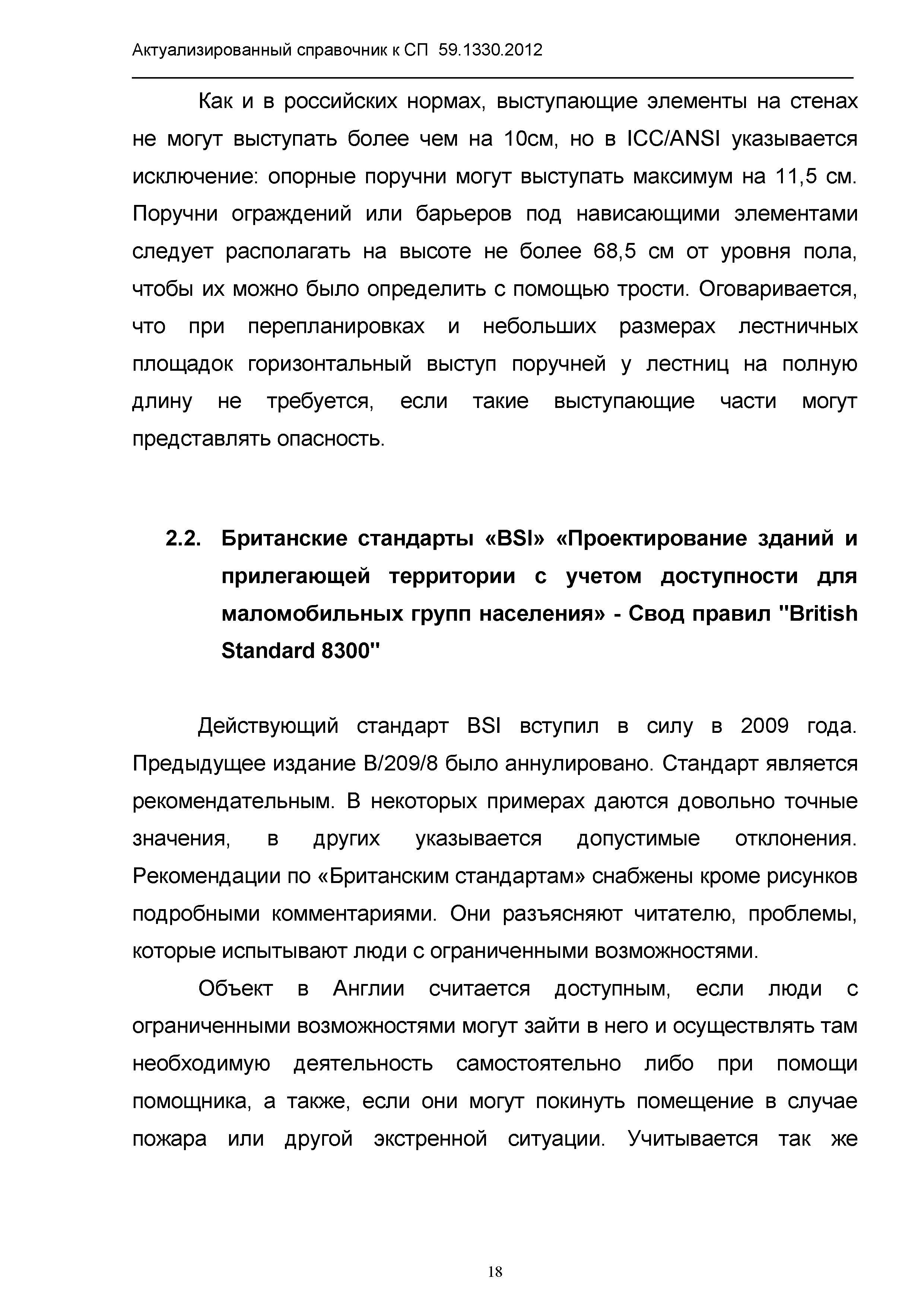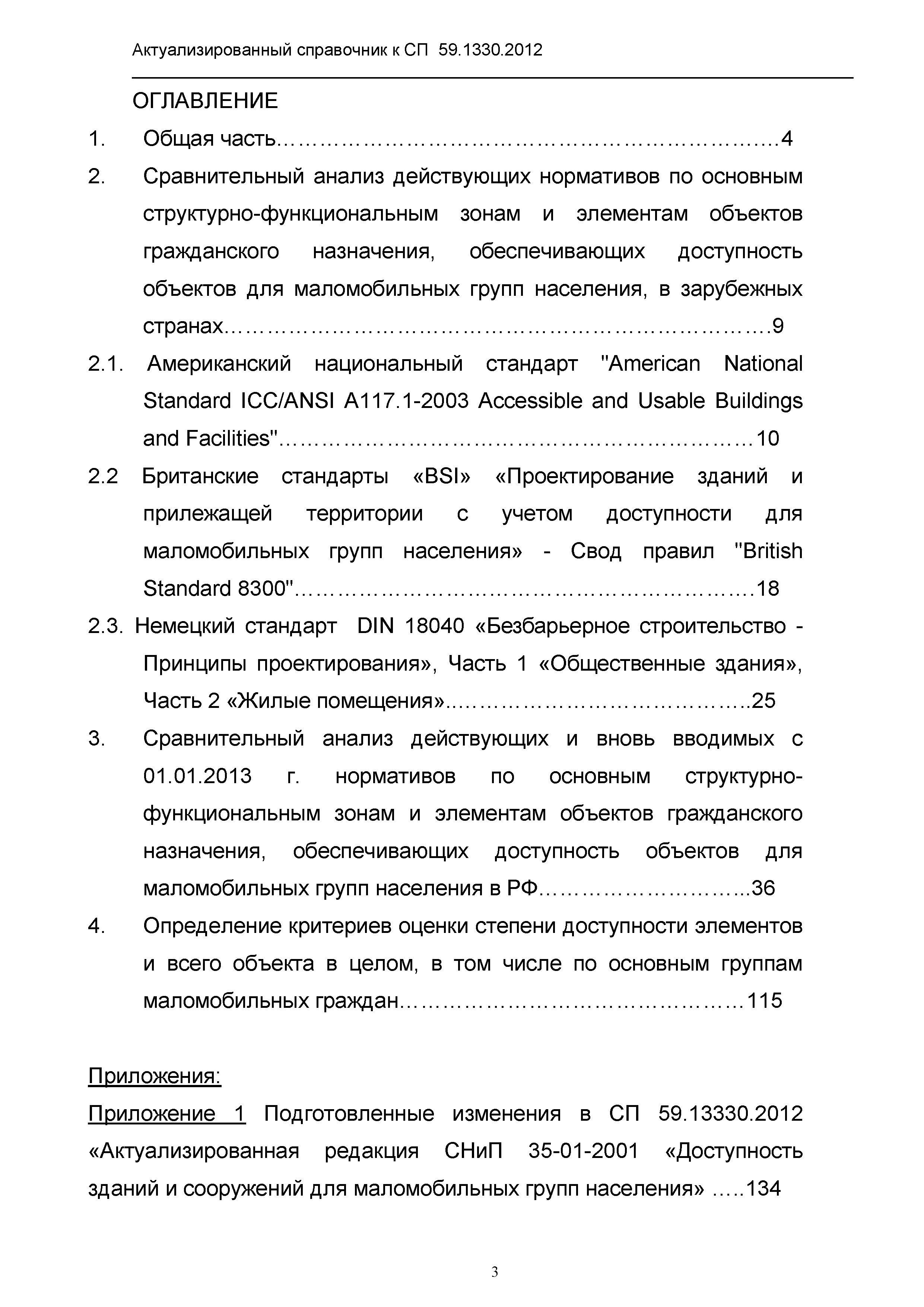 | Оглавление: | 1. Общая часть 2. Сравнительный анализ действующих нормативов по основным структурно-функциональным зонам и элементам объектов гражданского назначения, обеспечивающих доступность объектов для маломобильных групп населения, в зарубежных странах 2.1. Американский национальный стандарт "American National Standard ICC/ANSI A117.1-2003 Accessible and Usable Buildings and Facilities" 2.2 Британские стандарты "BSI" "Проектирование зданий и прилежащей территории с учетом доступности для маломобильных групп населения" - Свод правил "British Standard 8300" 2.3. Немецкий стандарт DIN 18040 "Безбарьерное строительство - Принципы проектирования", Часть 1 "Общественные здания", Часть 2 "Жилые помещения" 3. Сравнительный анализ действующих и вновь вводимых с 01.01.2013 г. нормативов по основным структурно-функциональным зонам и элементам объектов гражданского назначения, обеспечивающих доступность объектов для маломобильных групп населения в РФ 4. Определение критериев оценки степени доступности элементов и всего объекта в целом, в том числе по основным группам маломобильных граждан Приложение 1. Подготовленные изменения в СП 59.13330.2012 "Актуализированная редакция СНиП 35-01-2001 "Доступность зданий и сооружений для маломобильных групп населения" |