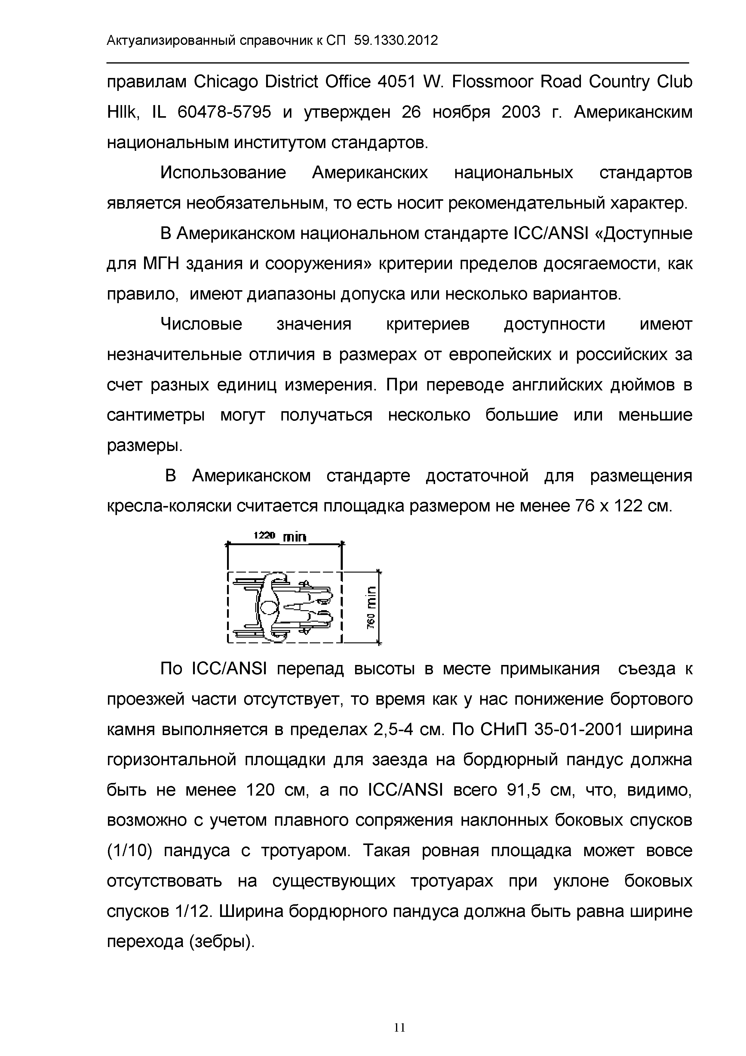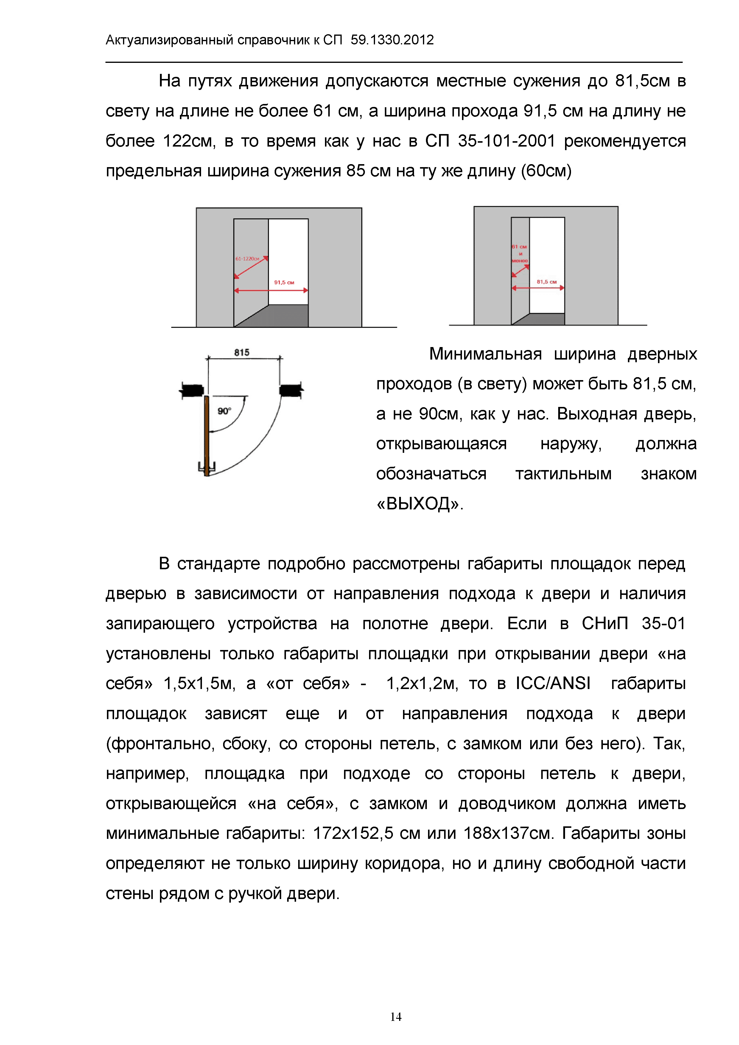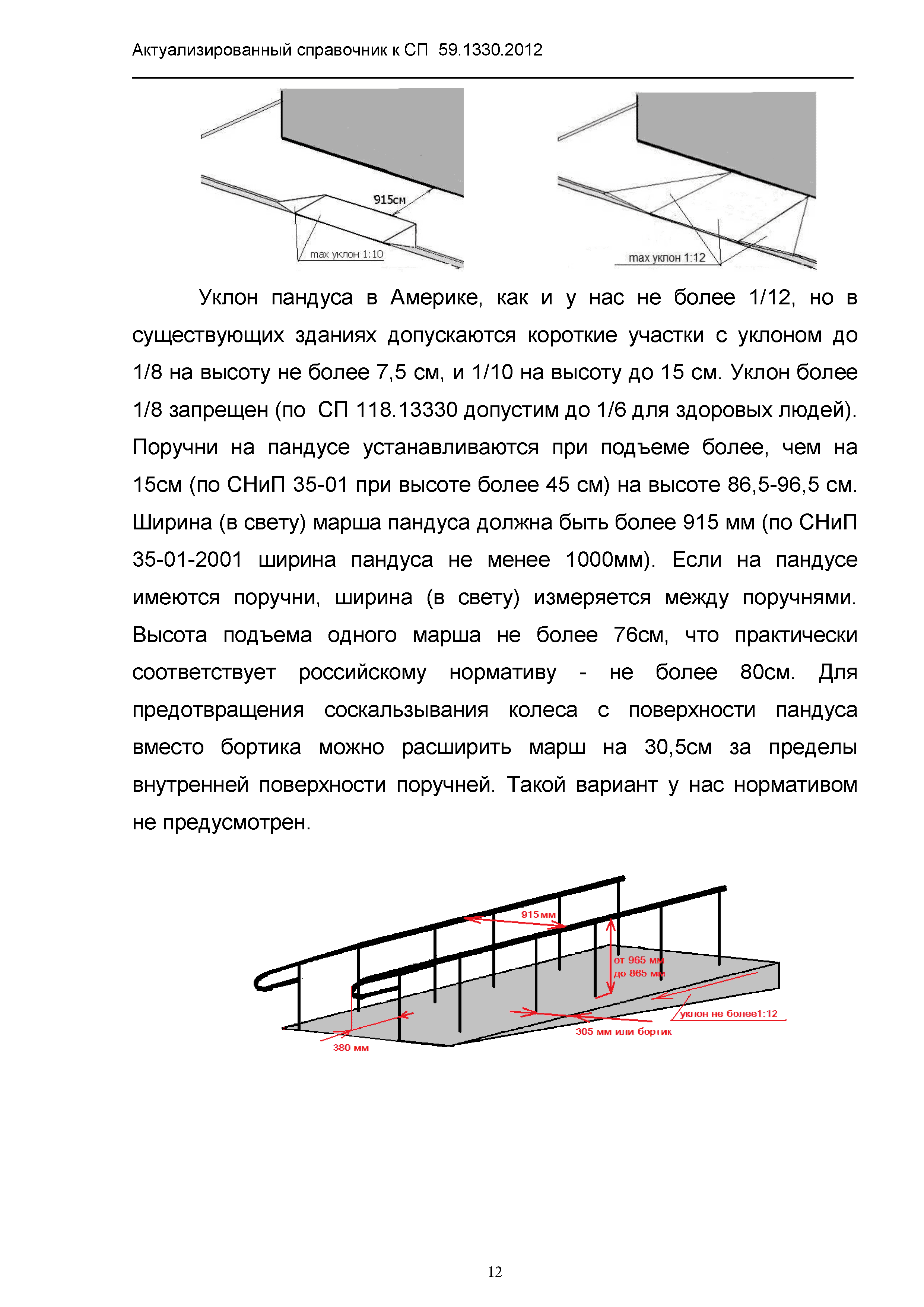 | Оглавление: | 1. Общая часть 2. Сравнительный анализ действующих нормативов по основным структурно-функциональным зонам и элементам объектов гражданского назначения, обеспечивающих доступность объектов для маломобильных групп населения, в зарубежных странах 2.1. Американский национальный стандарт "American National Standard ICC/ANSI A117.1-2003 Accessible and Usable Buildings and Facilities" 2.2 Британские стандарты "BSI" "Проектирование зданий и прилежащей территории с учетом доступности для маломобильных групп населения" - Свод правил "British Standard 8300" 2.3. Немецкий стандарт DIN 18040 "Безбарьерное строительство - Принципы проектирования", Часть 1 "Общественные здания", Часть 2 "Жилые помещения" 3. Сравнительный анализ действующих и вновь вводимых с 01.01.2013 г. нормативов по основным структурно-функциональным зонам и элементам объектов гражданского назначения, обеспечивающих доступность объектов для маломобильных групп населения в РФ 4. Определение критериев оценки степени доступности элементов и всего объекта в целом, в том числе по основным группам маломобильных граждан Приложение 1. Подготовленные изменения в СП 59.13330.2012 "Актуализированная редакция СНиП 35-01-2001 "Доступность зданий и сооружений для маломобильных групп населения" |