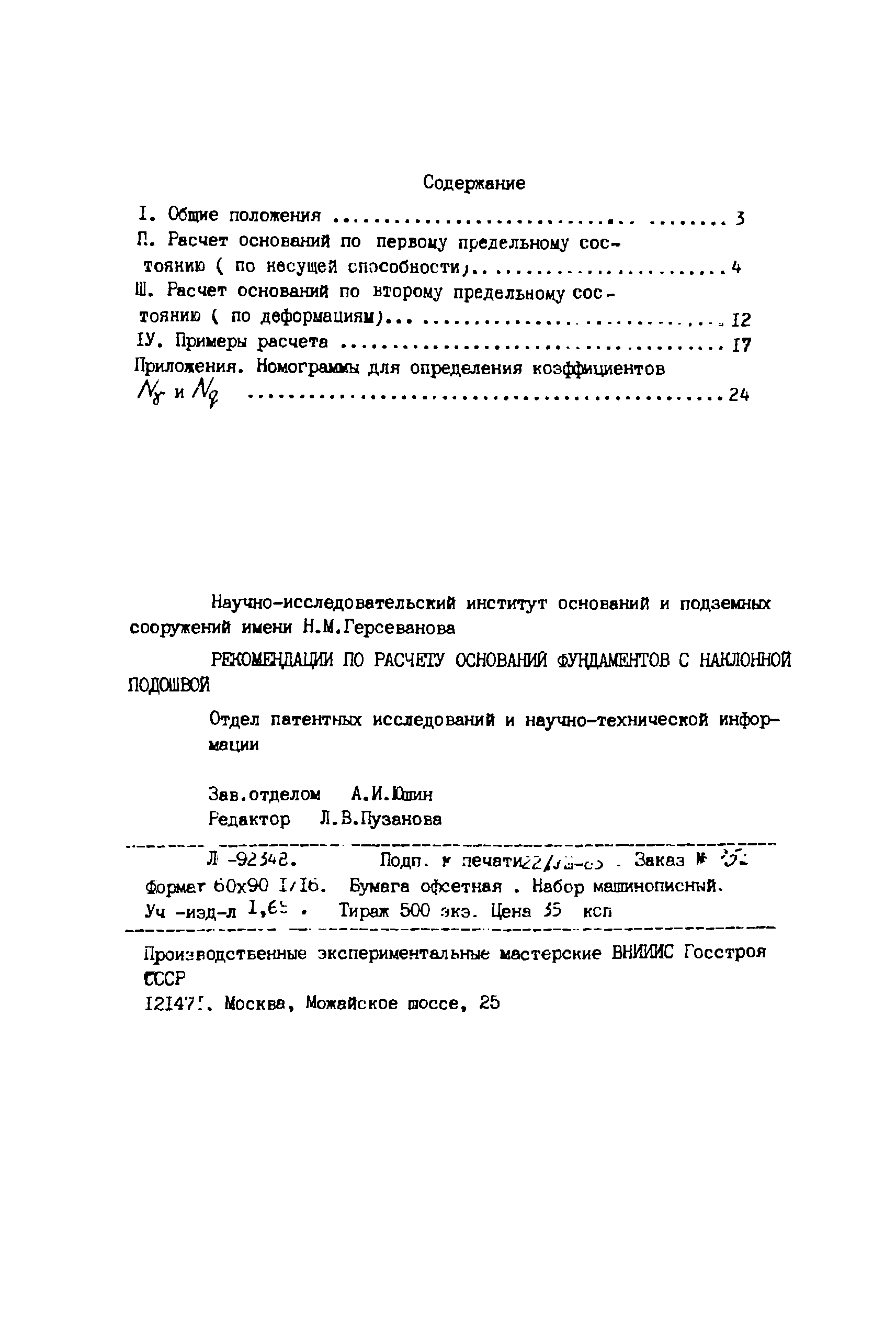 | Оглавление: | I. Общие положения . II. Расчет оснований по первому предельному состоянию ( по несущей способности) III. Расчет оснований по второму предельному состоянию, по деформациям) IV Примеры расчета Приложения. Номограммы для определения коэффициентов N |