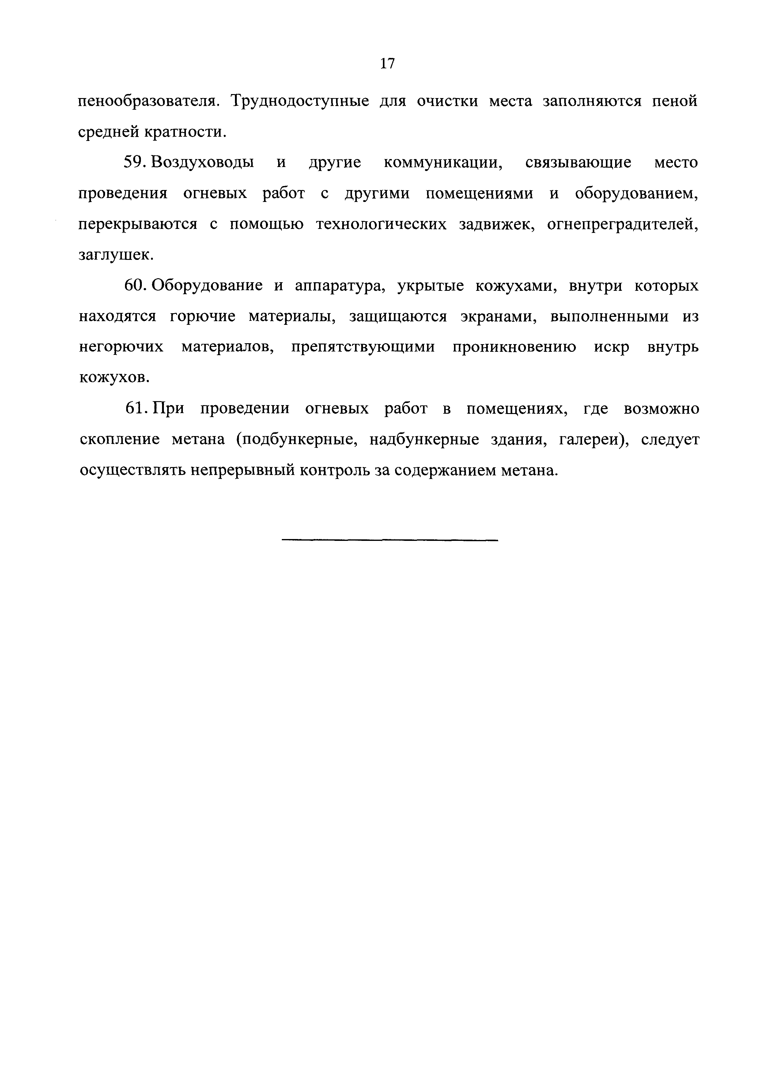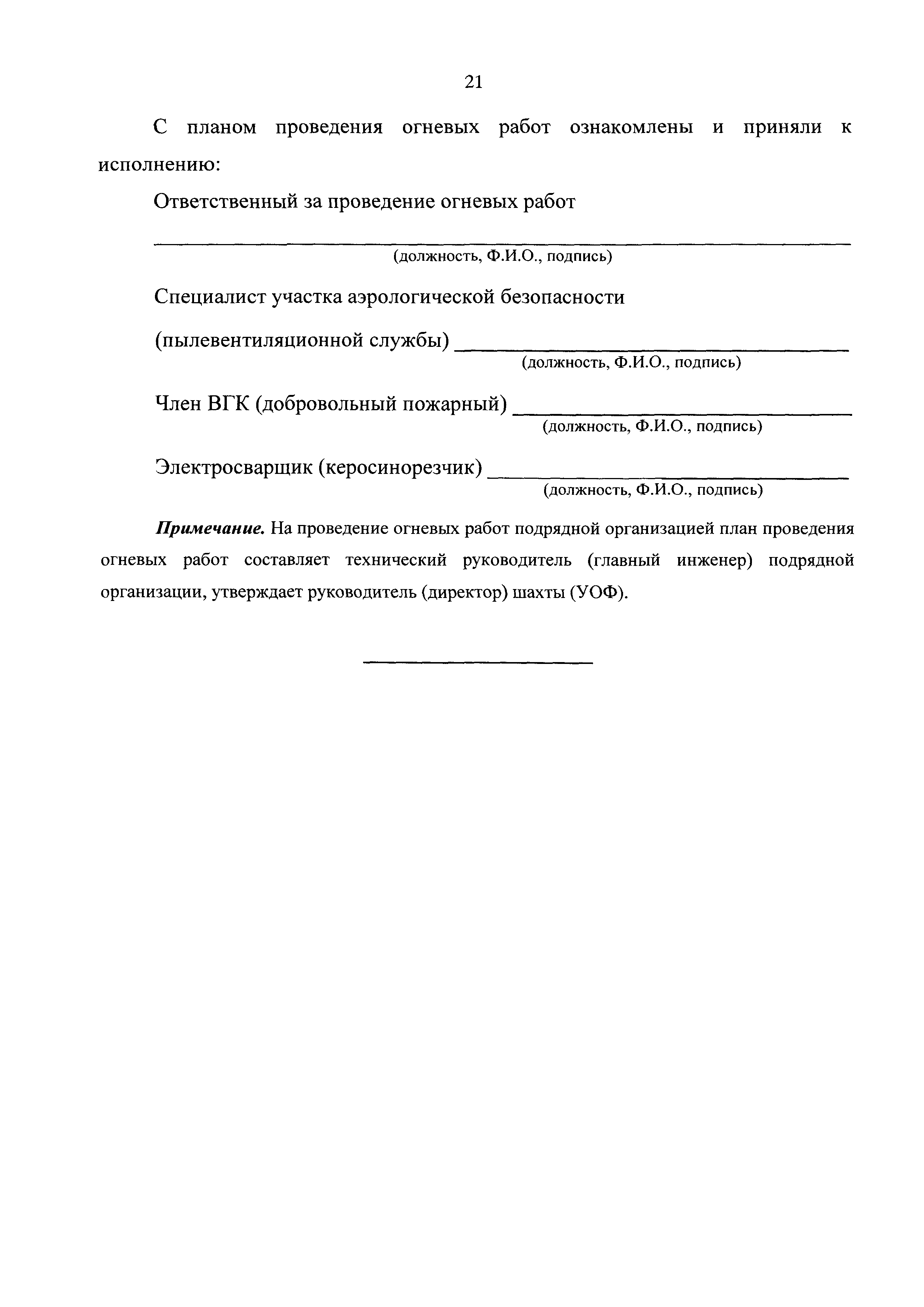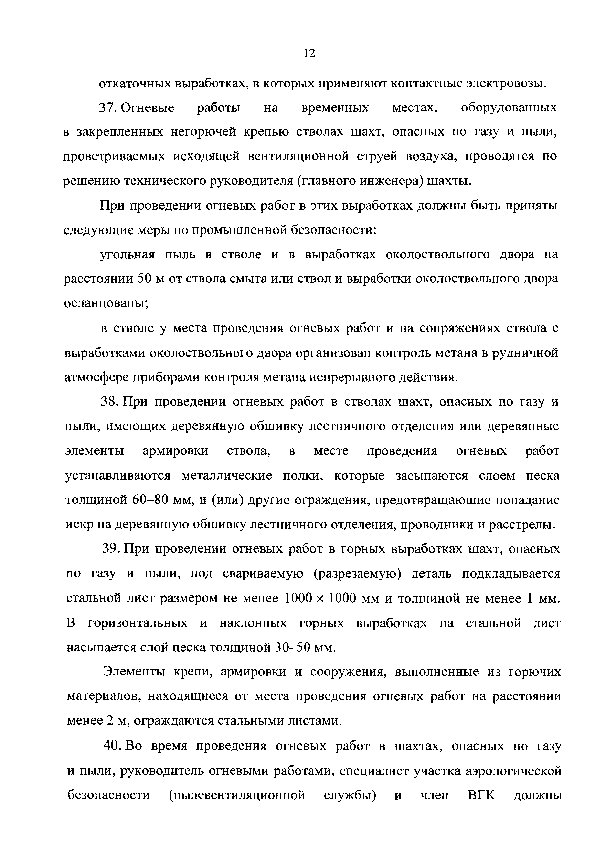 | Оглавление: | I. Общие положения II. Проведение огневых работ на временных местах III. Оборудование, применяемое для проведения огневых работ на временных местах IV. Проведение огневых работ в горных выработках шахт, опасных по газу и пыли V. Проведение огневых работ в горных выработках шахт, отрабатывающих пласты, опасные по внезапным выбросам угля, породы и газа VI. Проведение огневых работ в надшахтных зданиях шахт и углеобогатительных фабриках Приложение. План проведения огневых работ |