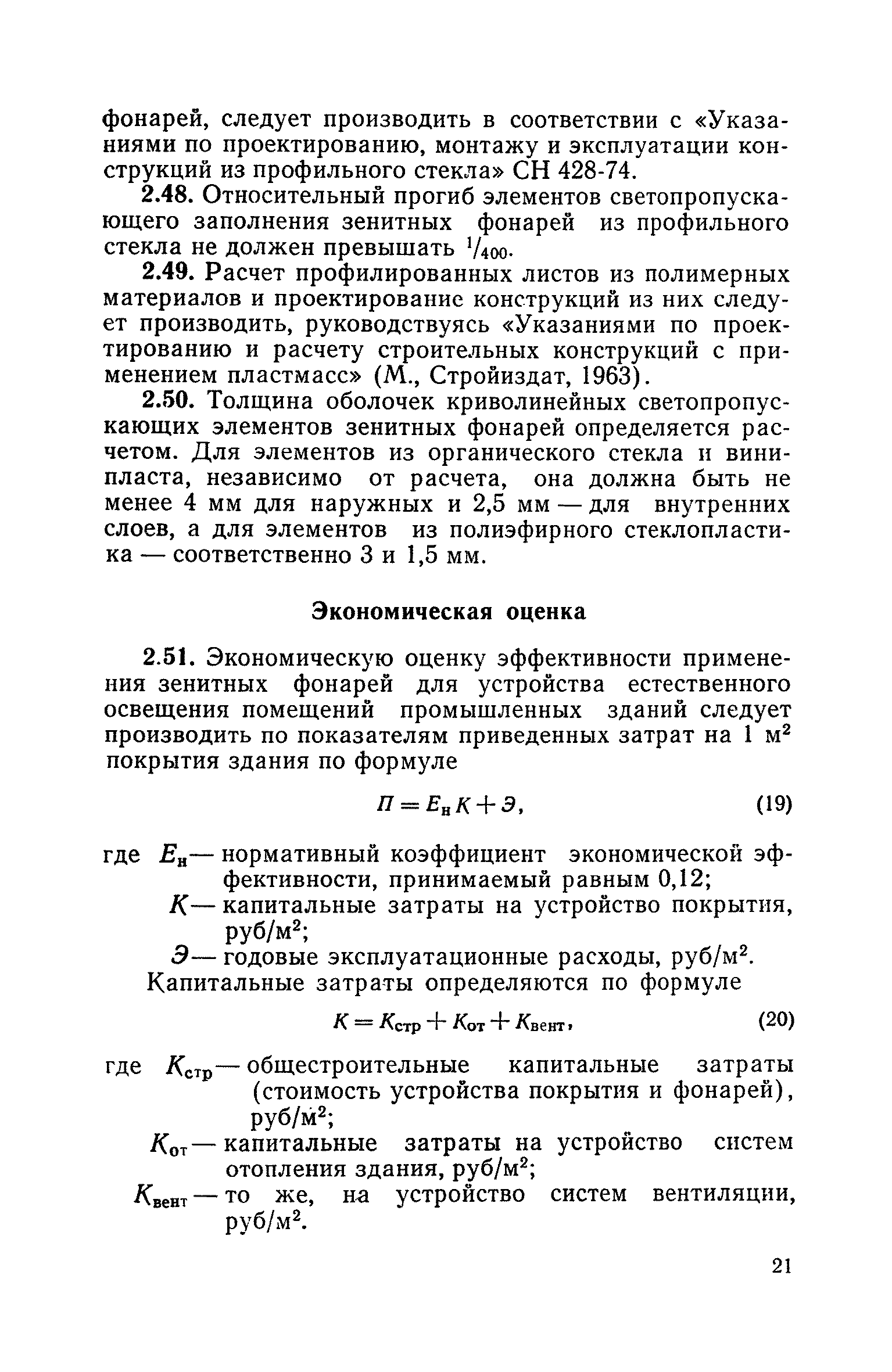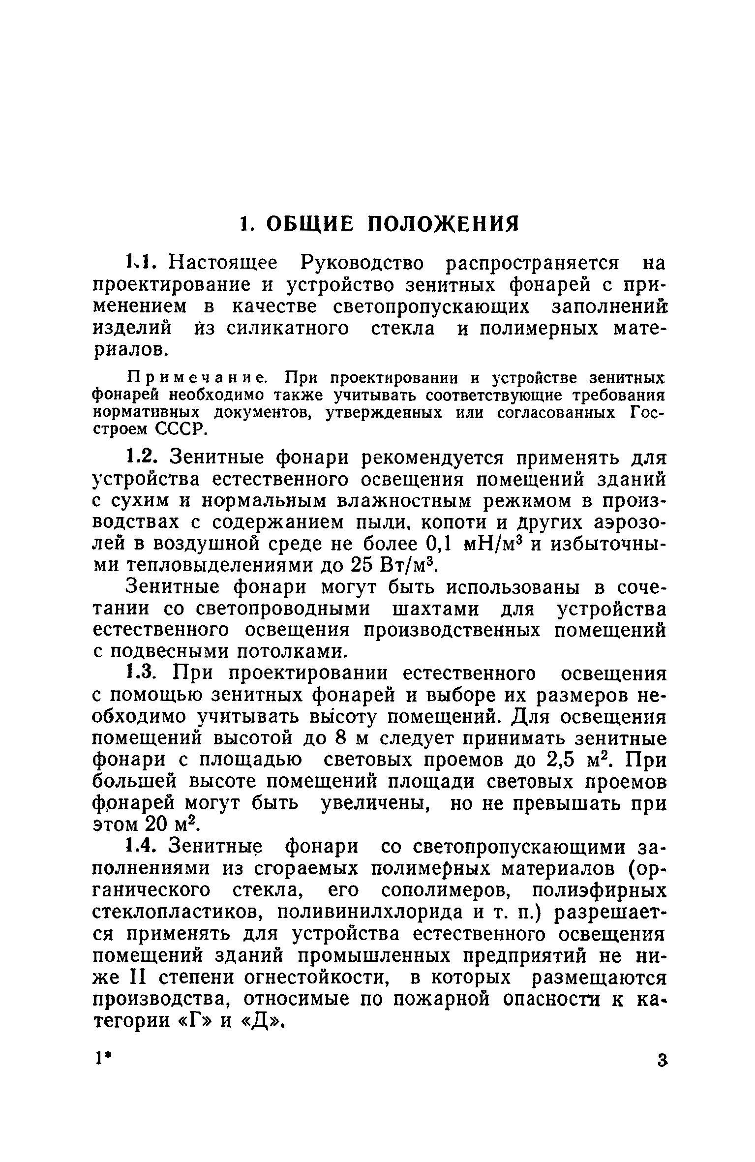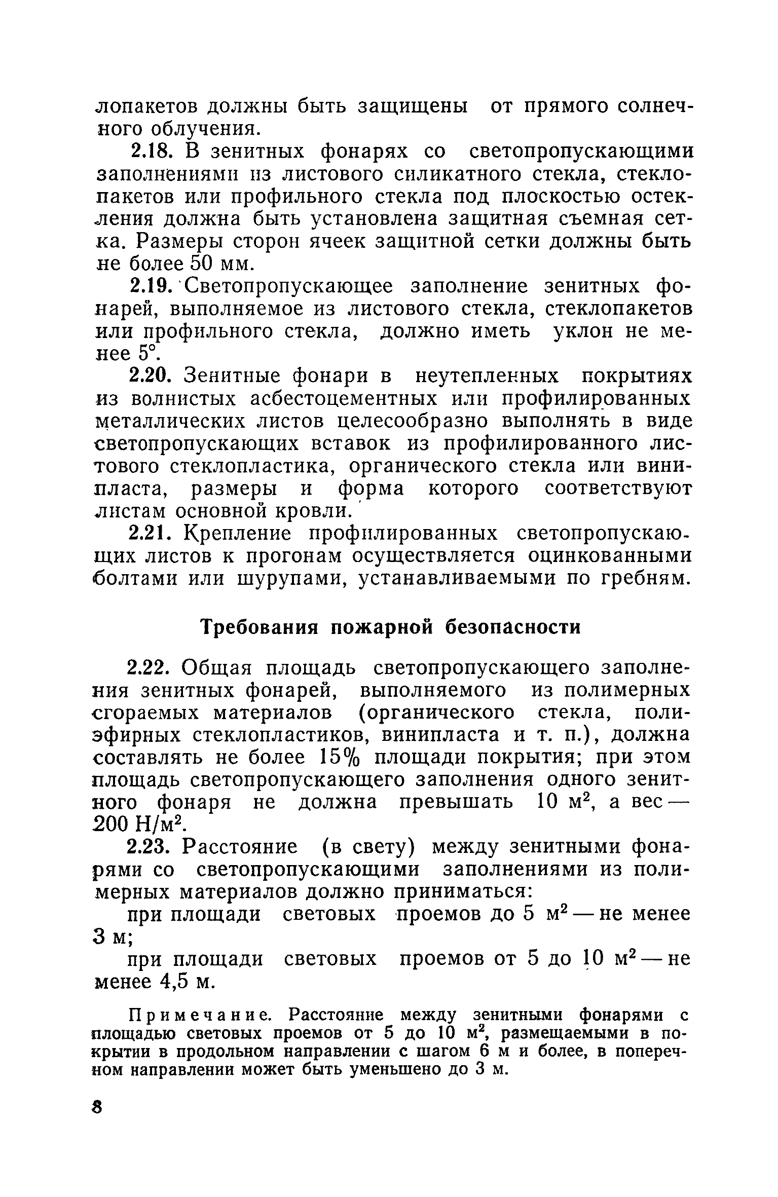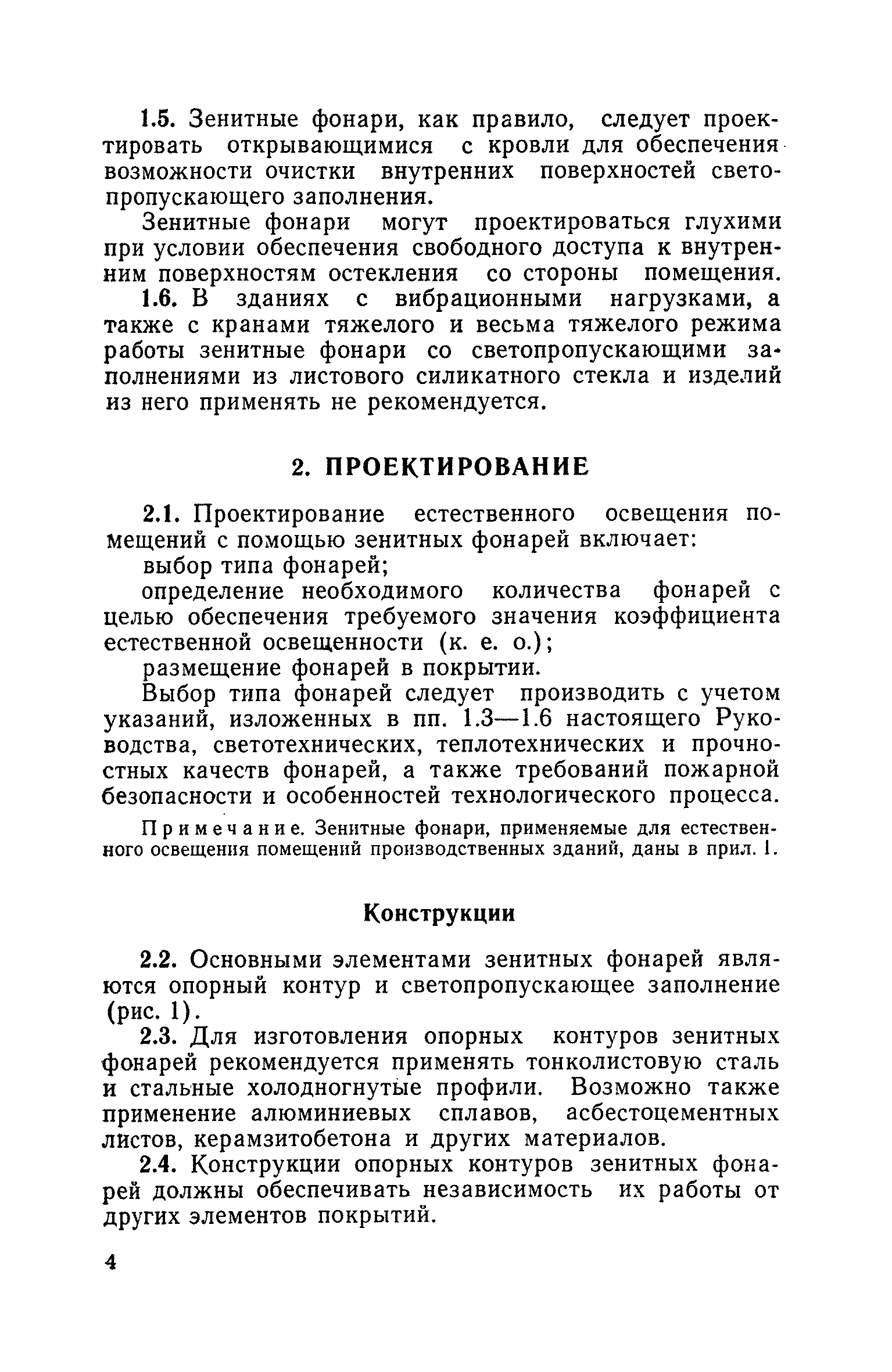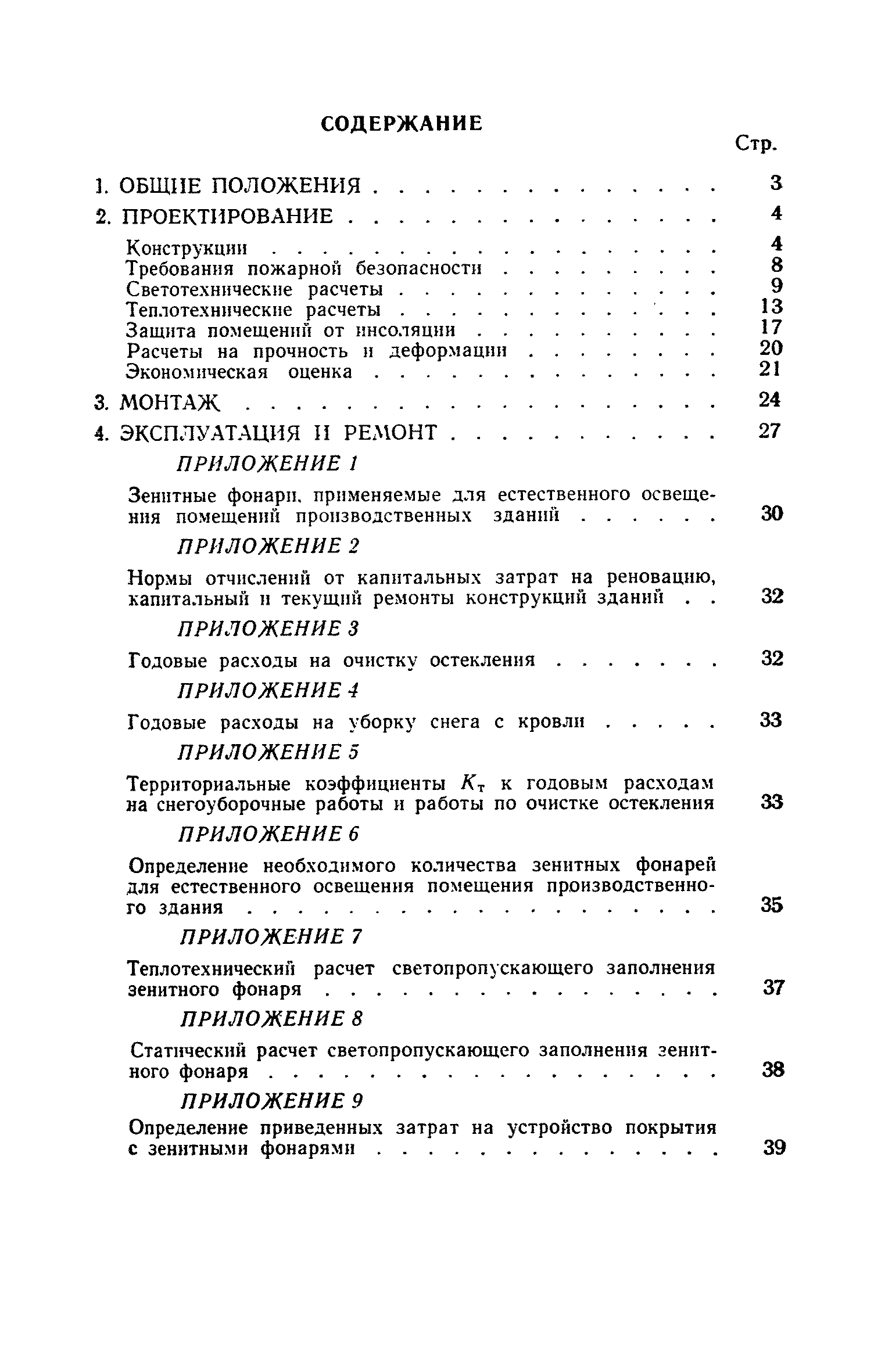 | Оглавление: | 1. Общие положения 2. Проектирование Конструкции Требования пожарной безопасности Светотехнические расчеты Теплотехнические расчеты Защита помещений от инсоляции Расчеты на прочность и деформации Экономическая оценка 3. Монтаж 4. Эксплуатация и ремонт Приложение 1. Зенитные фонари, применяемые для естественного освещения помещений производственных зданий Приложение 2. Нормы отчислений от капитальных затрат на реновацию, капитальный и текущий ремонты конструкций зданий Приложение 3. Годовые расходы на очистку остекления Приложение 4. Годовые расходы на уборку снега с кровля Приложение 5. Территориальные коэффициенты К к годовым расходам на снегоуборочные работы и работы по очистке остекления Приложение 6 Определение необходимого количества зенитных фонарей для естественного освещения помещения производственного здания Приложение 7. Теплотехнический расчет светопропускающего заполнения зенитного фонаря Приложение 8. Статический расчет светопропускающего заполнения зенитного фонаря Приложение 9. Определение приведенных затрат на устройство покрытия с зенитными фонарями |