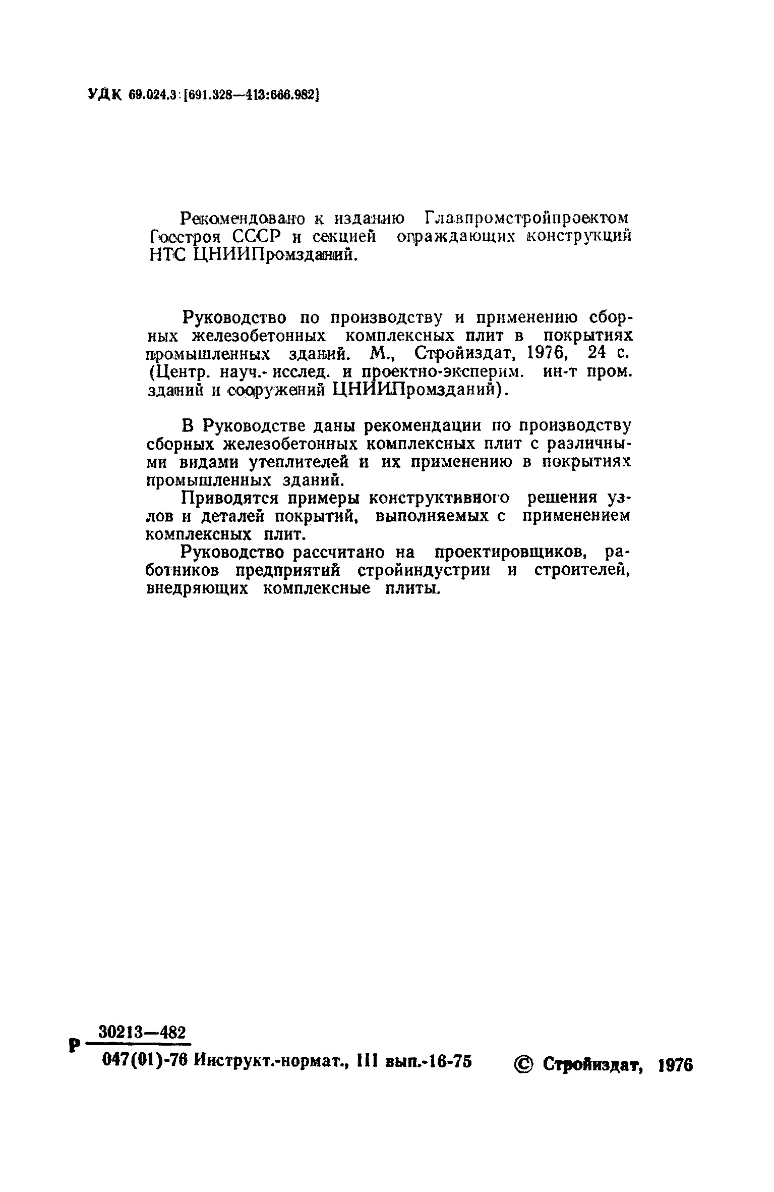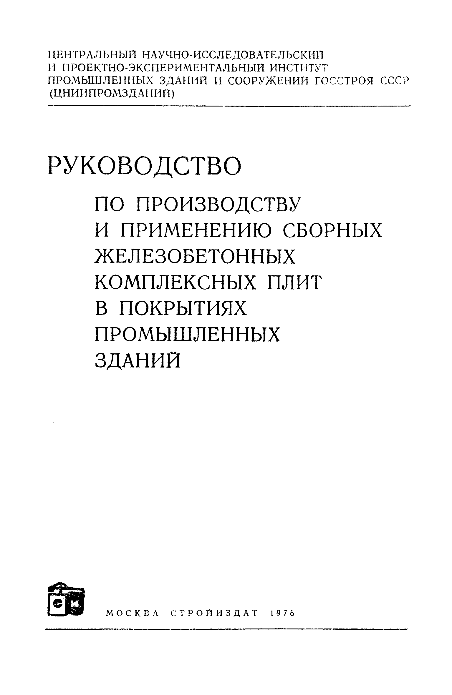 | Область применения: | В Руководстве даны рекомендации по производству сборных железобетонных комплексных плит с различными видами утеплителей и их применению в покрытиях промышленных зданий. Приводятся примеры конструктивного решения узлов и деталей покрытий, выполняемых с применением комплексных плит. Руководство рассчитано на проектировщиков, работников предприятий стройиндустрии и строителей, внедряющих комплексные плиты. |
