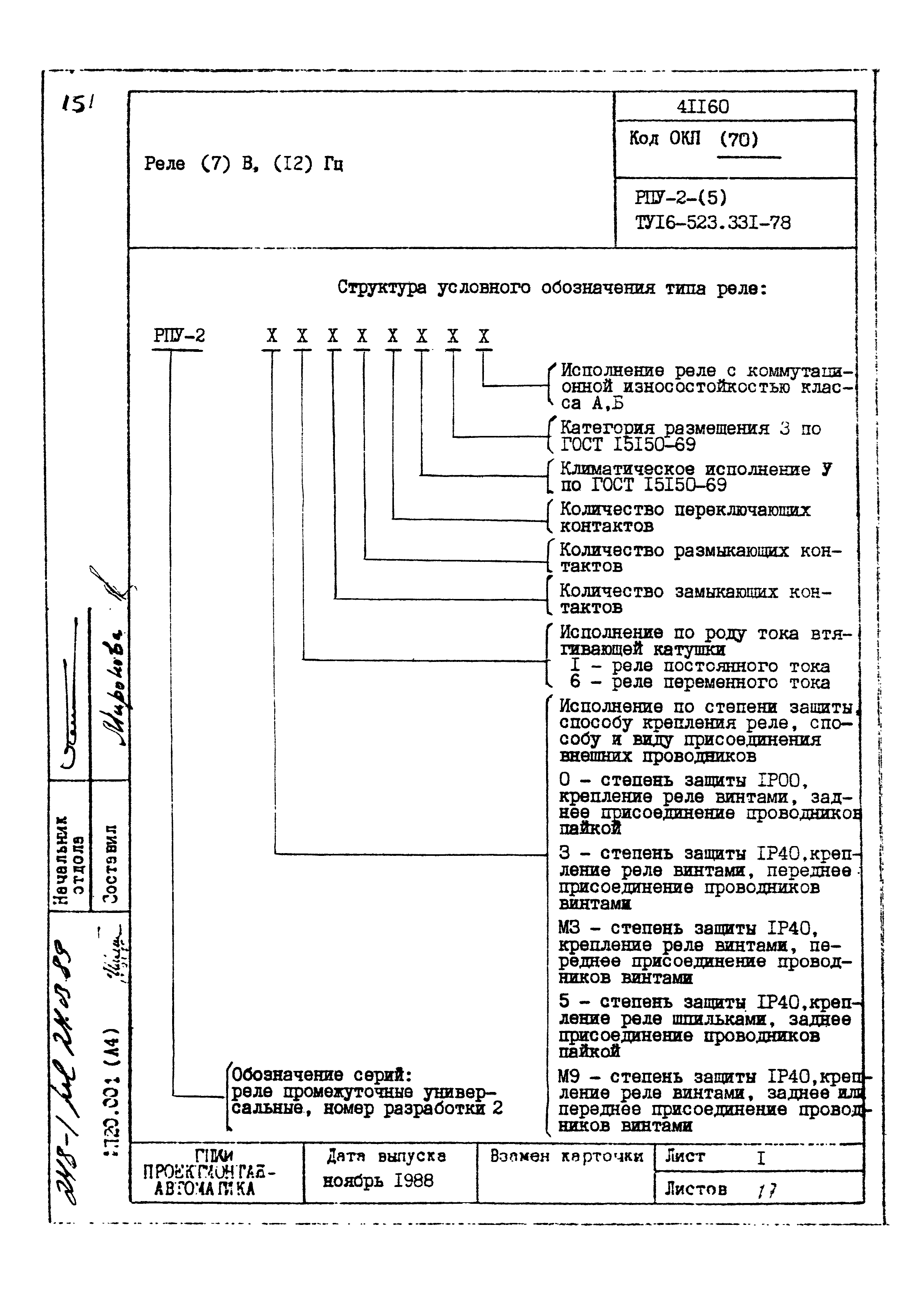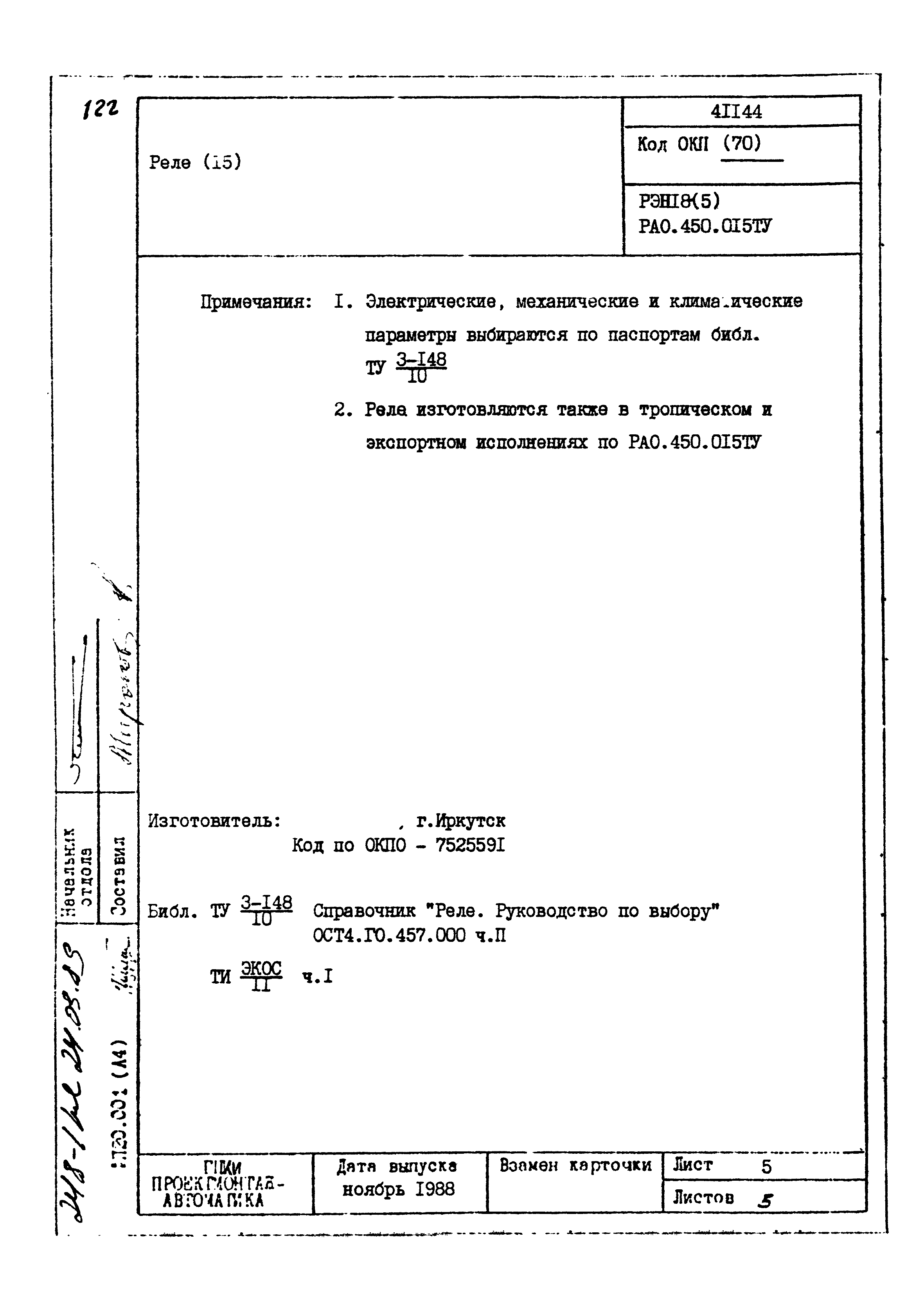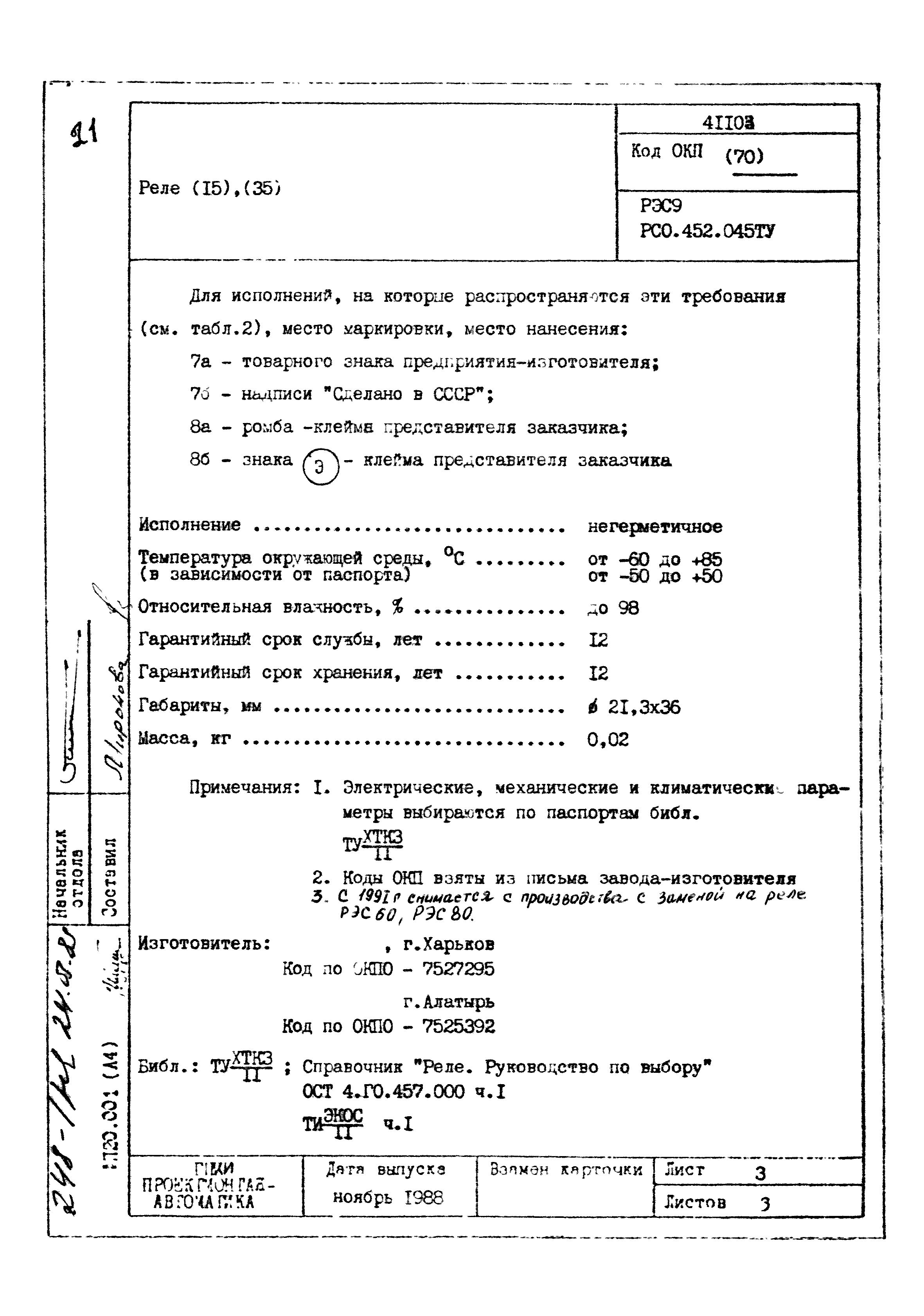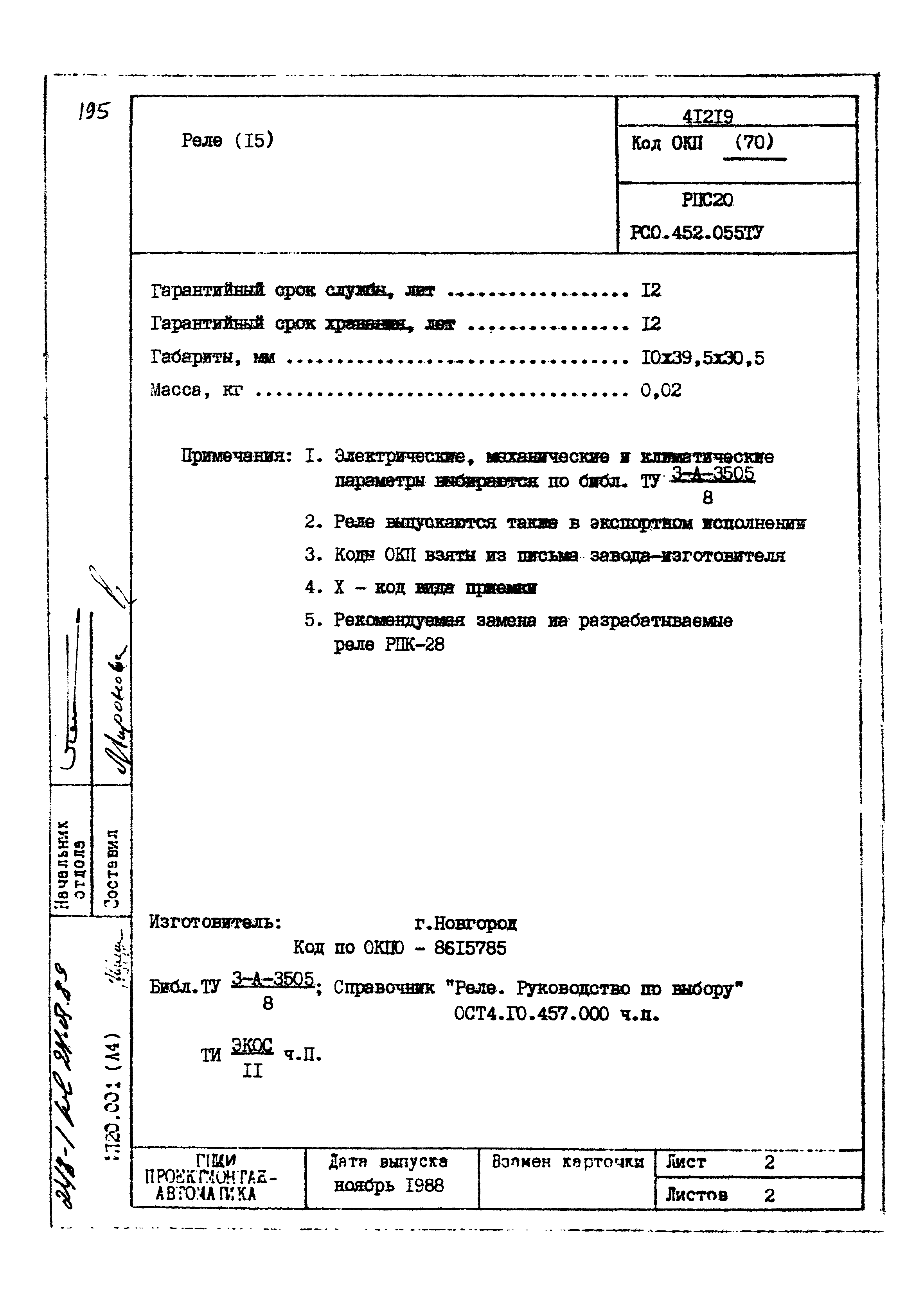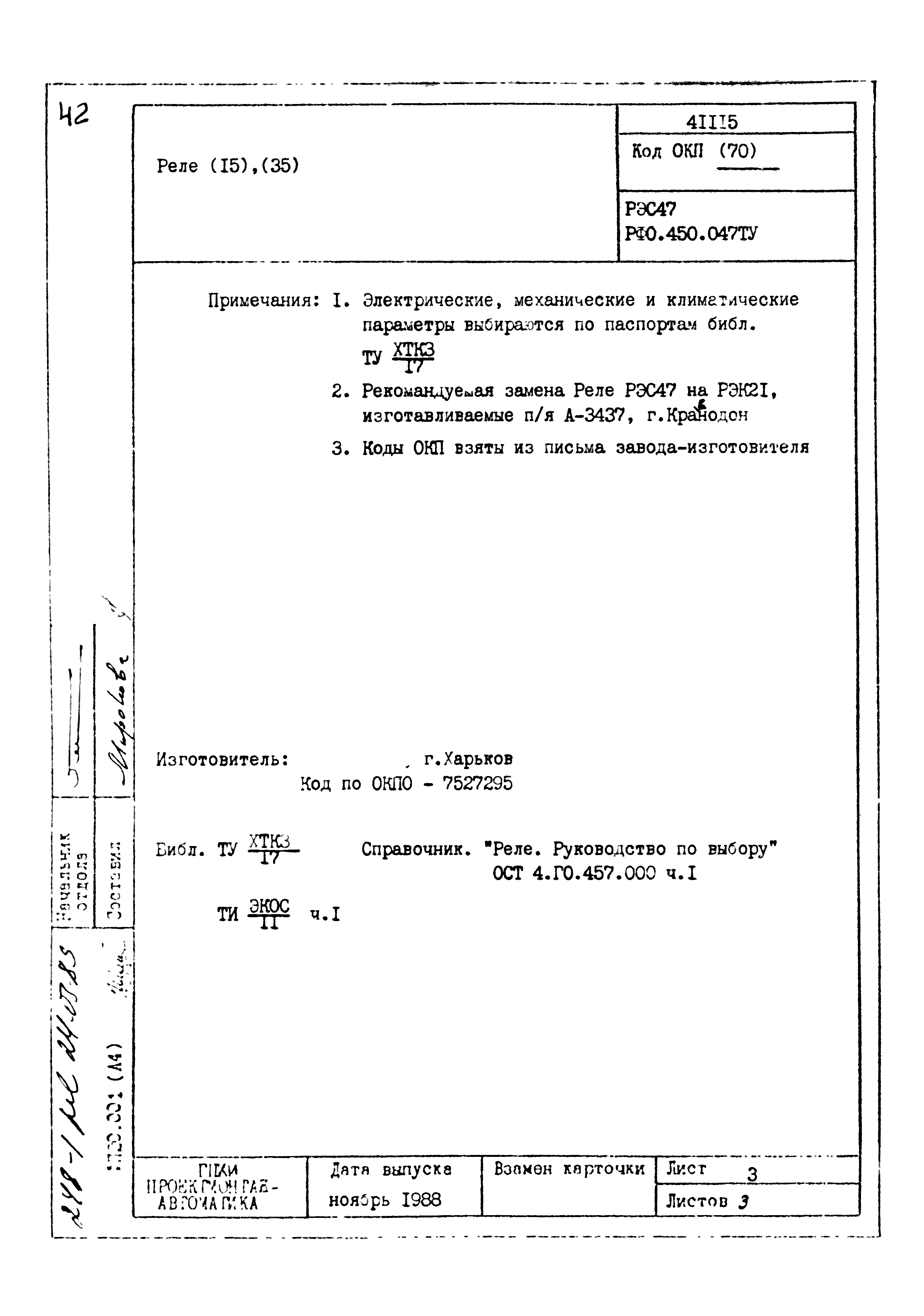 | Заменяет собой: | - «Картотека серийных приборов и средств автоматизации. Раздел 41. Реле контактные двух- и трехпозиционные» (1985 год)