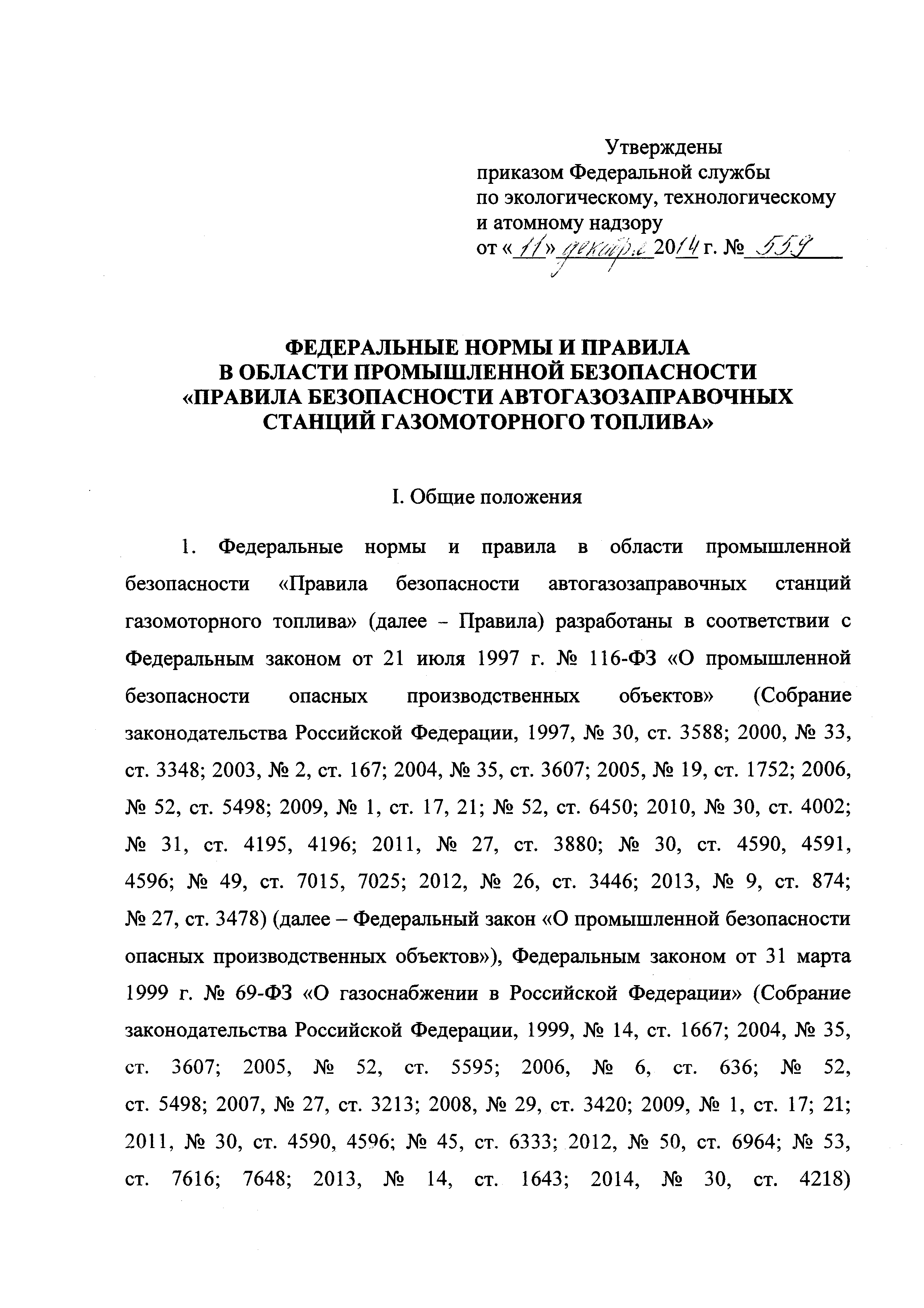 | Область применения: | Правила устанавливают требования промышленной безопасности для стационарных автогазозаправочных станций (АГЗС, АГНКС, КриоАЗС) газомоторного топлива - газообразного горючего, используемого в двигателях внутреннего сгорания, снабжающих автотранспорт газомоторным топливом, сжиженным углеводородным газом с избыточным давлением не более 1,6 МПа, используемым в качестве автомобильного топлива, компримированным природным газом с избыточным давлением не более 25 МПа, сжиженным природным газом, а также к многотопливным АЗС. |