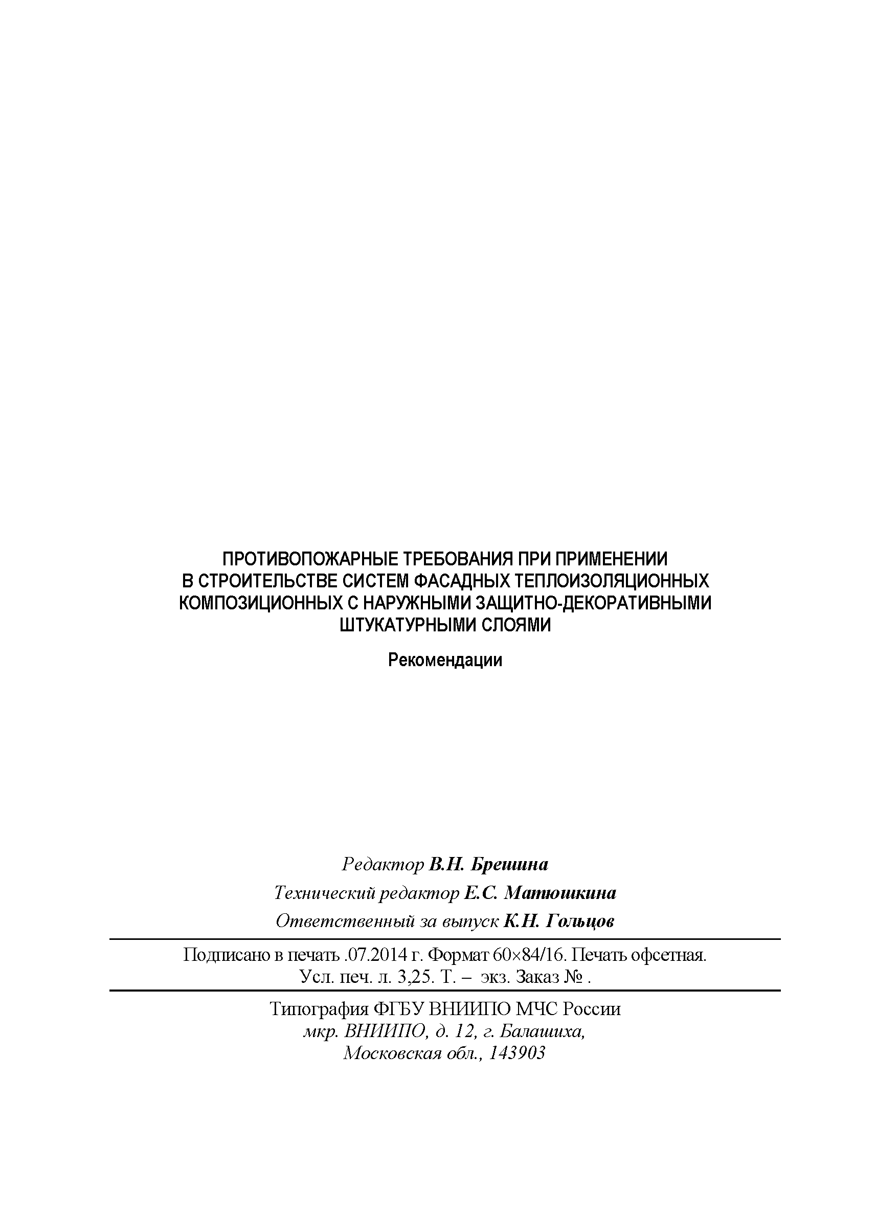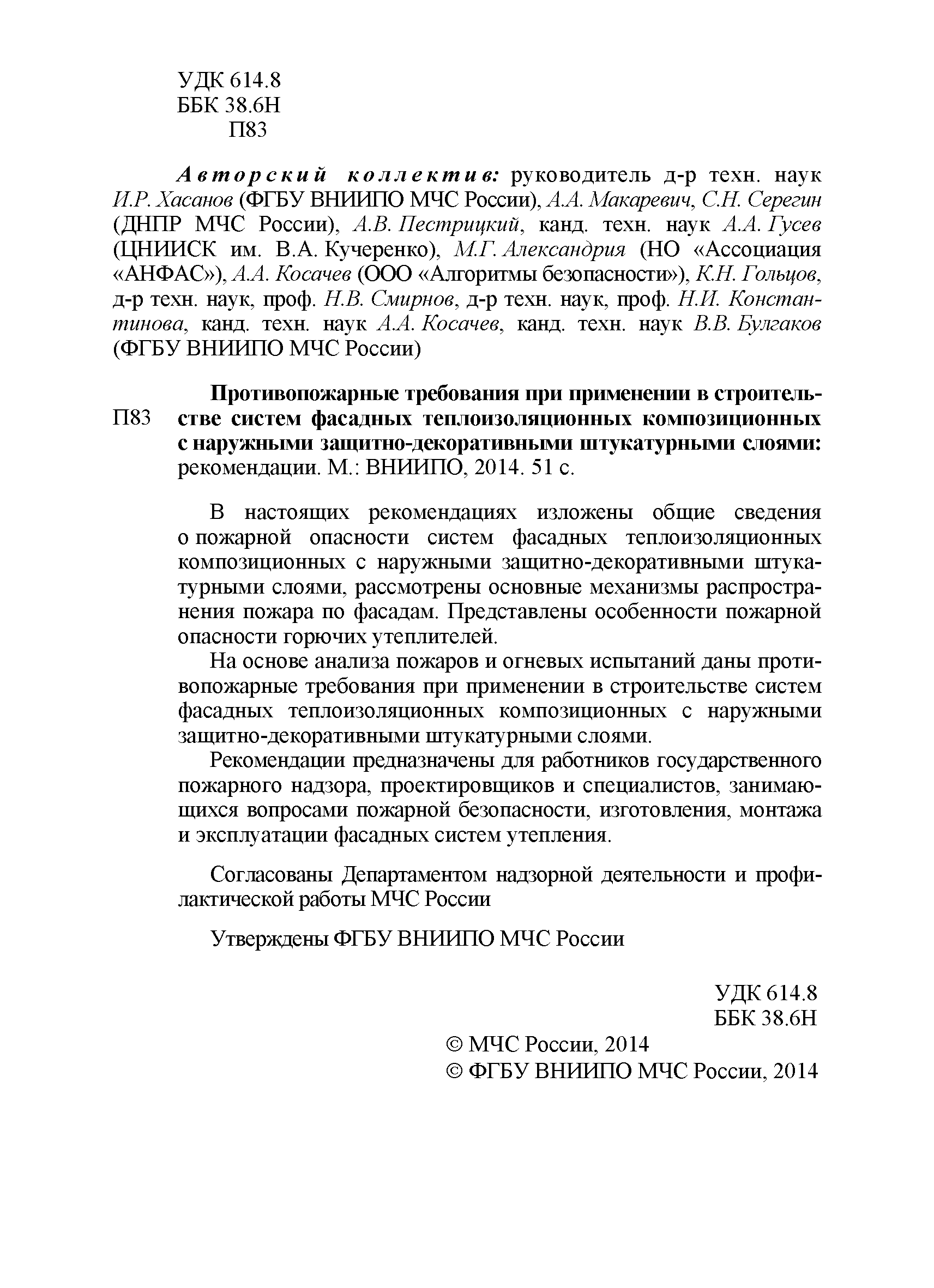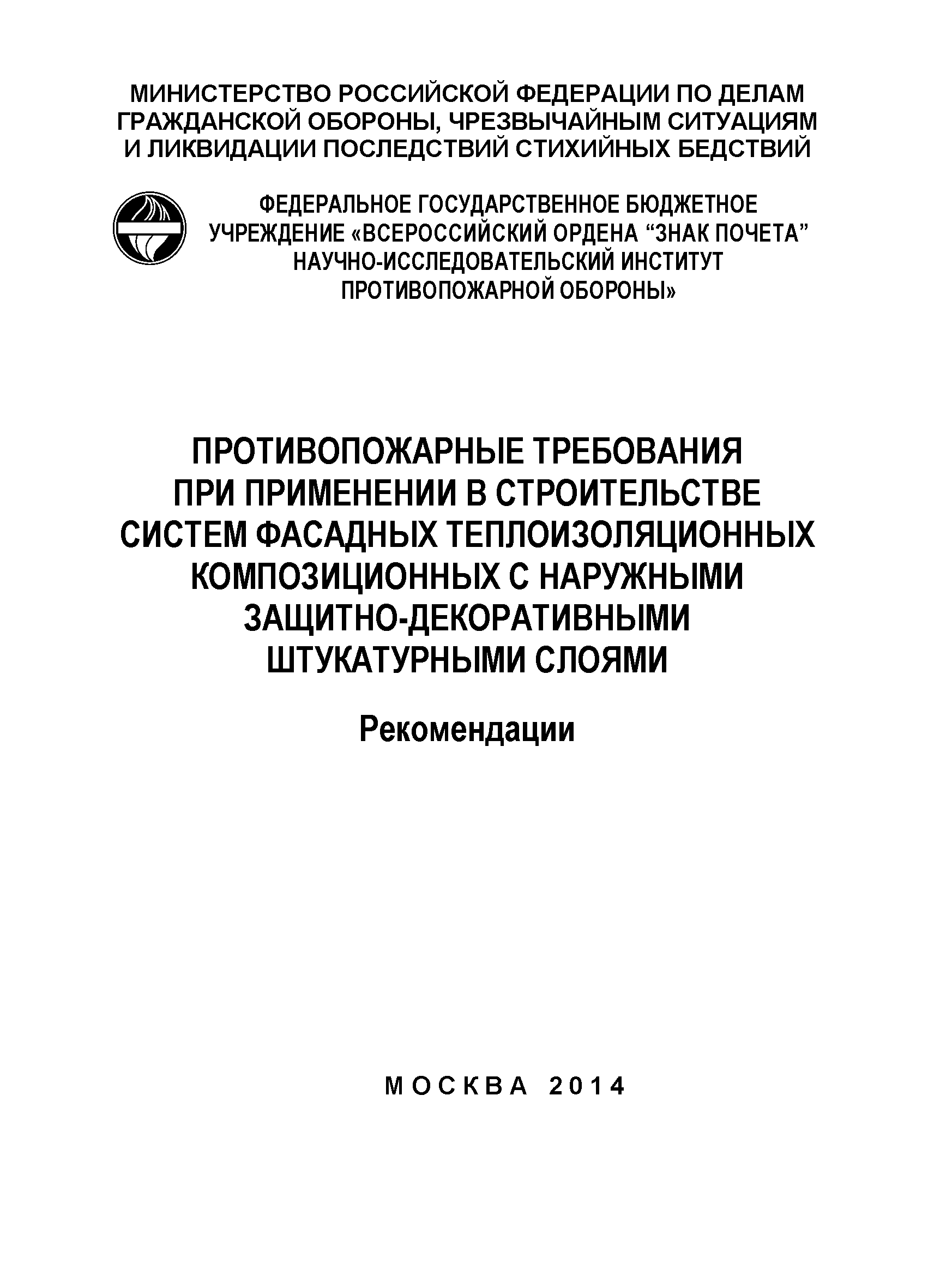 | Название рус.: | Противопожарные требования при применении в строительстве систем фасадных теплоизоляционных композиционных с наружными защитно-декоративными штукатурными слоями. Рекомендации |