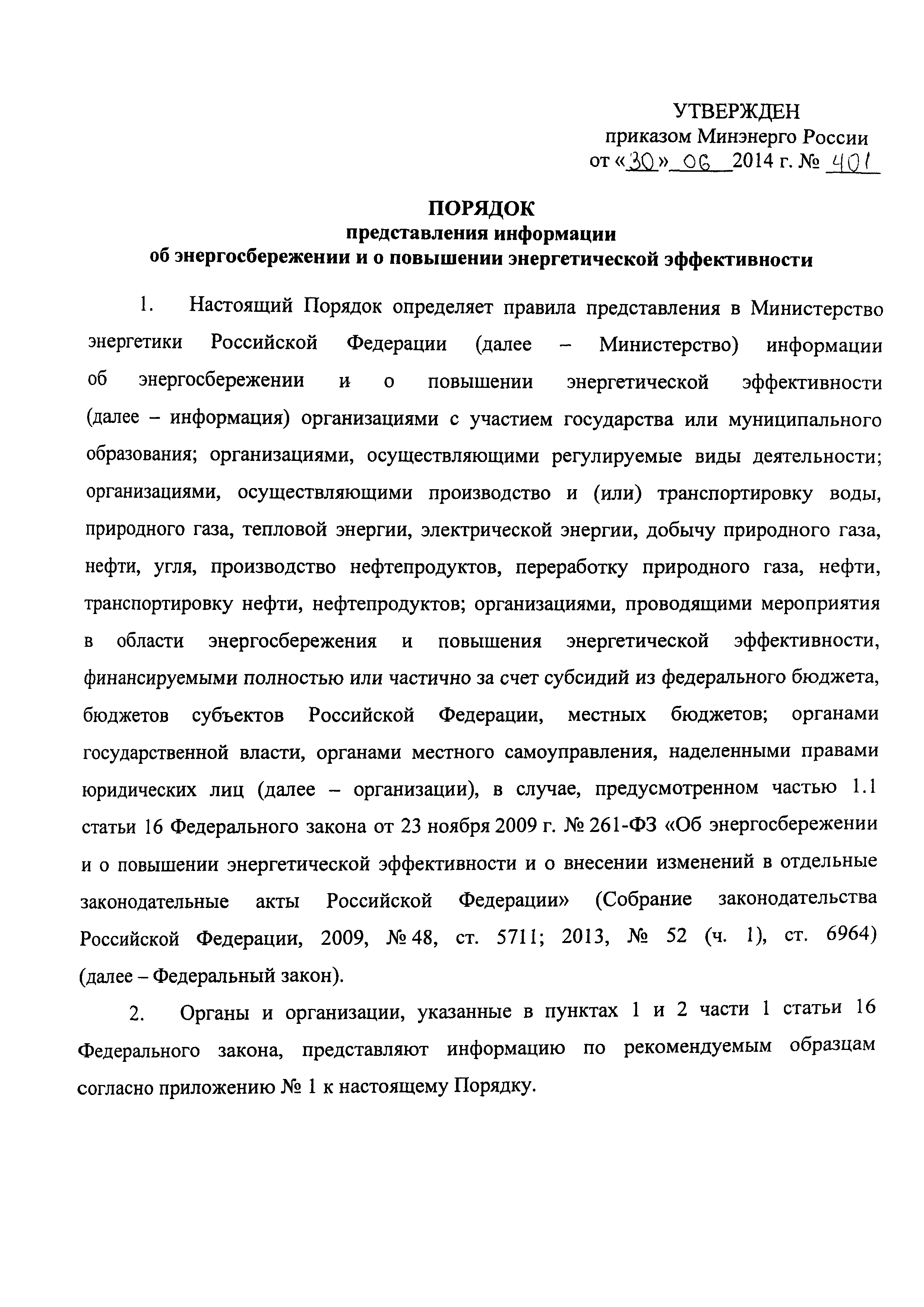 | Область применения: | Порядок определяет правила представления в Министерство энергетики Российской Федерации информации об энергосбережении и о повышении энергетической эффективности организациями с участием государства или муниципального образования; организациями, осуществляющими регулируемые виды деятельности; организациями, осуществляющими производство и (или) транспортировку воды, природного газа, тепловой энергии, электрической энергии, добычу природного газа, нефти, угля, производство нефтепродуктов, переработку природного газа, нефти, транспортировку нефти, нефтепродуктов; организациями, проводящими мероприятия в области энергосбережения и повышения энергетической эффективности, финансируемыми полностью или частично за счет субсидий из федерального бюджета, бюджетов субъектов Российской Федерации, местных бюджетов; органами государственной власти, органами местного самоуправления, наделенными правами юридических лиц, в случае, предусмотренном частью 1.1 статьи 16 Федерального закона от 23 ноября 2009 г. № 261-ФЗ "Об энергосбережении и о повышении энергетической эффективности и о внесении изменений в отдельные законодательные акты Российской Федерации" |