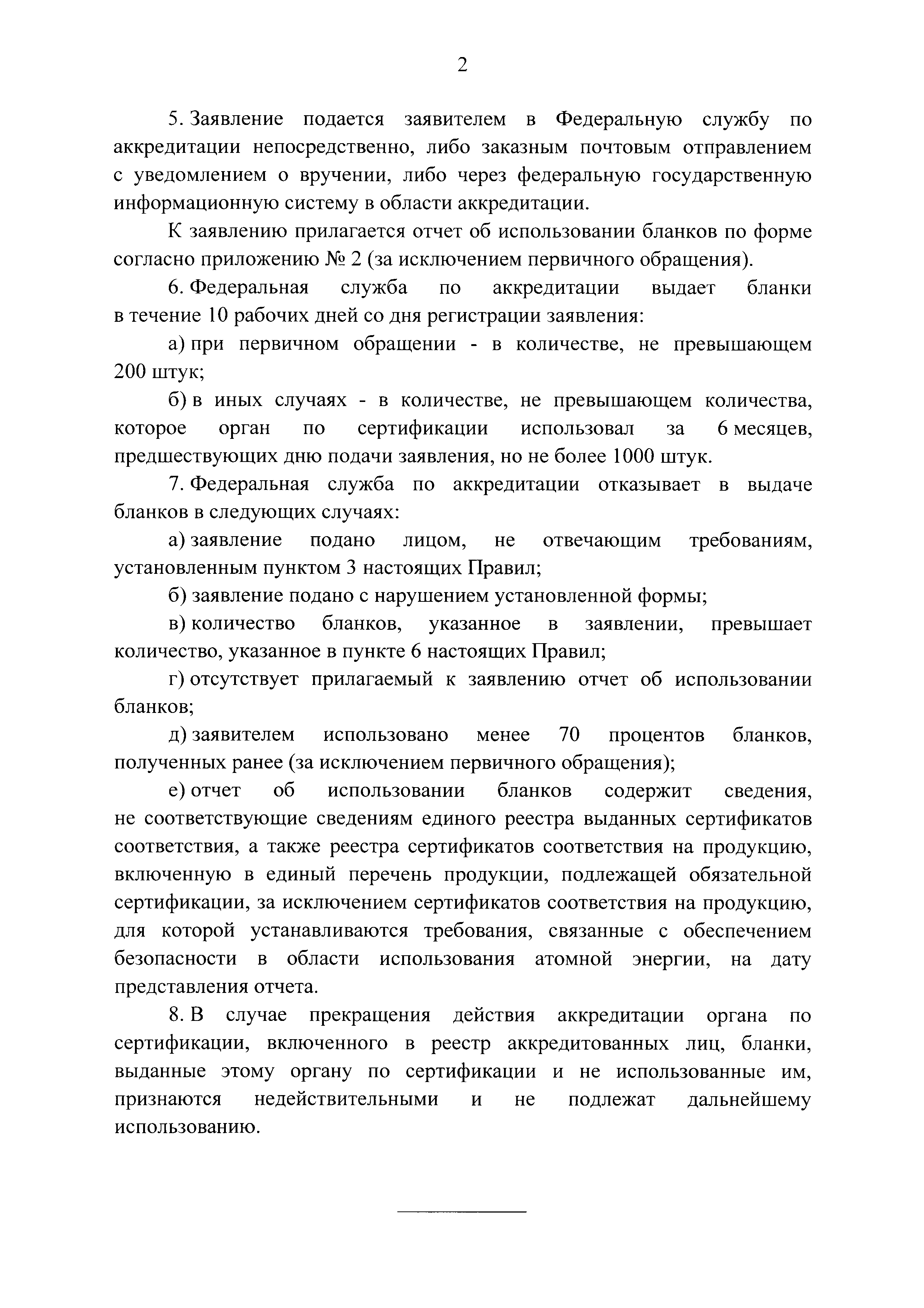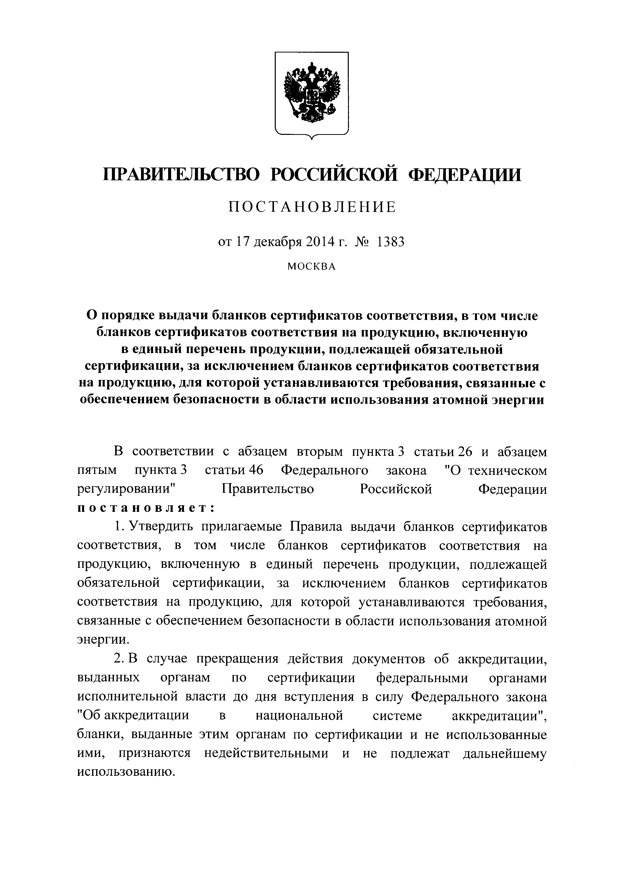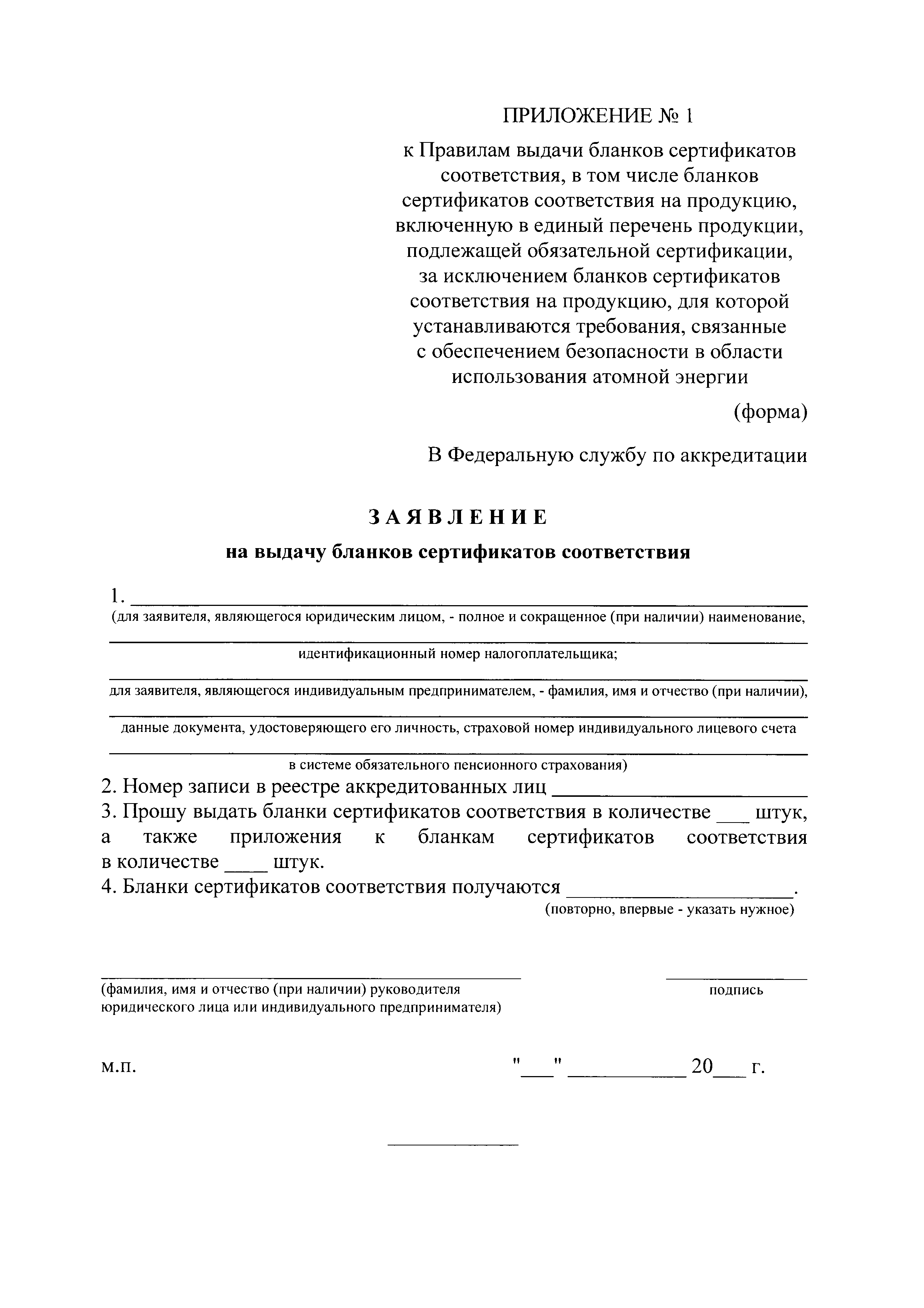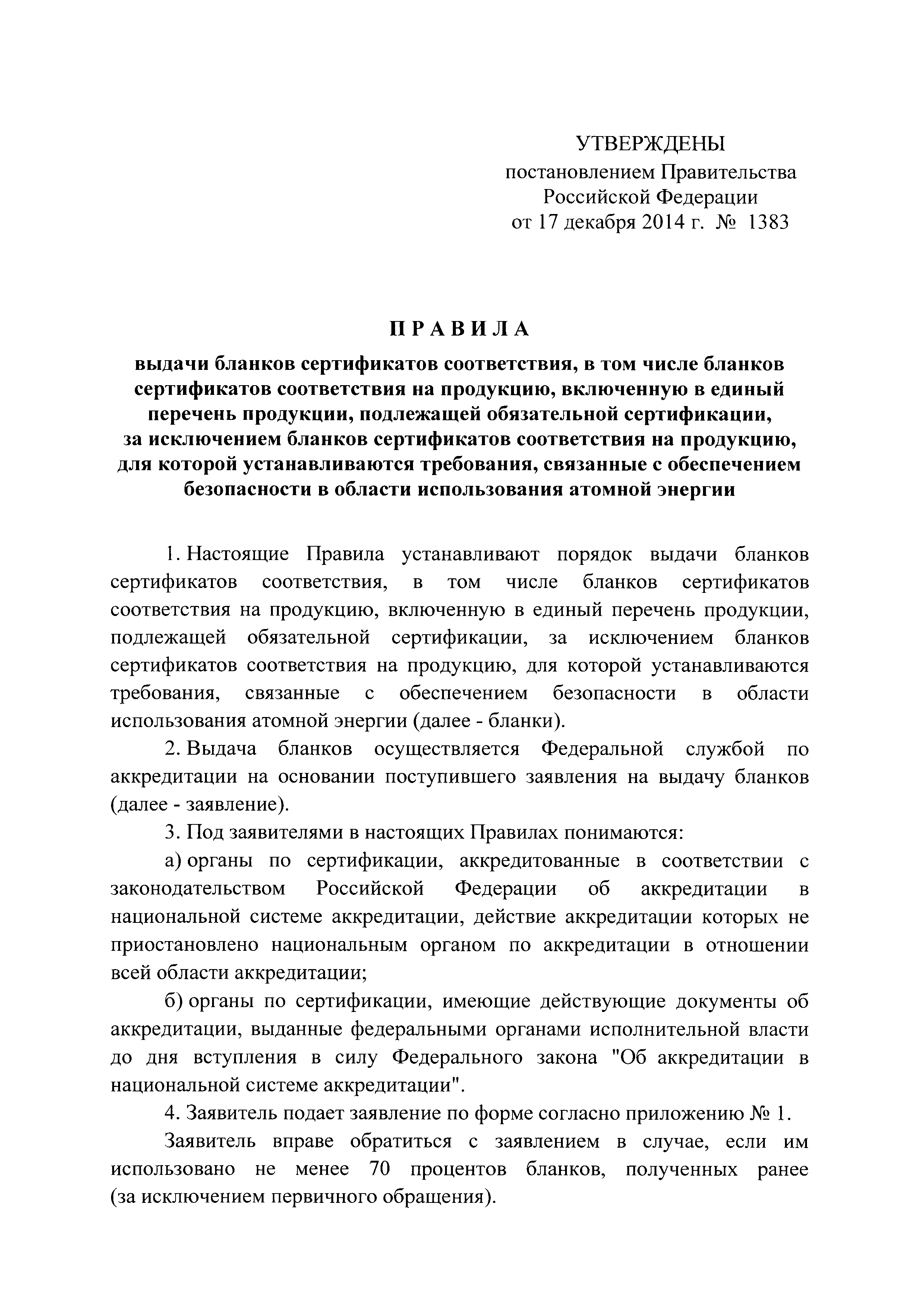 Правила выдачи бланков сертификатов соответствия, в том числе бланков сертификатов соответствия на продукцию, включенную в единый перечень продукции, подлежащей обязательной сертификации, за исключением сертификатов соответствия на продукцию, для которой устанавливаются требования, связанные с обеспечением безопасности в области использования атомной энергии| Статус: | действует | | Название рус.: | Правила выдачи бланков сертификатов соответствия, в том числе бланков сертификатов соответствия на продукцию, включенную в единый перечень продукции, подлежащей обязательной сертификации, за исключением сертификатов соответствия на продукцию, для которой устанавливаются требования, связанные с обеспечением безопасности в области использования атомной энергии | | Дата добавления в базу: | 21.05.2015 | | Дата актуализации: | 01.01.2021 | | Дата введения: | 22.12.2014 | | Область применения: | Правила устанавливают порядок выдачи бланков сертификатов соответствия, в том числе бланков сертификатов соответствия на продукцию, включенную в единый перечень продукции, подлежащей обязательной сертификации, за исключением бланков сертификатов соответствия на продукцию, для которой устанавливаются требования, связанные с обеспечением безопасности в области использования атомной энергии | | Оглавление: | Приложение № 1. Заявление на выдачу бланков сертификатов соответствия Приложение № 2. Отчет об использовании бланков сертификатов соответствия | | Утверждён: | 17.12.2014 Правительство Российской Федерации (1383)