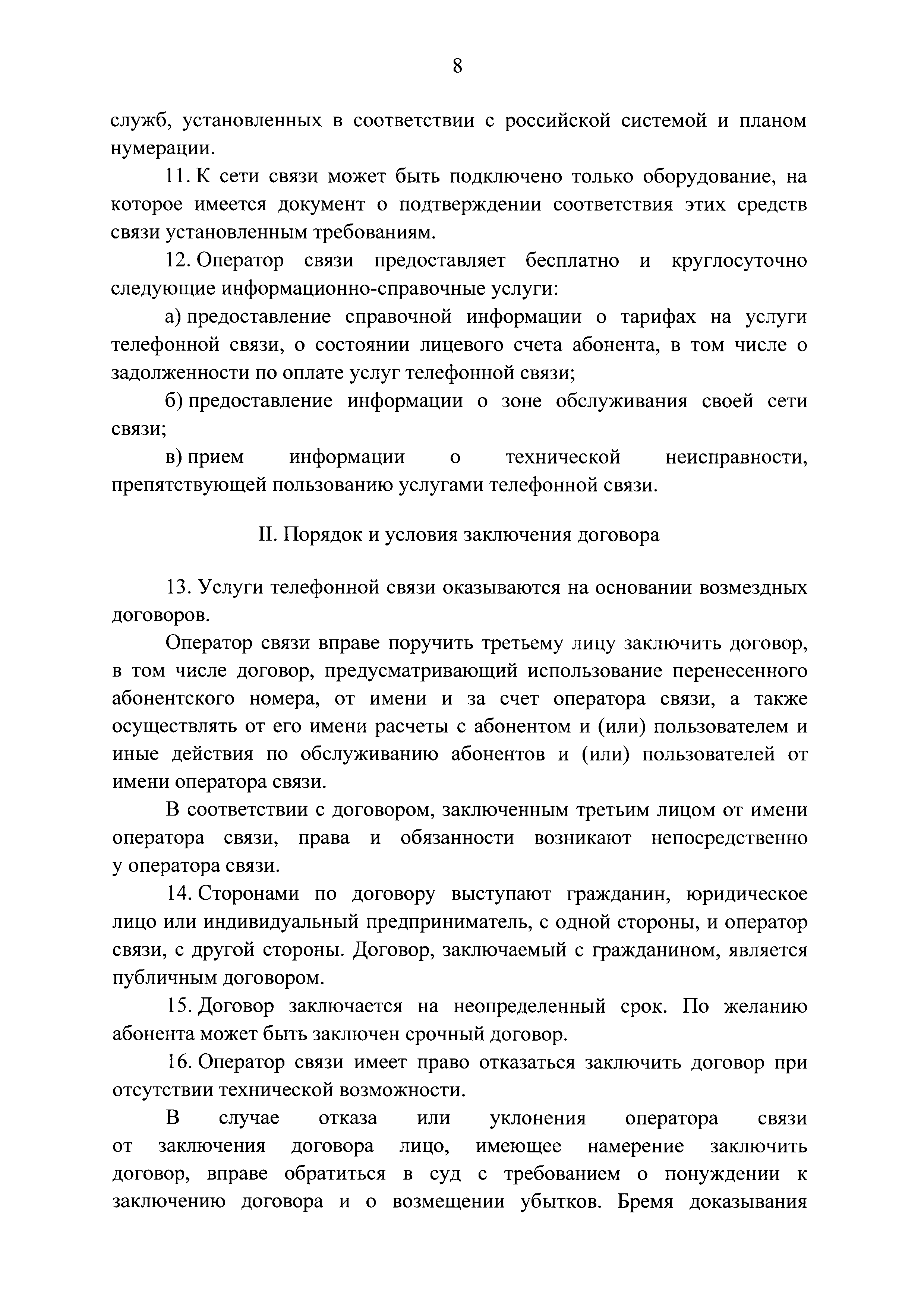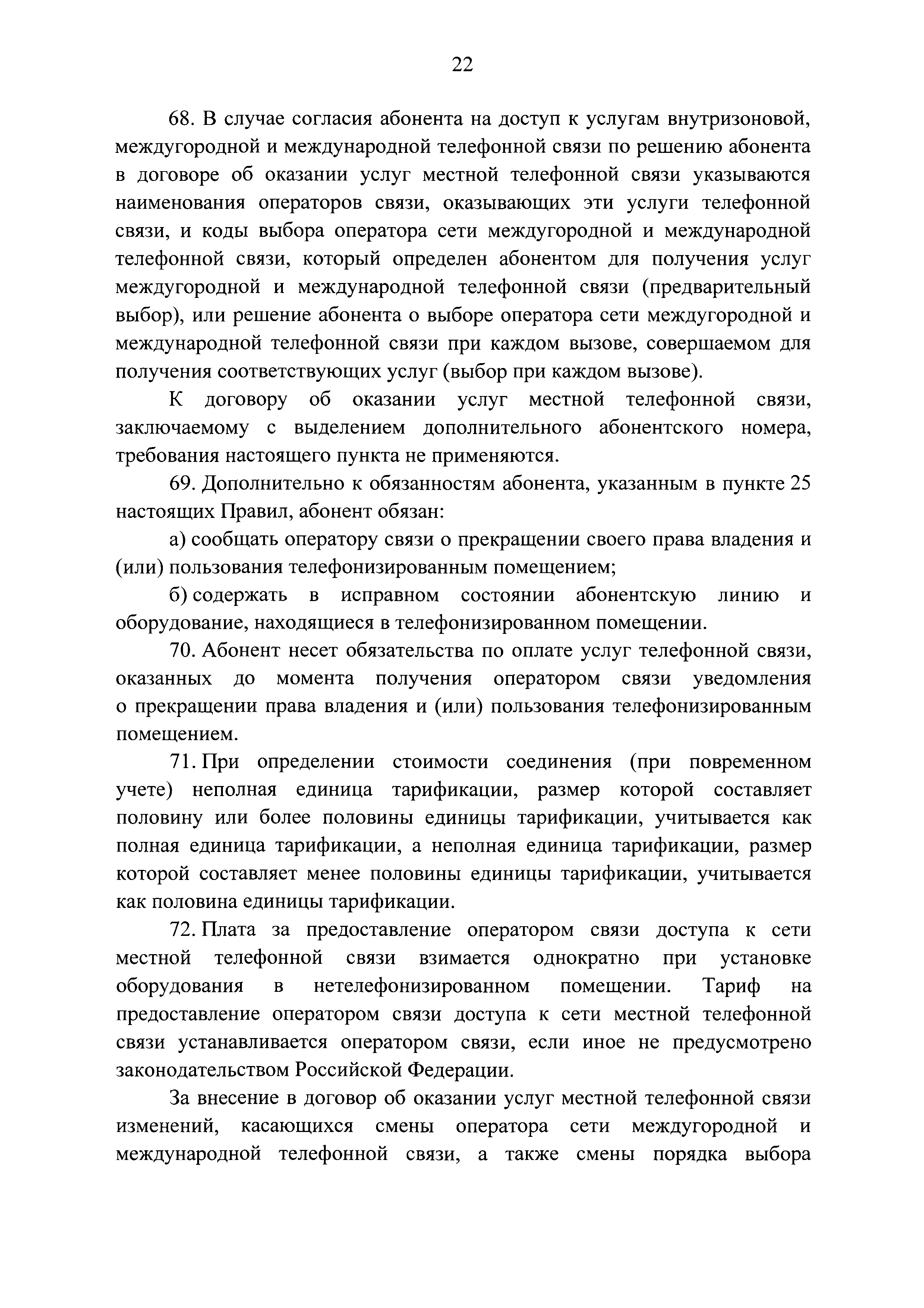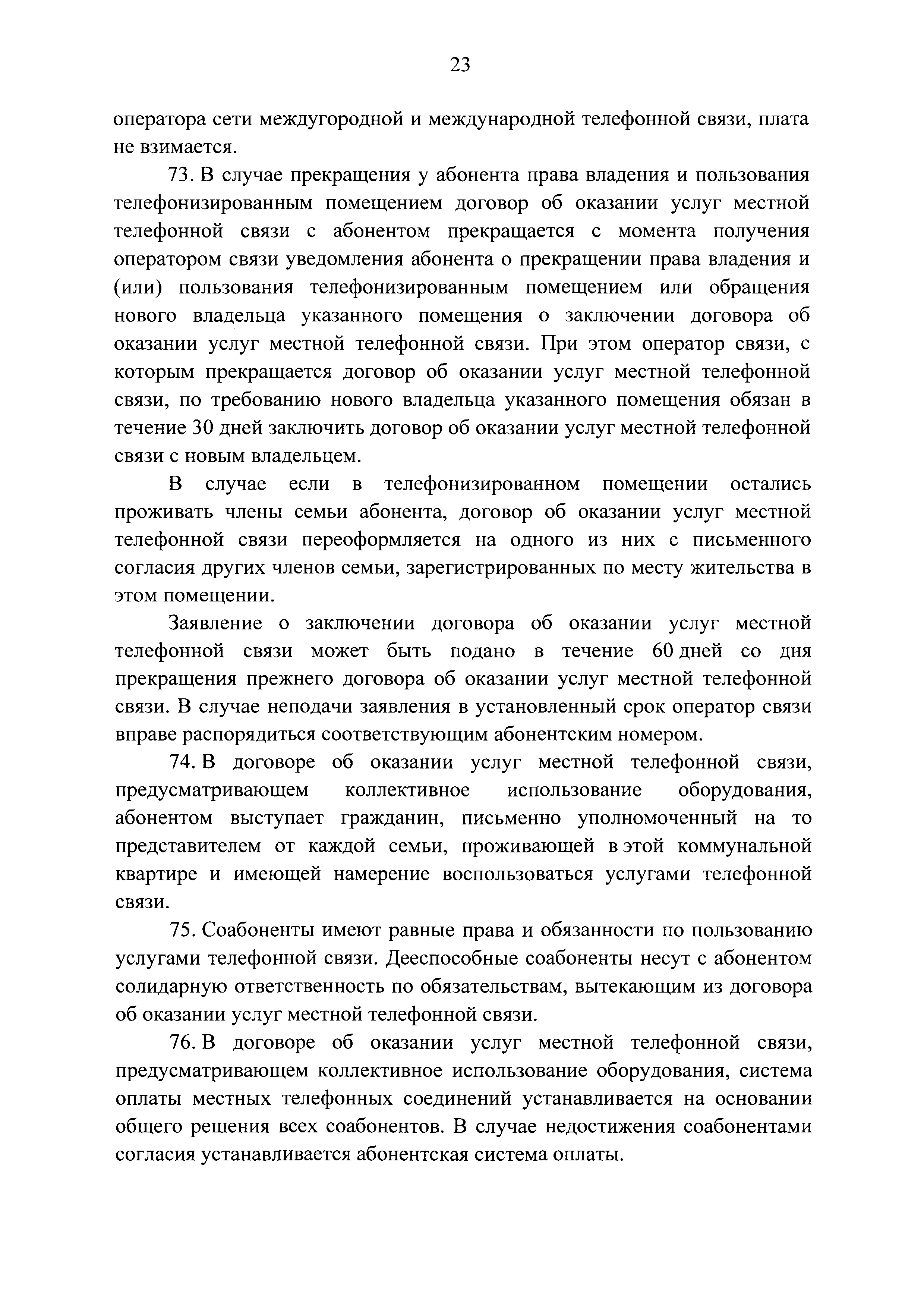 | Оглавление: | I. Общие положения II. Порядок и условия заключения договора III. Порядок и условия исполнения договора Права и обязанности сторон при исполнении договора Форма и порядок расчетов за оказанные услуги телефонной связи IV. Порядок и условия приостановления оказания услуг телефонной связи, изменения и расторжения договора V. Порядок предъявления и рассмотрения жалоб и претензий VI. Ответственность сторон VII. Особенности оказания услуг телефонной связи Особенности оказания услуг местной телефонной связи Особенности оказания услуг местной телефонной связи абоненту-гражданину Особенности оказания услуг внутризоновой, междугородной и международной телефонной связи Особенности оказания услуг местной, внутризоновой, междугородной и международной телефонной связи с использованием средств коллективного доступа Особенности оказания услуг подвижной связи в сети связи общего пользования Приложение |