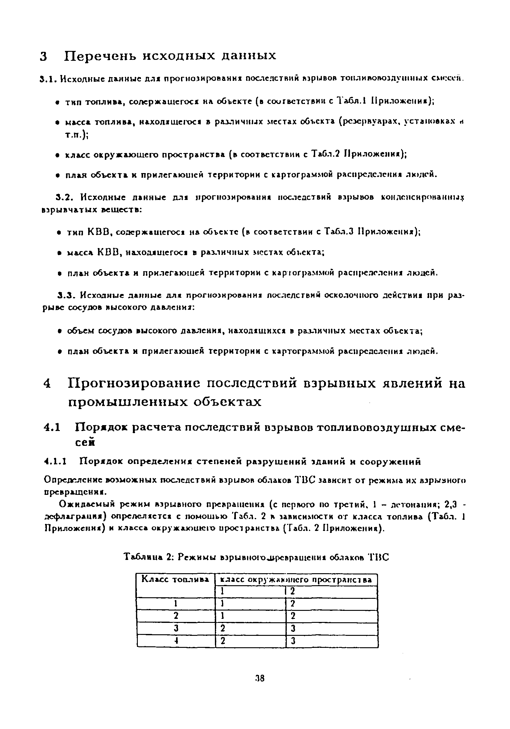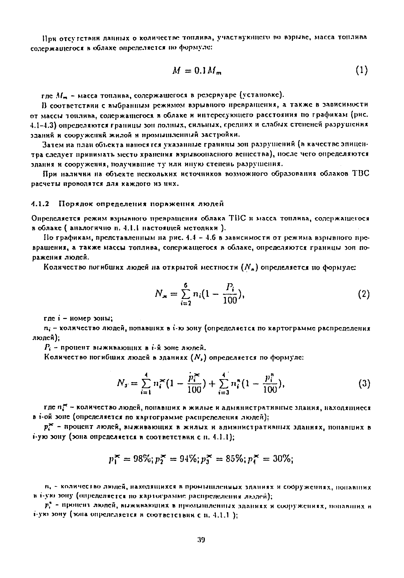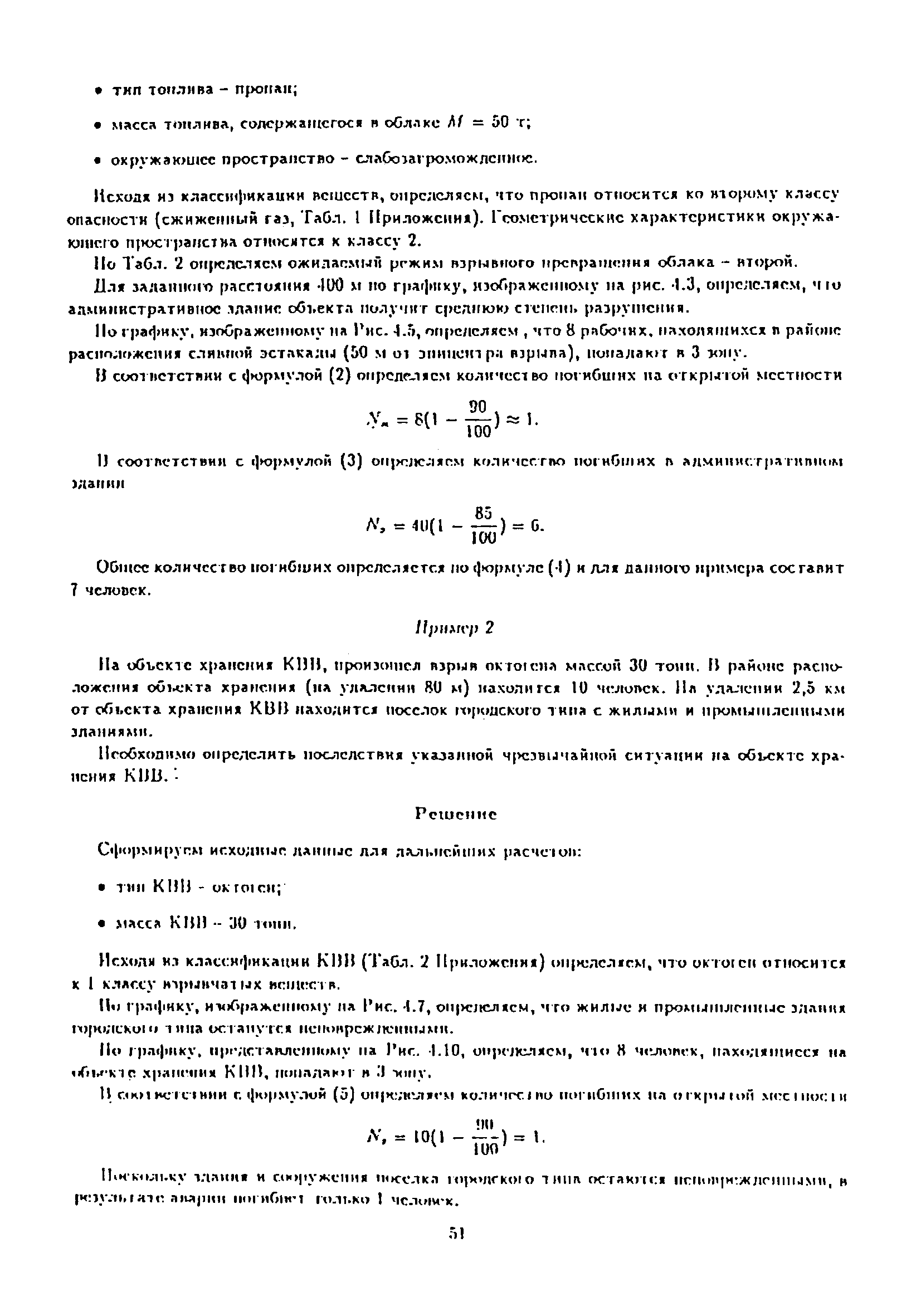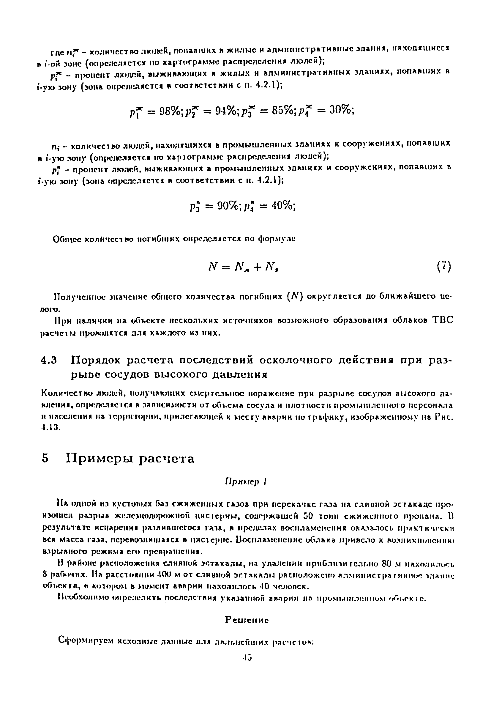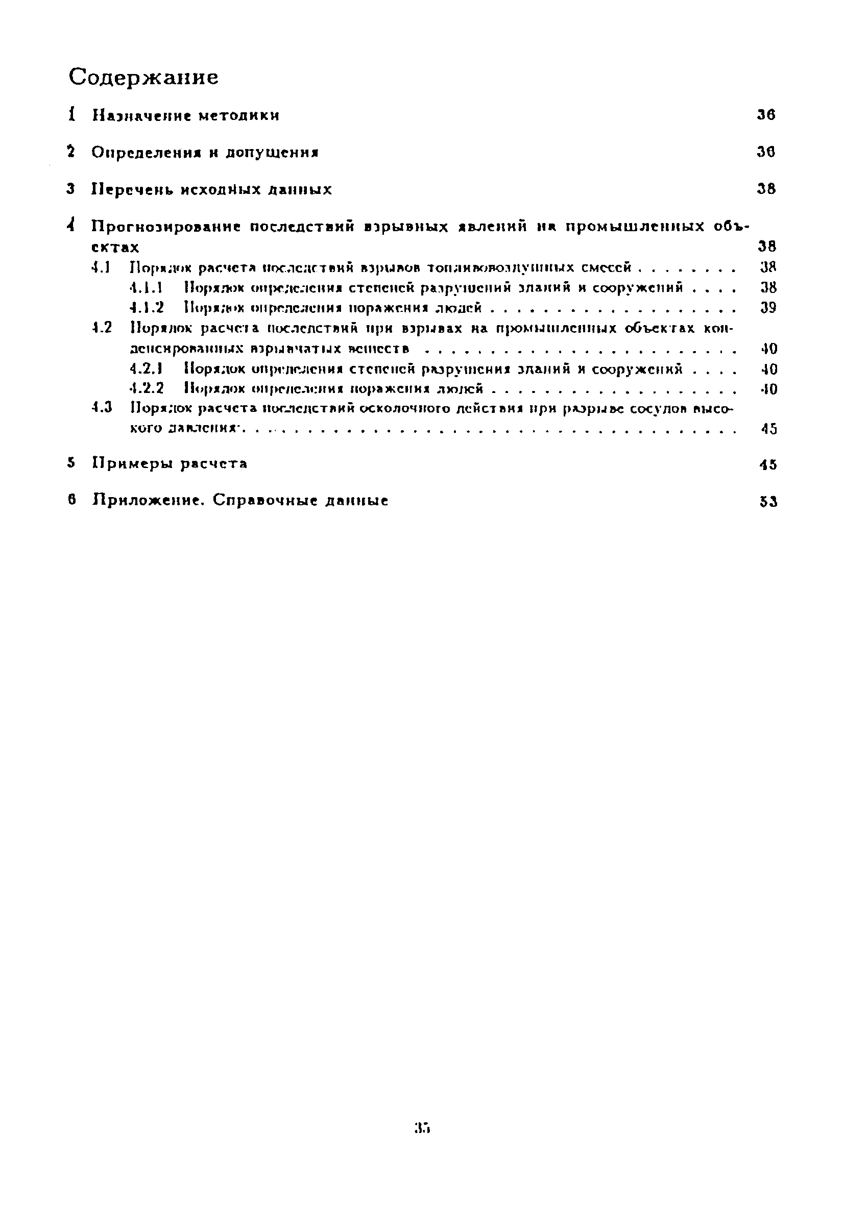 | Оглавление: | 1 Назначение методики 2 Определения и допущения 3 Перечень исходных данных 4 Прогнозирование последствий взрывных явлений на промышленных объектах 4.1 Порядок расчета последствий взрывов топливоздушных смесей 4.1.1 Порядок определения степеней разрушений зданий и сооружений 4.1.2 Порядок определения поражения людей 4.2 Порядок расчета последствий при взрывах на промышленных объектах конденсированных взрывчатых веществ 4.2.1 Порядок определения степеней разрушения зданий и сооружений 4.2.2 Порядок определения поражения людей 4.3 Порядок расчета последствий осколочного действия при разрыве сосудов высокого давления 5 Примеры расчета 6 Приложение. Справочные данные |