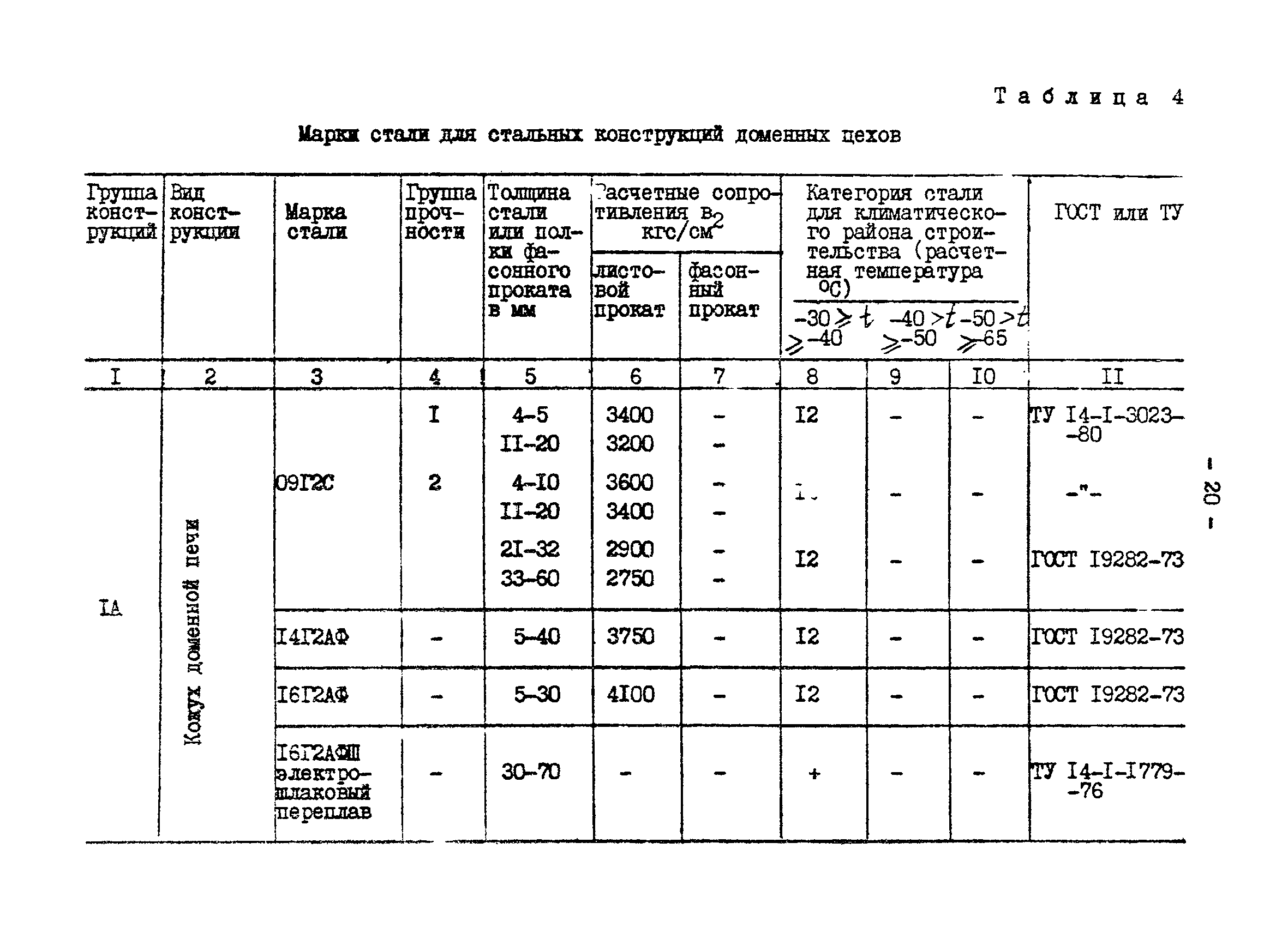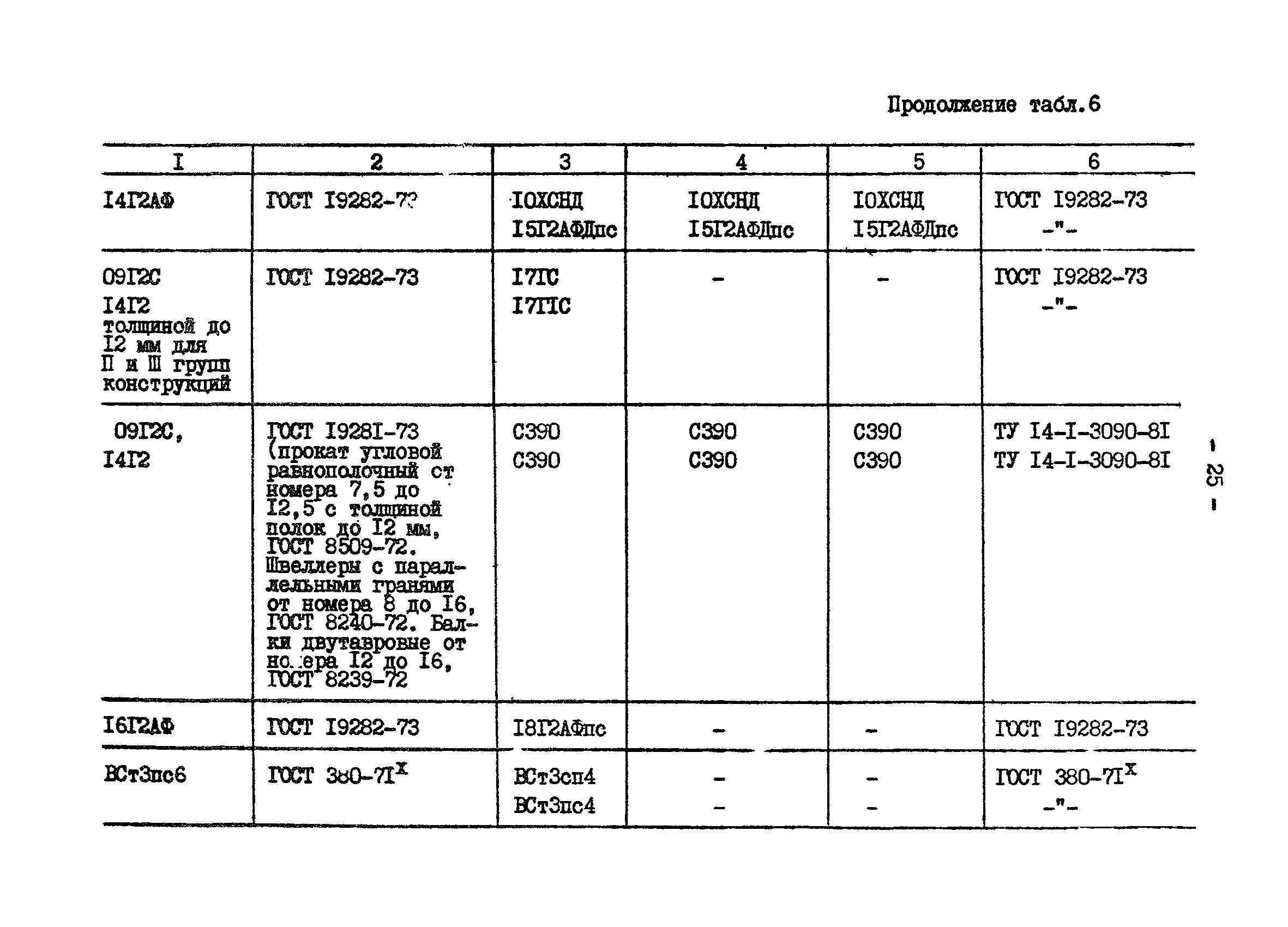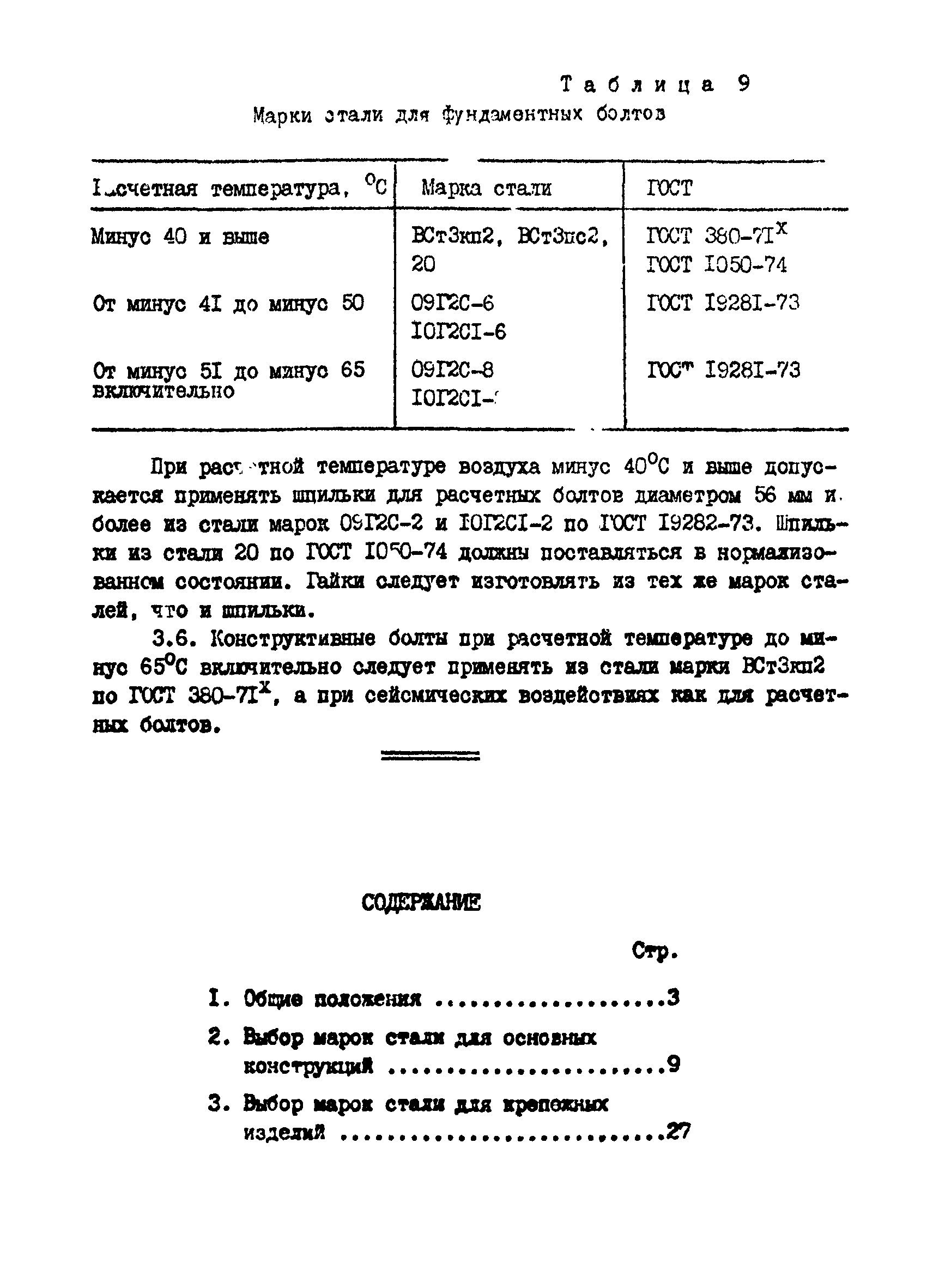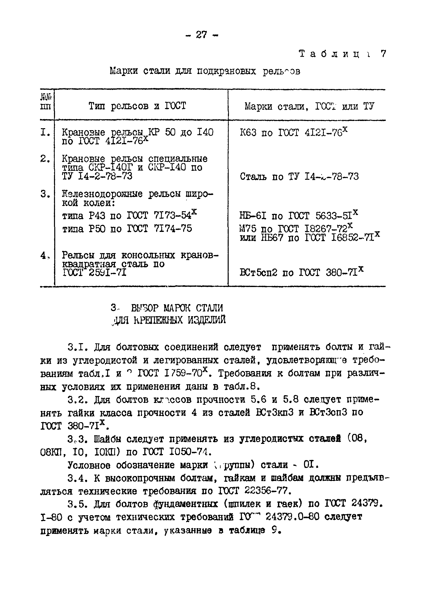 | | Нормативные ссылки: |   СНиП II-23-81* «Стальные конструкции»  ГОСТ 24379.0-80 «Болты фундаментные. Общие технические условия»  ГОСТ 24379.1-80 «Болты фундаментные. Конструкция и размеры»  ГОСТ 7173-54 «Рельсы железнодорожные типа Р43 для путей промышленного транспорта. Конструкция и размеры»  ГОСТ 7174-75 «Рельсы железнодорожные типа Р50. Конструкция и размеры»  ГОСТ 22356-77 «Болты и гайки высокопрочные и шайбы. Общие технические условия» ГОСТ 19282-73 «Сталь низколегированная толстолистовая и широкополосная универсальная. Технические условия» ГОСТ 4121-76 «Рельсы крановые. Технические условия» ГОСТ 1050-74 «Сталь углеродистая качественная конструкционная. Технические условия» СНиП II-28-73* «Защита строительных конструкций от коррозии. Нормы проектирования»  ГОСТ 19281-73 «Сталь низколегированная сортовая и фасонная»  ГОСТ 380-71 «Сталь углеродистая обыкновенного качества. Марки и общие технические требования» ГОСТ 1759-70 «Болты, винты, шпильки и гайки» ГОСТ 23570-79 «Прокат из стали углеродистой свариваемой для строительных металлических конструкций. Технические условия» ТУ 14-105-465-82 «Сталь толстолистовая горячекатаная, термообработанная марки 14Г2АФ. Опытная партия» ТУ 14-1-3023-80 «Прокат листовой, широкополосный универсальный и фасонный из углеродистой и низколегированной стали с гарантированным уровнем механических свойств, дифференцированным по группам прочности» ТУ 14-1-389-72 «Сталь сортовая, фасонная, полосовая низколегированная марки 10ХНДП. Технические условия» ТУ 14-1-1217-75 «Сталь листовая низколегированная марок 10ХНДП и 10ХДП. Опытная партия» ГОСТ 8239-72 «Сталь горячекатаная. Балки двутавровые. Сортамент» ГОСТ 17066-80 «Прокат тонколистовой из конструкционной низколегированной стали. Технические условия» ГОСТ 18267-82 «Рельсы железнодорожные типов Р50, Р65 и Р75 широкой колеи, термообработанные путем объемной закалки в масле. Технические условия»  ГОСТ 4121-96 «Рельсы крановые. Технические условия»  ГОСТ 5520-79 «Прокат листовой из углеродистой, низколегированной и легированной стали для котлов и сосудов, работающих под давлением. Технические условия»  ГОСТ 5632-72 «Стали высоколегированные и сплавы коррозионно-стойкие, жаростойкие и жаропрочные. Марки»  ГОСТ 10705-80 «Трубы стальные электросварные. Технические условия»  ГОСТ 10706-76 «Трубы стальные электросварные прямошовные. Технические требования»  ГОСТ 8731-74 «Трубы стальные бесшовные горячедеформированные. Технические требования»