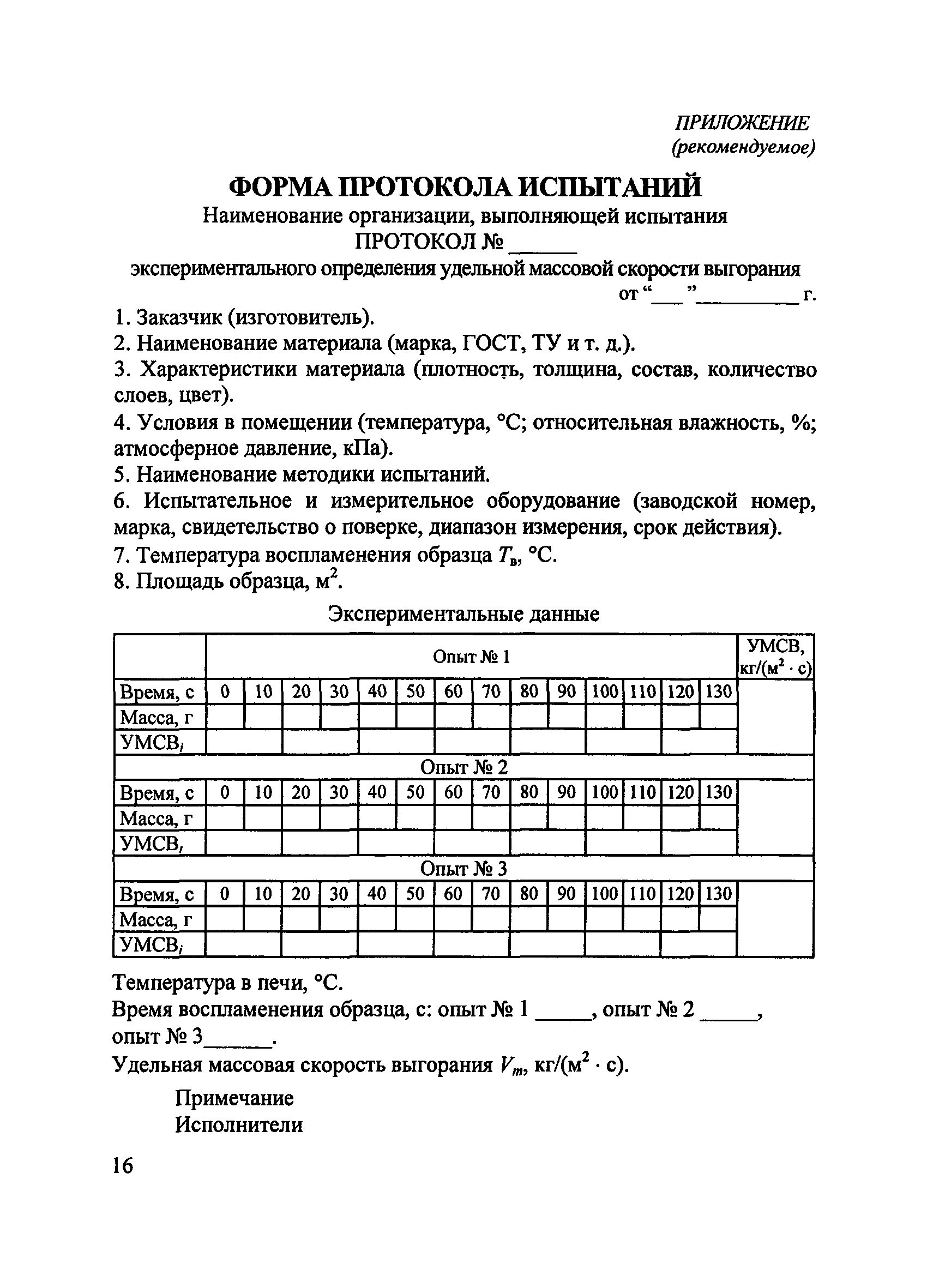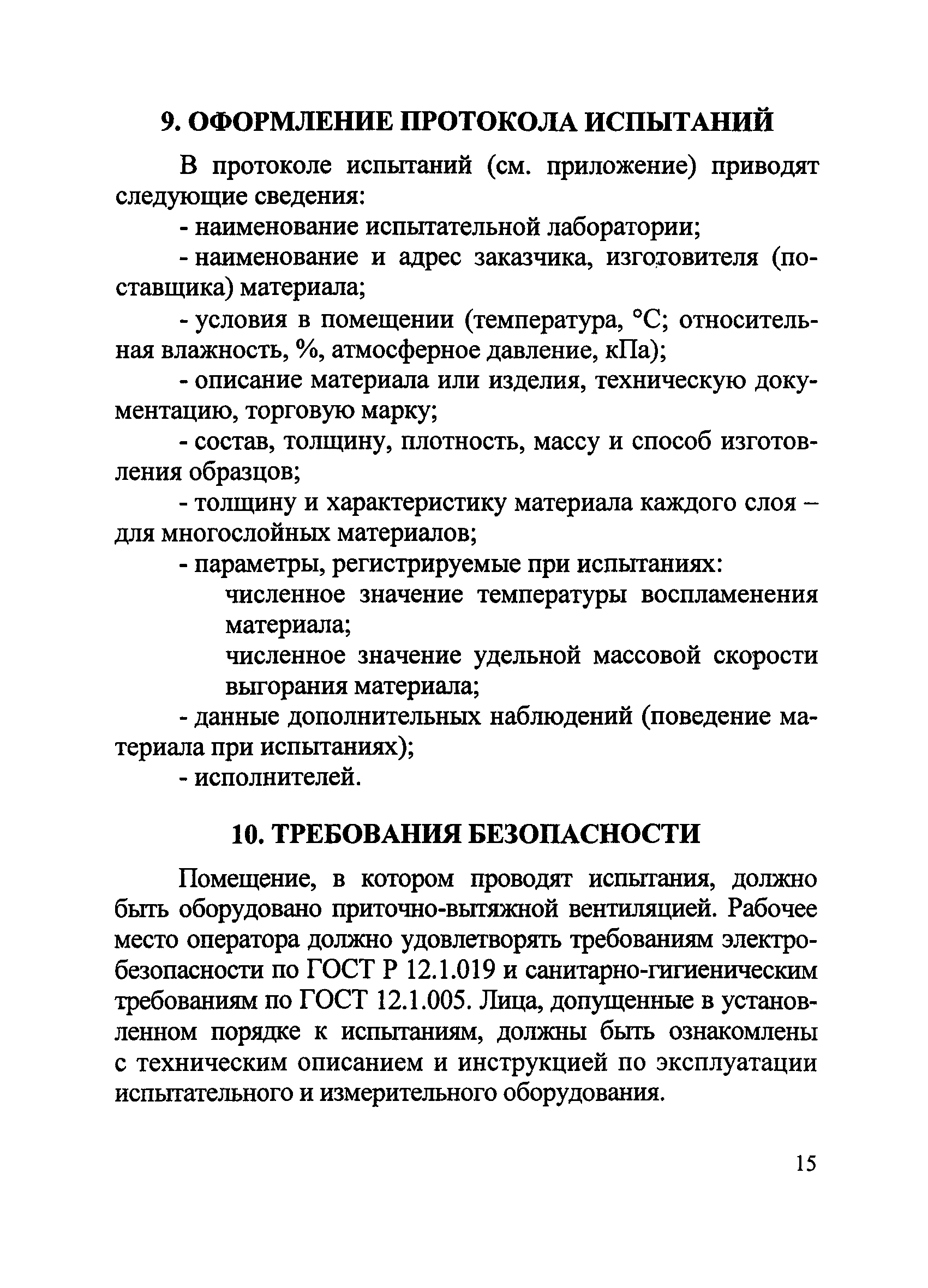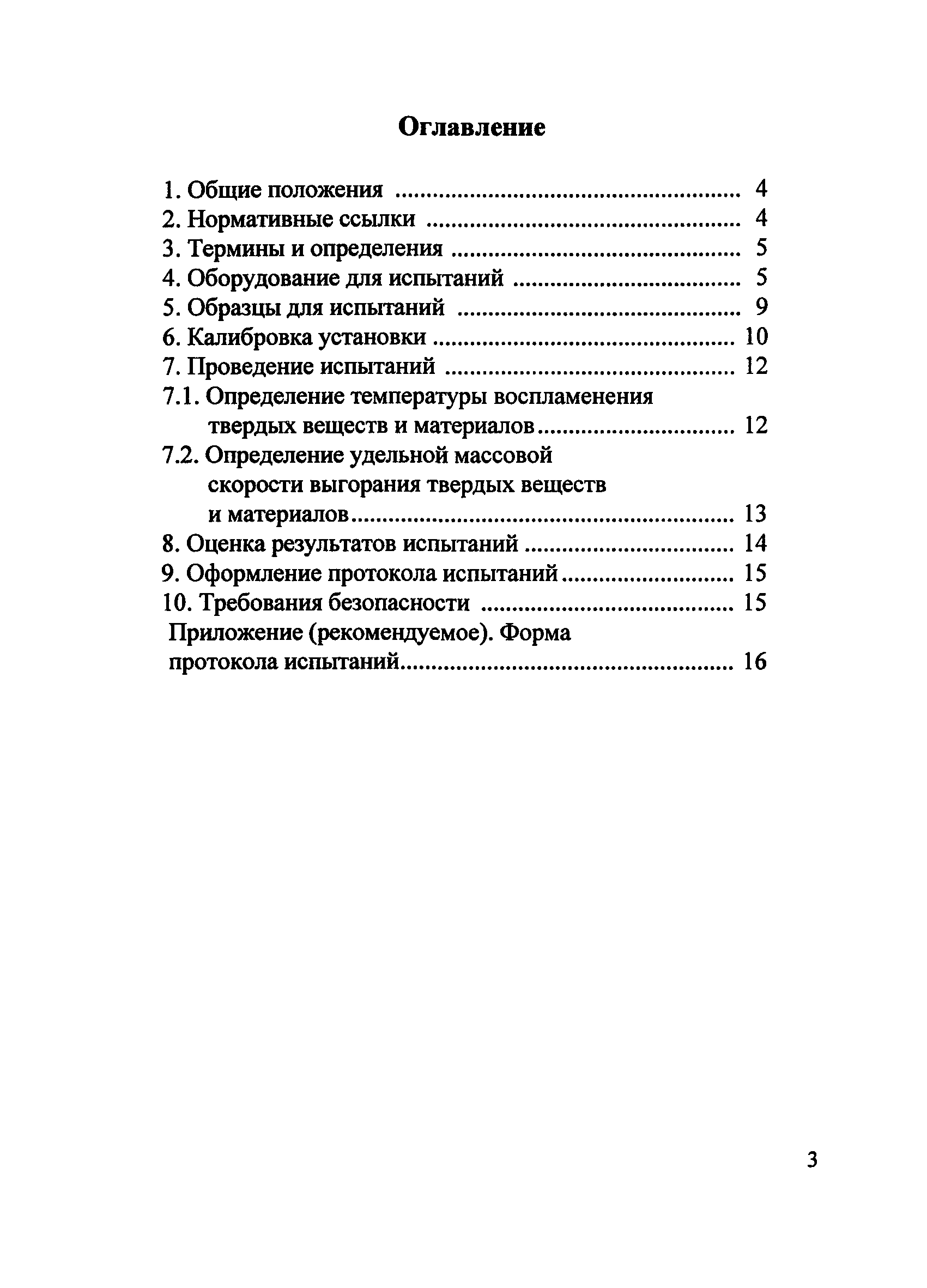 | Оглавление: | 1. Общие положения 2. Нормативные ссылки 3. Термины и определения 4. Оборудование для испытаний 5. Образцы для испытаний 6. Калибровка установки 7. Проведение испытаний 7.1. Определение температуры воспламенения твердых веществ и материалов 7.2. Определение удельной массовой скорости выгорания твердых веществ и материалов 8. Оценка результатов испытаний 9. Оформление протокола испытаний 10. Требования безопасности Приложение (рекомендуемое). Форма протокола испытаний |