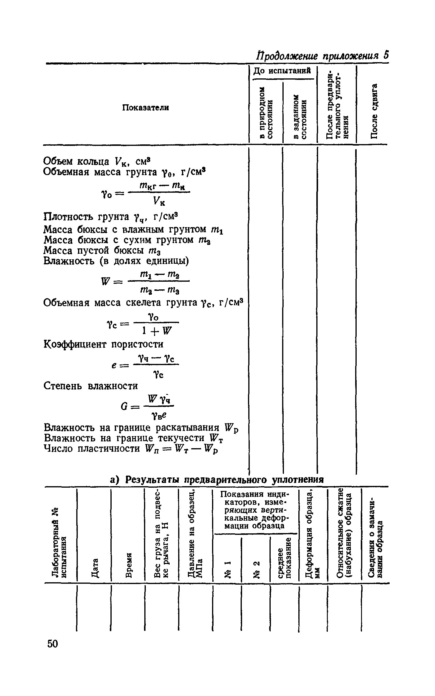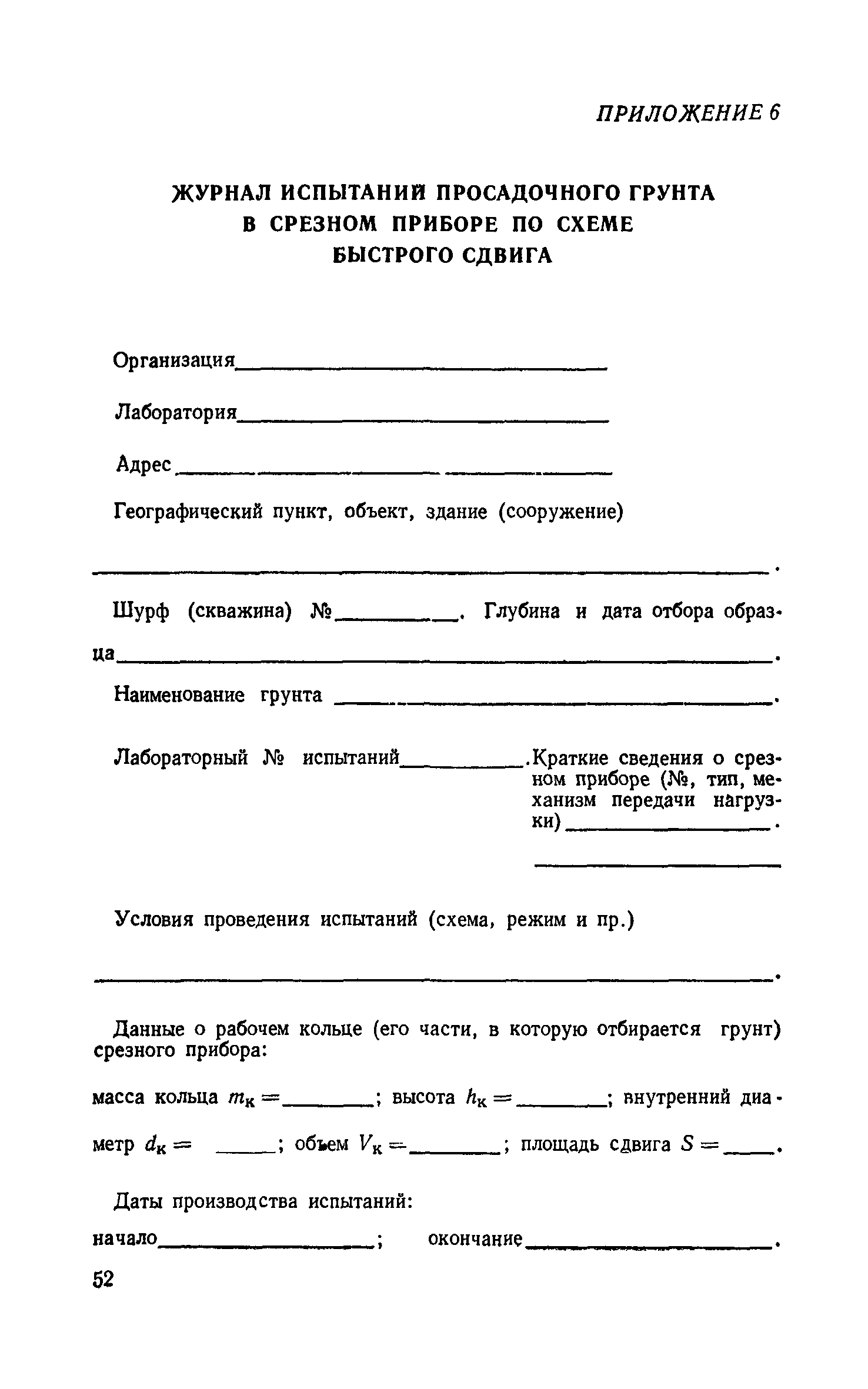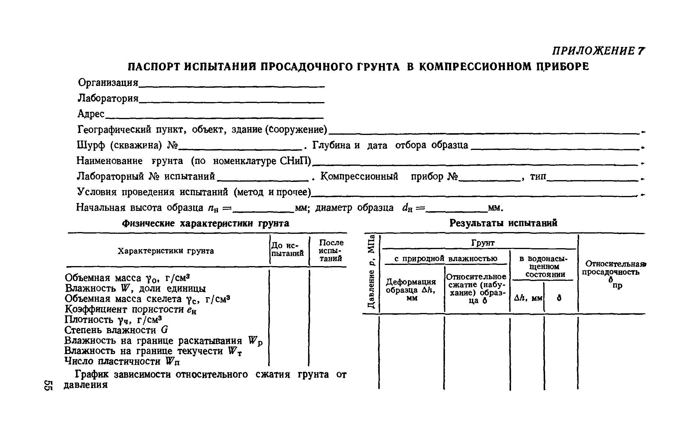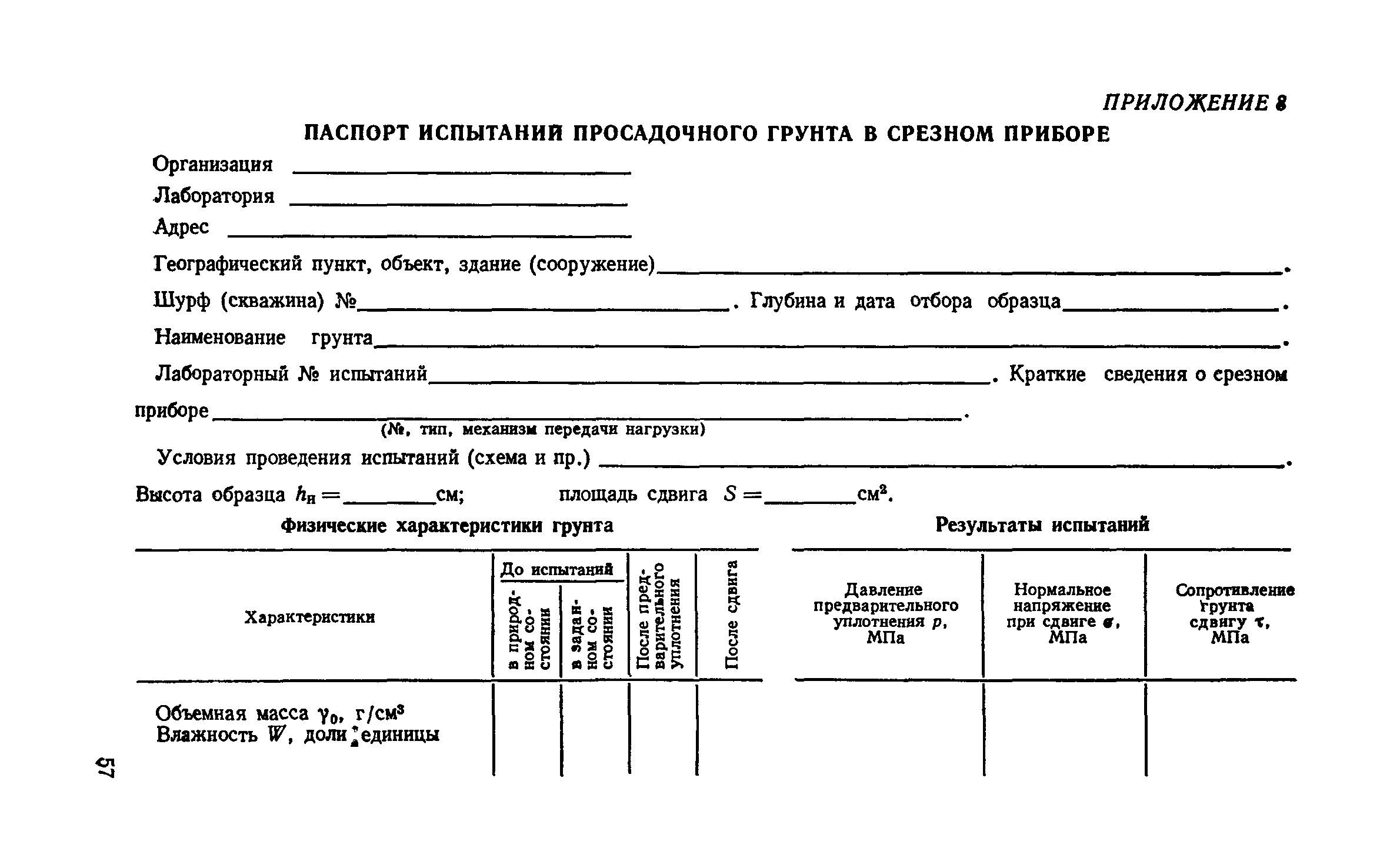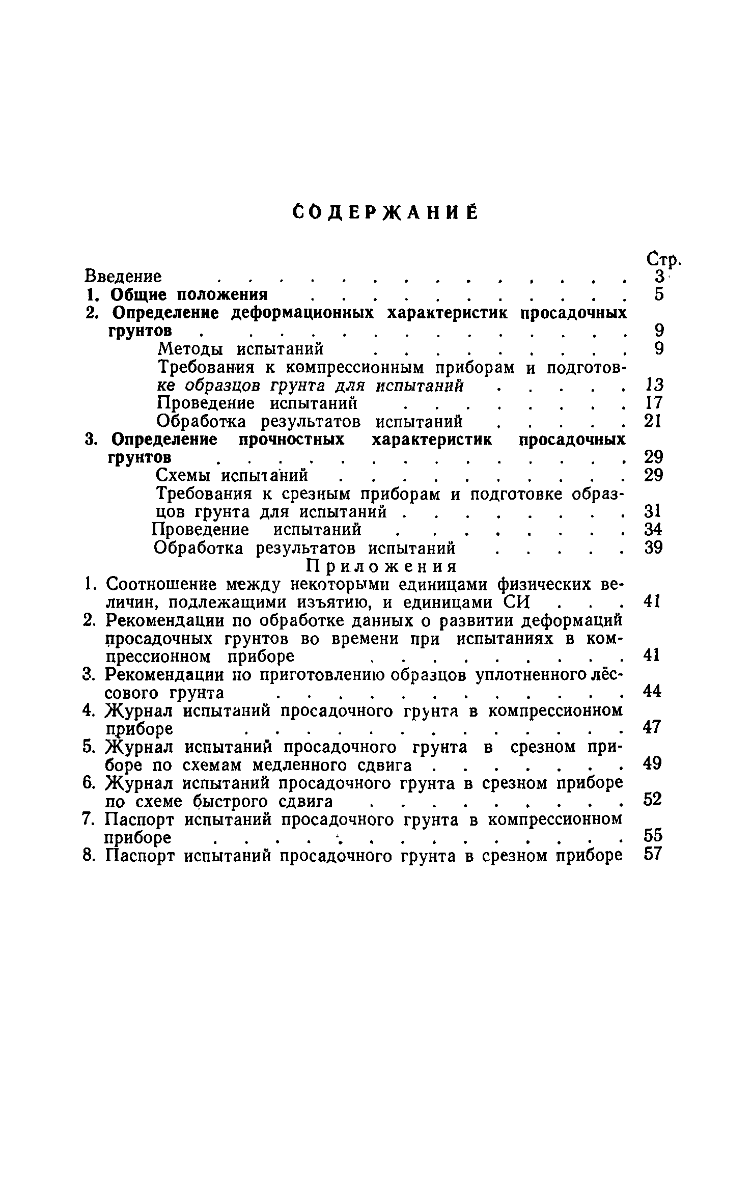 | Оглавление: | Введение 1 Общие положения 2 Определение деформационных характеристик просадочных грунтов Методы испытаний Требования к компрессионным приборам и подготовке образцов грунта для испытаний Проведение испытаний Обработка результатов испытаний 3 Определение прочностных характеристик просадочных грунтов Схемы испытаний Требования к срезным приборам и подготовке образцов грунта для испытаний Проведение испытаний Обработка результатов испытаний Приложение 1. Соотношение между некоторыми единицами физических величин, подлежащими изъятию, и единицами СИ Приложение 2. Рекомендации по обработке данных о развитии деформаций просадочных грунтов во времени при испытаниях в компрессионном приборе Приложение 3. Рекомендации по приготовлению образцов уплотненного лёссового грунта Приложение 4. Журнал испытаний просадочного грунта в компрессионном приборе Приложение 5. Журнал испытаний просадочного грунта в срезном приборе по схемам медленного сдвига Приложение 6. Журнал испытаний просадочного грунта в срезном приборе по схеме быстрого сдвига Приложение 7. Паспорт испытаний просадочного грунта в компрессионном приборе Приложение 8. Паспорт испытаний просадочного грунта в срезном приборе |