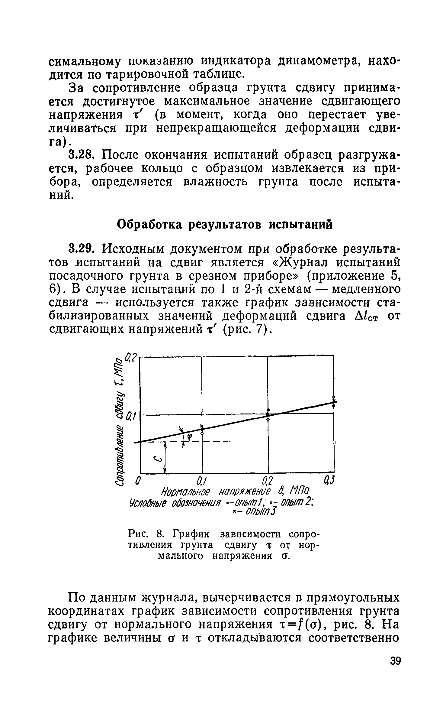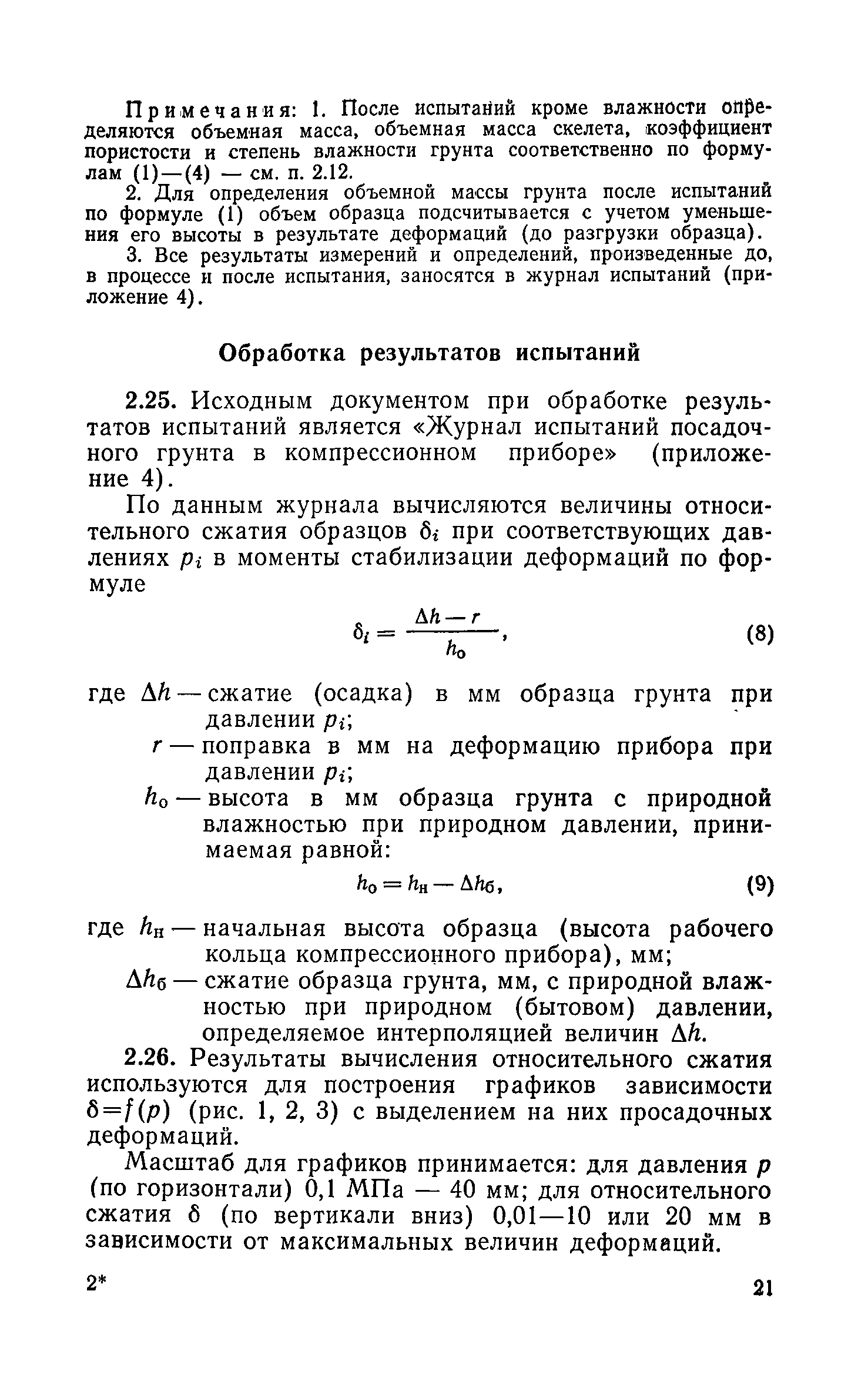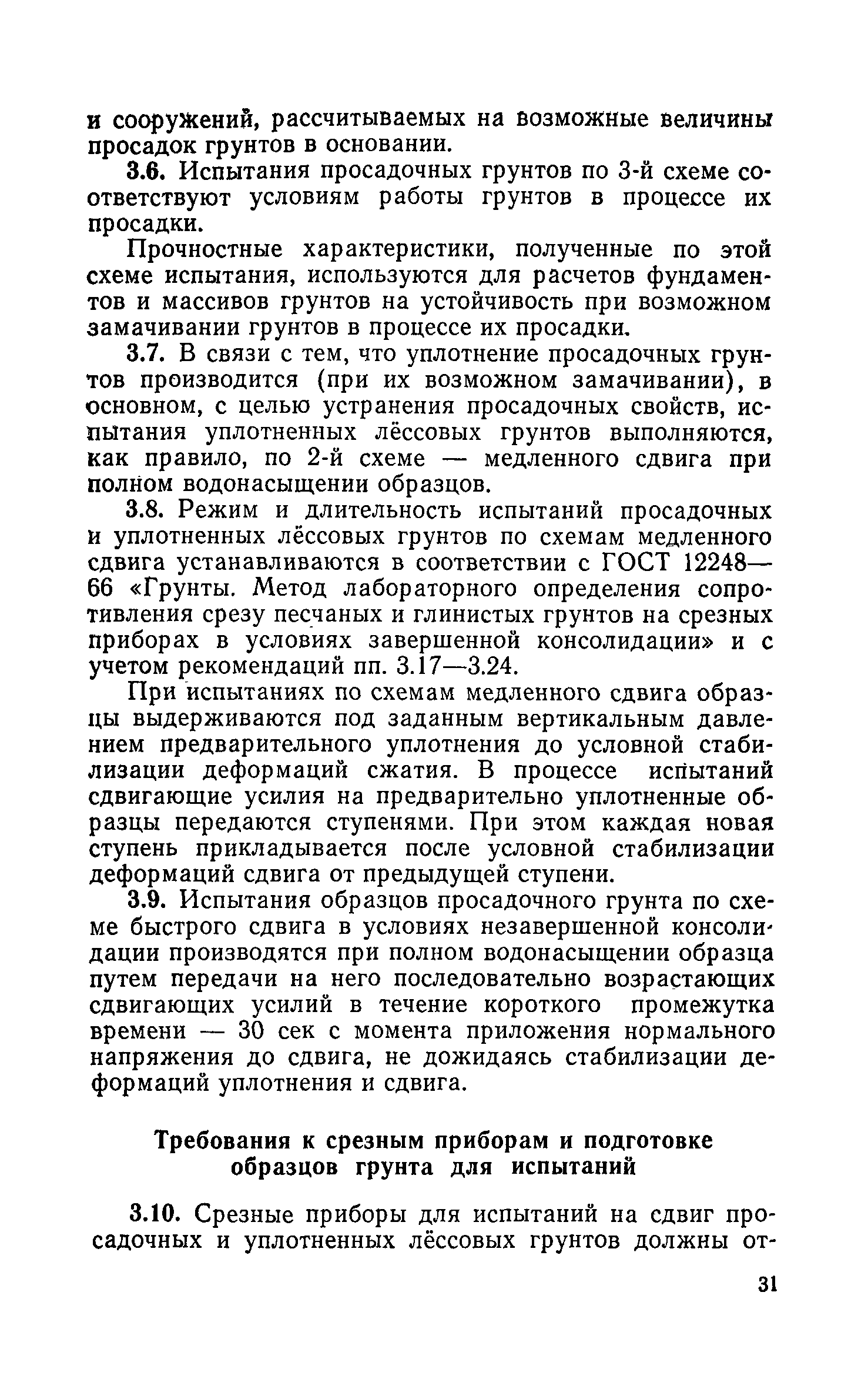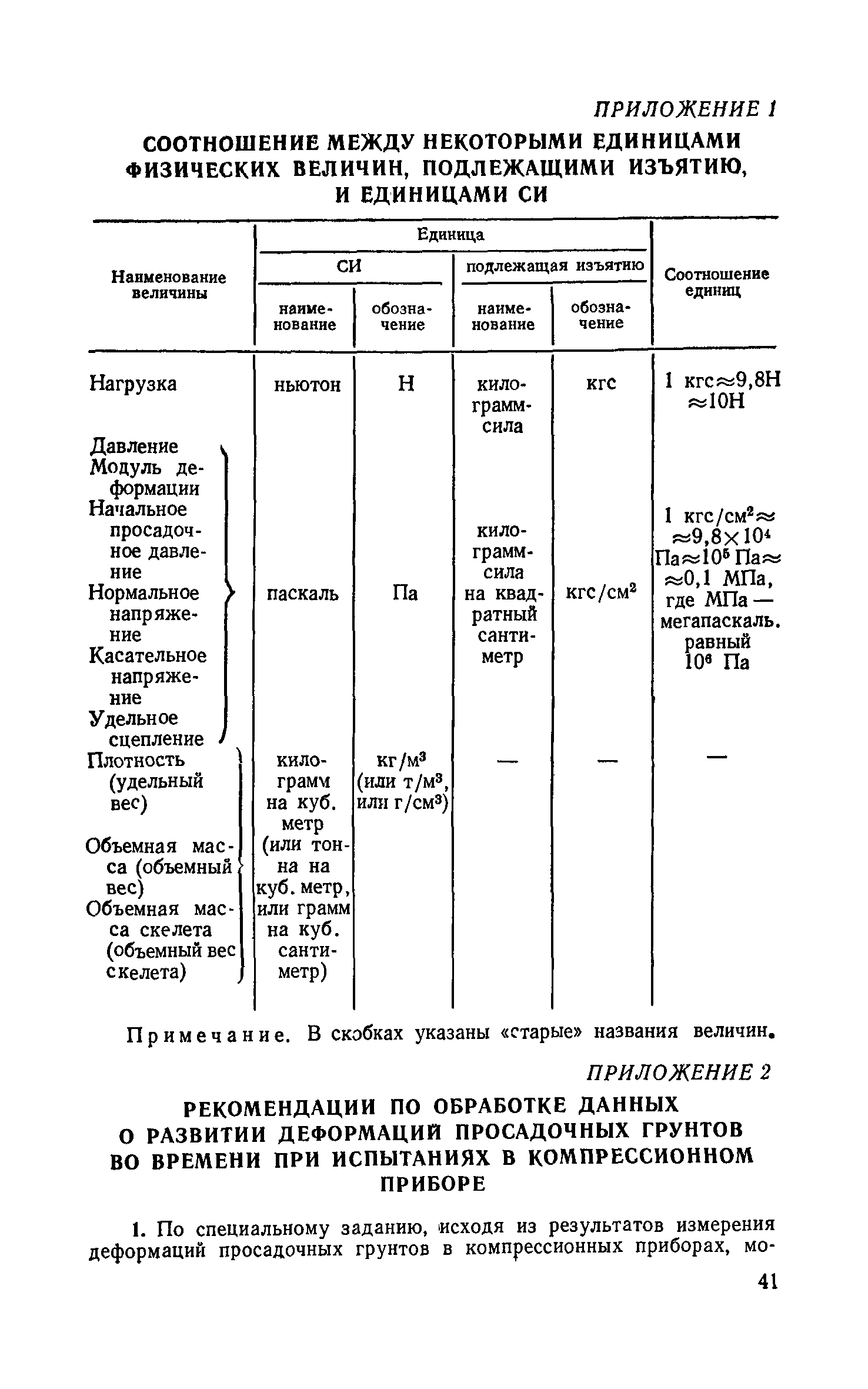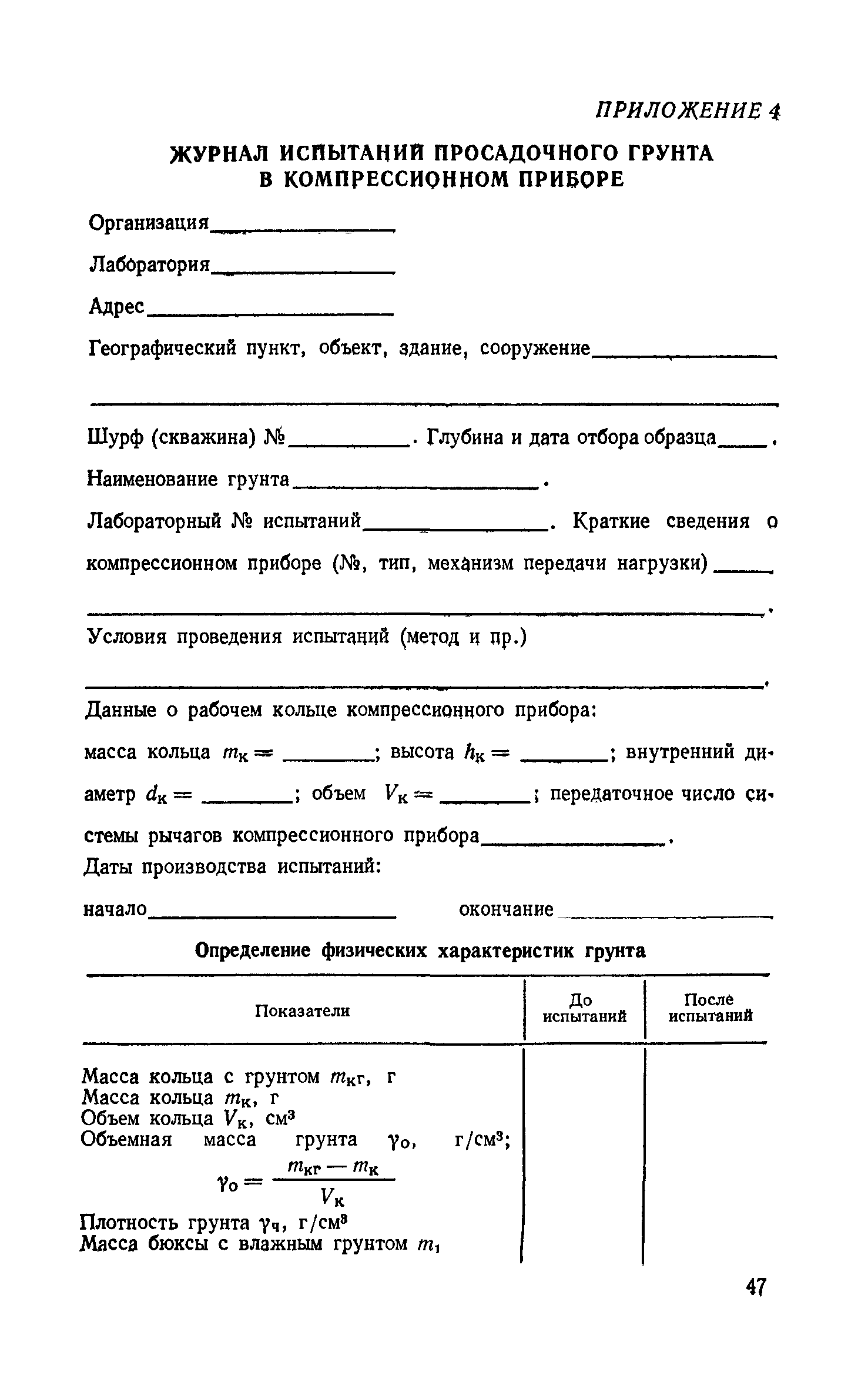 | Оглавление: | Введение 1 Общие положения 2 Определение деформационных характеристик просадочных грунтов Методы испытаний Требования к компрессионным приборам и подготовке образцов грунта для испытаний Проведение испытаний Обработка результатов испытаний 3 Определение прочностных характеристик просадочных грунтов Схемы испытаний Требования к срезным приборам и подготовке образцов грунта для испытаний Проведение испытаний Обработка результатов испытаний Приложение 1. Соотношение между некоторыми единицами физических величин, подлежащими изъятию, и единицами СИ Приложение 2. Рекомендации по обработке данных о развитии деформаций просадочных грунтов во времени при испытаниях в компрессионном приборе Приложение 3. Рекомендации по приготовлению образцов уплотненного лёссового грунта Приложение 4. Журнал испытаний просадочного грунта в компрессионном приборе Приложение 5. Журнал испытаний просадочного грунта в срезном приборе по схемам медленного сдвига Приложение 6. Журнал испытаний просадочного грунта в срезном приборе по схеме быстрого сдвига Приложение 7. Паспорт испытаний просадочного грунта в компрессионном приборе Приложение 8. Паспорт испытаний просадочного грунта в срезном приборе |