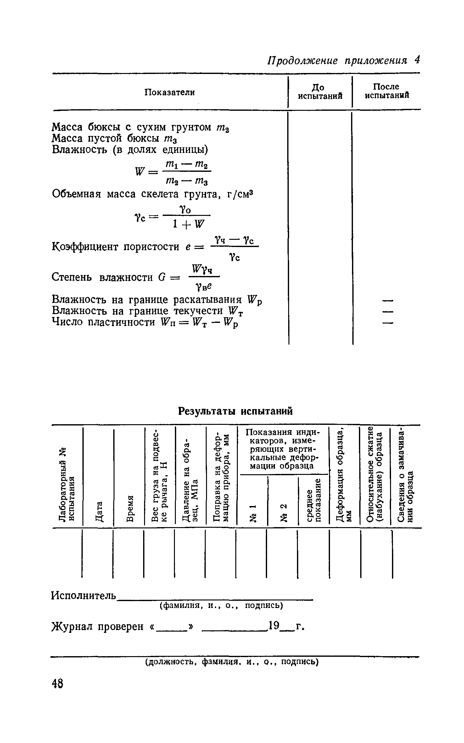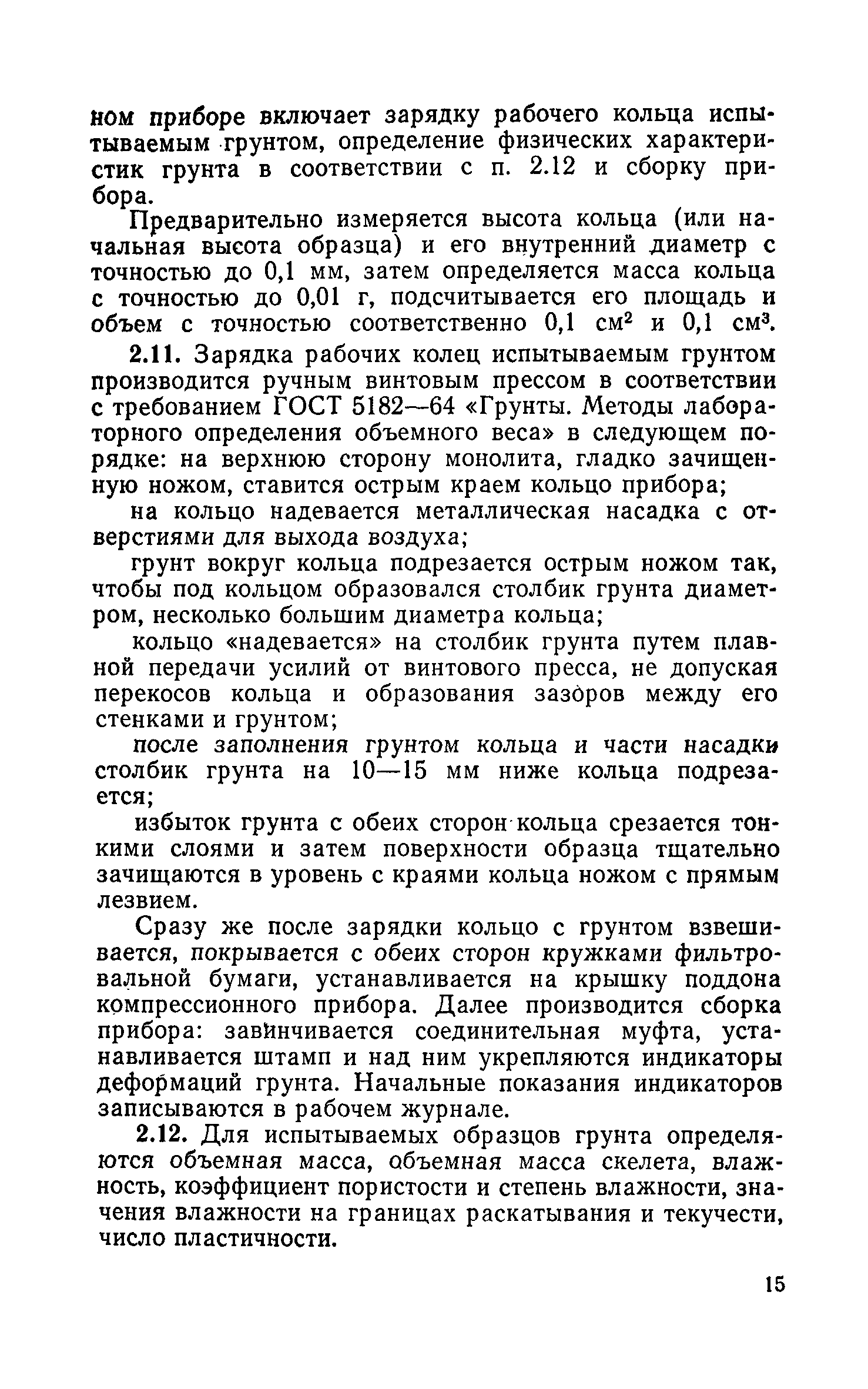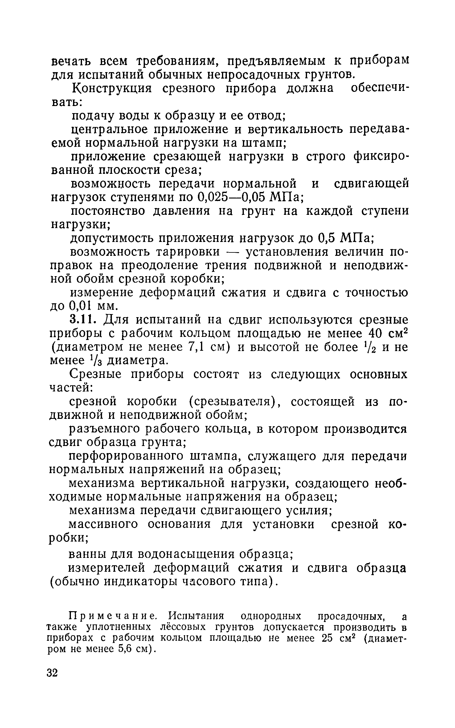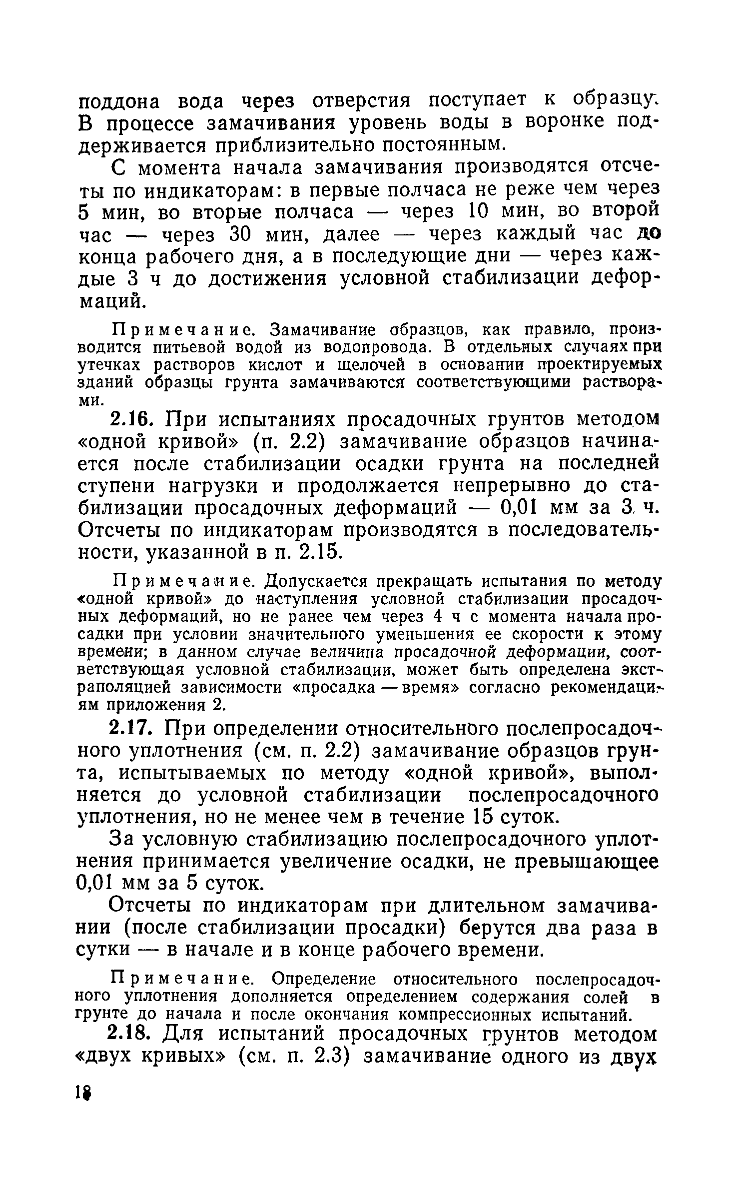 | Оглавление: | Введение 1 Общие положения 2 Определение деформационных характеристик просадочных грунтов Методы испытаний Требования к компрессионным приборам и подготовке образцов грунта для испытаний Проведение испытаний Обработка результатов испытаний 3 Определение прочностных характеристик просадочных грунтов Схемы испытаний Требования к срезным приборам и подготовке образцов грунта для испытаний Проведение испытаний Обработка результатов испытаний Приложение 1. Соотношение между некоторыми единицами физических величин, подлежащими изъятию, и единицами СИ Приложение 2. Рекомендации по обработке данных о развитии деформаций просадочных грунтов во времени при испытаниях в компрессионном приборе Приложение 3. Рекомендации по приготовлению образцов уплотненного лёссового грунта Приложение 4. Журнал испытаний просадочного грунта в компрессионном приборе Приложение 5. Журнал испытаний просадочного грунта в срезном приборе по схемам медленного сдвига Приложение 6. Журнал испытаний просадочного грунта в срезном приборе по схеме быстрого сдвига Приложение 7. Паспорт испытаний просадочного грунта в компрессионном приборе Приложение 8. Паспорт испытаний просадочного грунта в срезном приборе |