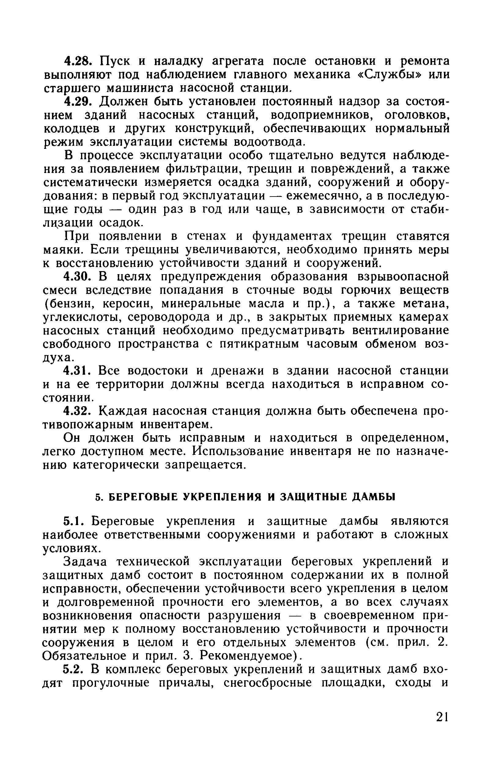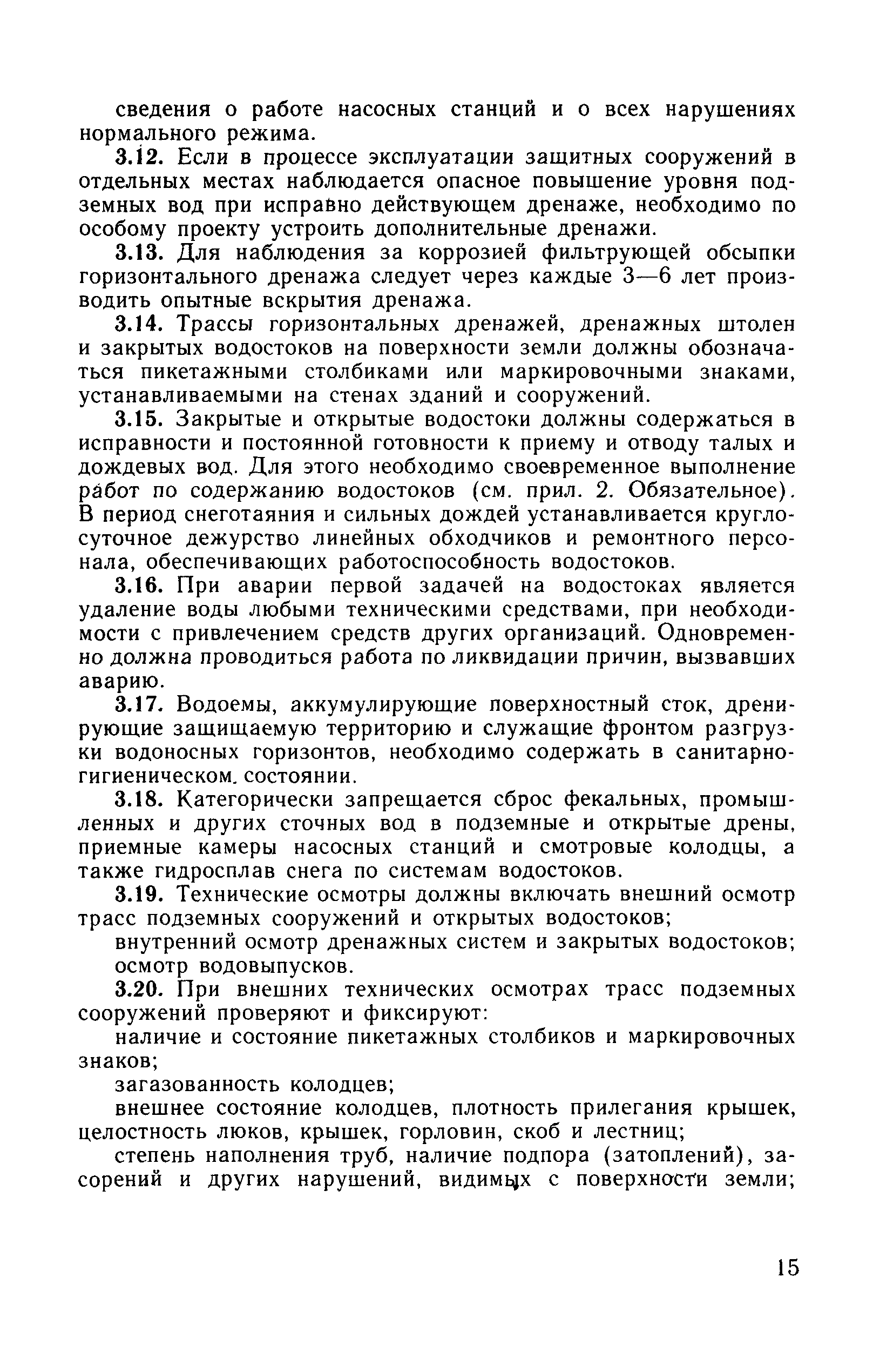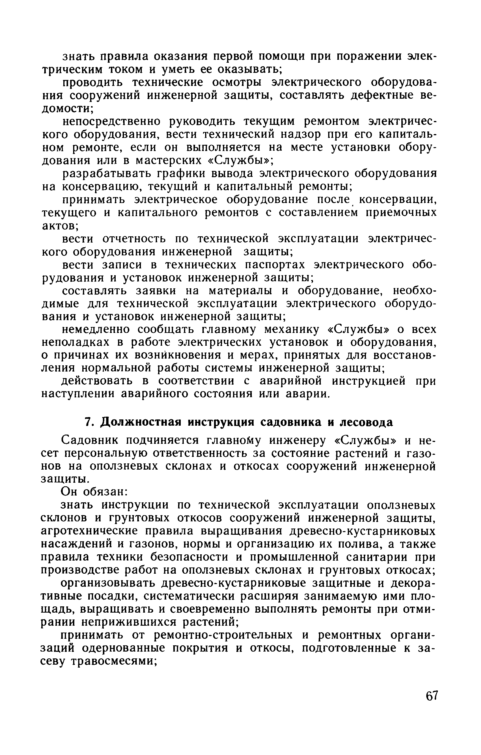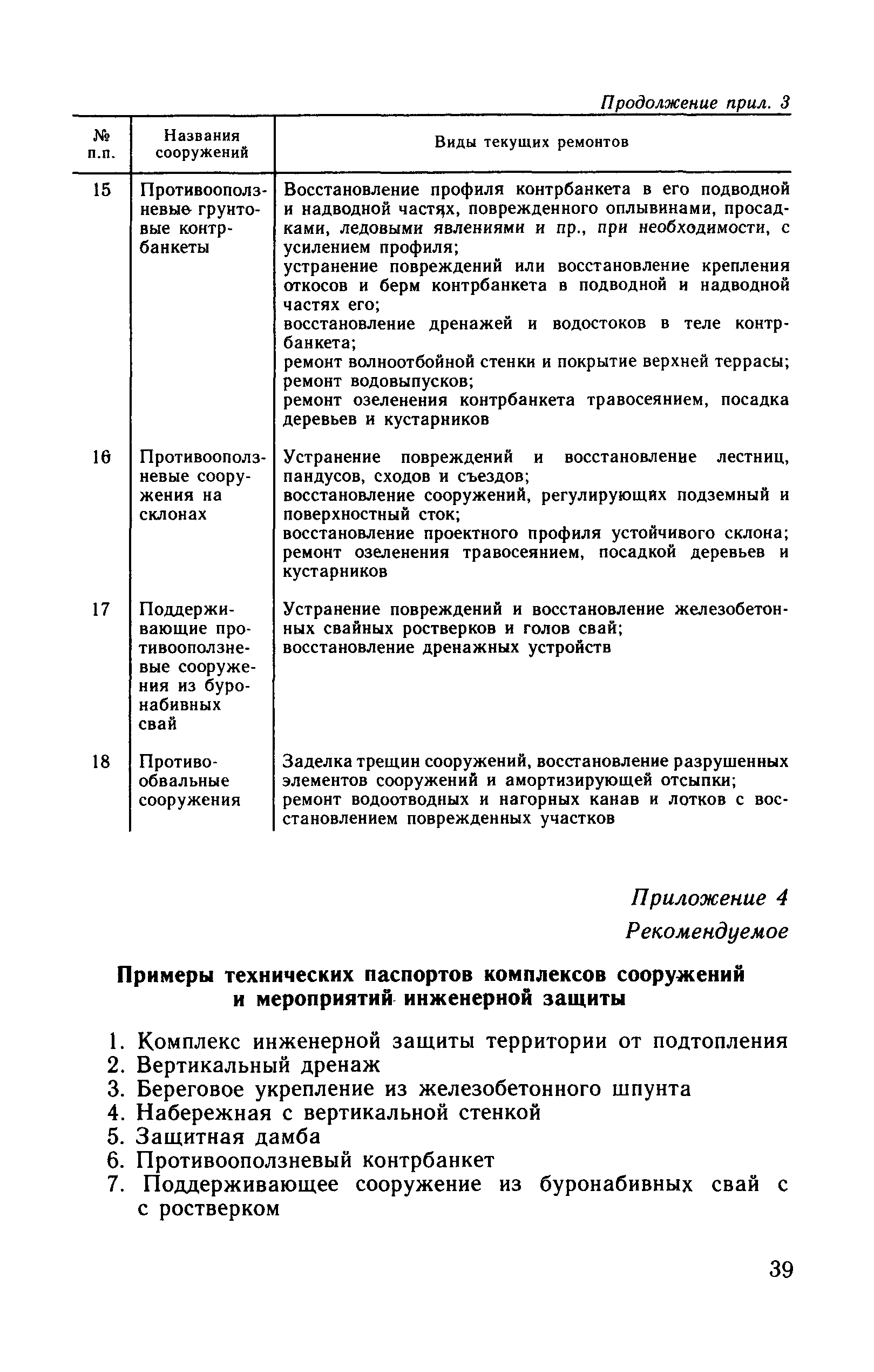 | Оглавление: | 1. Основные положения 2. Организация работы службы технической эксплуатации 3. Сооружения инженерной защиты от подтопления территорий подземными водами 4. Насосные станции 5. Береговые укрепления и защитные дамбы 6. Противооползневые сооружения, оползневые, потенциально-оползневые и обвалоопасные склоны Приложение 1(справочное). Перечень оборудования, механизмов и средств транспорта, рекомендуемых для технической эксплуатации сооружений инженерной защиты Приложение 2 (обязательное). Состав работ по содержанию сооружений инженерной защиты Приложение 3 (рекомендуемое). Ведомость текущих ремонтов сооружений инженерной защиты городов Приложение 4 (рекомендуемое). Примеры технических паспортов комплексов сооружений и мероприятий инженерной защиты Приложение 5 (рекомендуемое). Примерные должностные инструкции персонала "Службы" Приложение 6 (рекомендуемое). Абрис магистрального хода и поперечников Приложение 7 (рекомендуемое). План-схема, абрис и таблица ледовых наблюдений Приложение 8 (рекомендуемое). Типовое аварийное расписание Приложение 9 (рекомендуемое). Абрисы склонового стока талых вод |