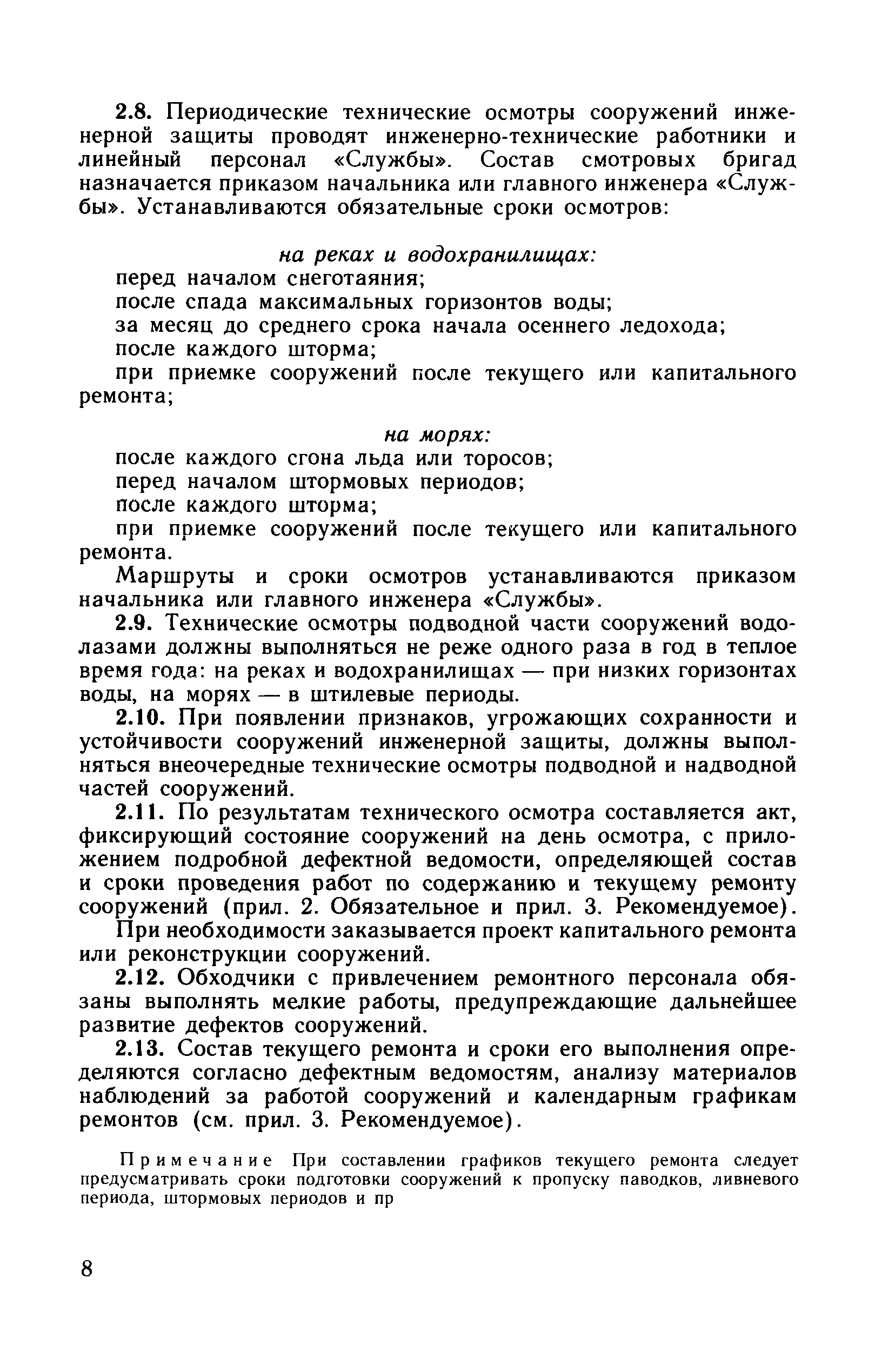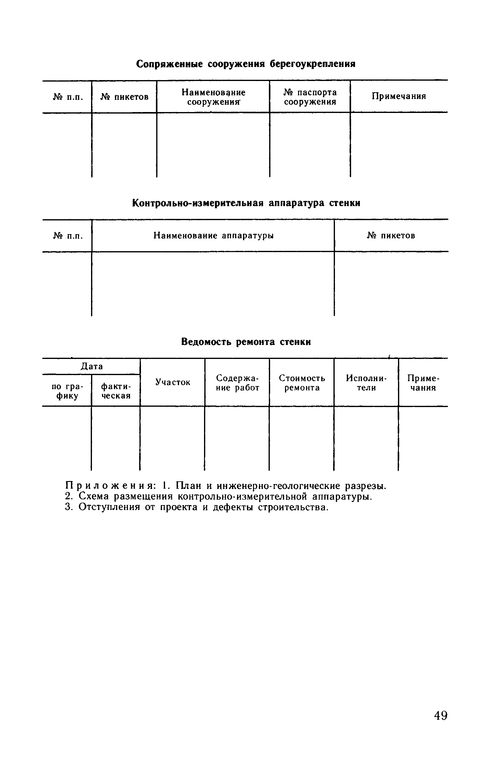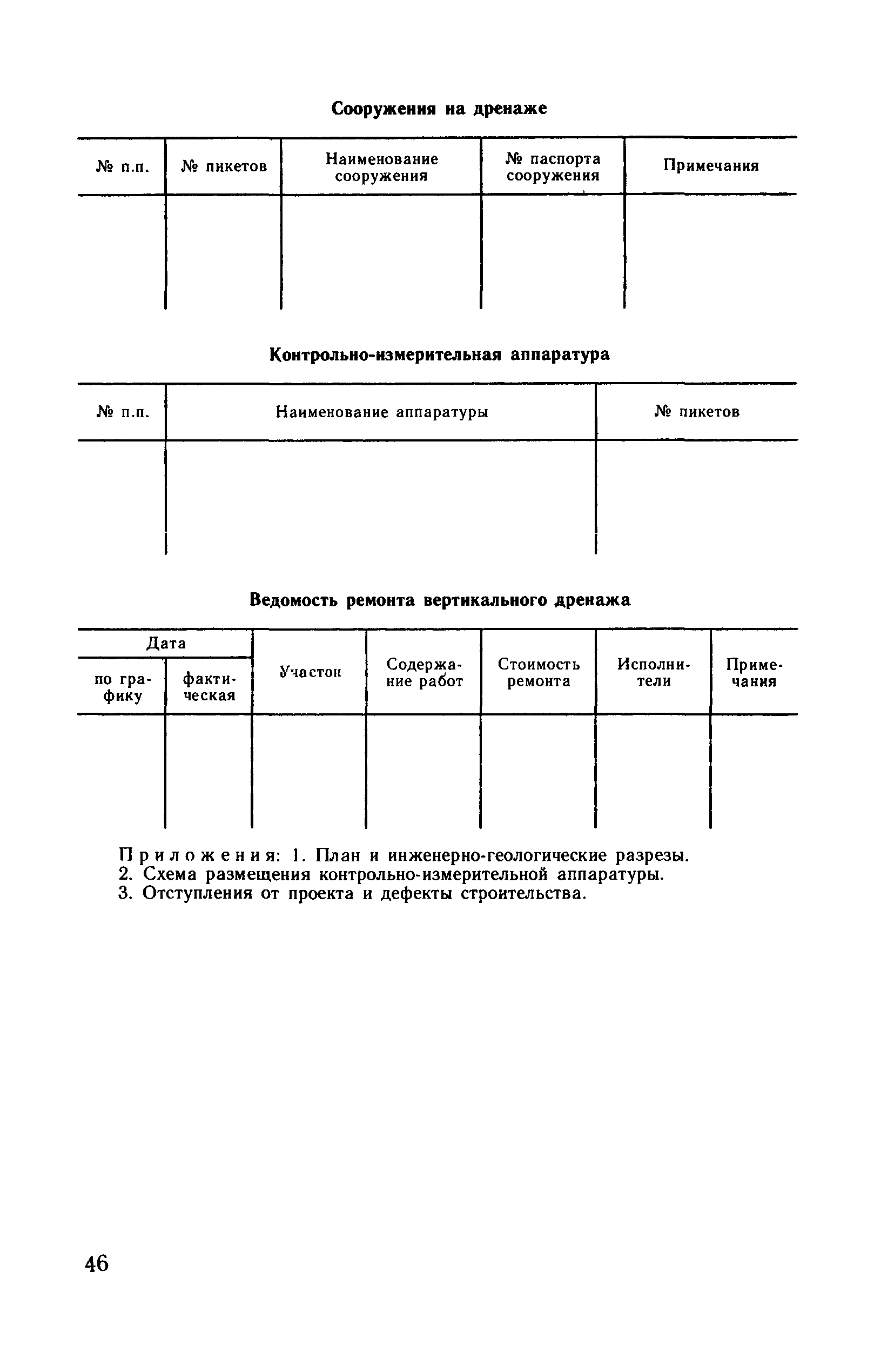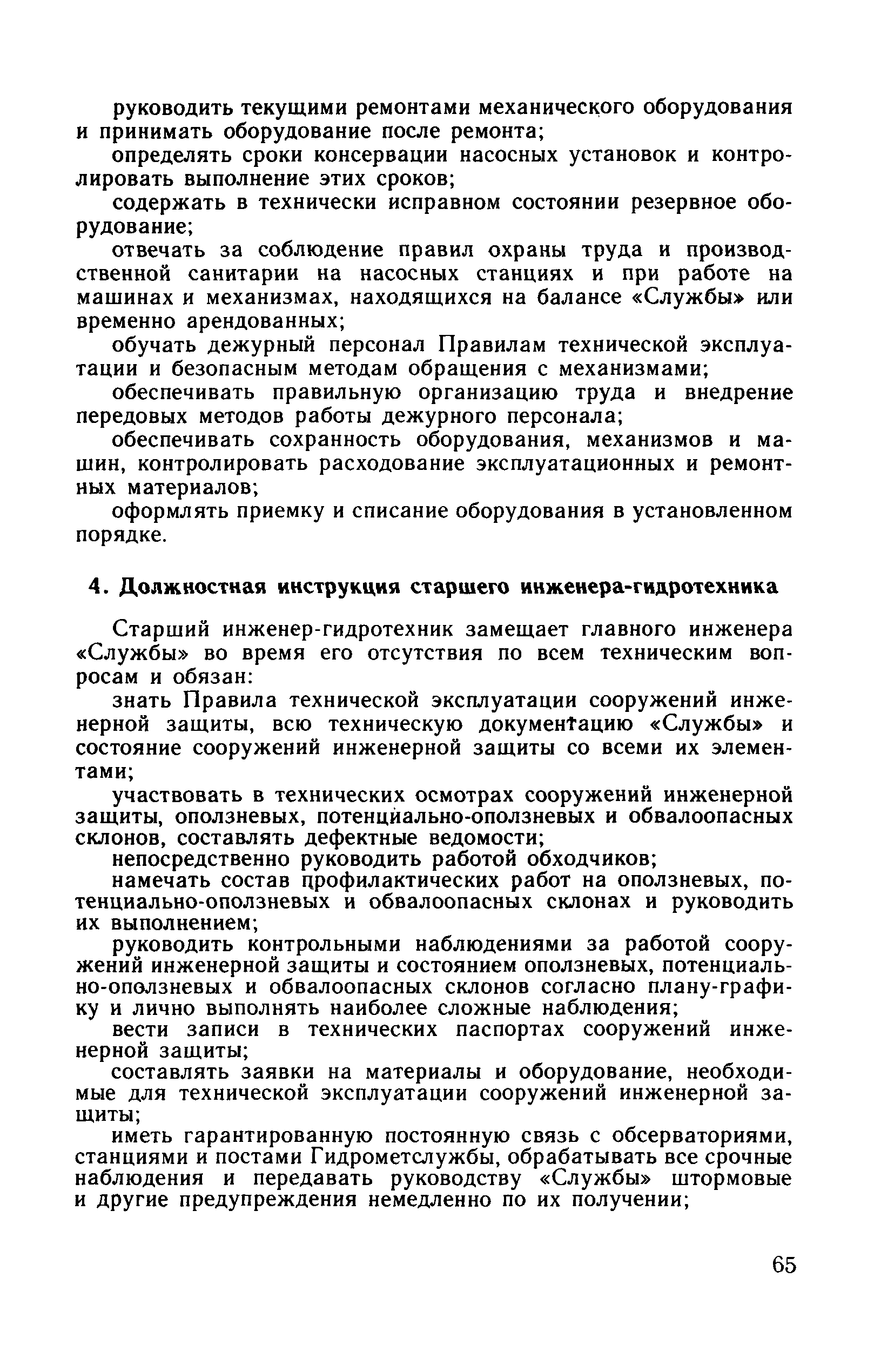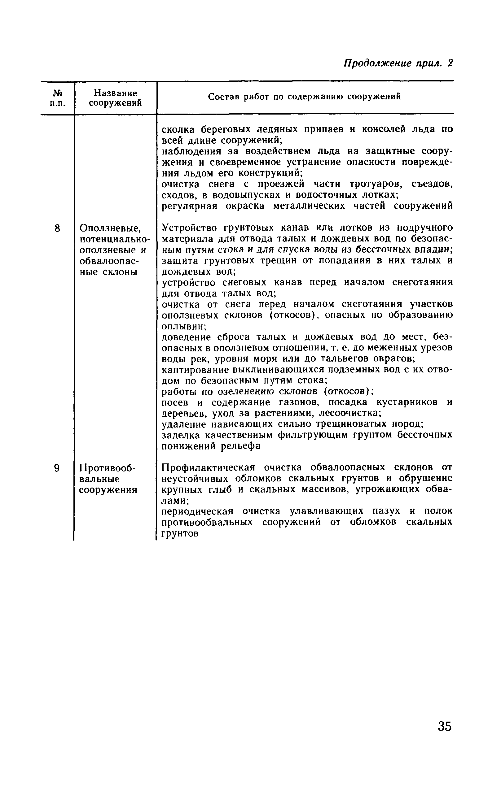 | Оглавление: | 1. Основные положения 2. Организация работы службы технической эксплуатации 3. Сооружения инженерной защиты от подтопления территорий подземными водами 4. Насосные станции 5. Береговые укрепления и защитные дамбы 6. Противооползневые сооружения, оползневые, потенциально-оползневые и обвалоопасные склоны Приложение 1(справочное). Перечень оборудования, механизмов и средств транспорта, рекомендуемых для технической эксплуатации сооружений инженерной защиты Приложение 2 (обязательное). Состав работ по содержанию сооружений инженерной защиты Приложение 3 (рекомендуемое). Ведомость текущих ремонтов сооружений инженерной защиты городов Приложение 4 (рекомендуемое). Примеры технических паспортов комплексов сооружений и мероприятий инженерной защиты Приложение 5 (рекомендуемое). Примерные должностные инструкции персонала "Службы" Приложение 6 (рекомендуемое). Абрис магистрального хода и поперечников Приложение 7 (рекомендуемое). План-схема, абрис и таблица ледовых наблюдений Приложение 8 (рекомендуемое). Типовое аварийное расписание Приложение 9 (рекомендуемое). Абрисы склонового стока талых вод |