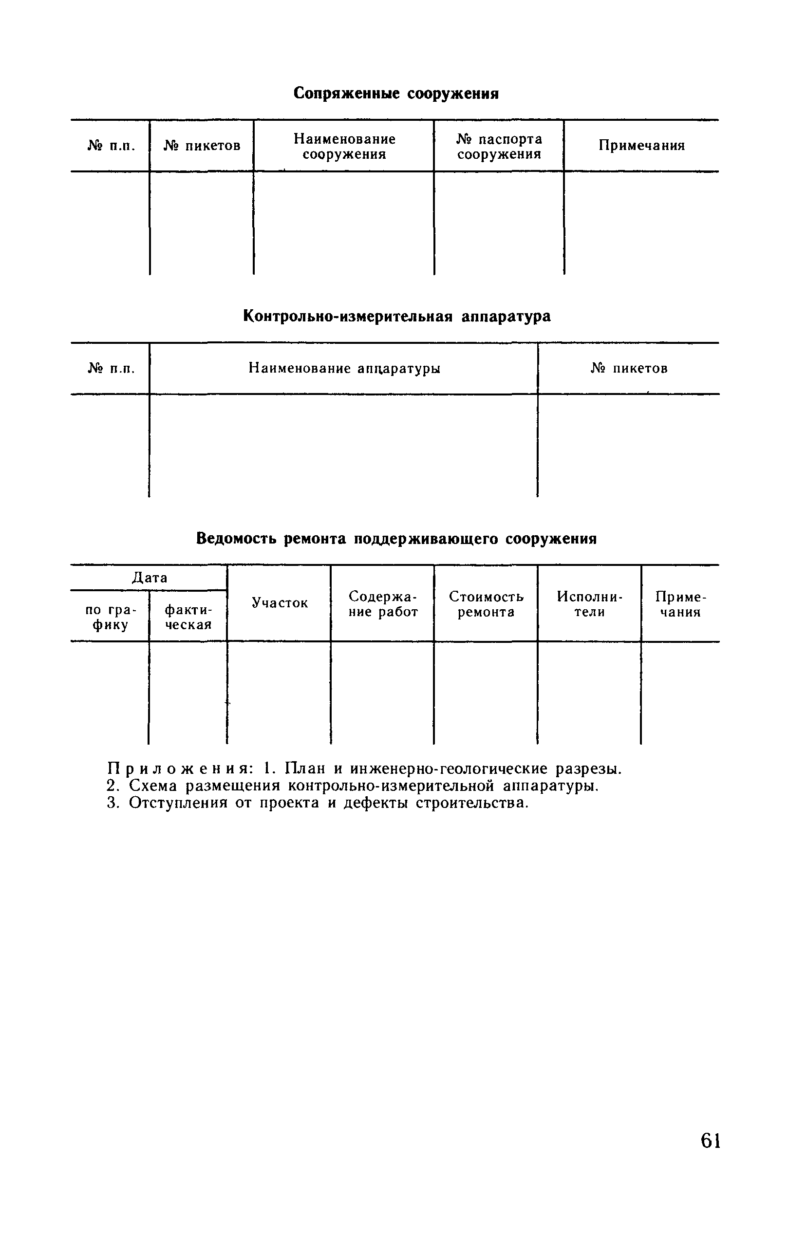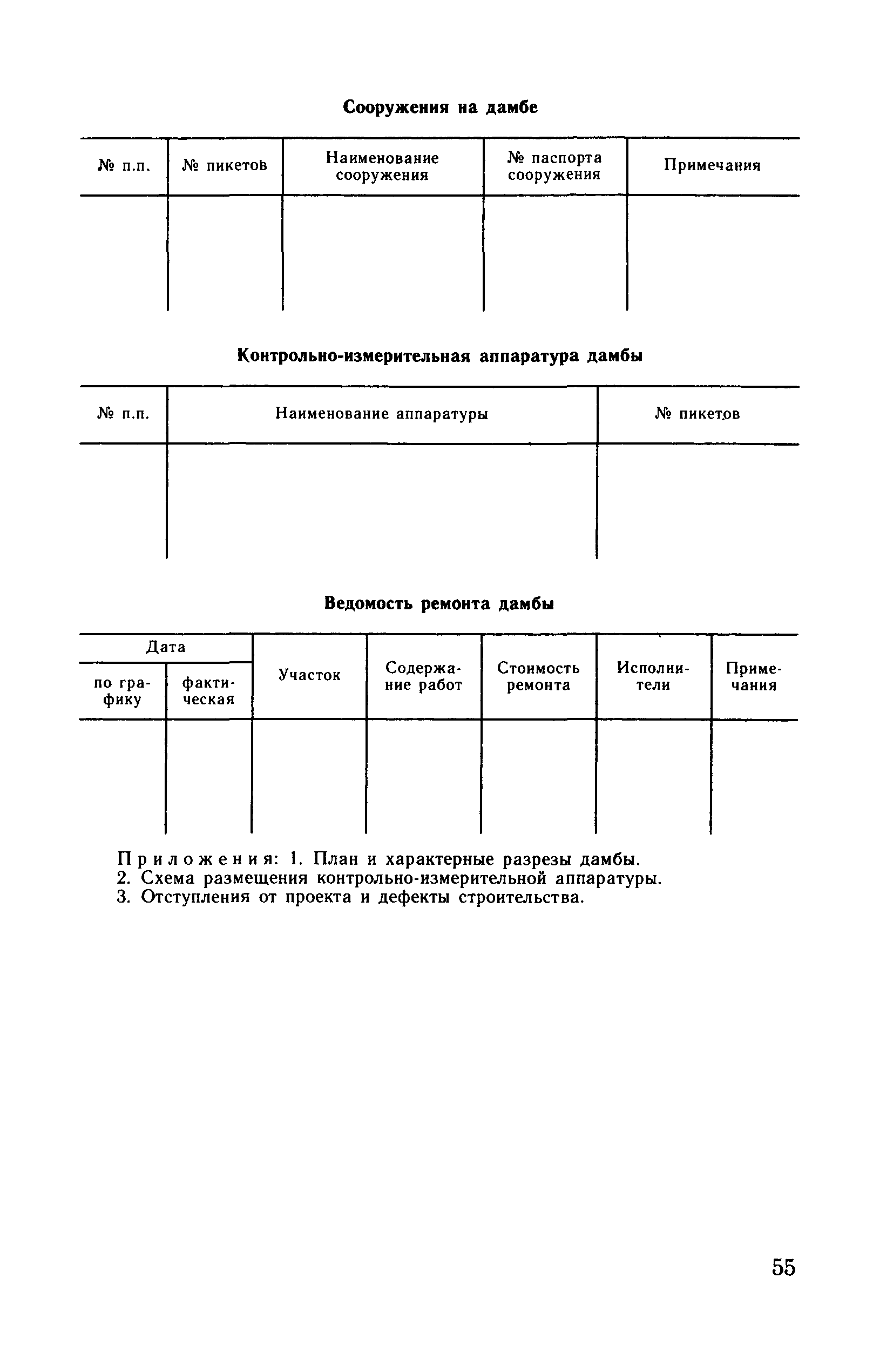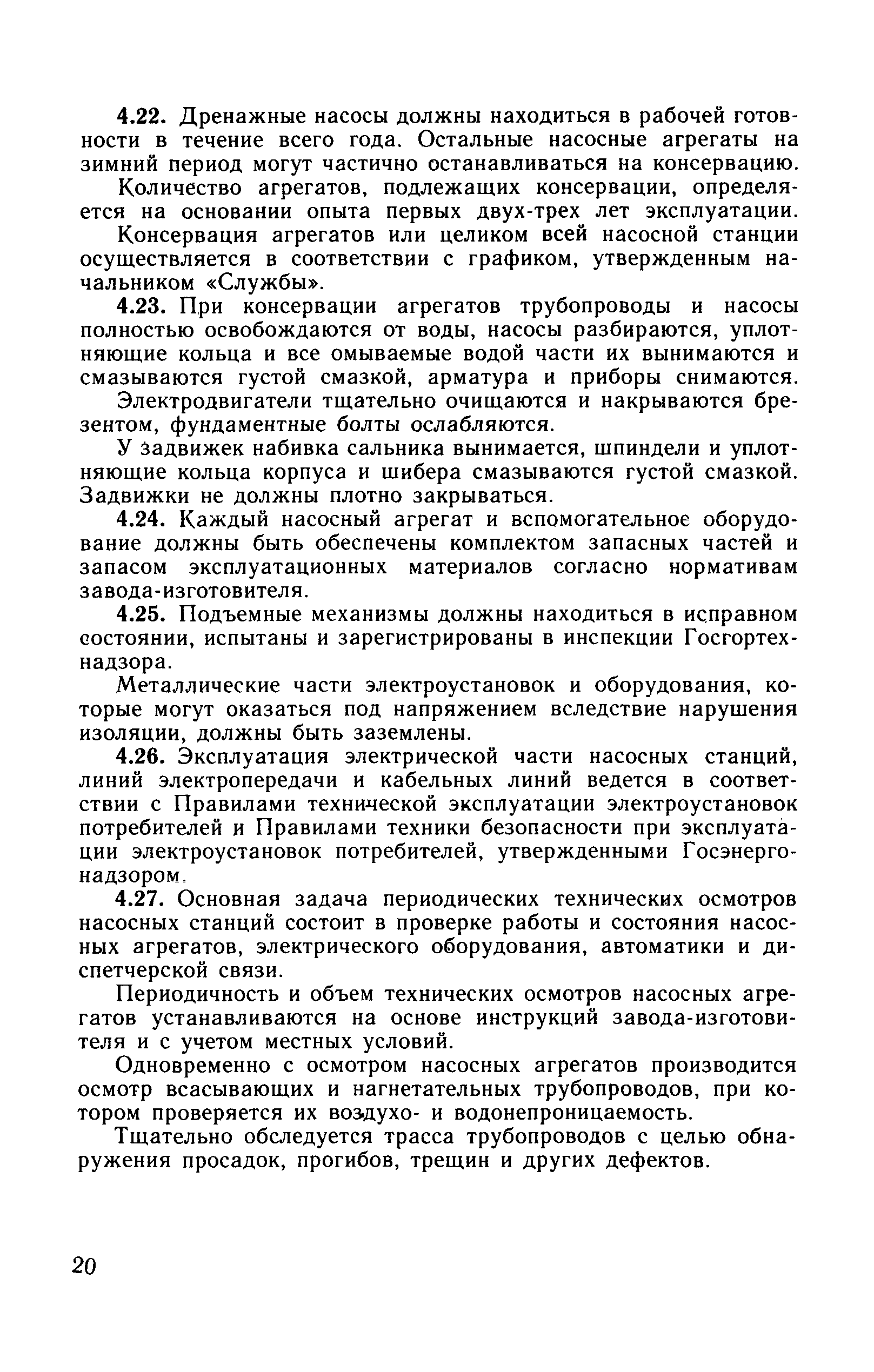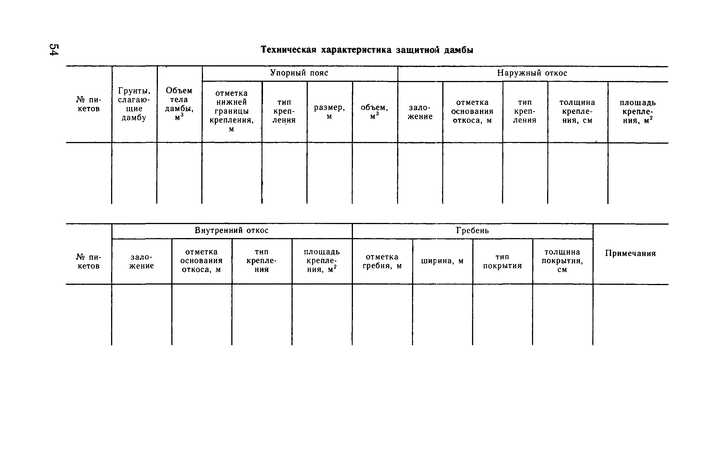 | Оглавление: | 1. Основные положения 2. Организация работы службы технической эксплуатации 3. Сооружения инженерной защиты от подтопления территорий подземными водами 4. Насосные станции 5. Береговые укрепления и защитные дамбы 6. Противооползневые сооружения, оползневые, потенциально-оползневые и обвалоопасные склоны Приложение 1(справочное). Перечень оборудования, механизмов и средств транспорта, рекомендуемых для технической эксплуатации сооружений инженерной защиты Приложение 2 (обязательное). Состав работ по содержанию сооружений инженерной защиты Приложение 3 (рекомендуемое). Ведомость текущих ремонтов сооружений инженерной защиты городов Приложение 4 (рекомендуемое). Примеры технических паспортов комплексов сооружений и мероприятий инженерной защиты Приложение 5 (рекомендуемое). Примерные должностные инструкции персонала "Службы" Приложение 6 (рекомендуемое). Абрис магистрального хода и поперечников Приложение 7 (рекомендуемое). План-схема, абрис и таблица ледовых наблюдений Приложение 8 (рекомендуемое). Типовое аварийное расписание Приложение 9 (рекомендуемое). Абрисы склонового стока талых вод |