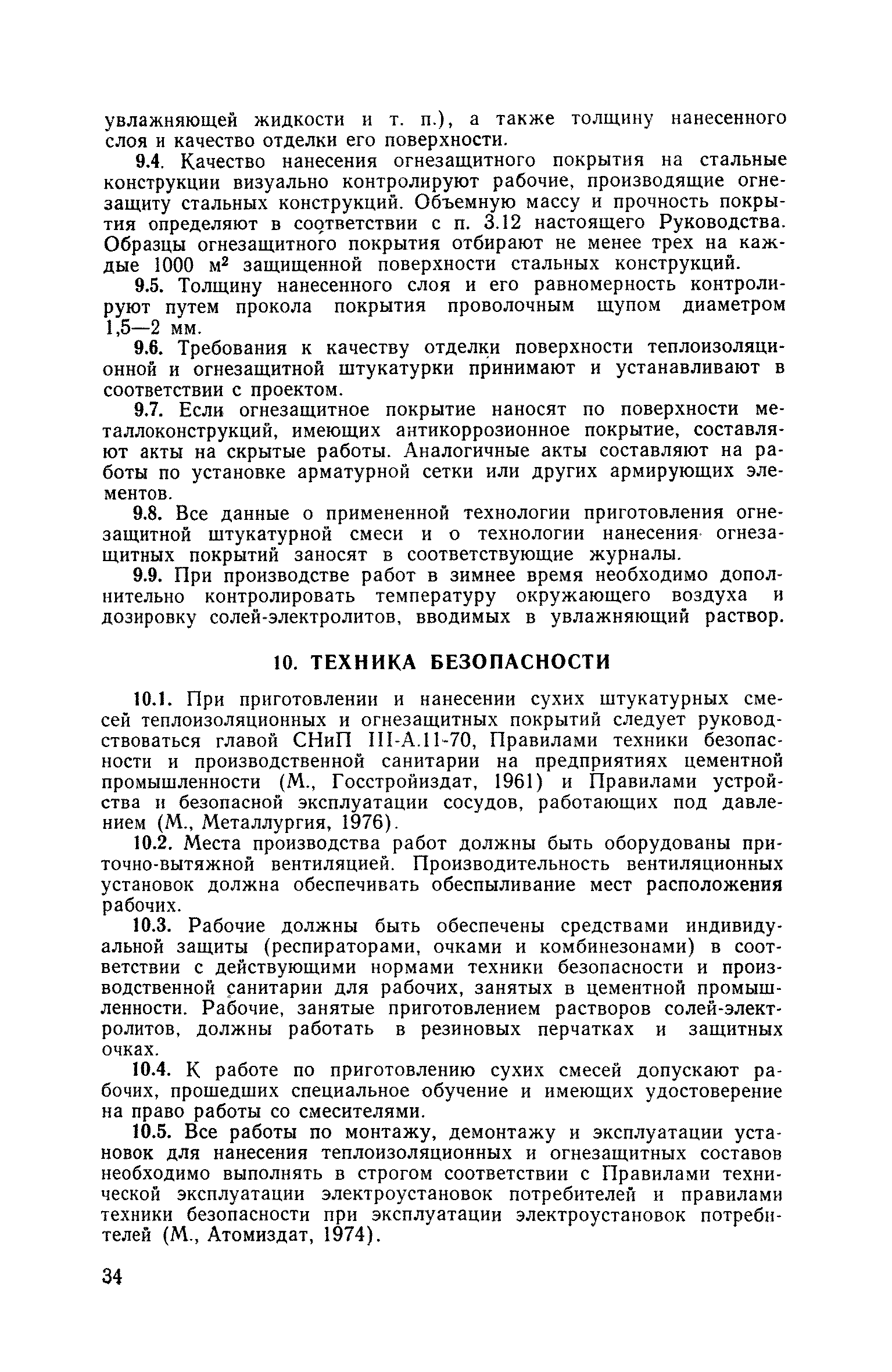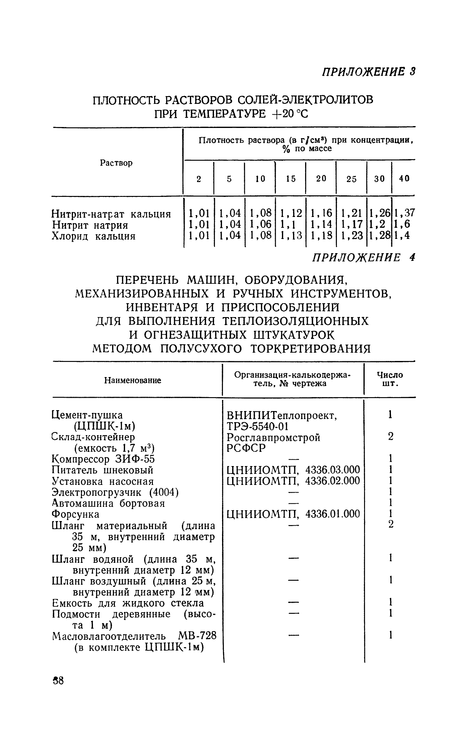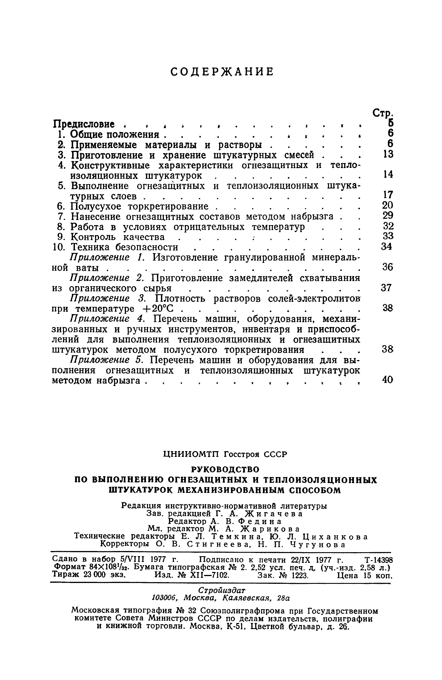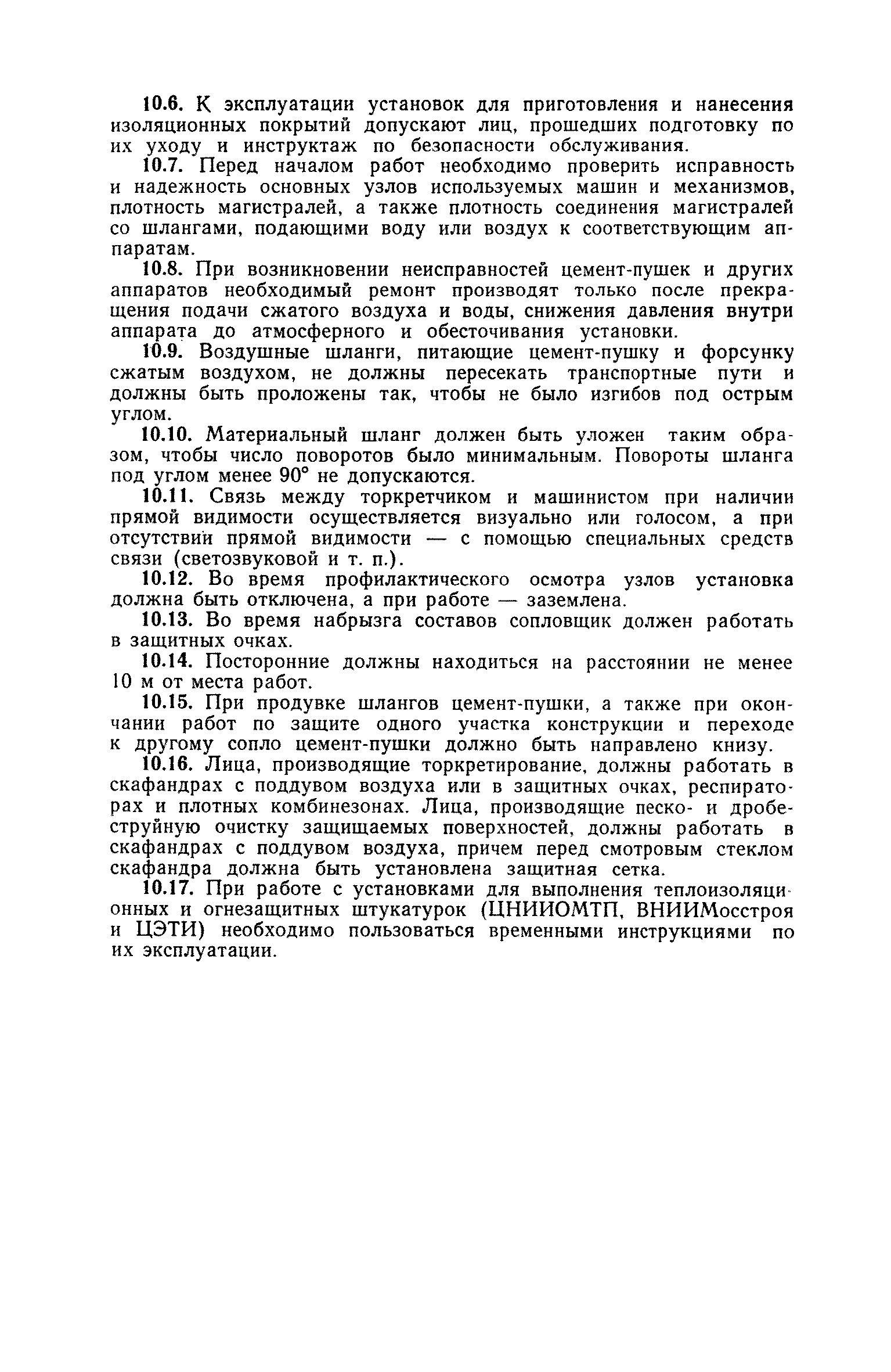 | Оглавление: | Предисловие 1. Общие положения . 2. Применяемые материалы и растворы 3. Приготовление и хранение штукатурных смесей 4. Конструктивные характеристики огнезащитных и теплоизоляционных штукатурок 5. Выполнение огнезащитных и теплоизоляционных штукатурных слоев 6. Полусухое торкретирование 7. Нанесение огнезащитных составов методом набрызга 8. Работа в условиях отрицательных температур 9. Контроль качества 10. Техника безопасности Приложение 1. Изготовление гранулированной минеральной ваты Приложение 2. Приготовление замедлителей схватывания из органического сырья Приложение 3. Плотность растворов солей-электролитов при температуре плюс 20 градусов Цельсия Приложение 4. Перечень машин, оборудования, механизированных и ручных инструментов, инвентаря и приспособлений для выполнения теплоизоляционных и огнезащитных штукатурок методом полусухого торкретирования Приложение 5. Перечень машин и оборудования для выполнения огнезащитных и теплоизоляционных штукатурок методом набрызга |