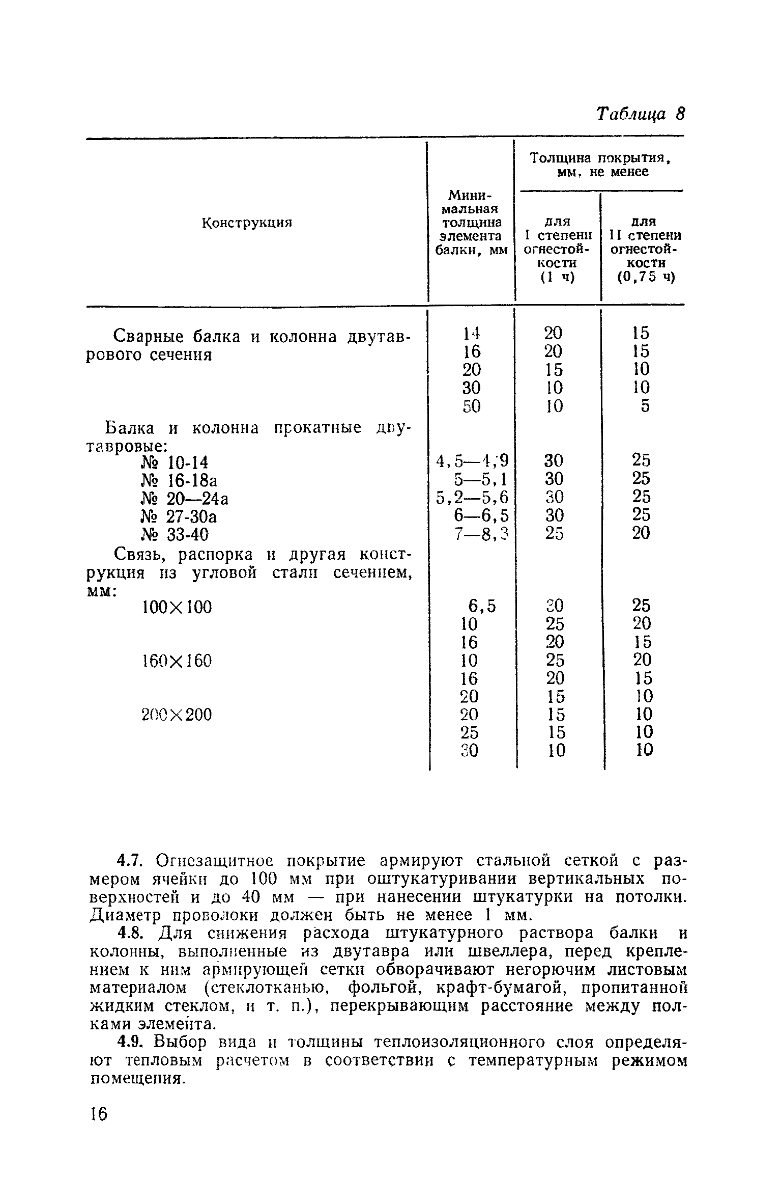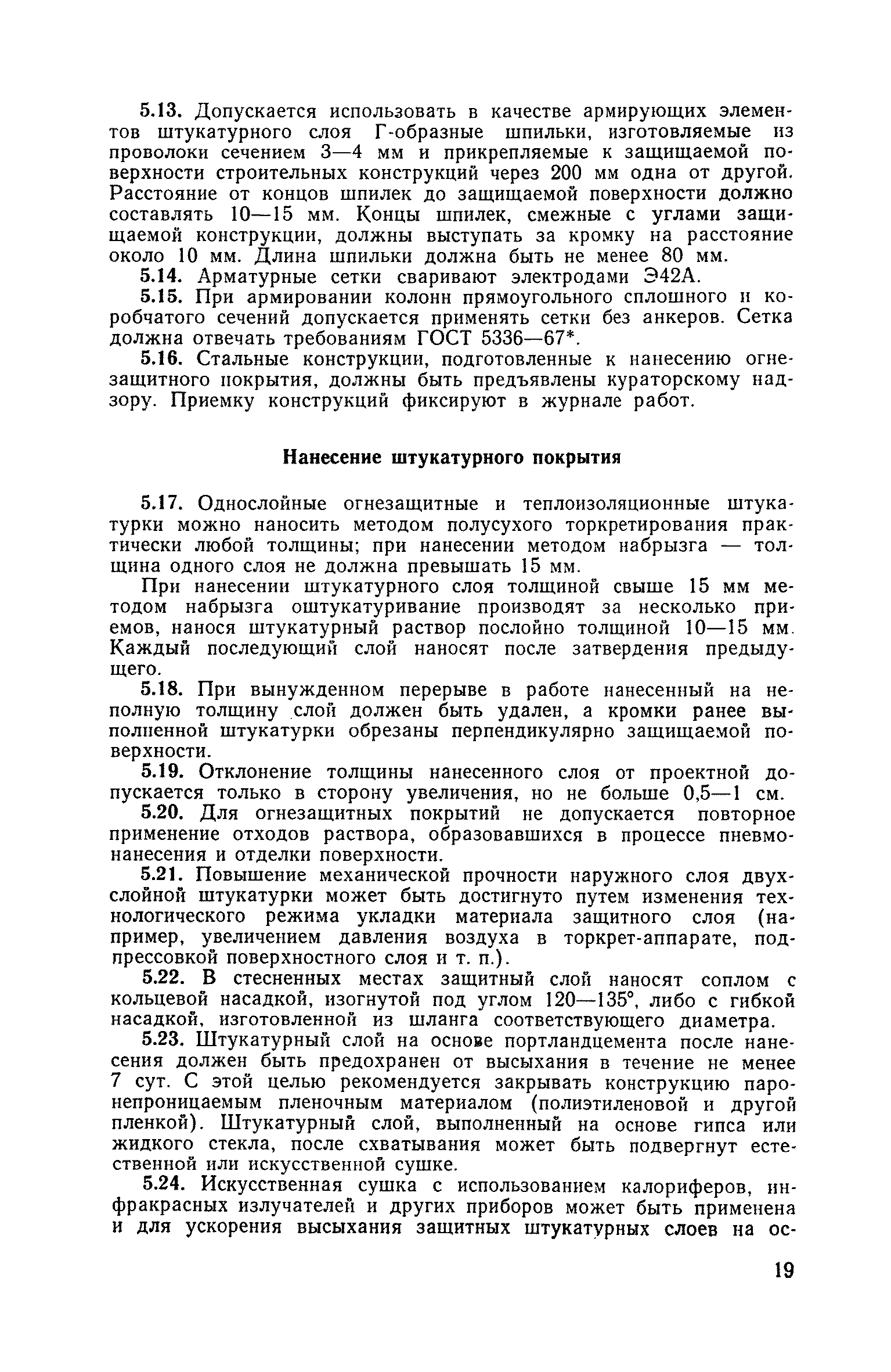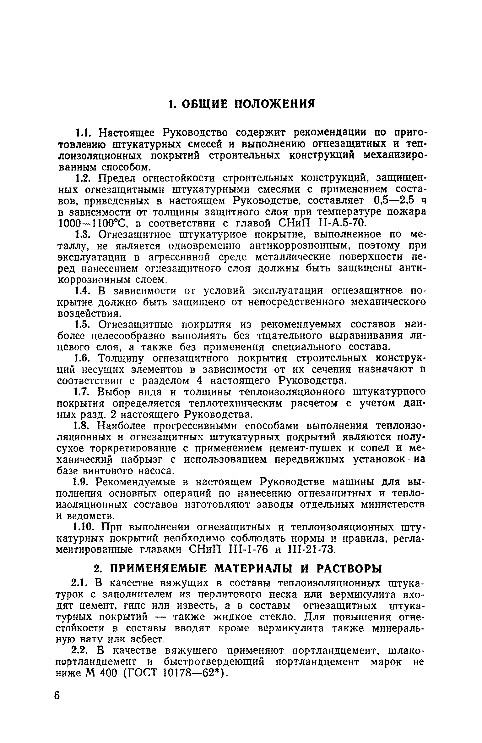 | Оглавление: | Предисловие 1. Общие положения . 2. Применяемые материалы и растворы 3. Приготовление и хранение штукатурных смесей 4. Конструктивные характеристики огнезащитных и теплоизоляционных штукатурок 5. Выполнение огнезащитных и теплоизоляционных штукатурных слоев 6. Полусухое торкретирование 7. Нанесение огнезащитных составов методом набрызга 8. Работа в условиях отрицательных температур 9. Контроль качества 10. Техника безопасности Приложение 1. Изготовление гранулированной минеральной ваты Приложение 2. Приготовление замедлителей схватывания из органического сырья Приложение 3. Плотность растворов солей-электролитов при температуре плюс 20 градусов Цельсия Приложение 4. Перечень машин, оборудования, механизированных и ручных инструментов, инвентаря и приспособлений для выполнения теплоизоляционных и огнезащитных штукатурок методом полусухого торкретирования Приложение 5. Перечень машин и оборудования для выполнения огнезащитных и теплоизоляционных штукатурок методом набрызга |