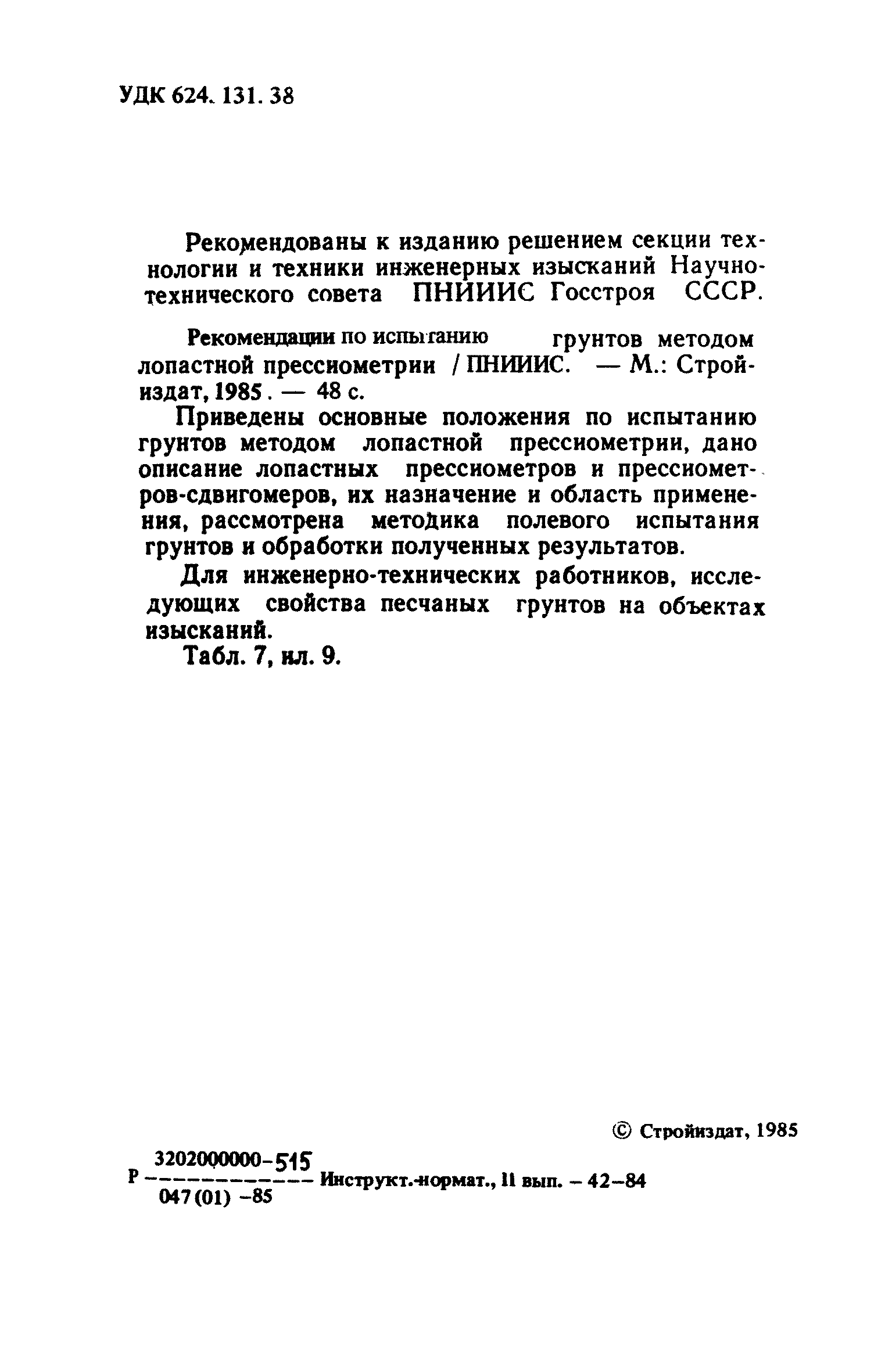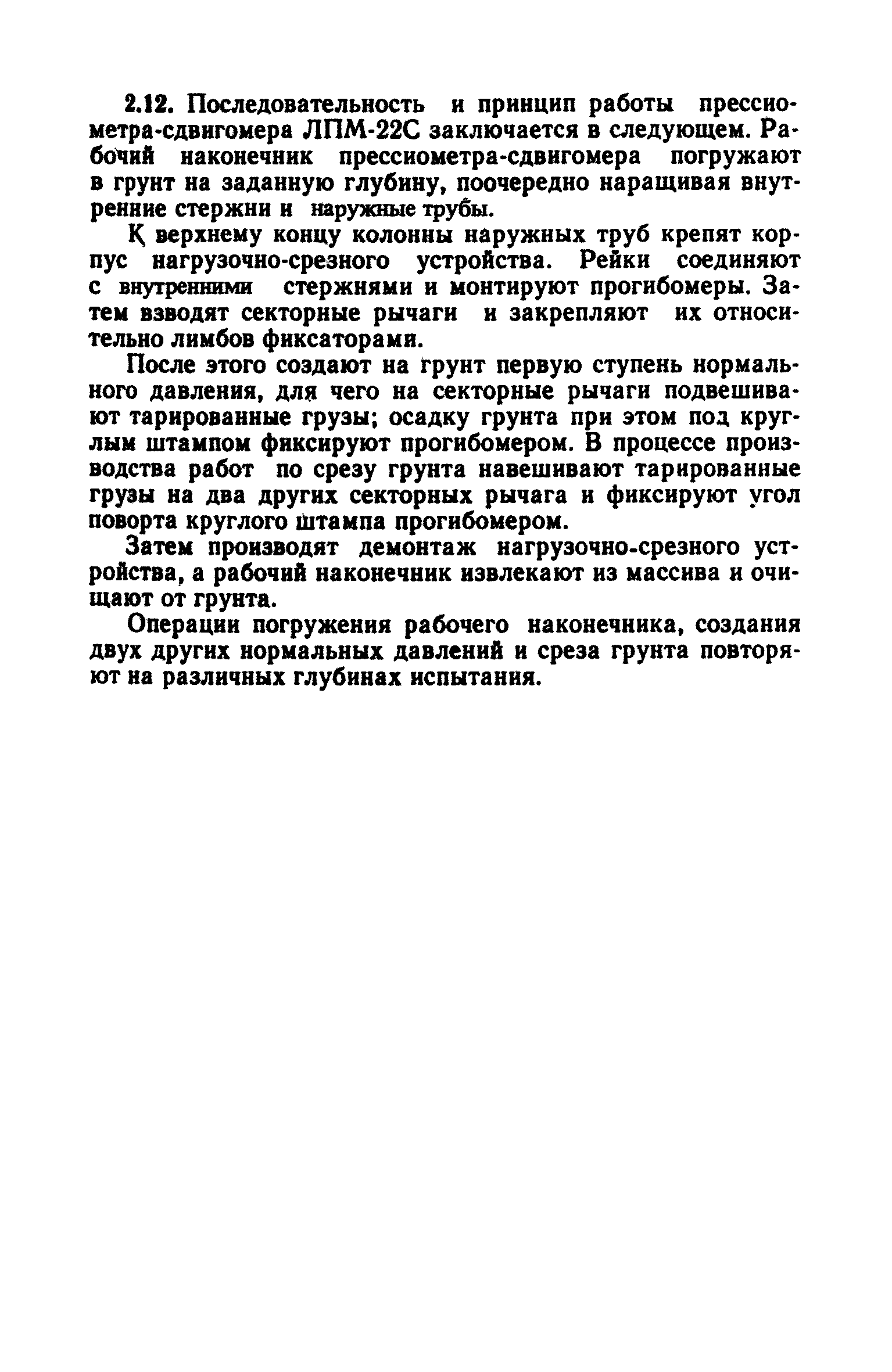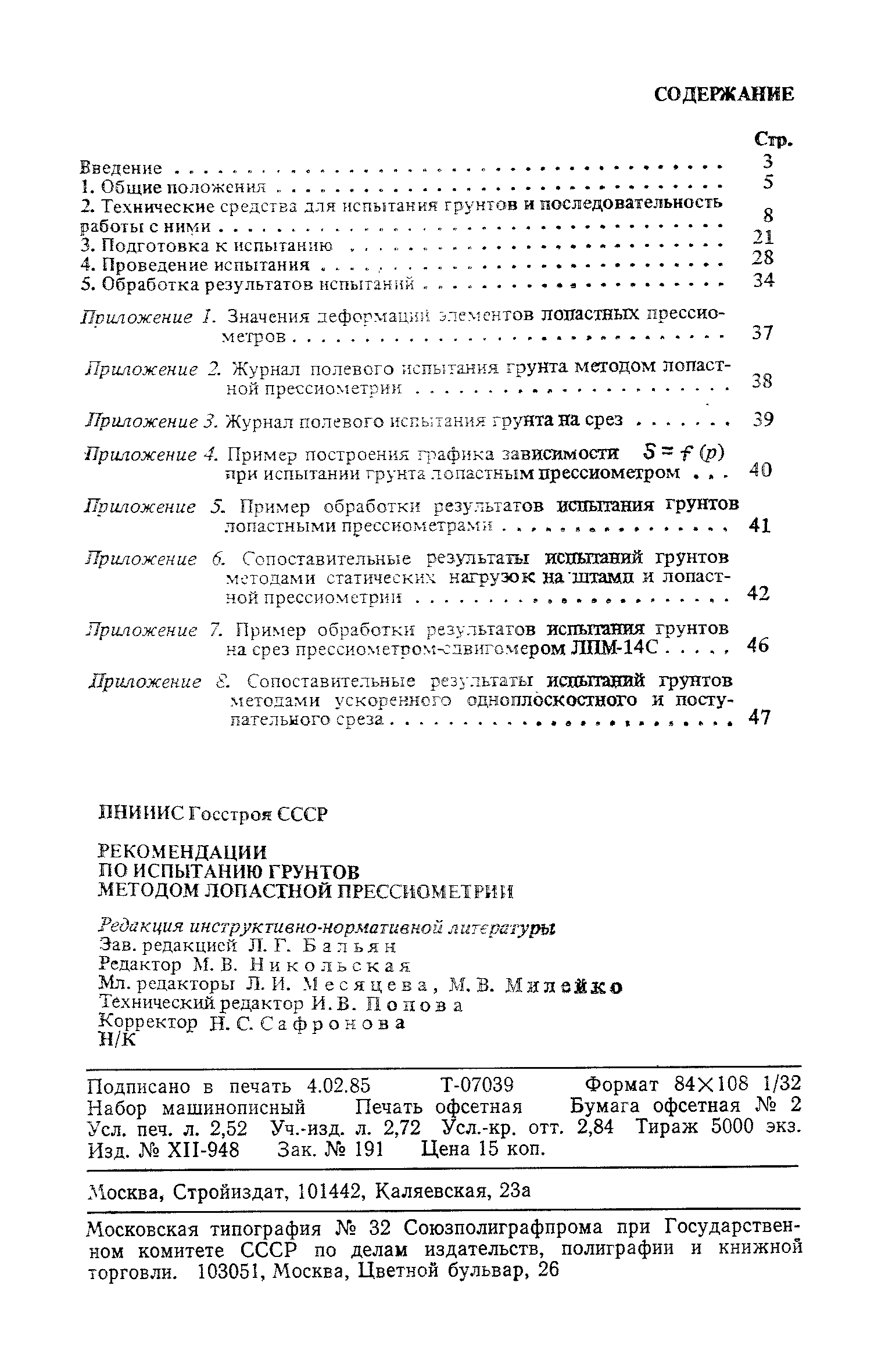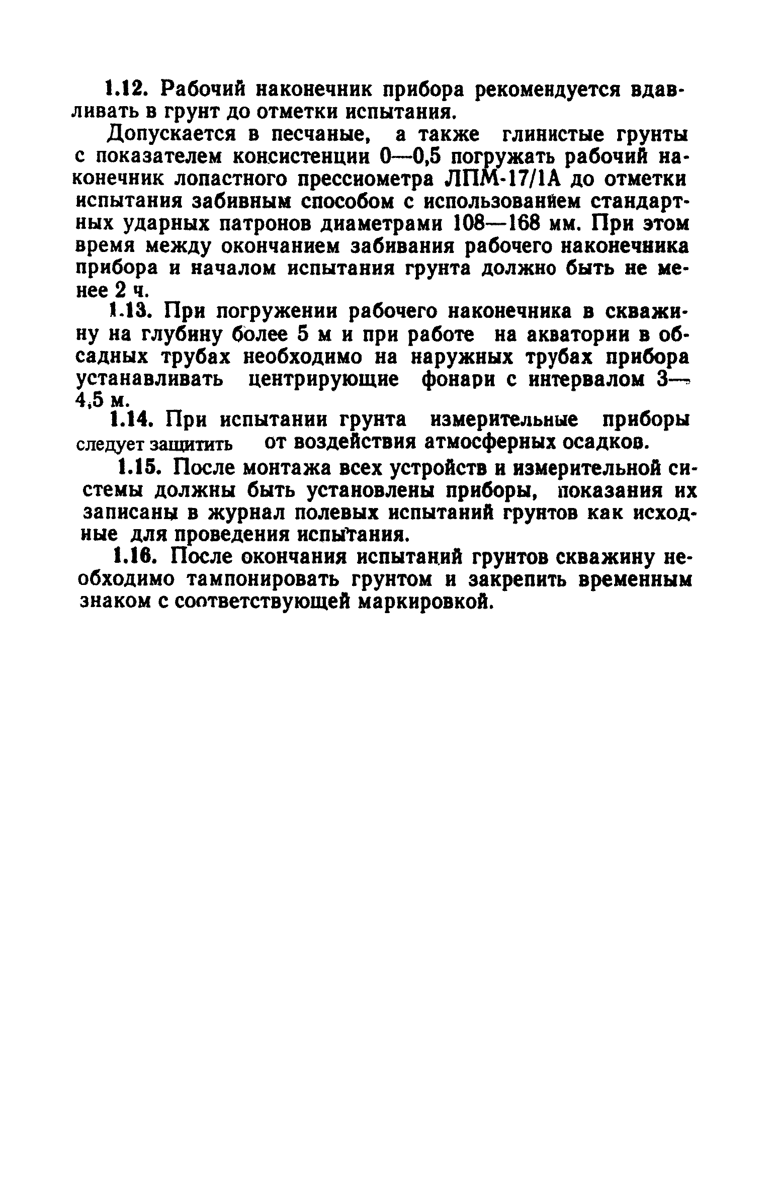 | Оглавление: | Введение 1. Общие положения 2. Технические средства для испытания грунтов и последовательность работы с ними 3. Подготовка к испытанию 4. Проведение испытания 5. Обработка результатов испытаний Приложение 1. Значения деформаций элементов лопастных прессиометров Приложение 2. Журнал полевого испытания грунта методом лопастной прессиометрии Приложение 3. Журнал полевого испытания грунта на срез Приложение 4. Пример построения графика зависимости при испытании грунта лопастным прессиометром Приложение 5. Пример обработки результатов испытания грунтов лопастными прессиометрами Приложение 6. Сопоставительные результаты испытаний грунтов методами статических нагрузок на штамп и лопастной прессиометрии Приложение 7. Пример обработки результатов испытания грунтов на срез прессиометром-сдвигомером ЛПМ-14С Приложение 8. Сопоставительные результаты испытаний грунтов методами ускоренного одноплоскостного и поступательного среза |