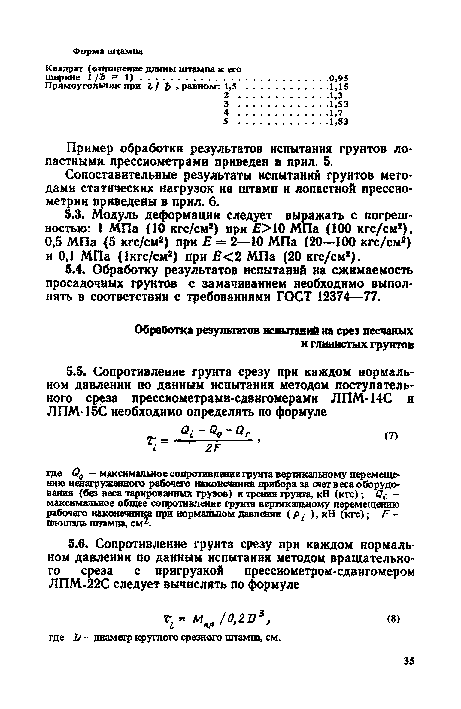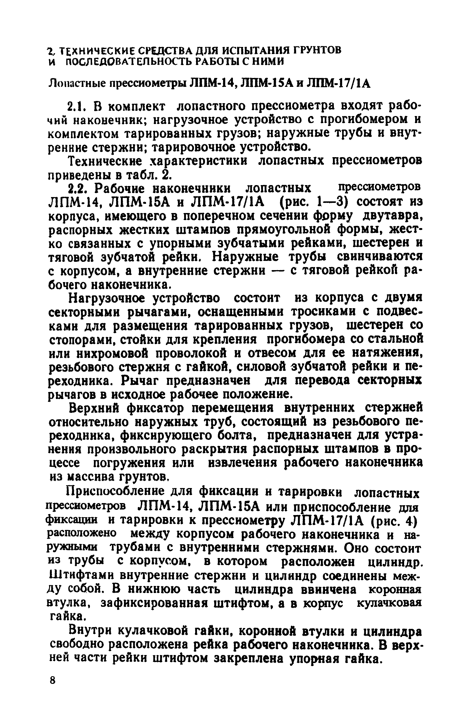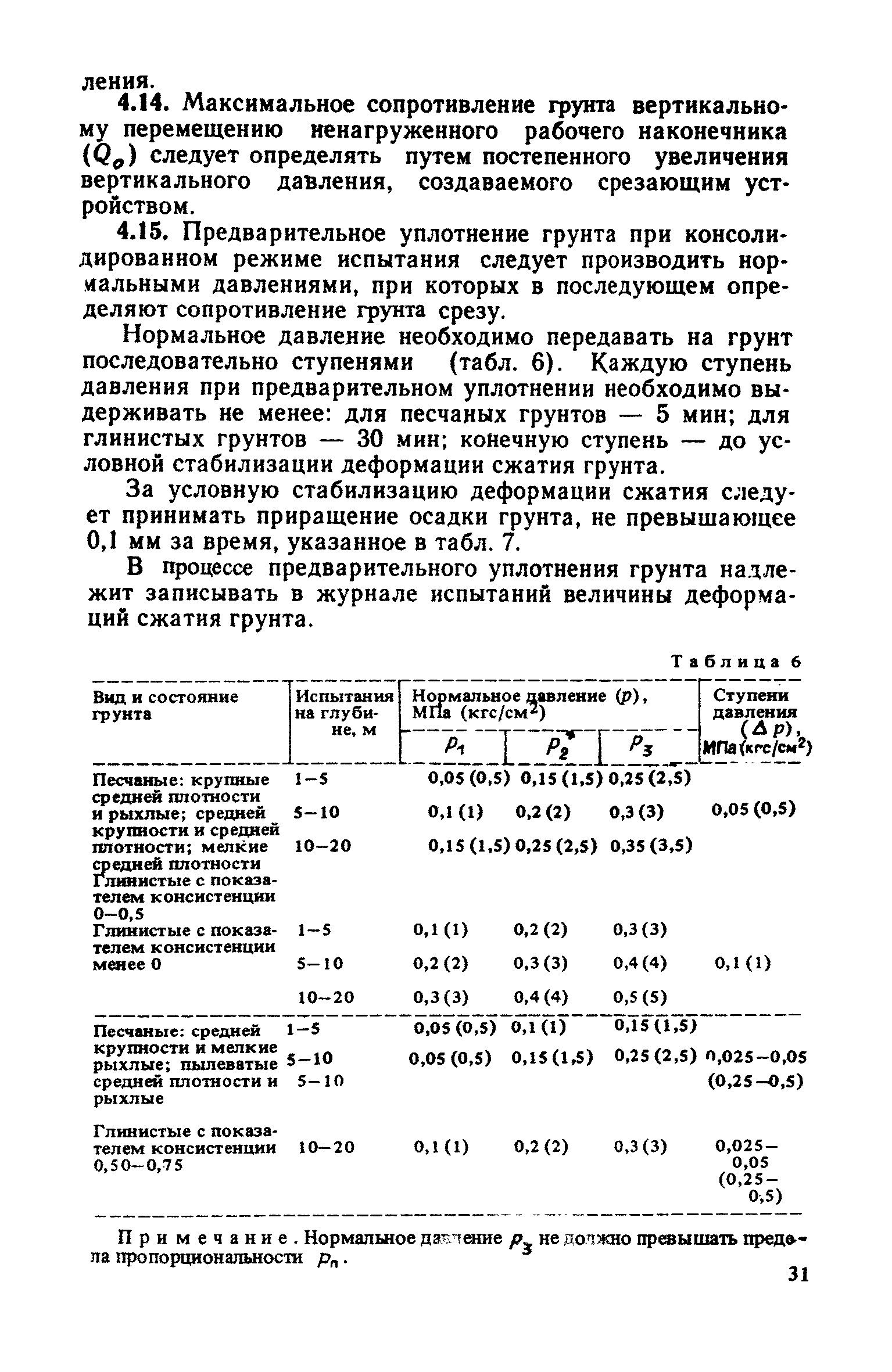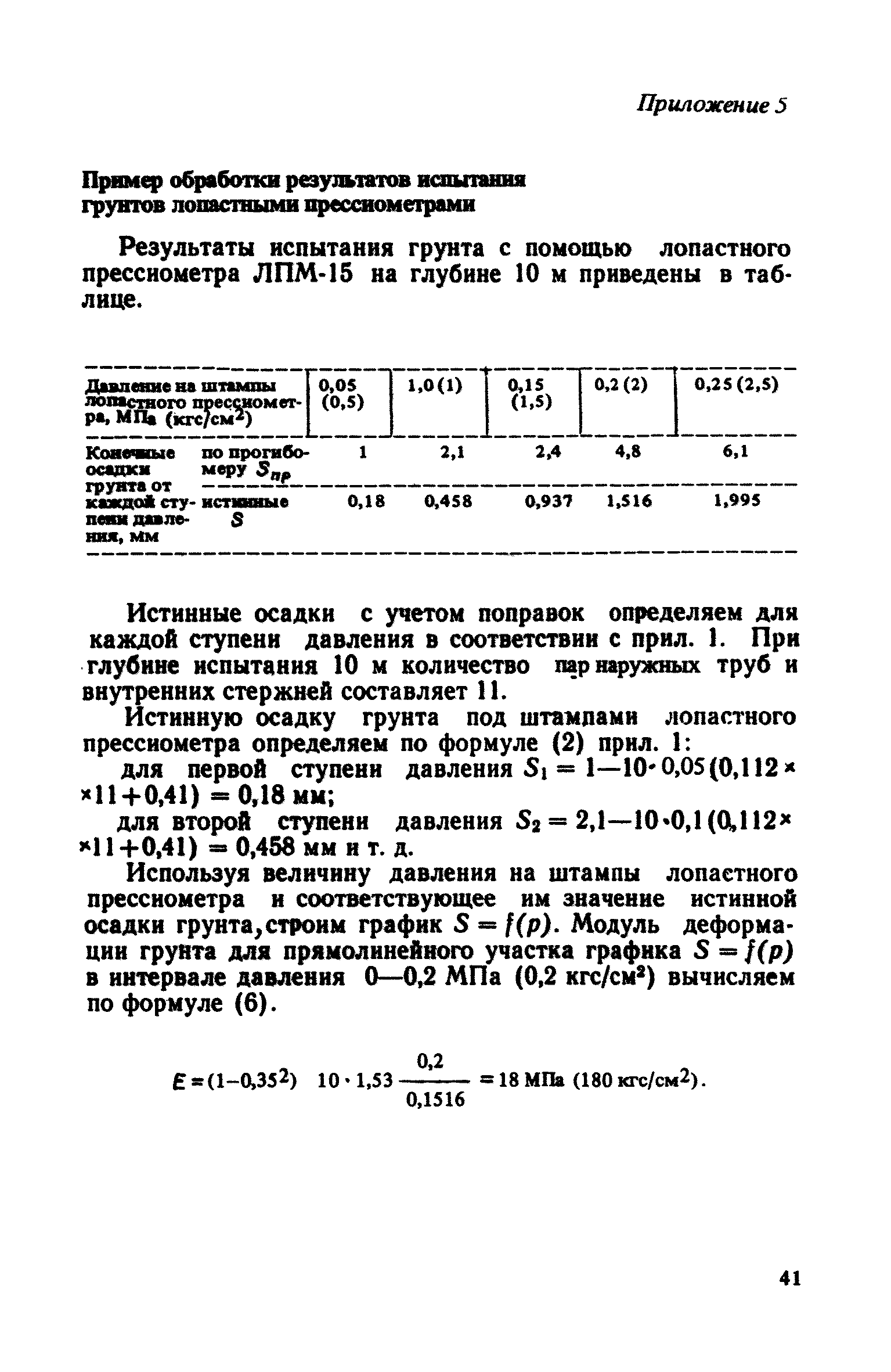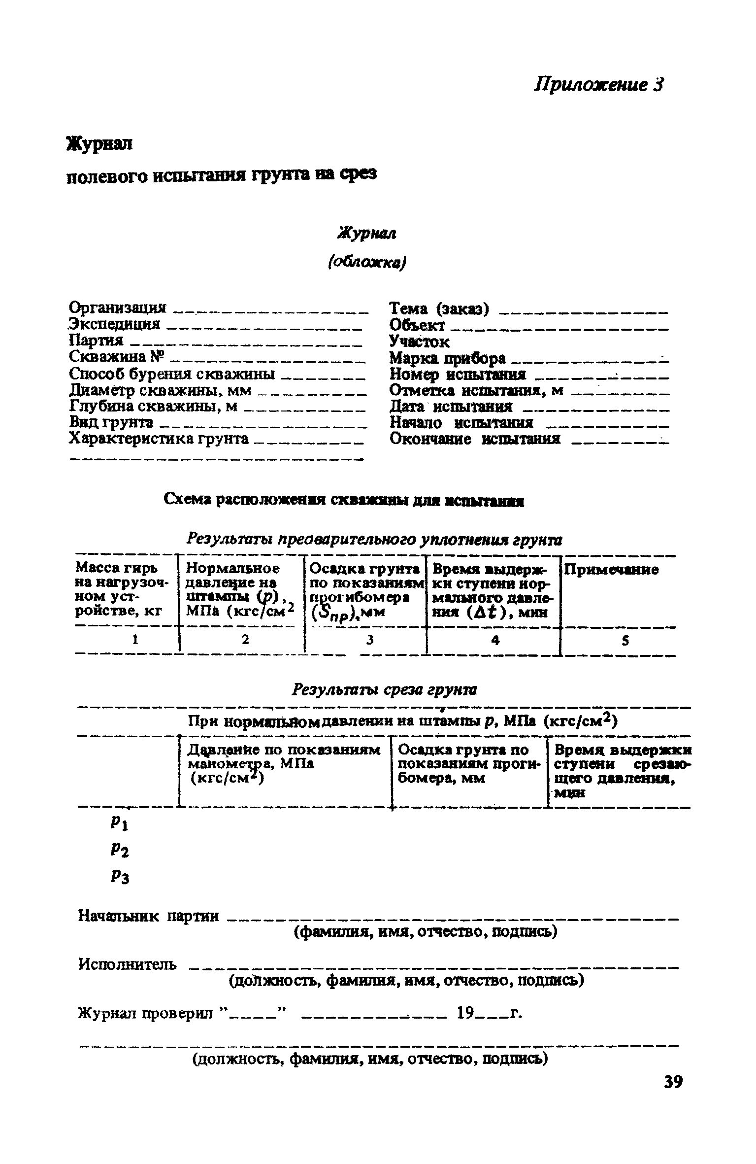 | Оглавление: | Введение 1. Общие положения 2. Технические средства для испытания грунтов и последовательность работы с ними 3. Подготовка к испытанию 4. Проведение испытания 5. Обработка результатов испытаний Приложение 1. Значения деформаций элементов лопастных прессиометров Приложение 2. Журнал полевого испытания грунта методом лопастной прессиометрии Приложение 3. Журнал полевого испытания грунта на срез Приложение 4. Пример построения графика зависимости при испытании грунта лопастным прессиометром Приложение 5. Пример обработки результатов испытания грунтов лопастными прессиометрами Приложение 6. Сопоставительные результаты испытаний грунтов методами статических нагрузок на штамп и лопастной прессиометрии Приложение 7. Пример обработки результатов испытания грунтов на срез прессиометром-сдвигомером ЛПМ-14С Приложение 8. Сопоставительные результаты испытаний грунтов методами ускоренного одноплоскостного и поступательного среза |