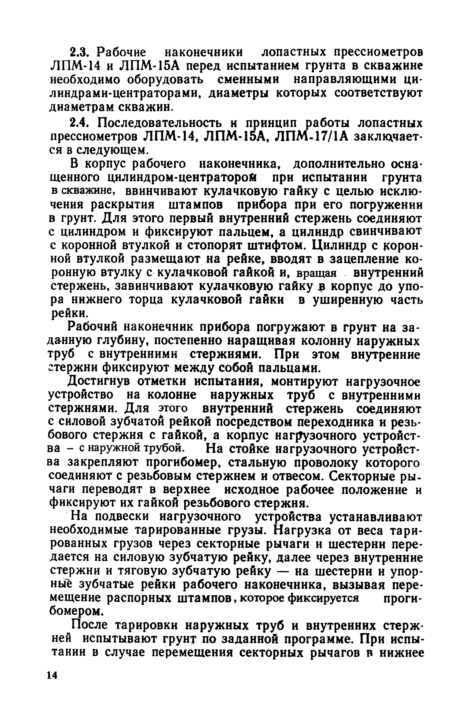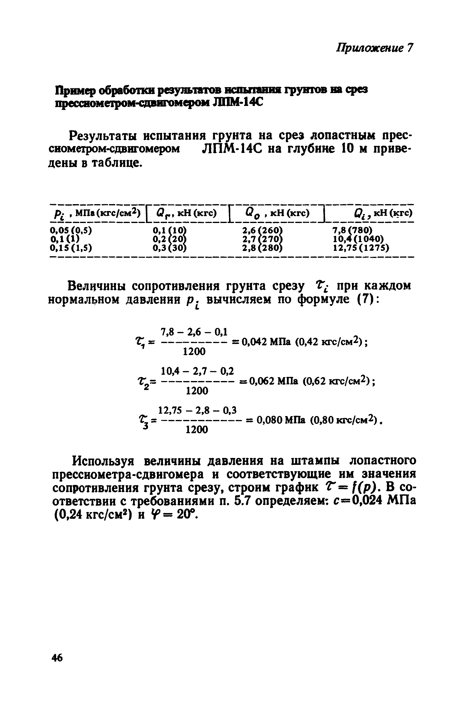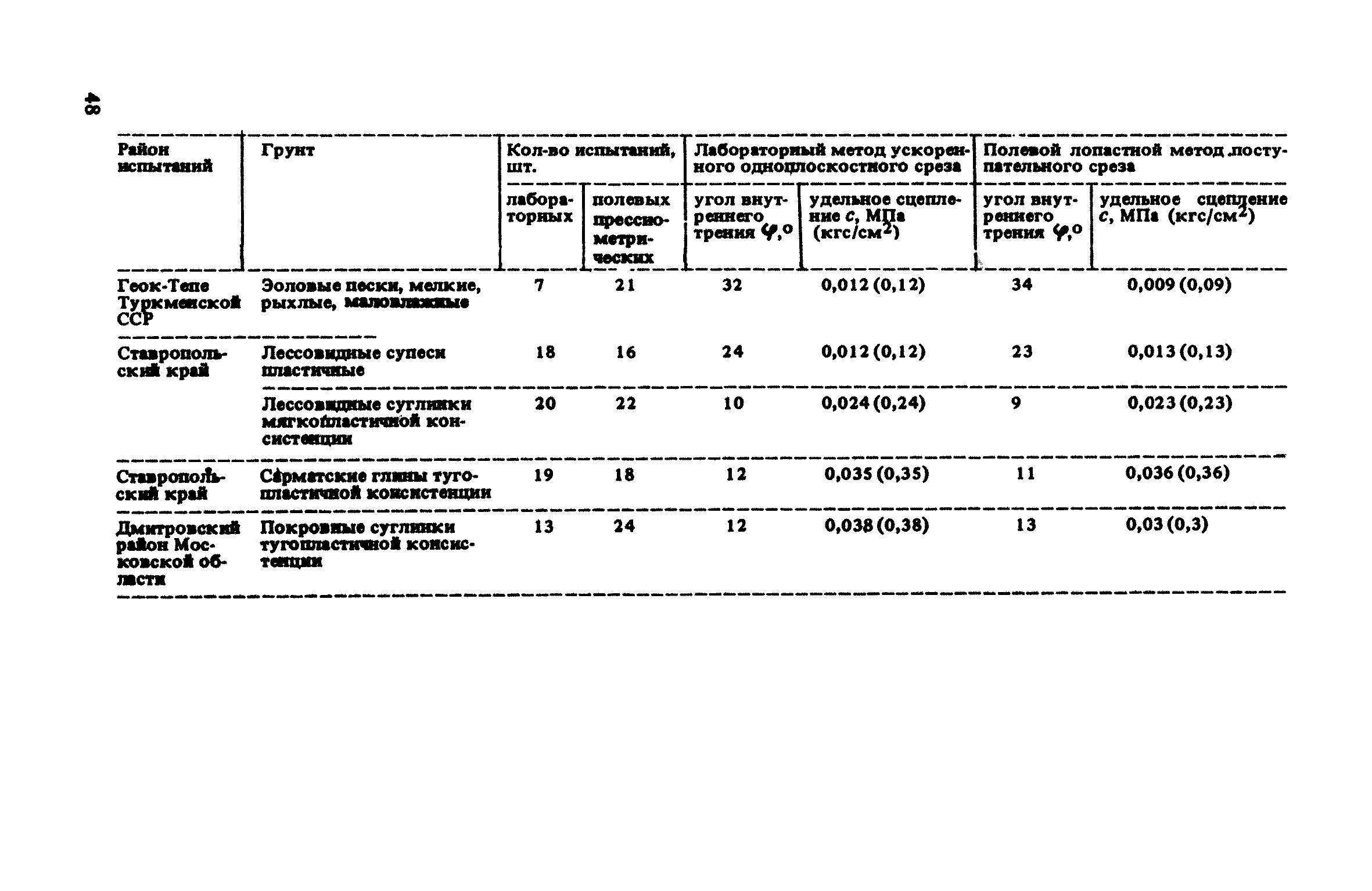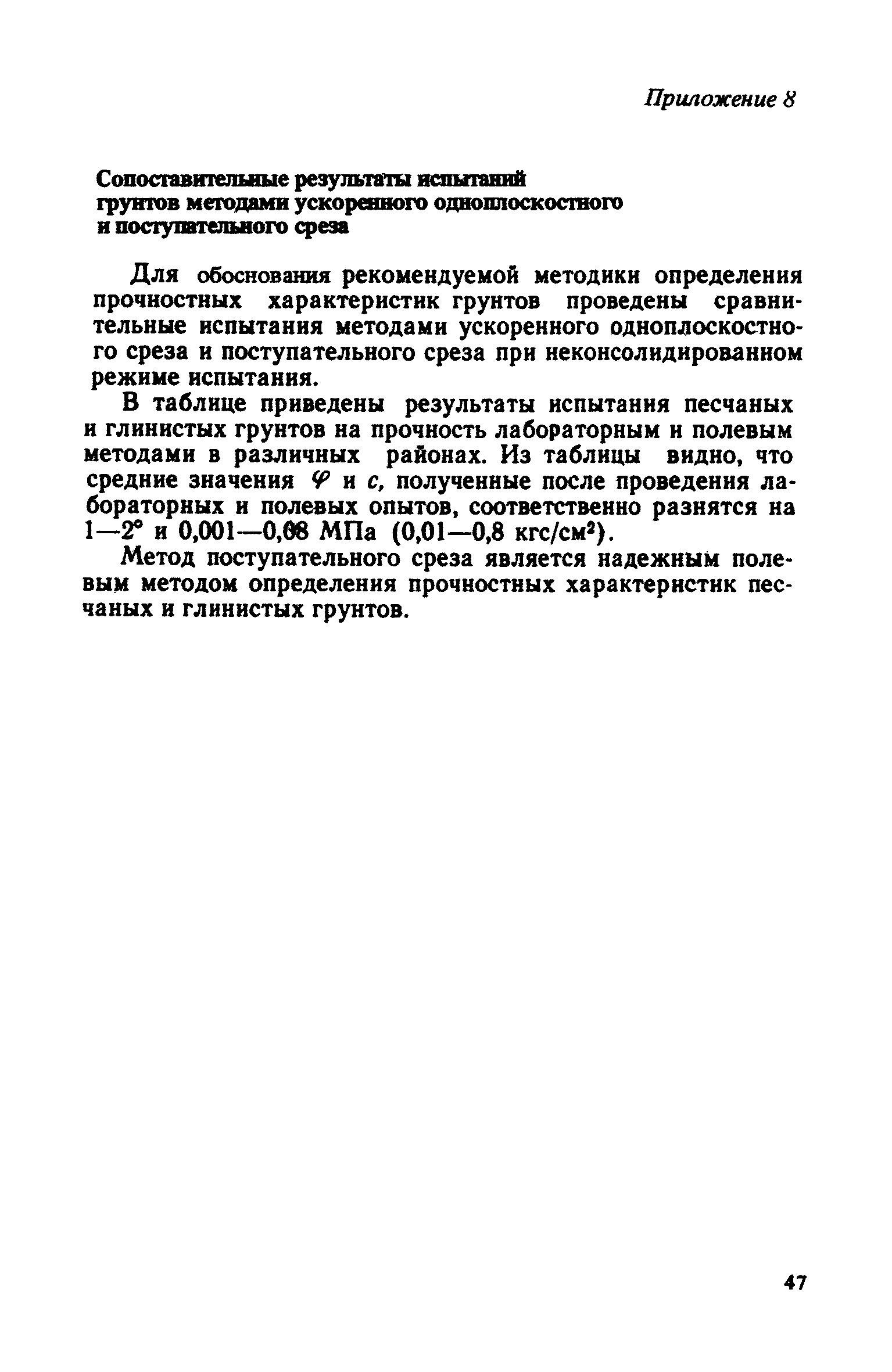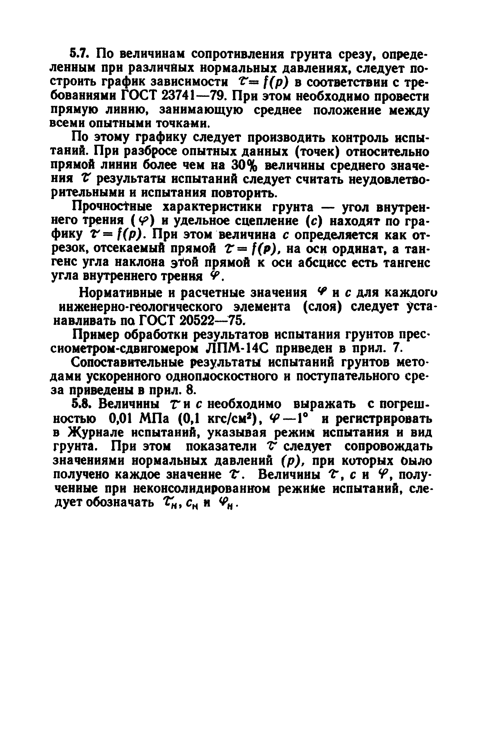 | Оглавление: | Введение 1. Общие положения 2. Технические средства для испытания грунтов и последовательность работы с ними 3. Подготовка к испытанию 4. Проведение испытания 5. Обработка результатов испытаний Приложение 1. Значения деформаций элементов лопастных прессиометров Приложение 2. Журнал полевого испытания грунта методом лопастной прессиометрии Приложение 3. Журнал полевого испытания грунта на срез Приложение 4. Пример построения графика зависимости при испытании грунта лопастным прессиометром Приложение 5. Пример обработки результатов испытания грунтов лопастными прессиометрами Приложение 6. Сопоставительные результаты испытаний грунтов методами статических нагрузок на штамп и лопастной прессиометрии Приложение 7. Пример обработки результатов испытания грунтов на срез прессиометром-сдвигомером ЛПМ-14С Приложение 8. Сопоставительные результаты испытаний грунтов методами ускоренного одноплоскостного и поступательного среза |