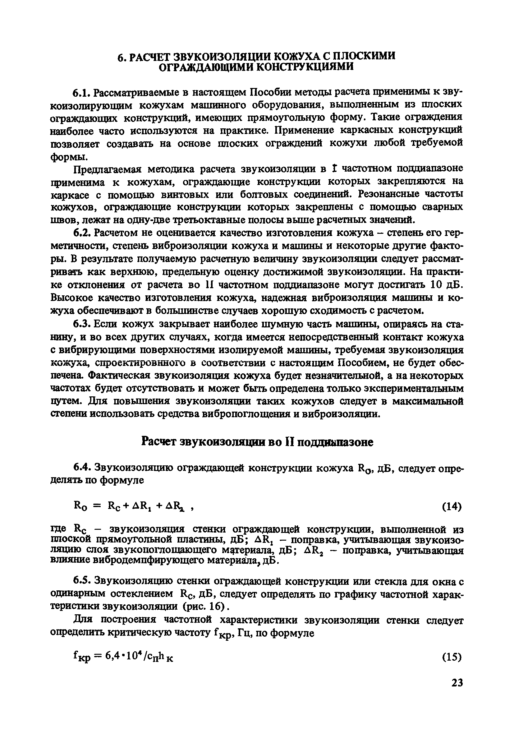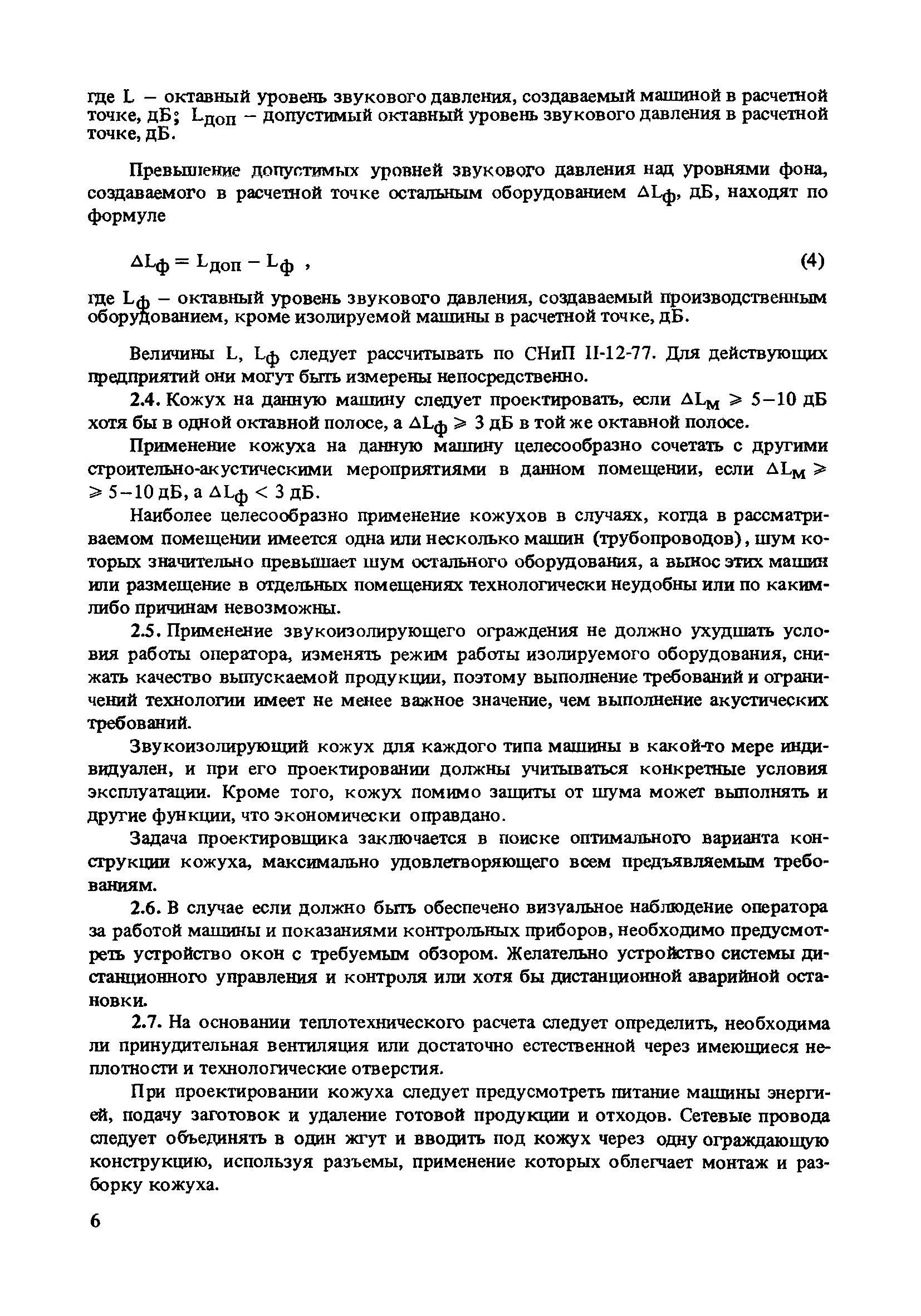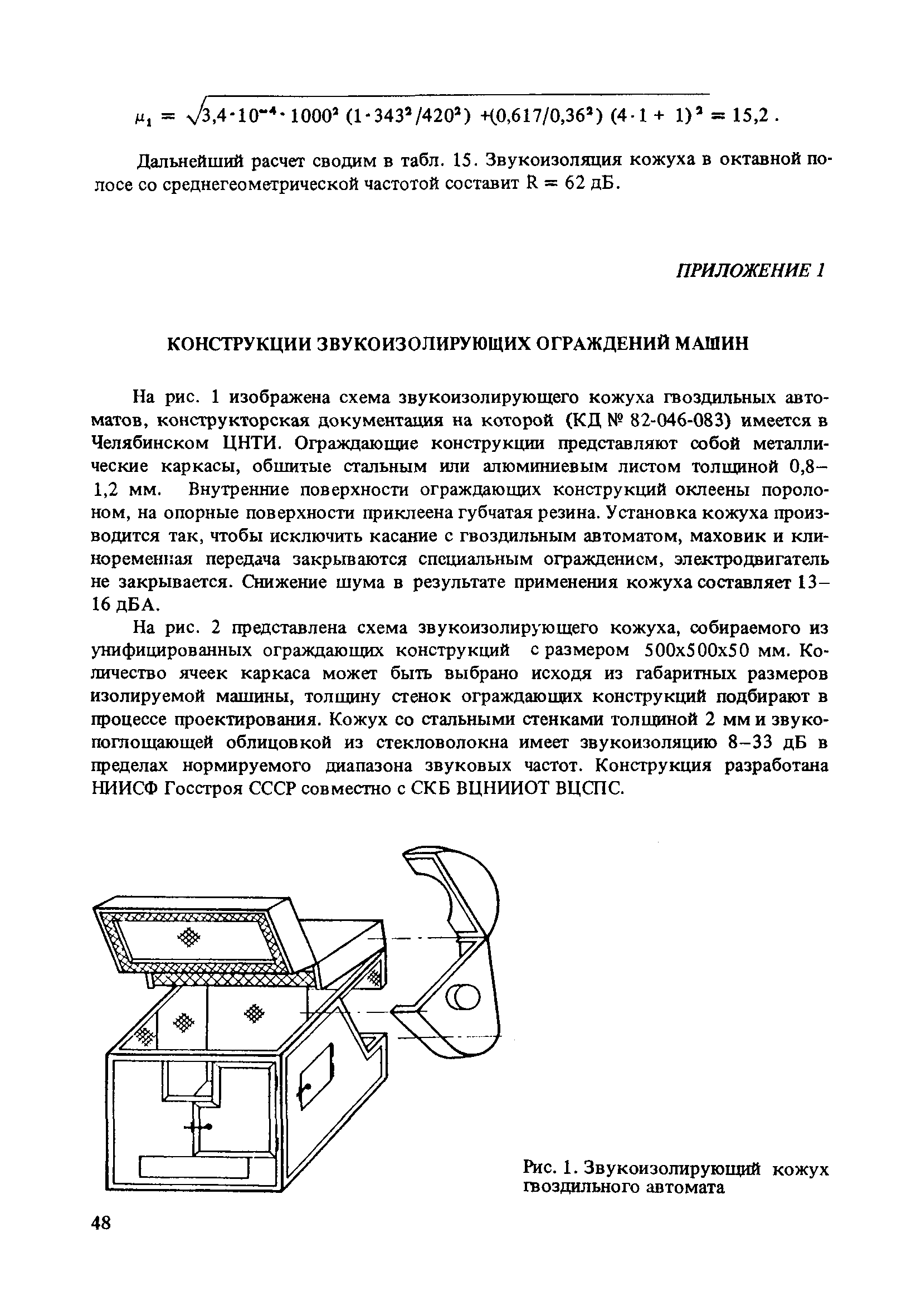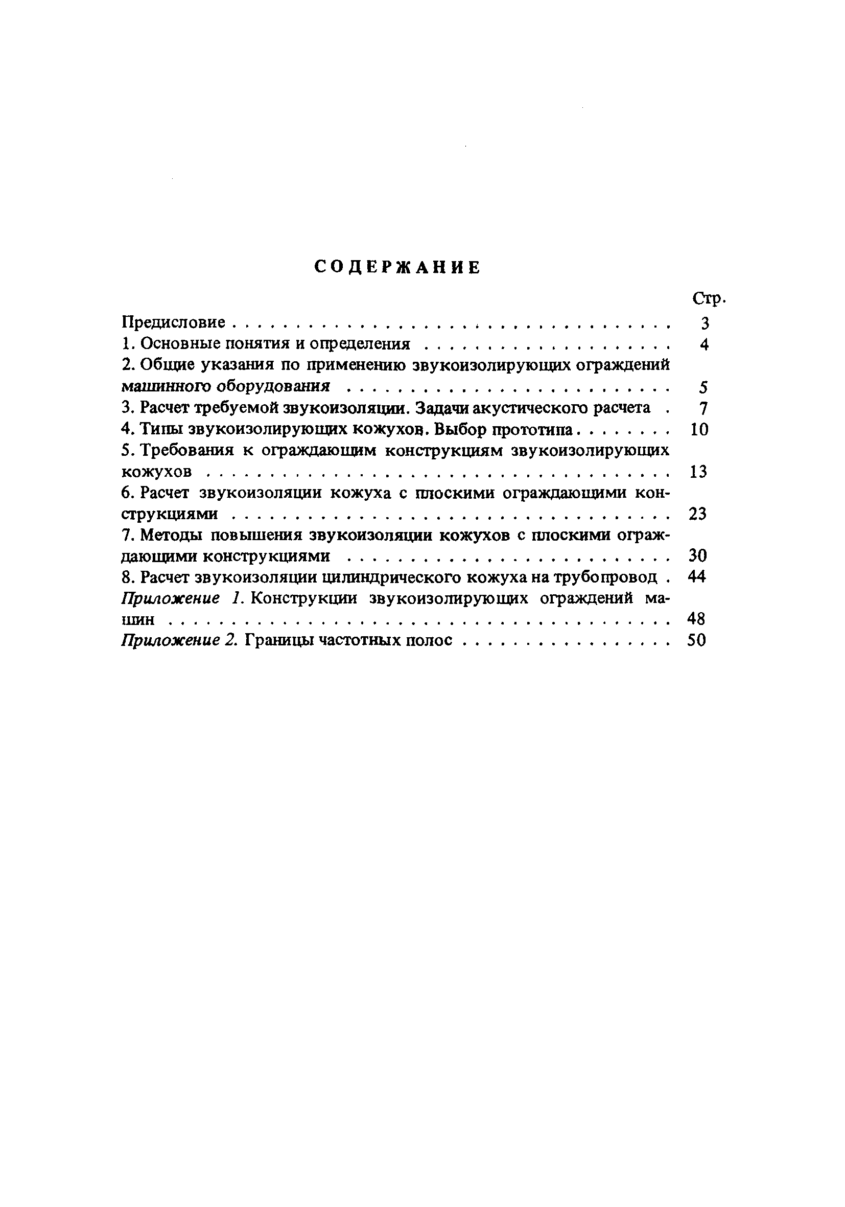 | Оглавление: | Предисловие 1. Основные понятия и определения 2. Общие указания по применению звукоизолирующих ограждений машинного оборудования 3. Расчет требуемой звукоизоляции. Задачи акустического расчета 4. Типы звукоизолирующих кожухов. Выбор прототипа 5. Требования к ограждающим конструкциям звукоизолирующих кожухов 6. Расчет звукоизоляции кожуха с плоскими ограждающими конструкциями 7. Методы повышения звукоизоляции кожухов с плоскими ограждающими конструкциями 8. Расчет звукоизоляции цилиндрического кожуха на трубопровод Приложение 1. Конструкции звукоизолирующих ограждений машин Приложение 2. Границы частотных полос |