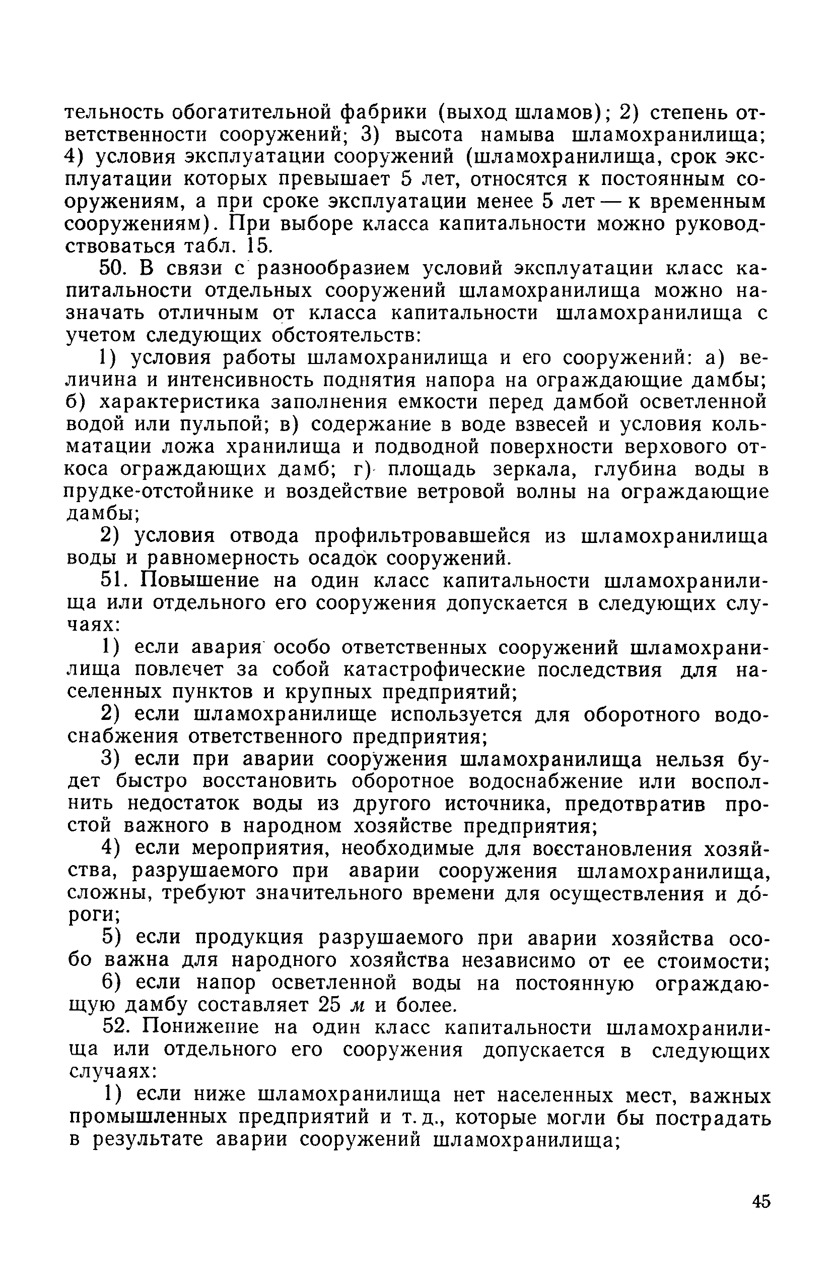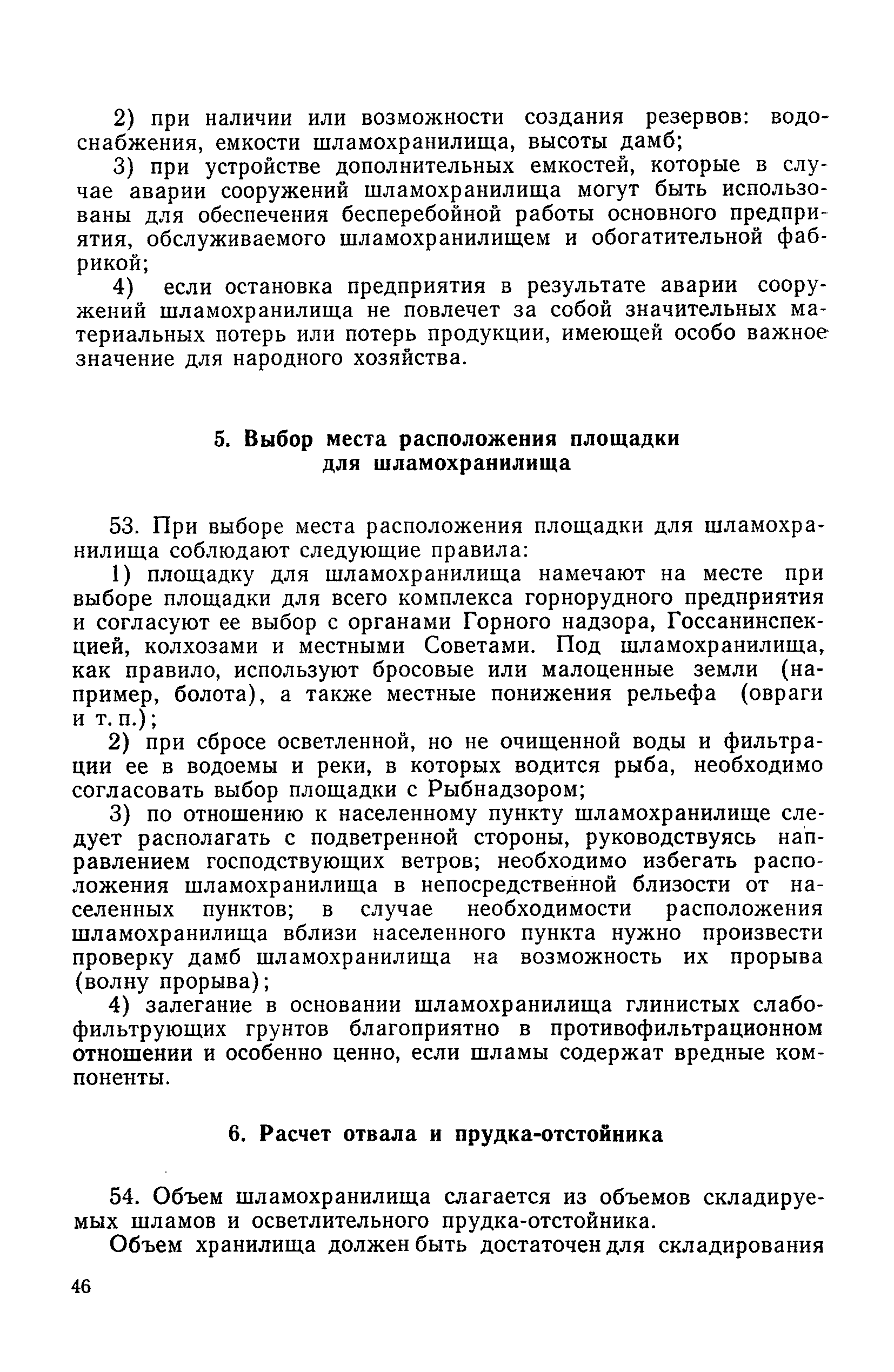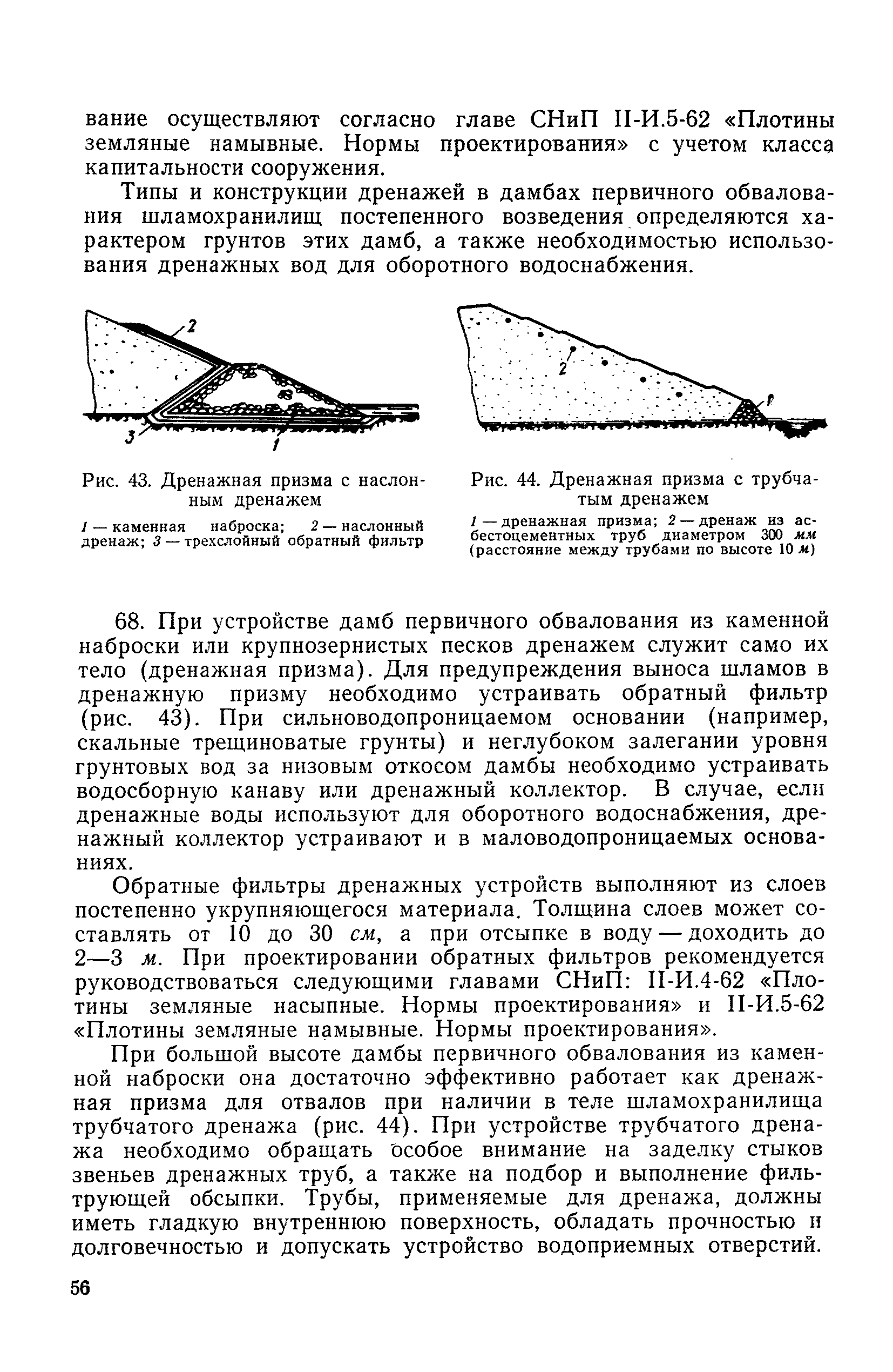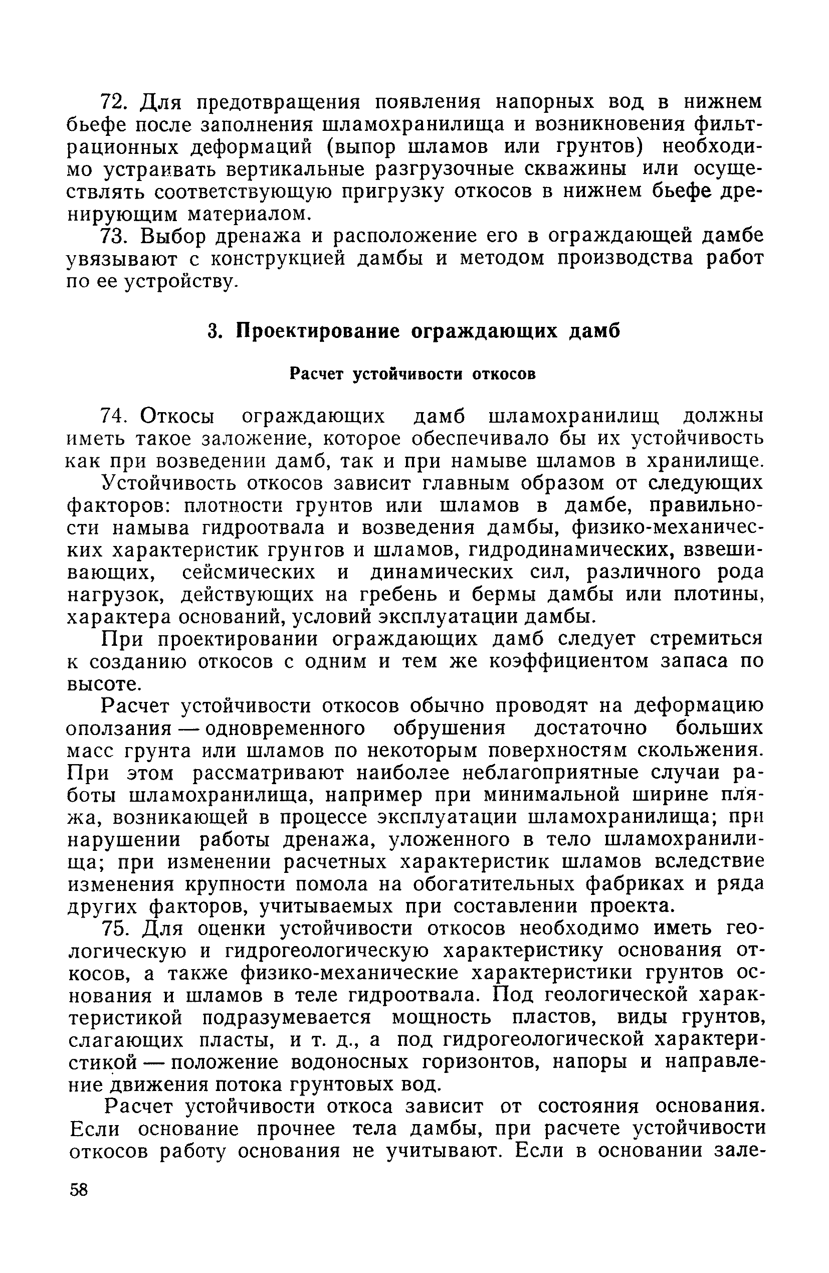 | Оглавление: | Предисловие Глава 1. Общие положения 1. Область применения 2. Основная терминология 3. Классификация шламохранилищ 4. Требования к ограждающим дамбам Глава II. Топографические, гидрологические, инженерно-геологические и гидрогеологические изыскания и исследования 1. Топографические и гидрологические изыскания 2. Инженерно-геологические и гидрогеологические изыскания 3. Требования к изысканиям для проектирования менее ответственных шламохранилищ 4. Оценка грунтов оснований чаши шламохранилища и его сооружений Глава III. Проектирование шламохранилищ 1. Общие вопросы 2. Выбор расчетных физико-механических характеристик шламов 3. Выбор расчетных физико-механических характеристик мерзлых и оттаявших шламов 4. Выбор класса капитальности шламохранилища 5. Выбор места расположения площадки для шламохранилища 6. Расчет отвала и прудка-отстойника 7. Выбор способа замыва шламохранилища 8. Защита территории прилегающей к шламохранилищу, от подтопления и заболачивания Глава IV. Проектирование и возведение гидротехнических сооружений шламохранилищ 1. Выбор типа ограждающих дамб 2. Дренажные устройства 3. Проектирование ограждающих дамб 4. Возведение ограждающих дамб первичного обвалования 5. Оборотное водоснабжение и сброс осветленной воды Глава V. Эксплуатация шламохранилищ 1. Организация эксплуатации шламохранилища 2. Возведение ограждающих дамб вторичного обвалования 3. Организация подачи пульпы в шламохранилище 4. Раскладка шламов в хранилище 5. Замыв шламохранилища в зимних условиях 6. Контрольные наблюдения при эксплуатации шламохранилищ 7. Указания по текущему ремонту сооружений при эксплуатации шламохранилищ Приложение 1. Ориентировочный расход сточных вод на 1 т перерабатываемой руды Приложение 2. Характеристика стока обогатительных фабрик цветной металлургии Приложение 3. Таблица для определения коэффициента устойчивости К откоса заложением m=2 при обрушении призмы в сторону от ядра Приложение 4. Таблица для определения коэффициента устойчивости К откоса заложением m=3 при обрушении призмы в сторону от ядра Приложение 5. Таблица для определения коэффициента устойчивости К откоса заложением m=4 при обрушении призмы в сторону от ядра Приложение 6. Таблица для определения коэффициента устойчивости К откоса заложением m=5 при обрушении призмы в сторону от ядра Приложение 7. График для определения угла наклона альфа внутренней грани упорной призмы при заложении откосов m = 2 - 5 |