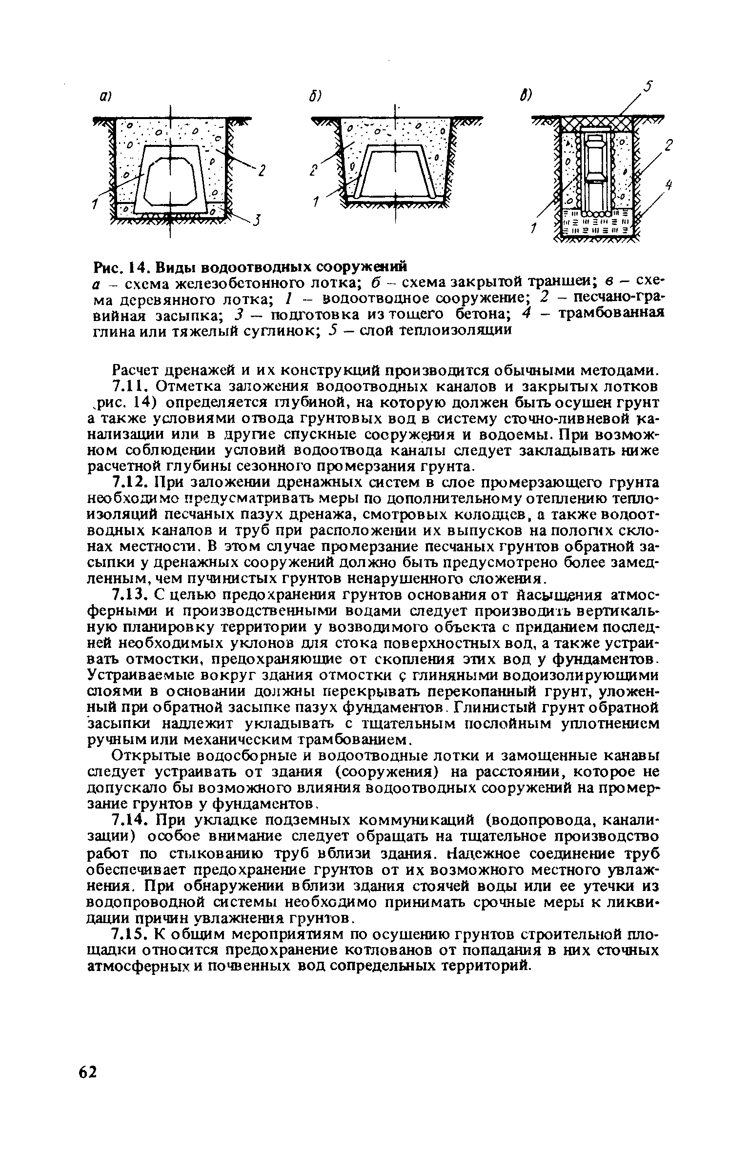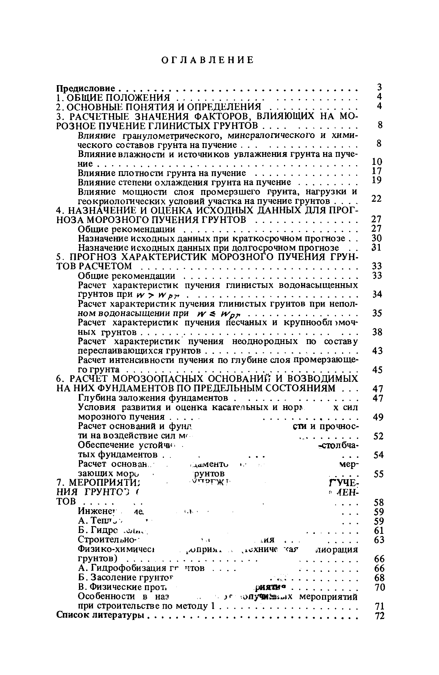 | Оглавление: | Предисловие 1. Общие положения 2. Основные понятия и определения 3. Расчетные значения факторов, влияющих на морозное пучение глинистых грунтов Влияние гранулометрического, минералогического и химического составов грунта на пучение Влияние влажности и источников увлажнения грунта на пучение Влияние плотности грунта на пучение Влияние степени охлаждения грунта на пучение Влияние мощности слоя промерзшего грунта, нагрузки и геокриологических условий участка на пучение грунтов 4. Назначение и оценка исходных данных для прогноза морозного пучения грунтов Общие рекомендации Назначение исходных данных при краткосрочном прогнозе Назначение исходных данных при долгосрочном прогнозе 5. Прогноз характеристик морозного пучения грунтов расчетом Общие рекомендации Расчет характеристик и пучения глинистых водонасыщенных грунтов Расчет характеристик пучения глинистых грунтов при неполном водонасыщении Расчет характеристик пучения песчаных и крупнообломочных грунтов Расчет характеристик пучения неоднородных по составу переслаивающихся грунтов Расчет интенсивности пучения по глубине слоя промерзающего грунта 6. Расчет морозоопасных основании и возводимых на них фундаментов по предельным состояниям Глубина заложения фундаментов Условия развития и оценка касательных и нормальных сил морозного пучения Расчет оснований и фундаментов по устойчивости и прочности на воздействие сил морозного пучения Обеспечение устойчивости малонагруженных свайностолбчатых фундаментов Расчет оснований и фундаментов по деформациям промерзающих морозоопасных грунтов 7. Мероприятия по предупреждению морозного пучения грунтов оснований и выпучивания фундаментов Инженерно-мелиоративные мероприятия А. Тепломелиорация Б. Гидромелиорация Строительно-констуктивные мероприятия Физико-химические мероприятия (техническая мелиорация грунтов) А. Гидрофобизация грунтов Б. Засоление грунтов В. Физические противопучинные мероприятия Особенности в назначении противопучинных мероприятий при строительстве по методу I Список литературы |
