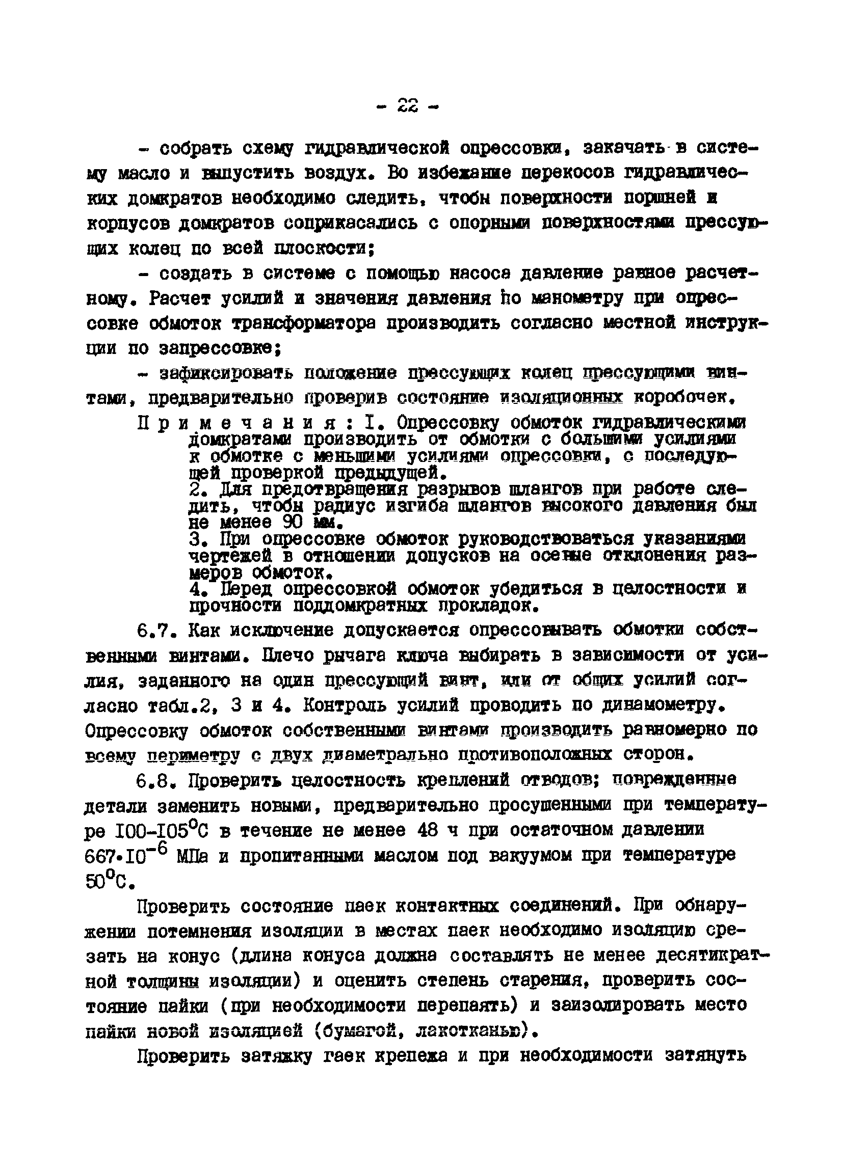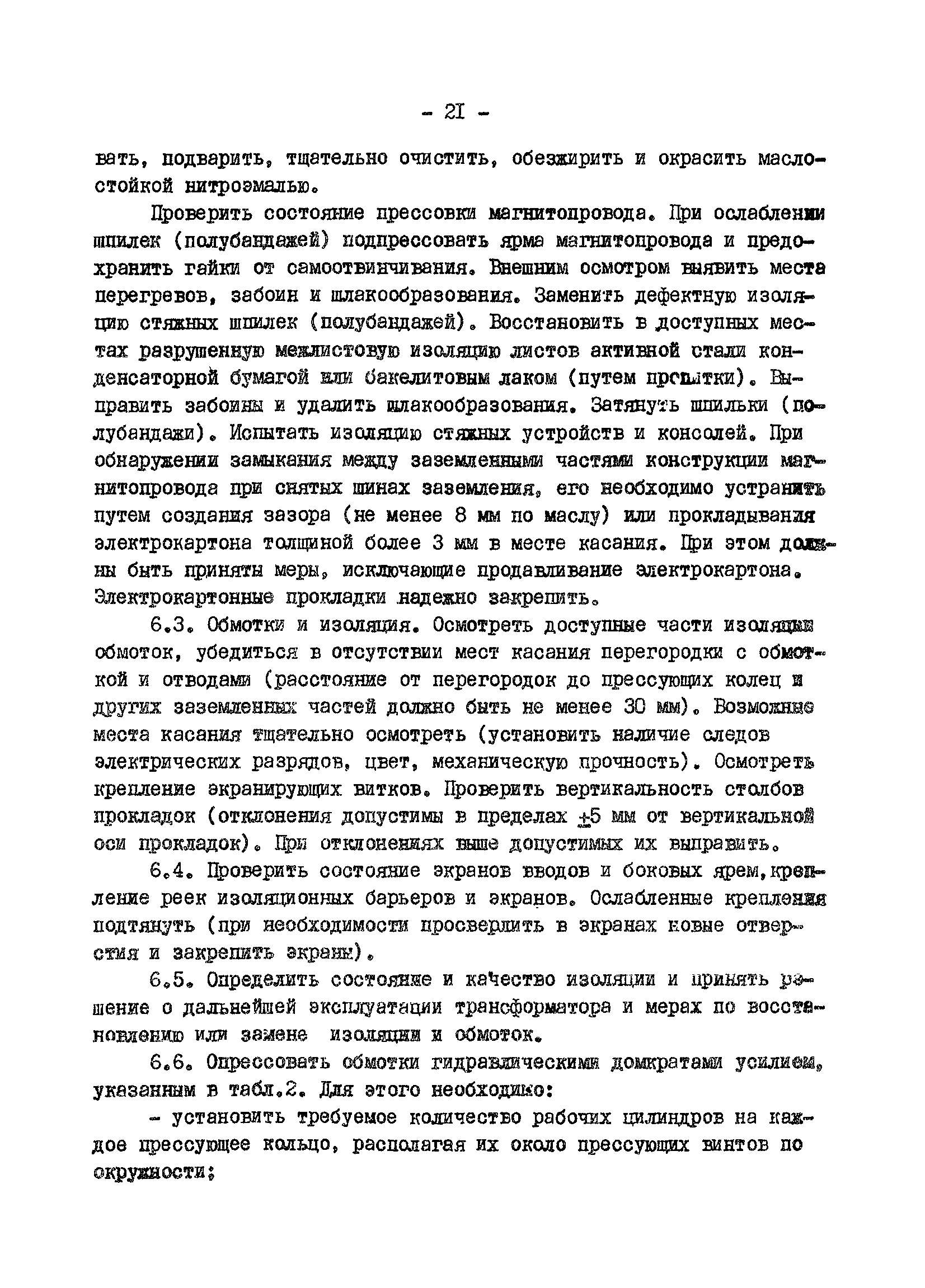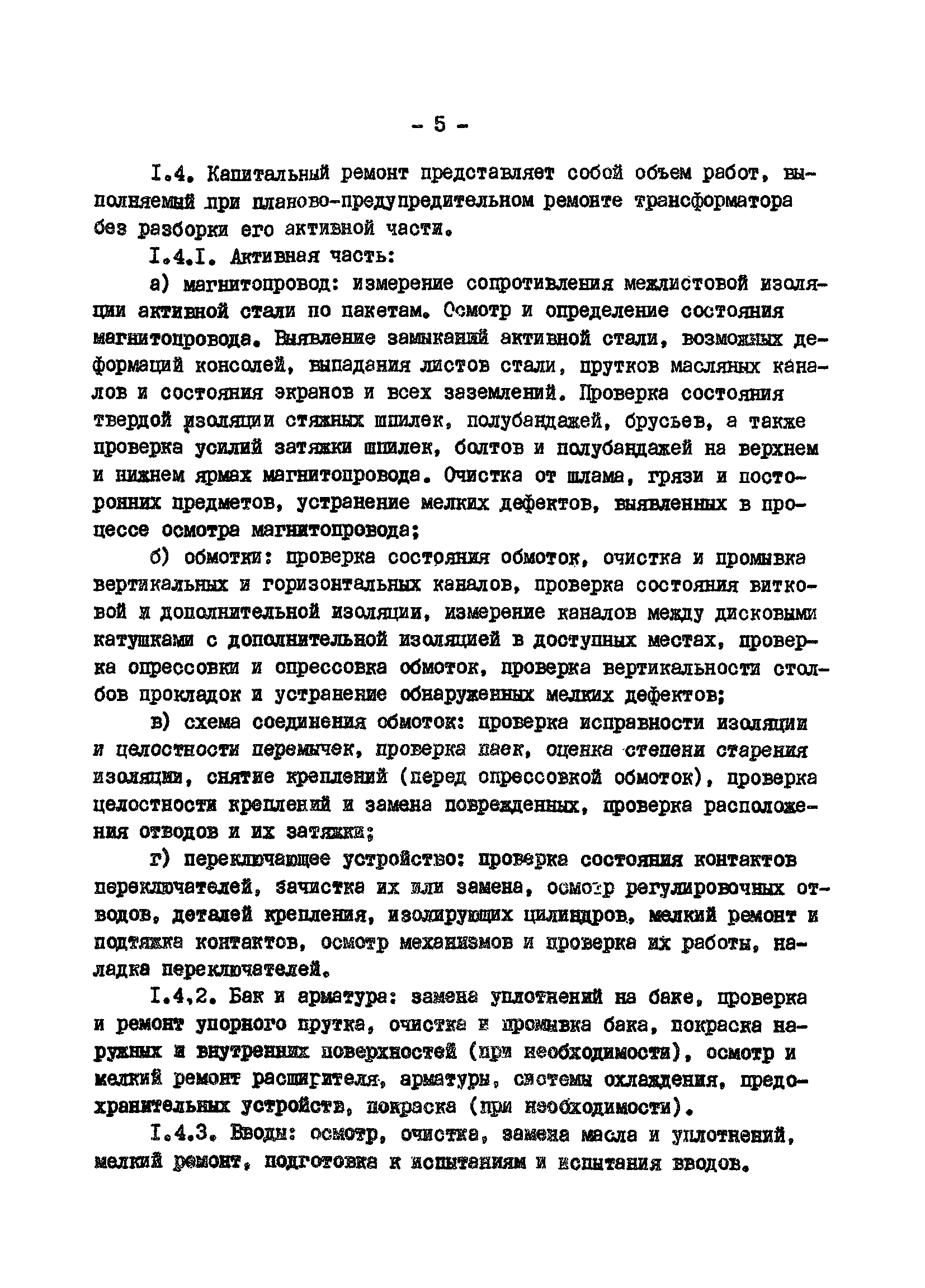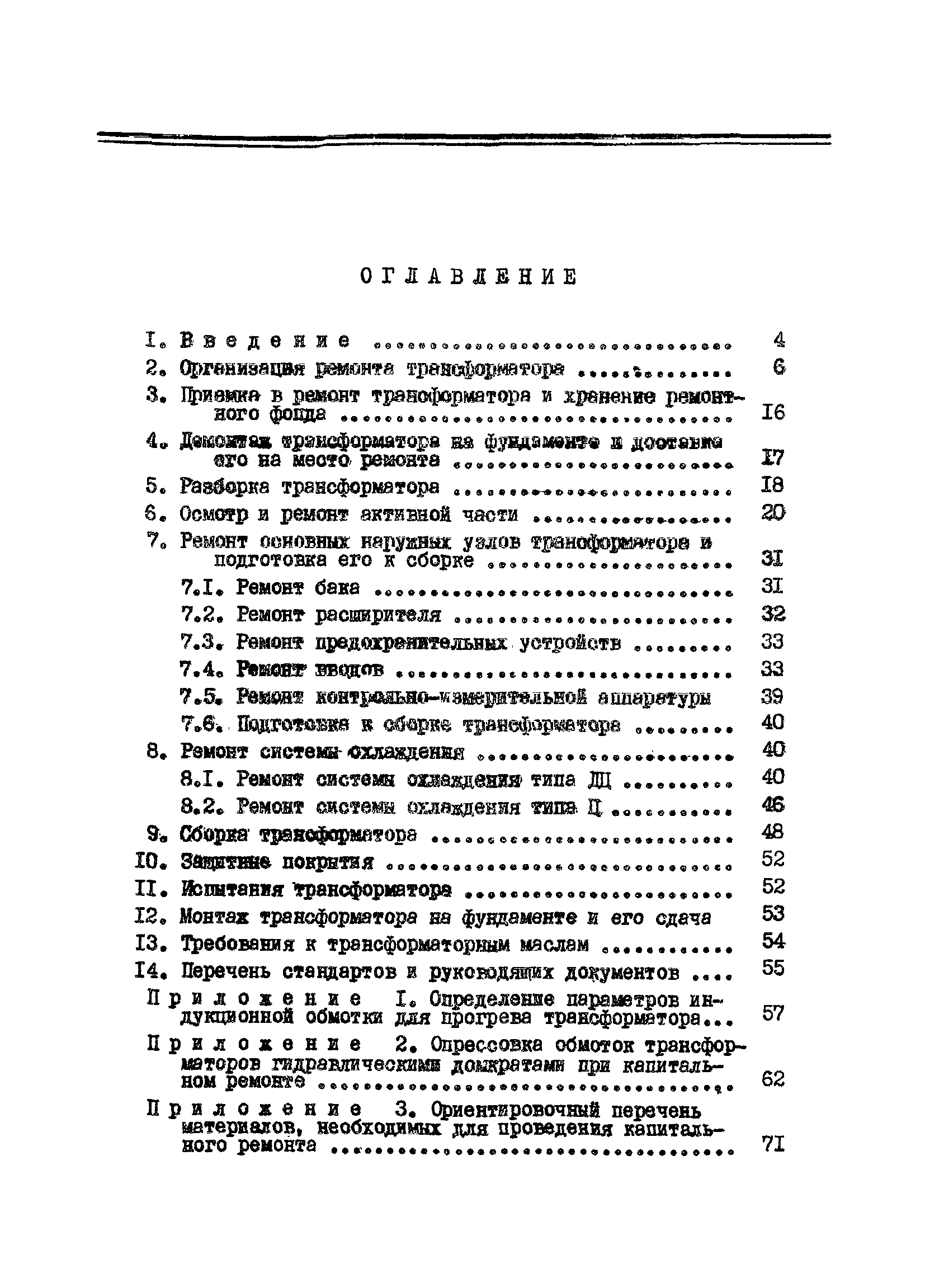 | Оглавление: | 1 Введение 2 Организация ремонта трансформатора 3 Приемка в ремонт трансформатора и хранение ремонтного фонда 4 Демонтаж трансформатора на фундаменте и доставка его на место ремонта 5 Разборка трансформатора 6 Осмотр и ремонт активной части 7 Ремонт основных наружных узлов трансформатора и подготовка его к сборке 7.1 Ремонт бака 7.2 Ремонт расширителя 7.3 Ремонт предохранительных устройств 7.4 Ремонт вводов 7.5 Ремонт контрольно-измерительной аппаратуры 7.6 Подготовка к сборке трансформатора 8 Ремонт системы охлаждения 8.1 Ремонт системы охлаждения типа ДЦ 8.2 Ремонт системы охлаждения типа Ц 9 Сборка трансформатора 10 Защитные покрытия 11 Испытания трансформатора 12 Монтаж трансформатора на фундаменте и его сдача 13 Требования к трансформаторным маслам 14 Перечень стандартов и руководящих документов Приложение 1. Определение параметров индукционной обмотки для прогрева трансформатора Приложение 2. Опрессовка обмоток трансформаторов гидравлическими домкратами при капитальном ремонте Приложение 3. Ориентировочный перечень материалов, необходимых для проведения капитального ремонта |