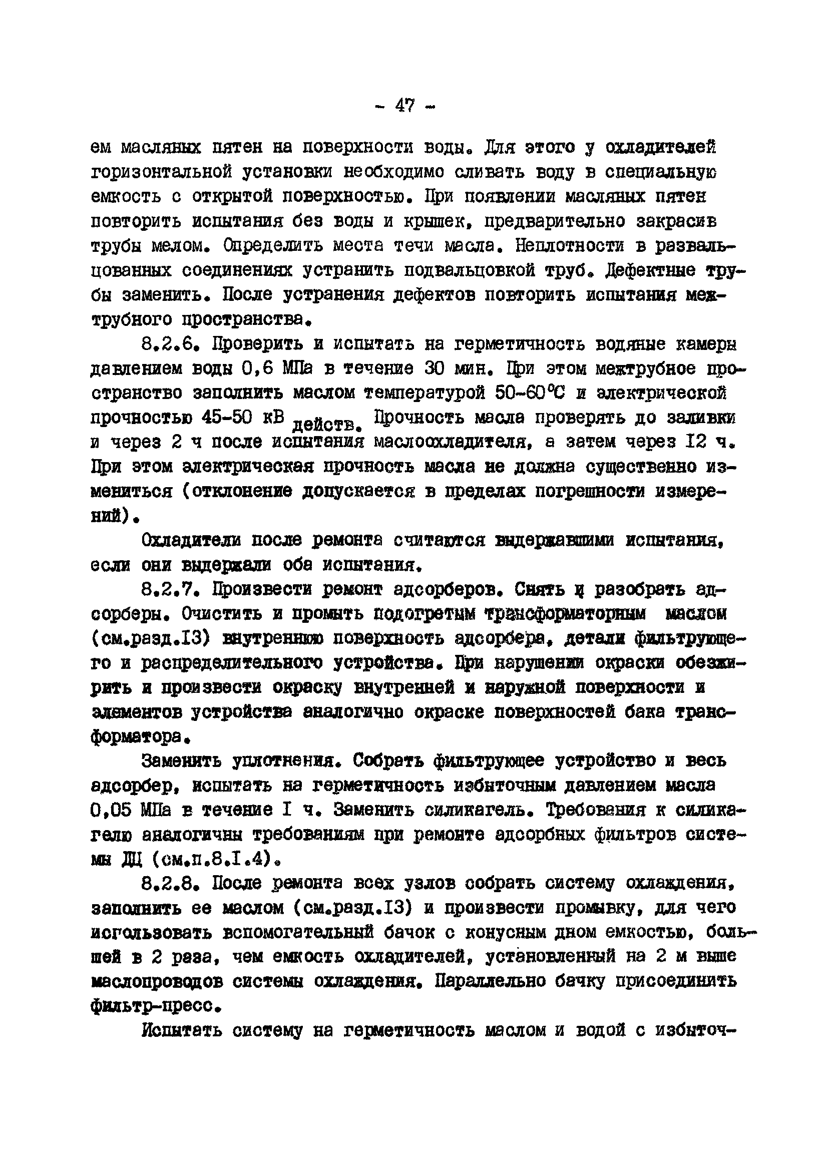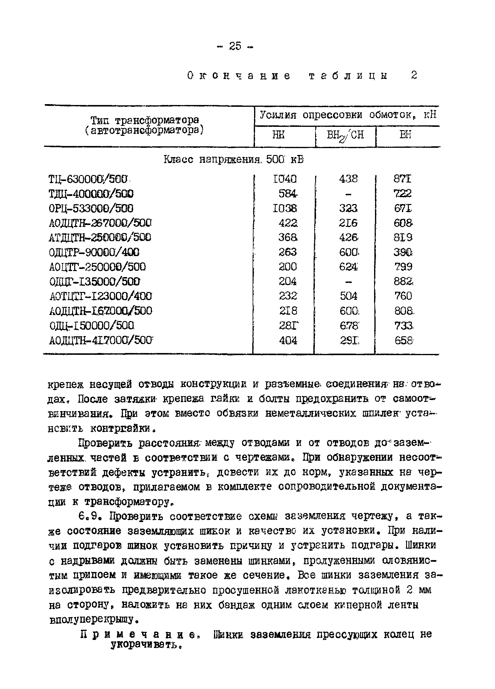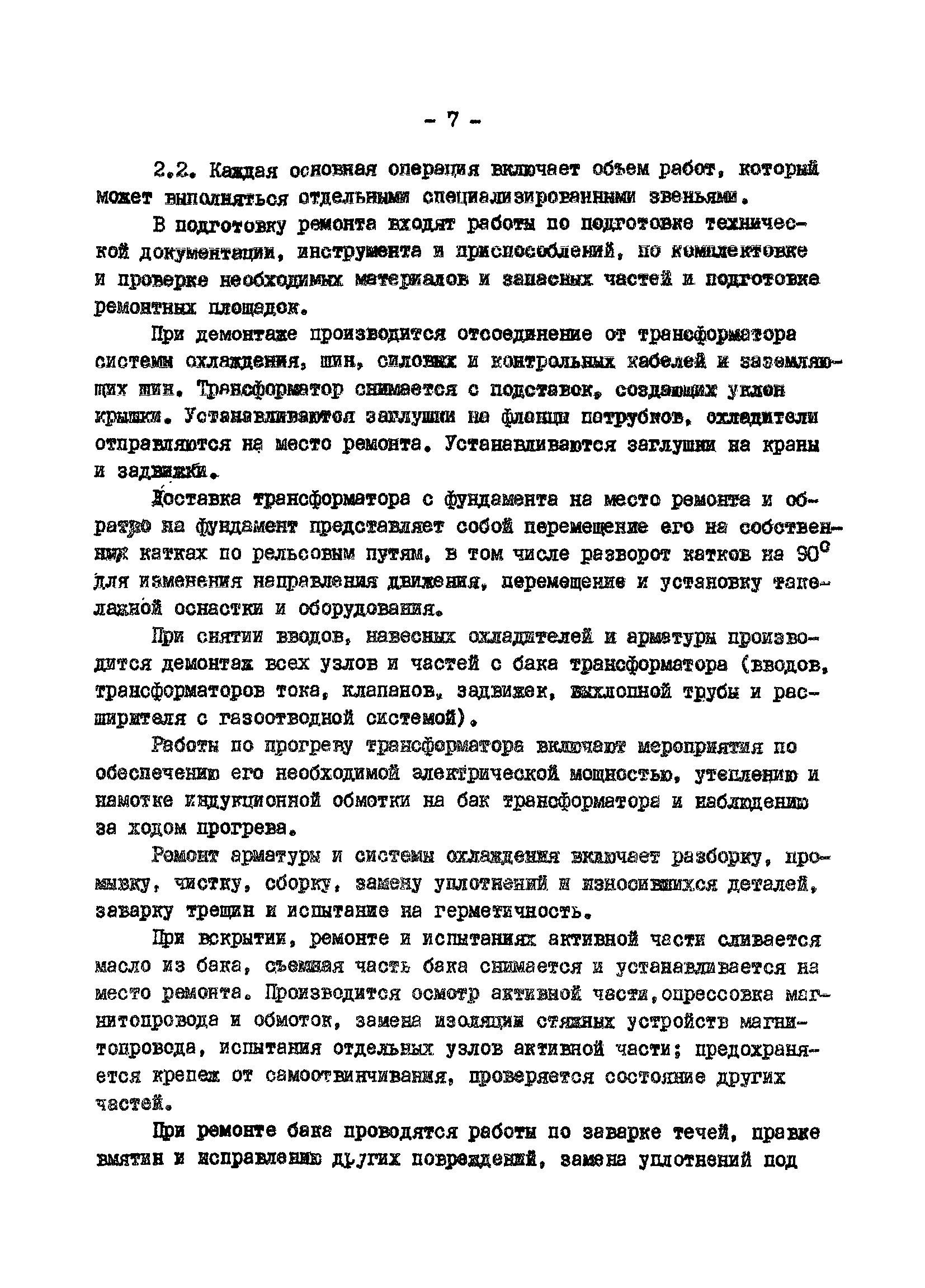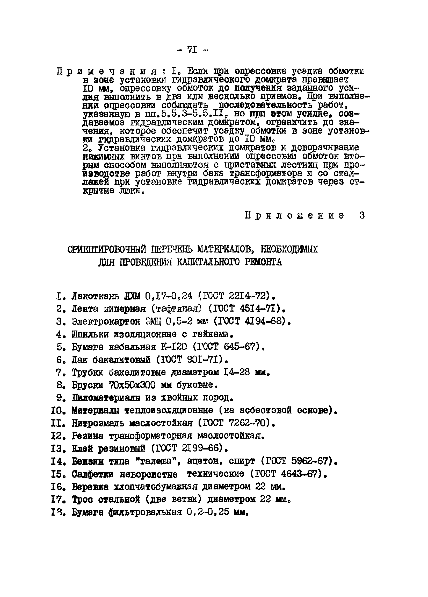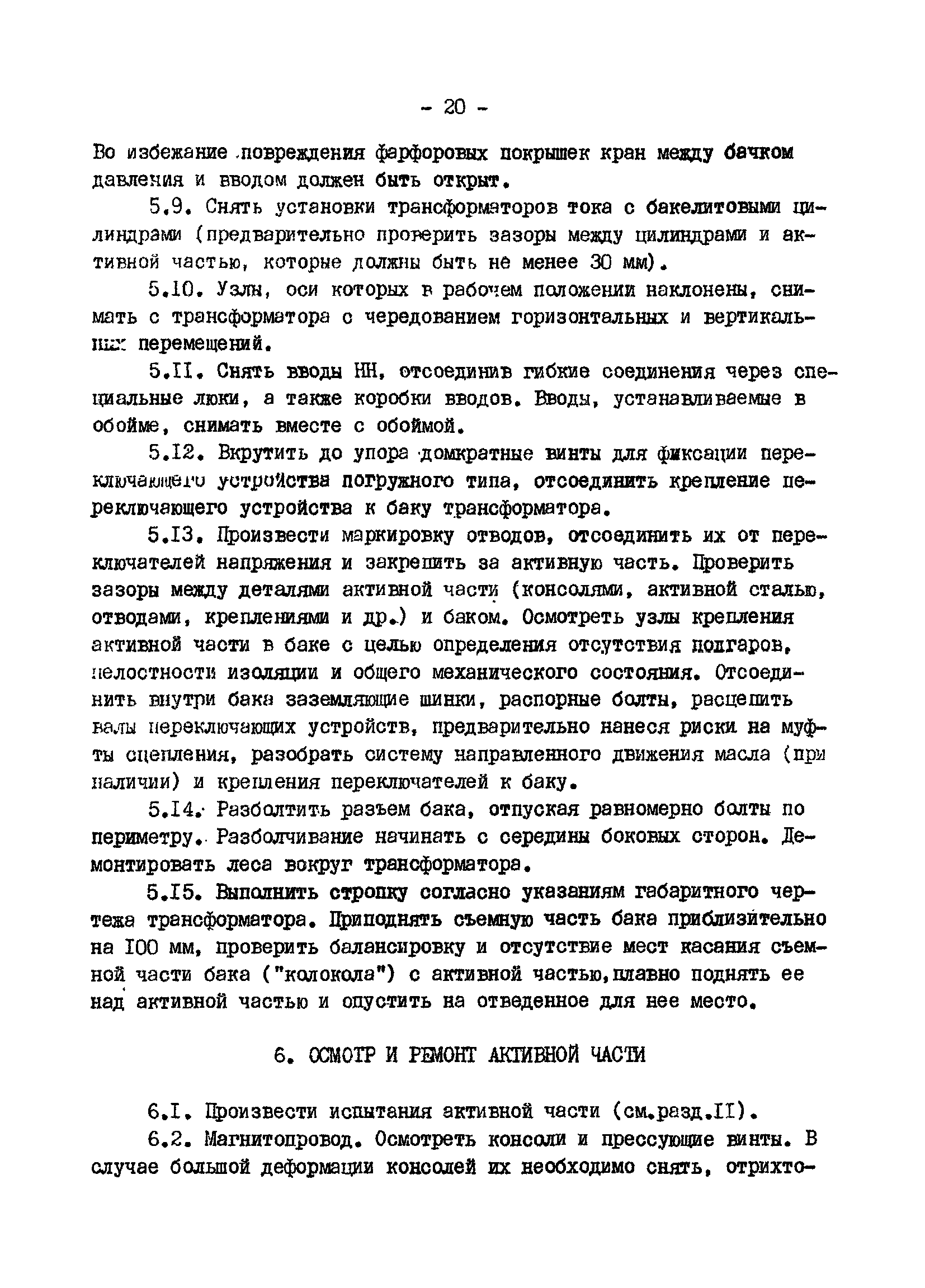 | Оглавление: | 1 Введение 2 Организация ремонта трансформатора 3 Приемка в ремонт трансформатора и хранение ремонтного фонда 4 Демонтаж трансформатора на фундаменте и доставка его на место ремонта 5 Разборка трансформатора 6 Осмотр и ремонт активной части 7 Ремонт основных наружных узлов трансформатора и подготовка его к сборке 7.1 Ремонт бака 7.2 Ремонт расширителя 7.3 Ремонт предохранительных устройств 7.4 Ремонт вводов 7.5 Ремонт контрольно-измерительной аппаратуры 7.6 Подготовка к сборке трансформатора 8 Ремонт системы охлаждения 8.1 Ремонт системы охлаждения типа ДЦ 8.2 Ремонт системы охлаждения типа Ц 9 Сборка трансформатора 10 Защитные покрытия 11 Испытания трансформатора 12 Монтаж трансформатора на фундаменте и его сдача 13 Требования к трансформаторным маслам 14 Перечень стандартов и руководящих документов Приложение 1. Определение параметров индукционной обмотки для прогрева трансформатора Приложение 2. Опрессовка обмоток трансформаторов гидравлическими домкратами при капитальном ремонте Приложение 3. Ориентировочный перечень материалов, необходимых для проведения капитального ремонта |