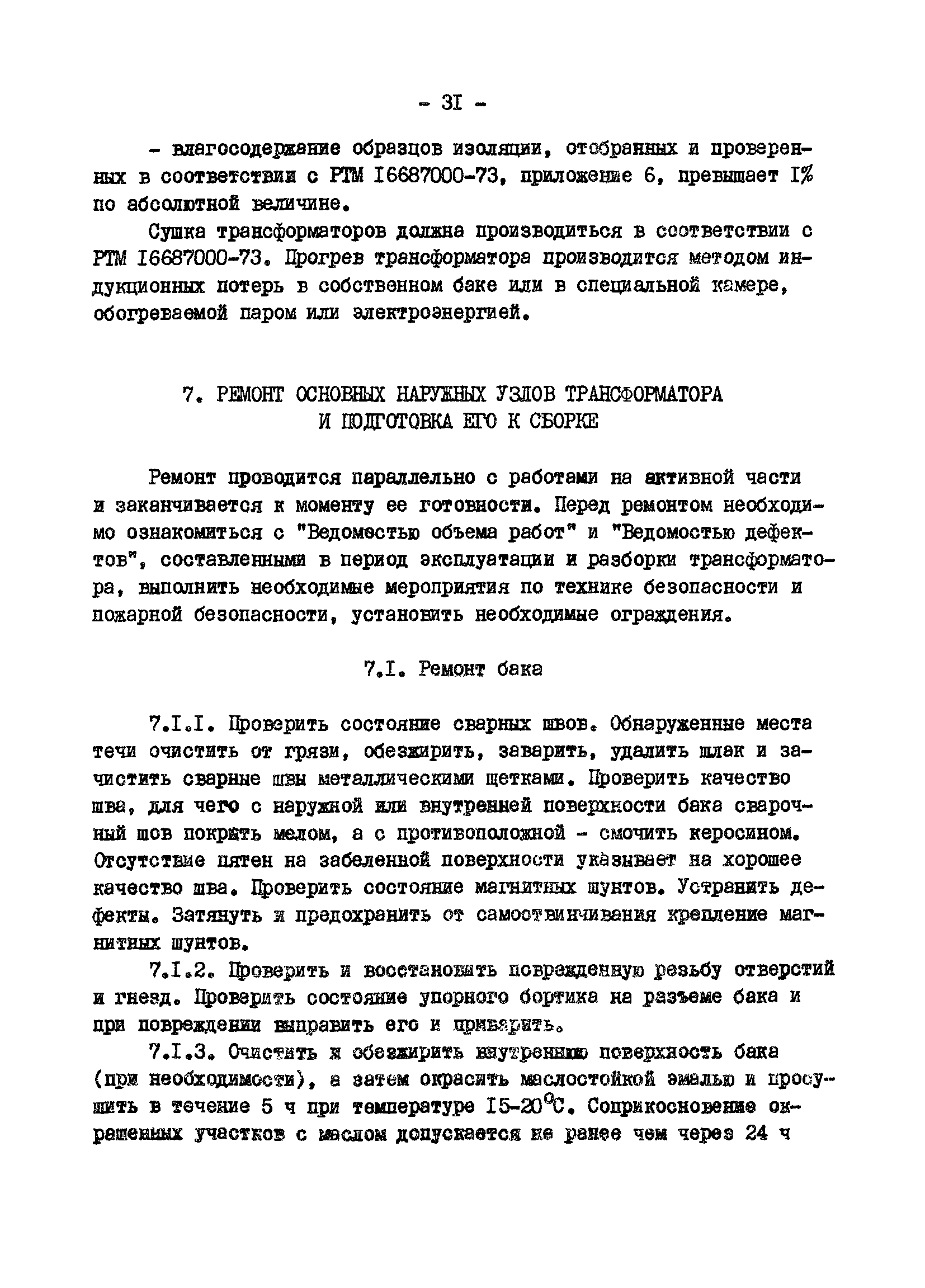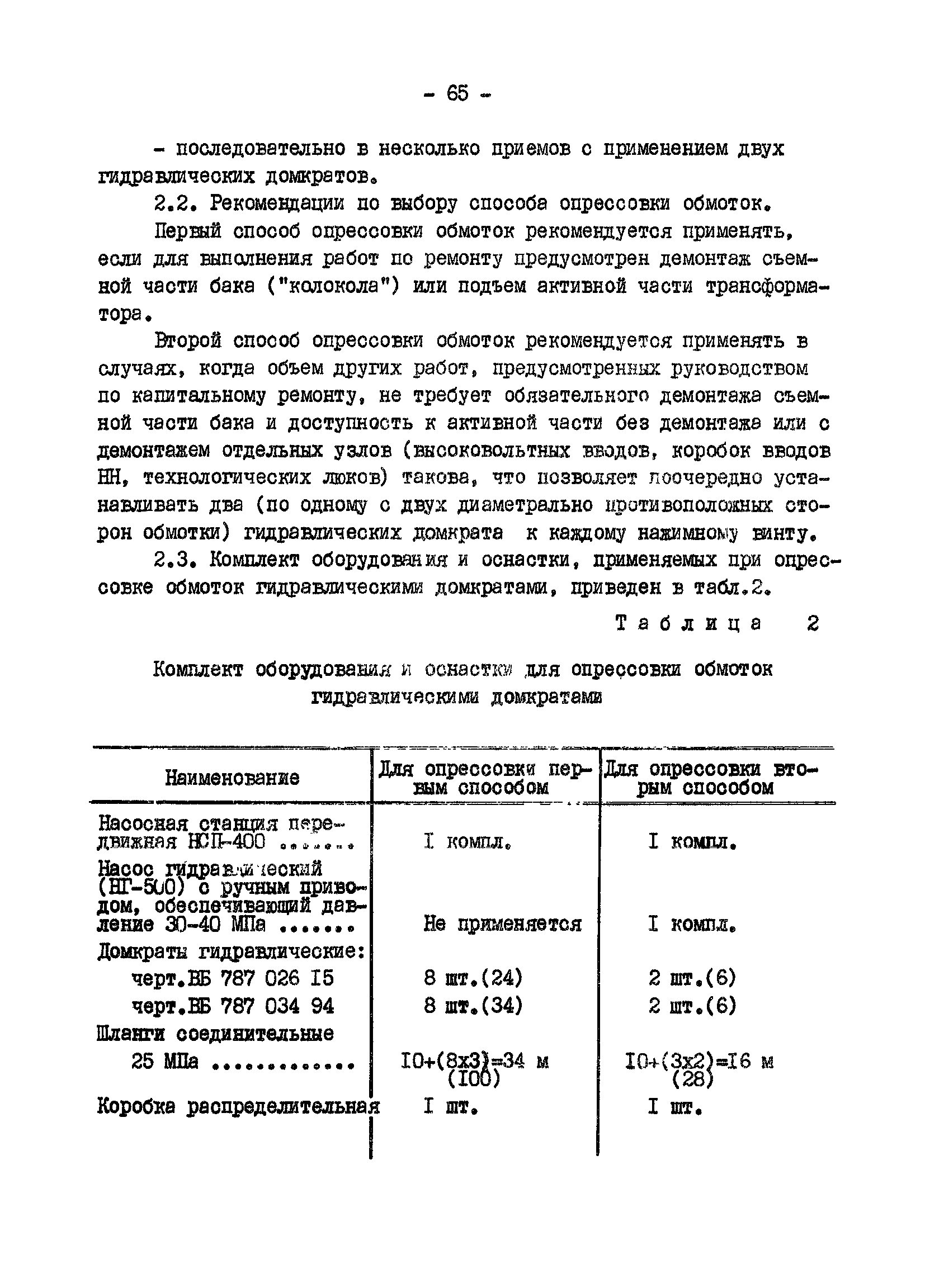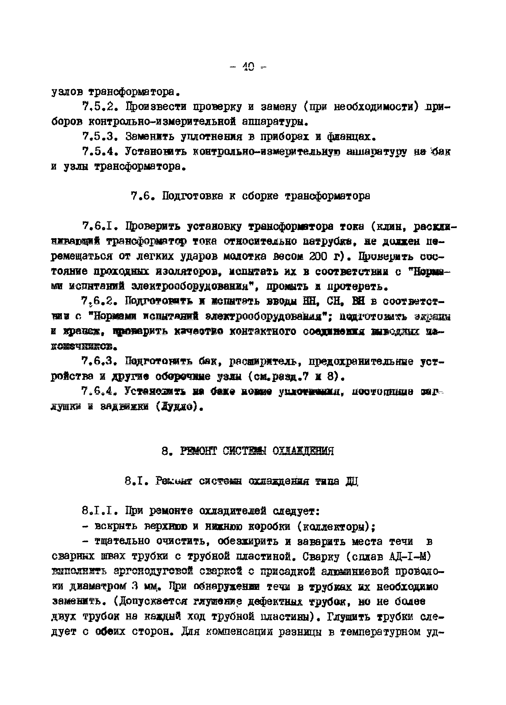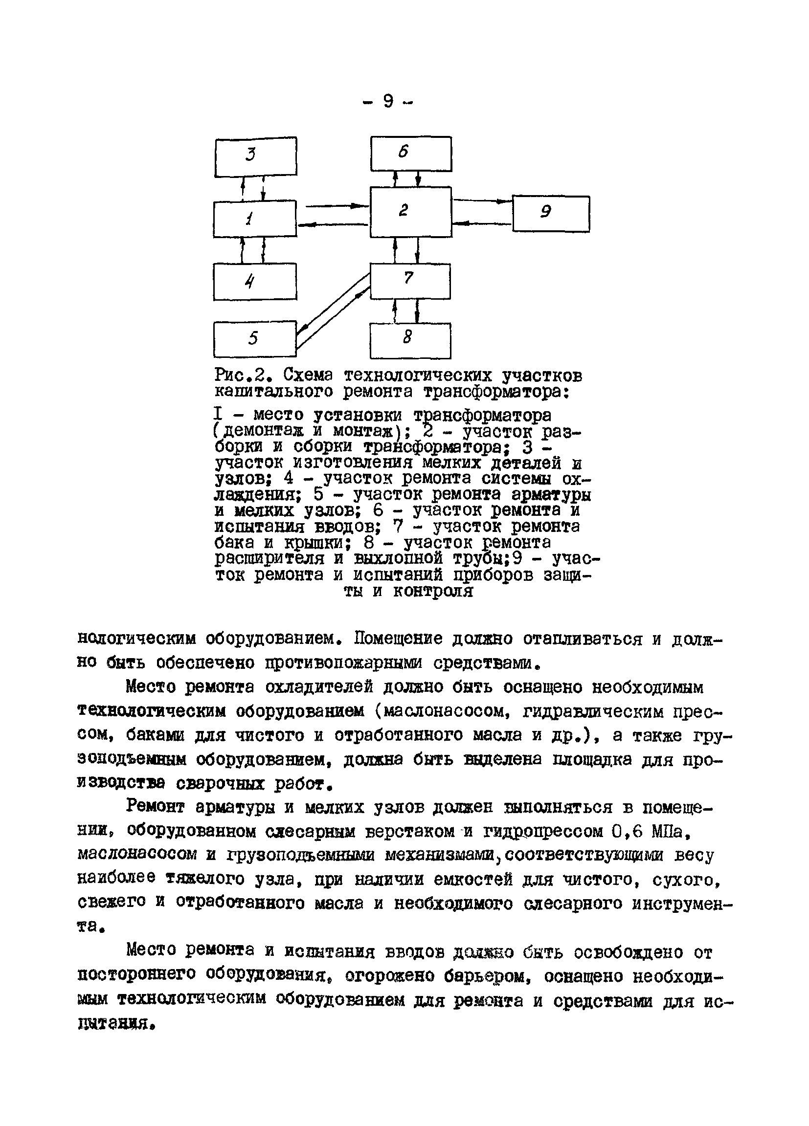 | Оглавление: | 1 Введение 2 Организация ремонта трансформатора 3 Приемка в ремонт трансформатора и хранение ремонтного фонда 4 Демонтаж трансформатора на фундаменте и доставка его на место ремонта 5 Разборка трансформатора 6 Осмотр и ремонт активной части 7 Ремонт основных наружных узлов трансформатора и подготовка его к сборке 7.1 Ремонт бака 7.2 Ремонт расширителя 7.3 Ремонт предохранительных устройств 7.4 Ремонт вводов 7.5 Ремонт контрольно-измерительной аппаратуры 7.6 Подготовка к сборке трансформатора 8 Ремонт системы охлаждения 8.1 Ремонт системы охлаждения типа ДЦ 8.2 Ремонт системы охлаждения типа Ц 9 Сборка трансформатора 10 Защитные покрытия 11 Испытания трансформатора 12 Монтаж трансформатора на фундаменте и его сдача 13 Требования к трансформаторным маслам 14 Перечень стандартов и руководящих документов Приложение 1. Определение параметров индукционной обмотки для прогрева трансформатора Приложение 2. Опрессовка обмоток трансформаторов гидравлическими домкратами при капитальном ремонте Приложение 3. Ориентировочный перечень материалов, необходимых для проведения капитального ремонта |