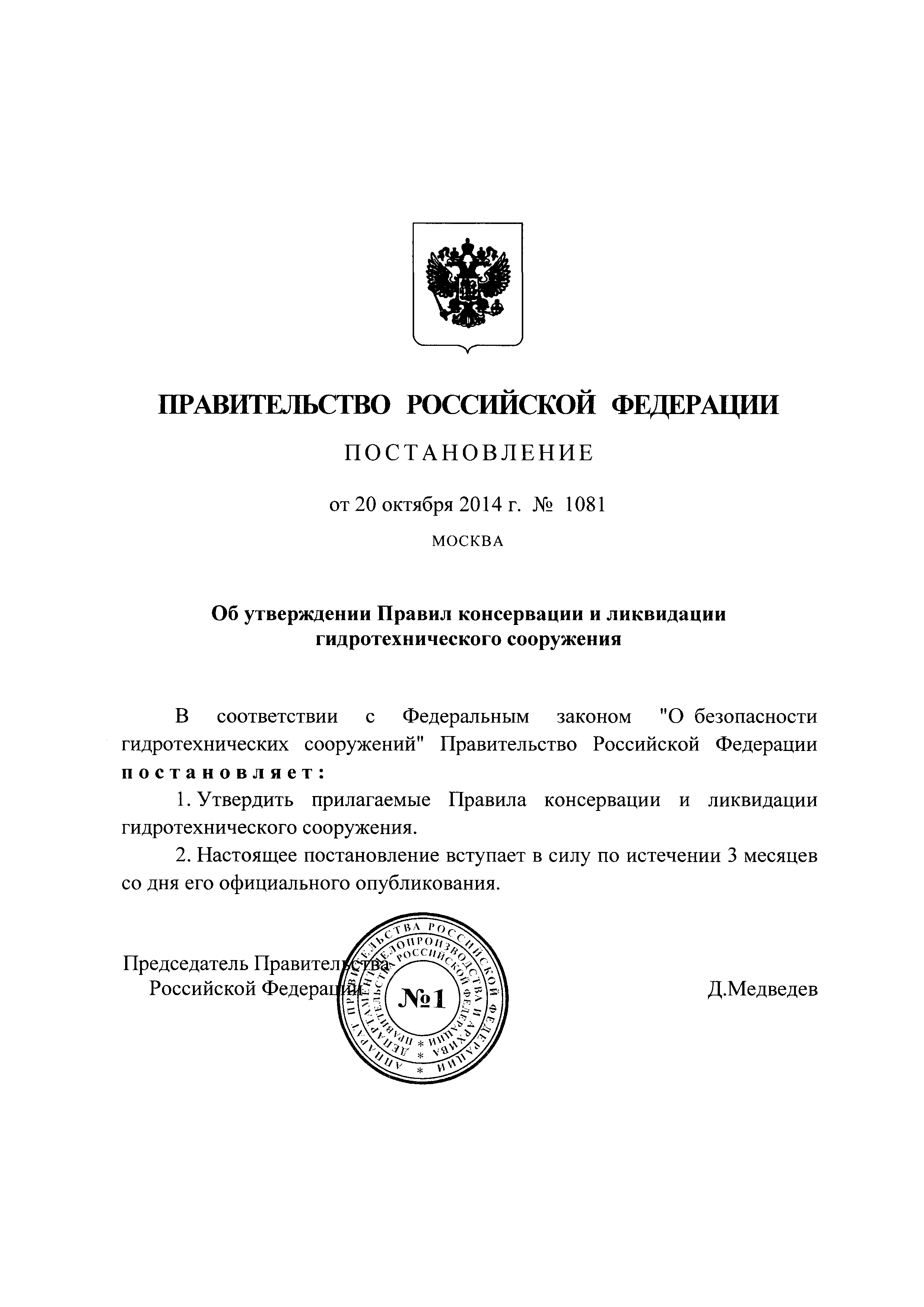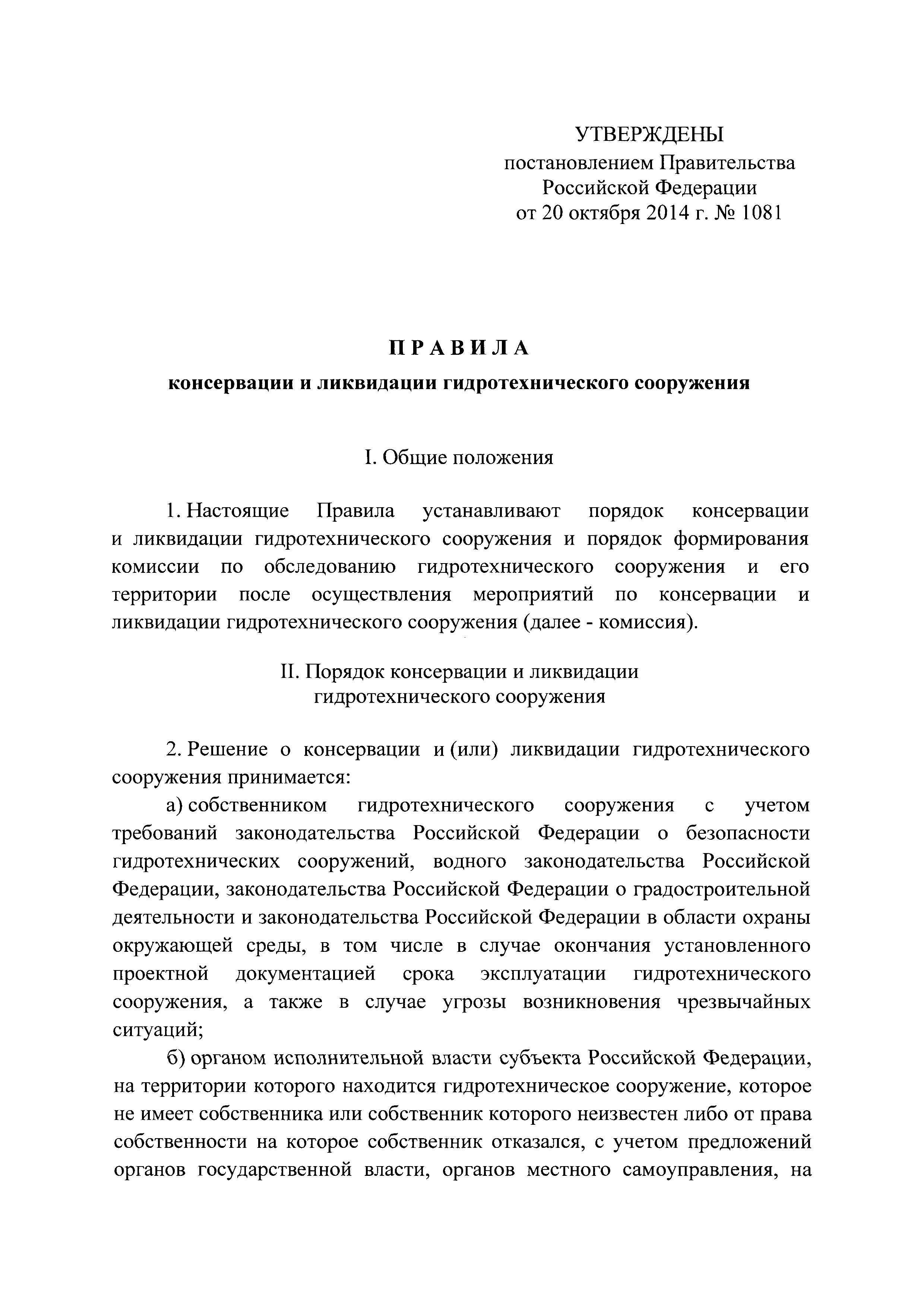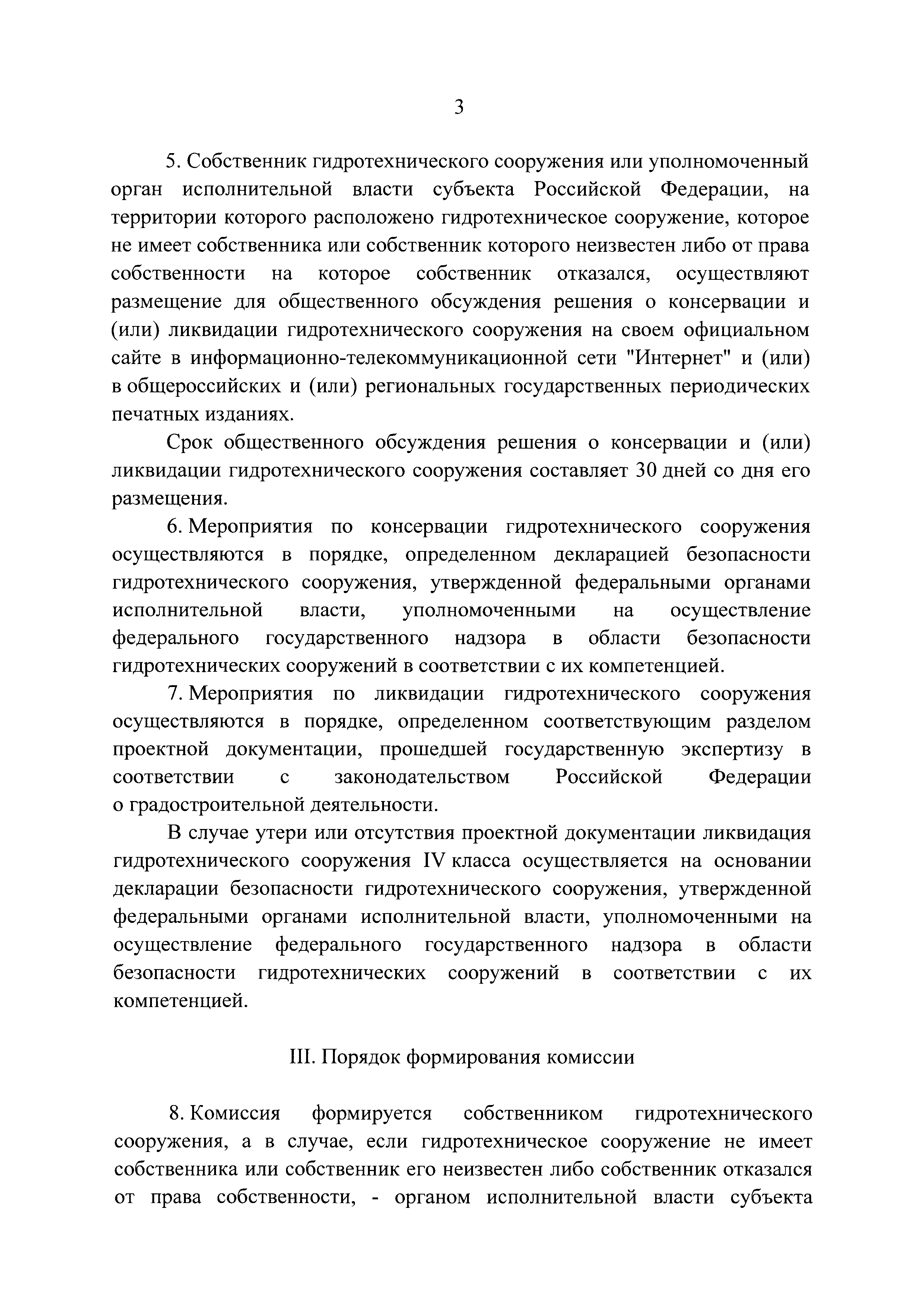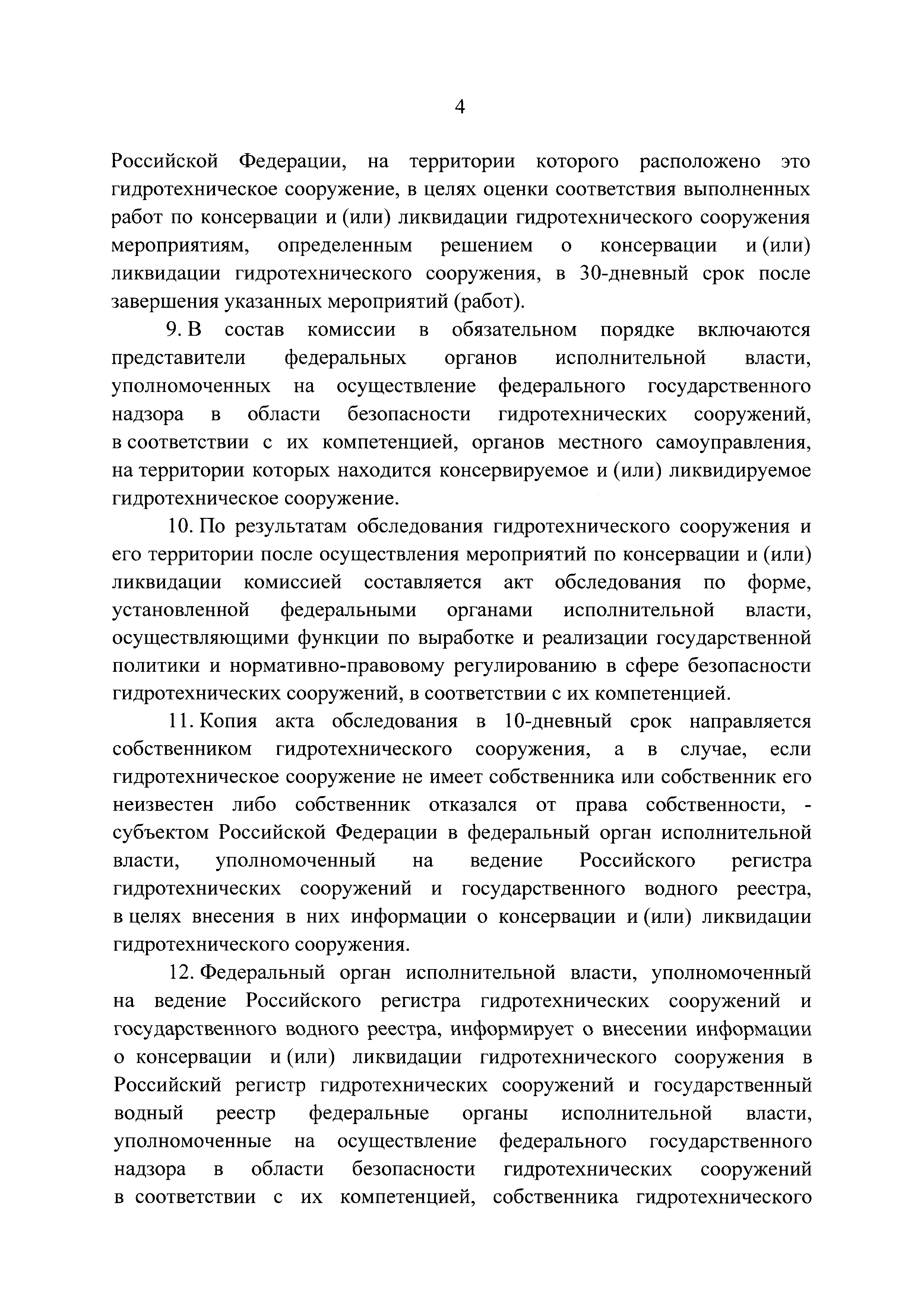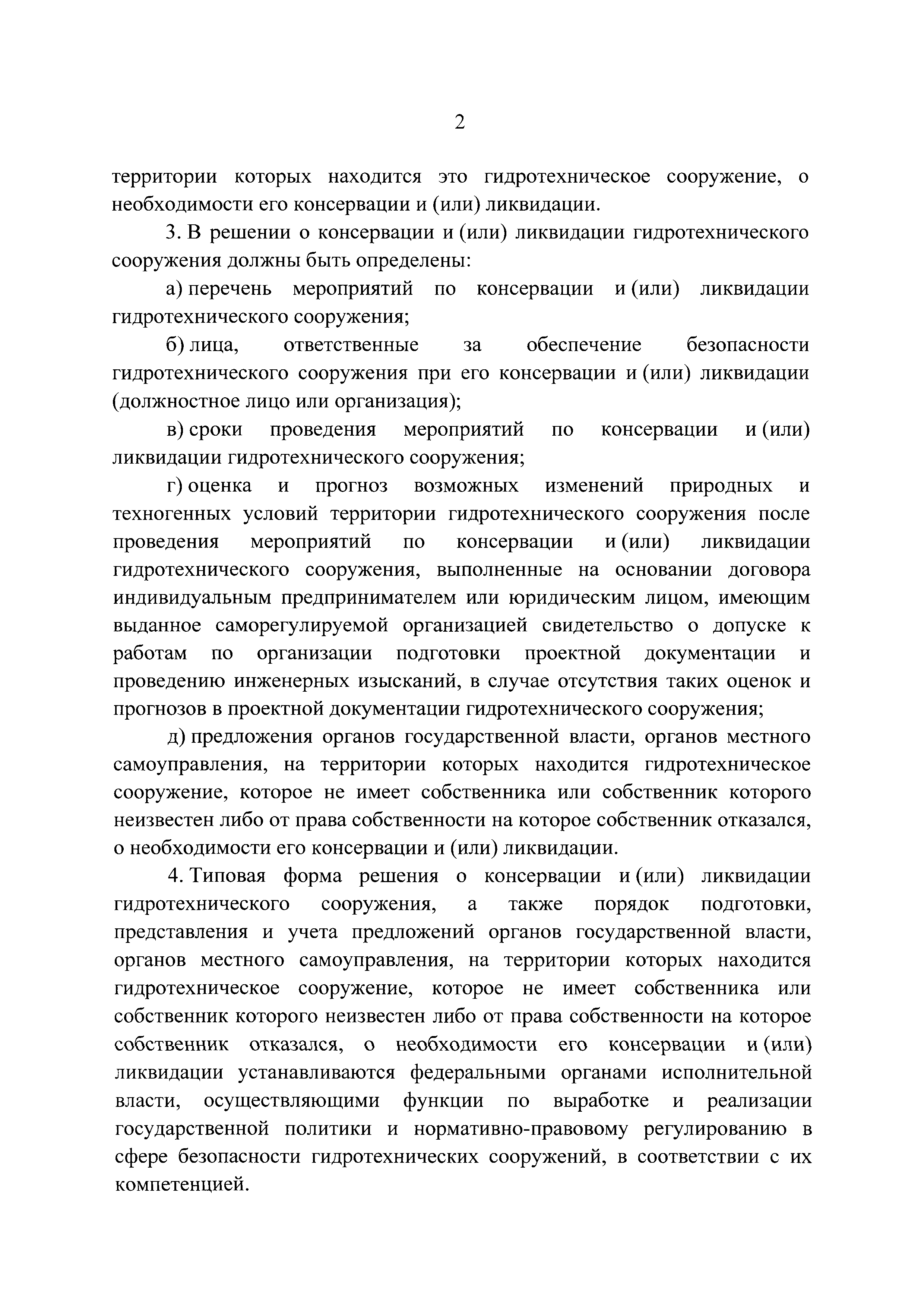 | Оглавление: | I. Общие положения II. Порядок консервации и ликвидации гидротехнического сооружения III. Порядок формирования комиссии IV. Особенности принятия решения о консервации и(или) ликвидации гидротехнического сооружения, находящегося в собственности Российской Федерации |