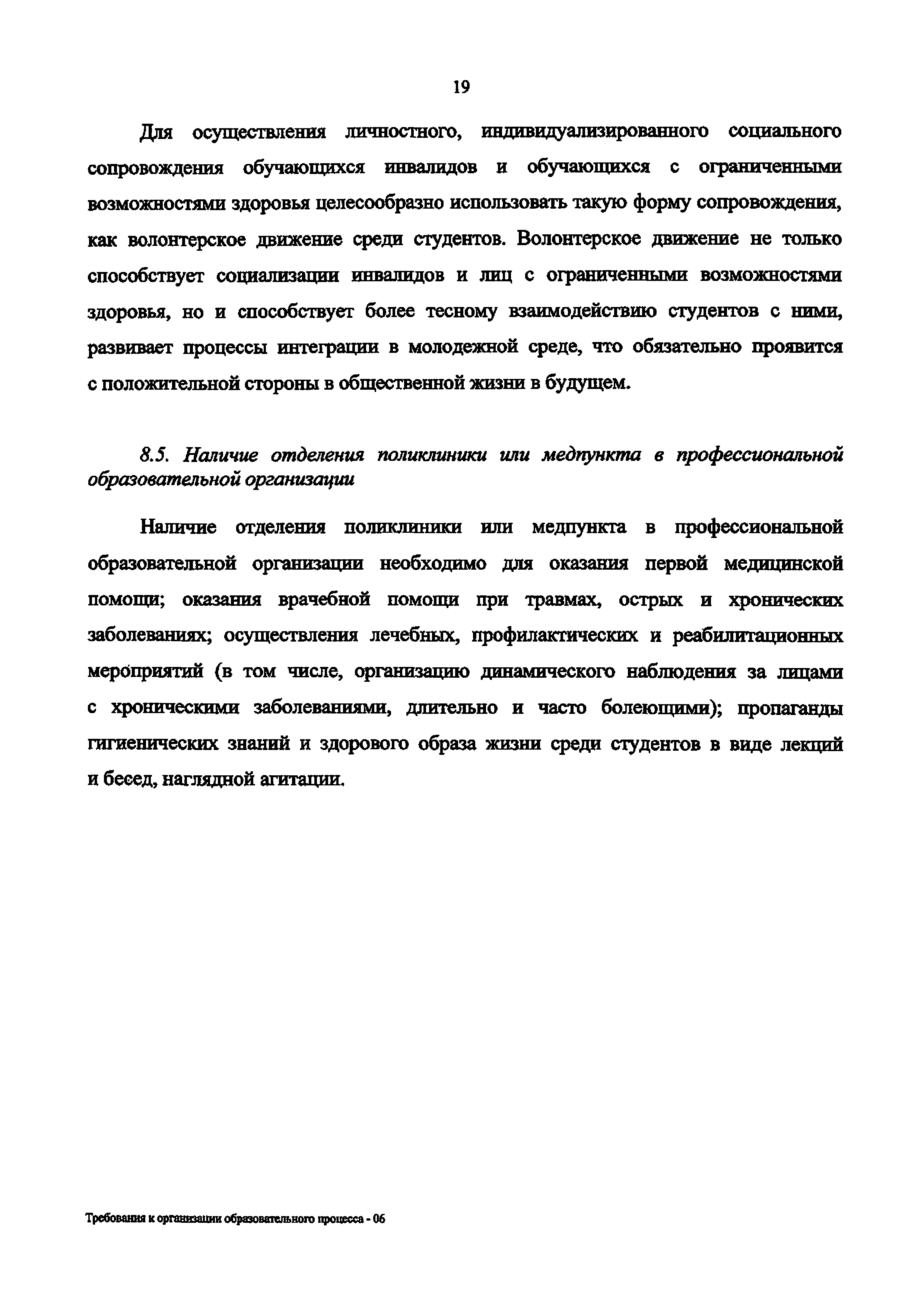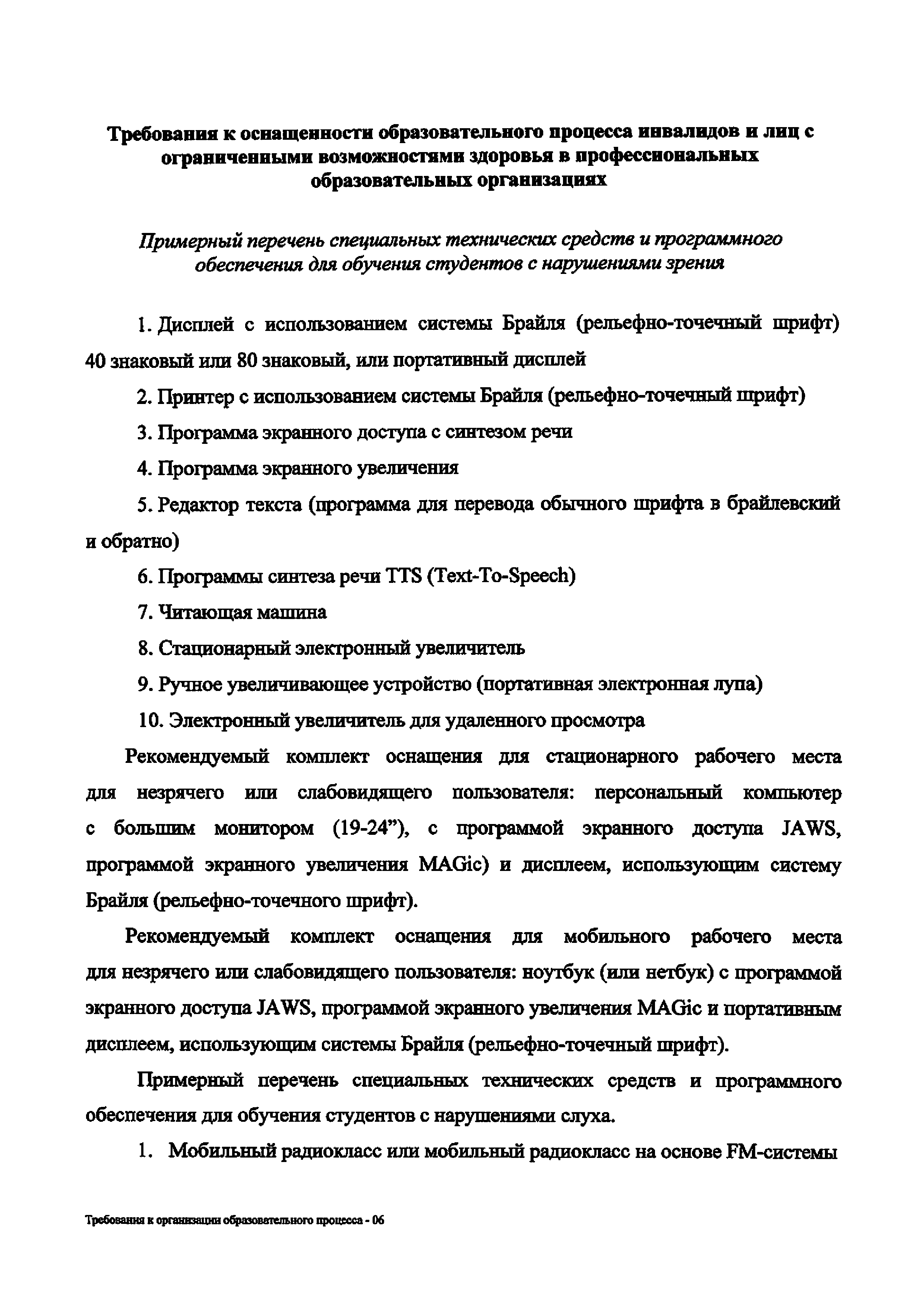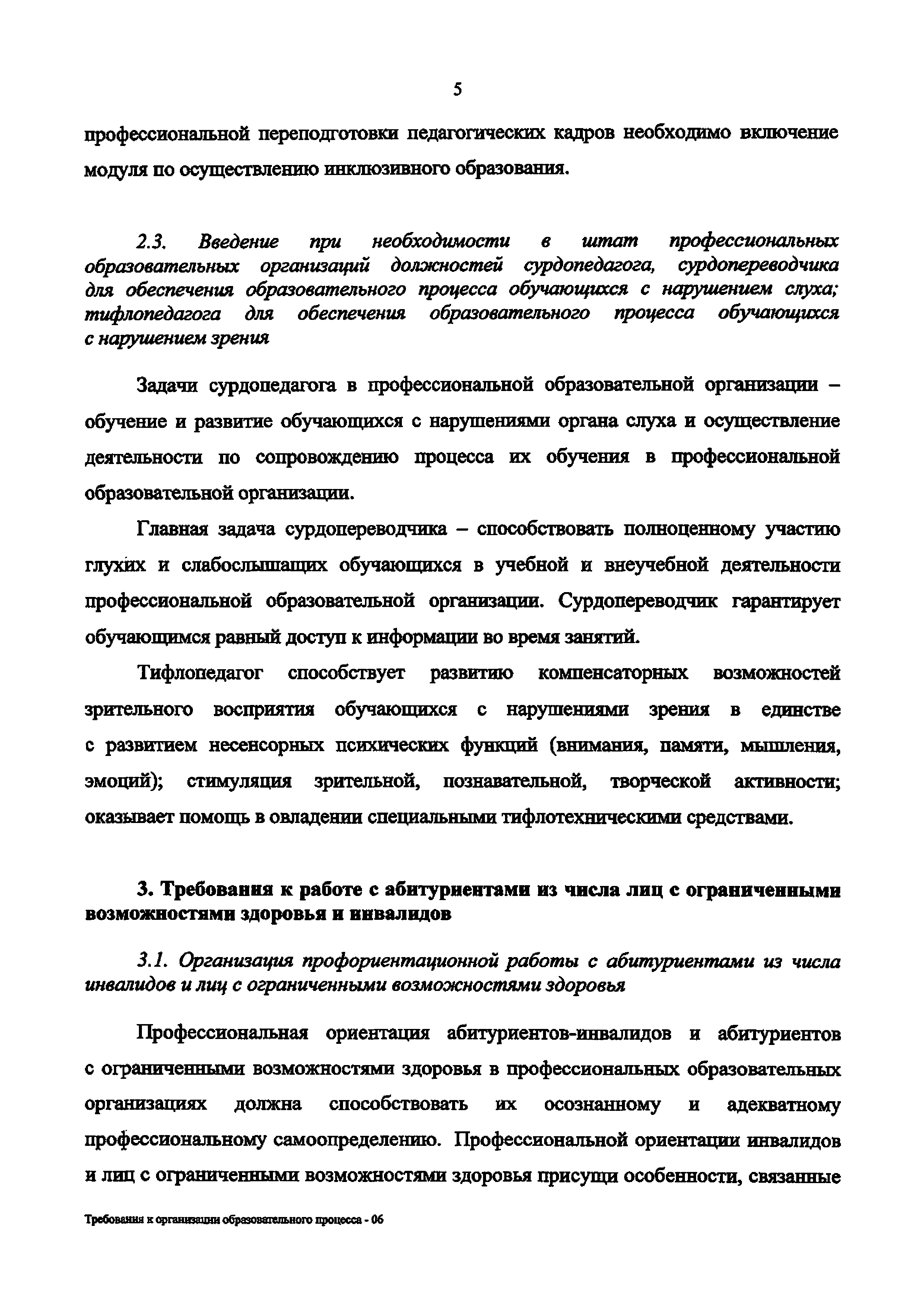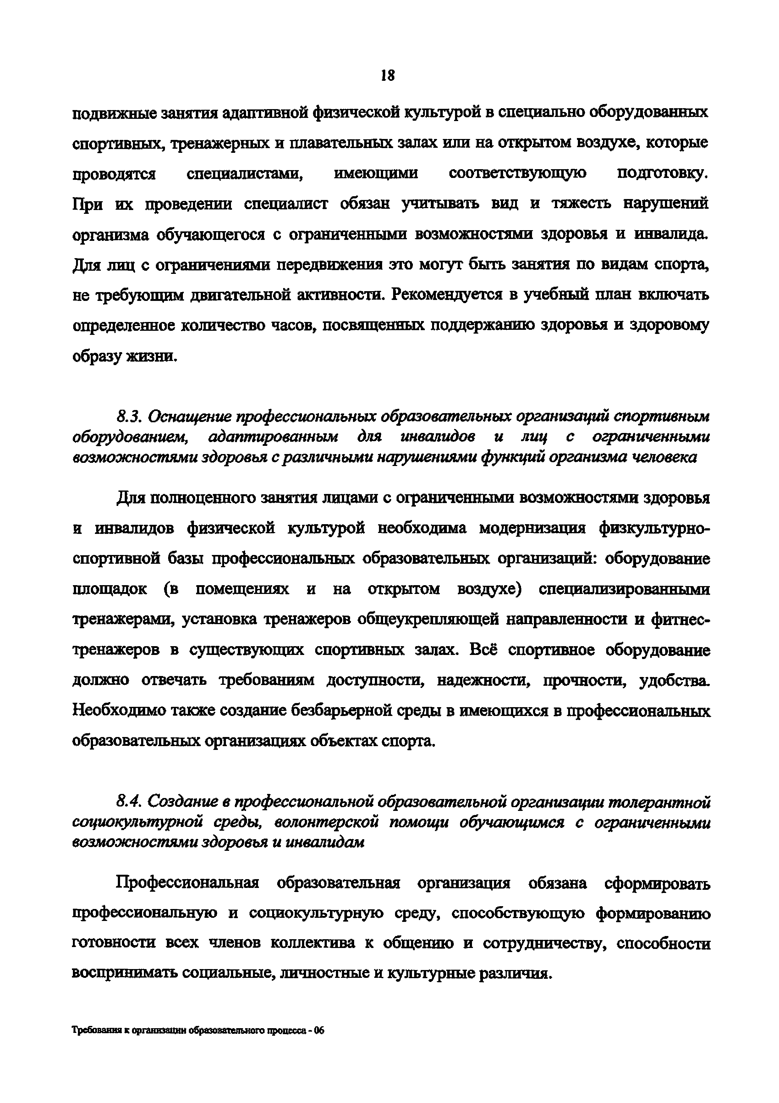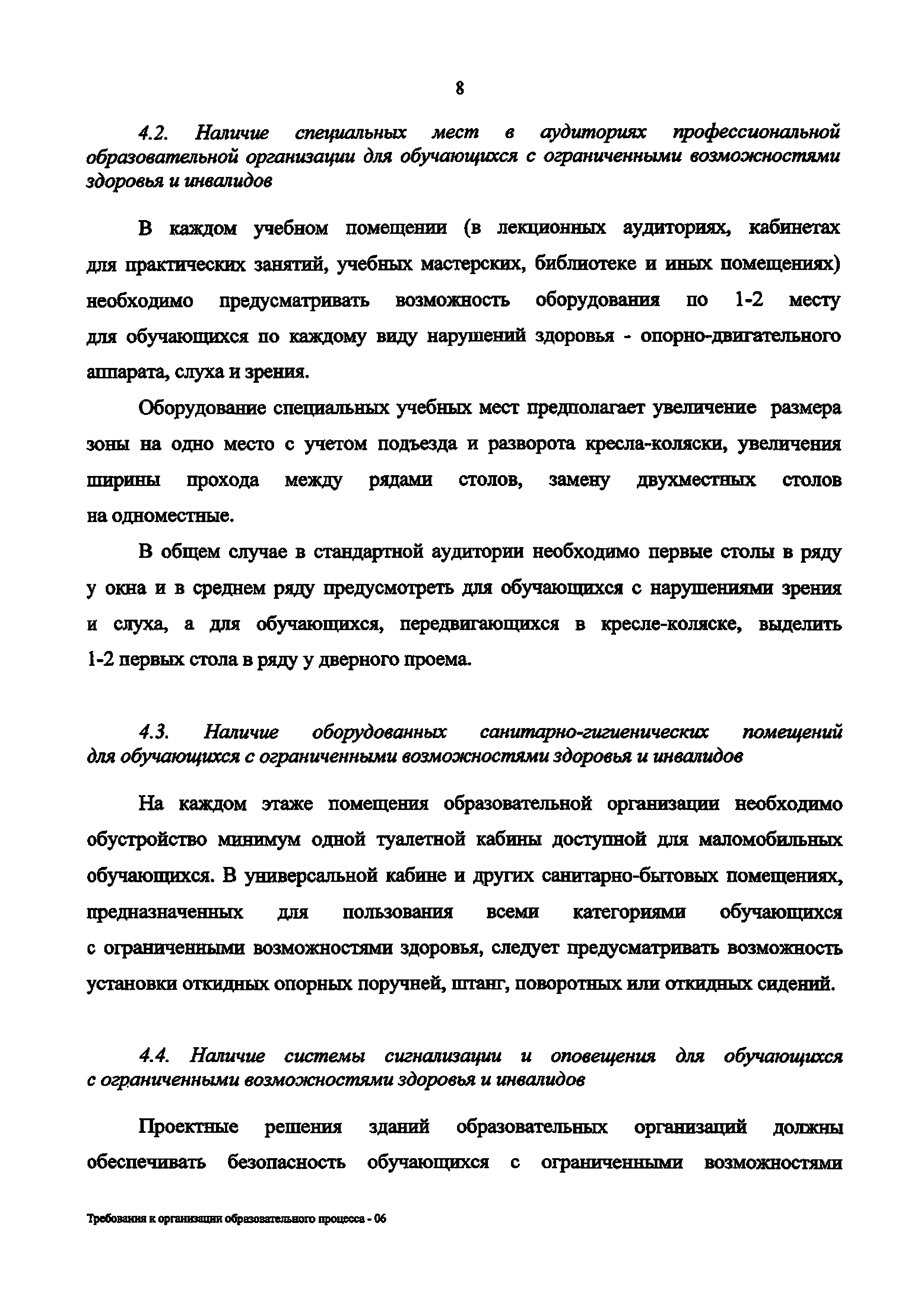 | Оглавление: | 1. Организационно-нормативные требования к профессиональным образовательным организациям 2. Требования к кадровому обеспечению профессиональной образовательной организации 3. Требования к работе с абитуриентами из числа лиц с ограниченными возможностями здоровья и инвалидов 4. Требования к доступности зданий и сооружений профессиональных образовательных организаций и безопасного в них нахождения 5. Требования к материально-техническому обеспечению образовательного процесса 6. Требования к адаптации образовательных программ и учебно-методическому обеспечению образовательного процесса для обучающихся с ограниченными возможностями здоровья и инвалидов 7. Требования к организации образовательного процесса с использованием дистанционных образовательных технологий 8. Требования к комплексному сопровождению образовательного процесса и здоровьесбережению Требования к оснащенности образовательного процесса инвалидов и лиц с ограниченными возможностями здоровья в профессиональных образовательных организациях |