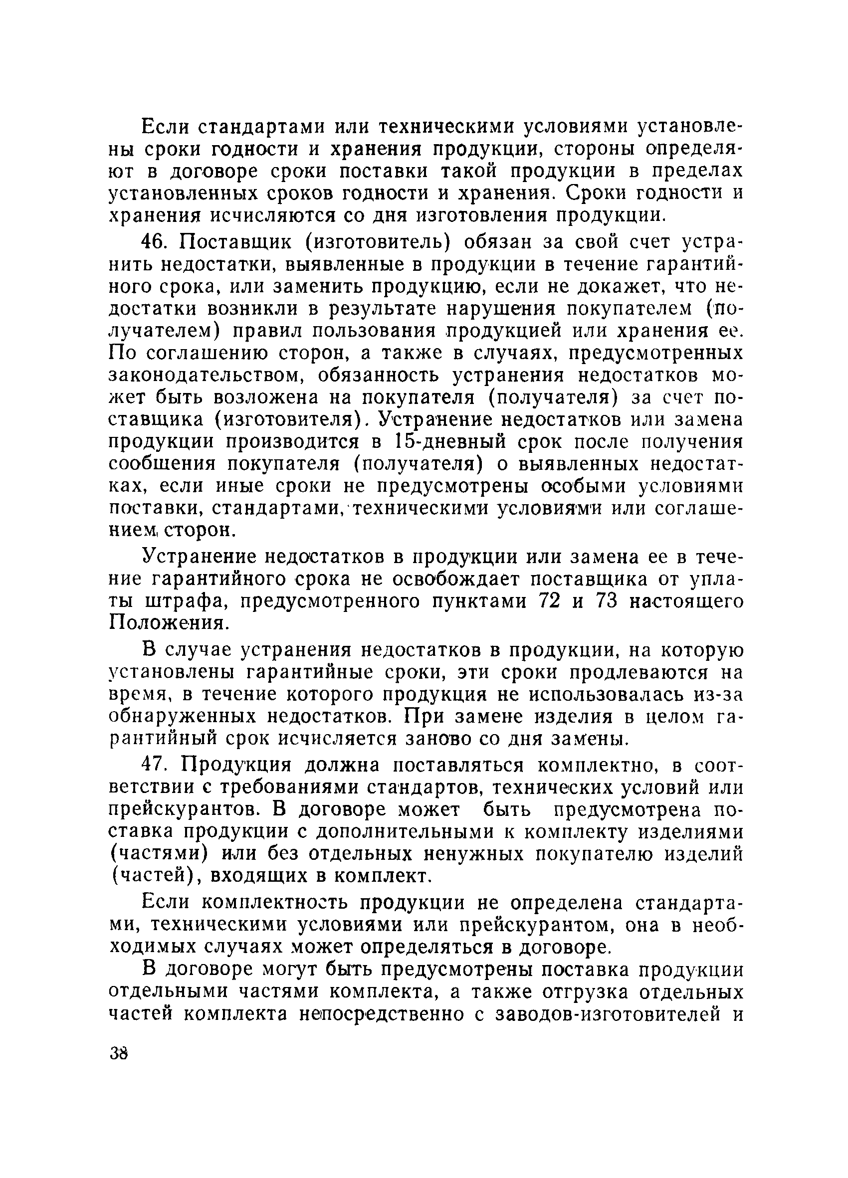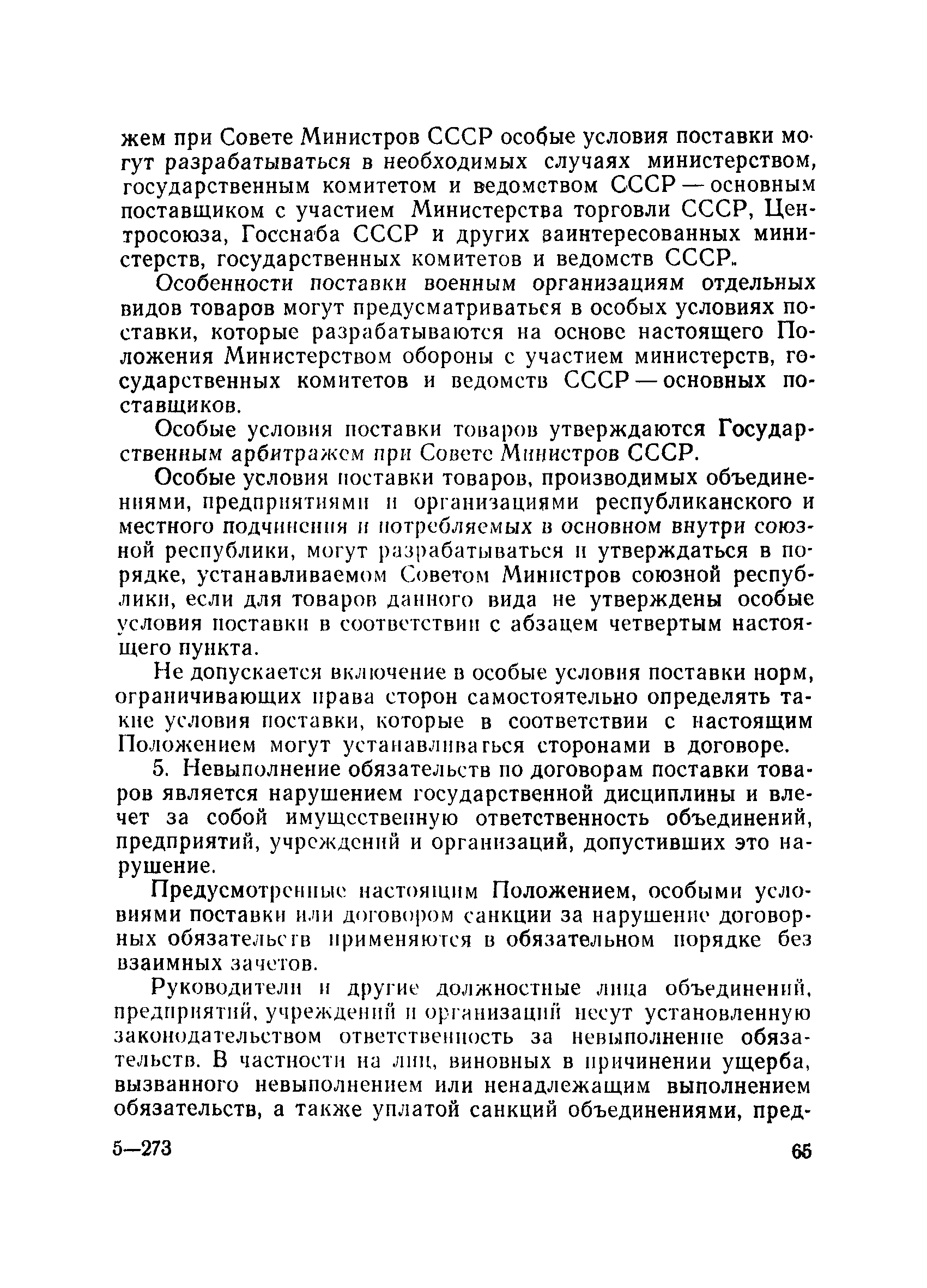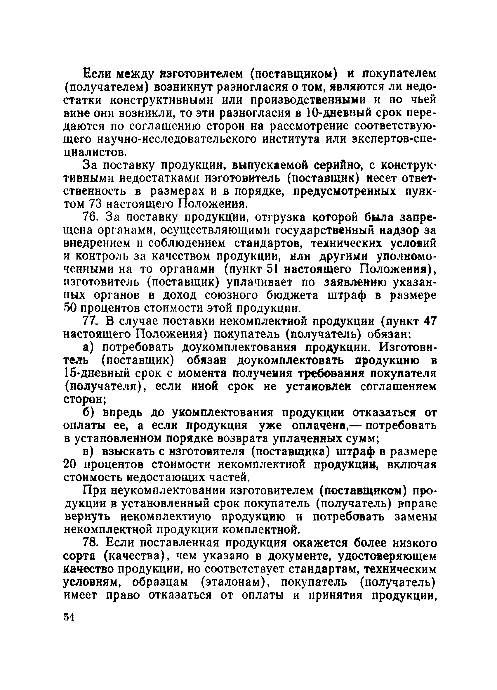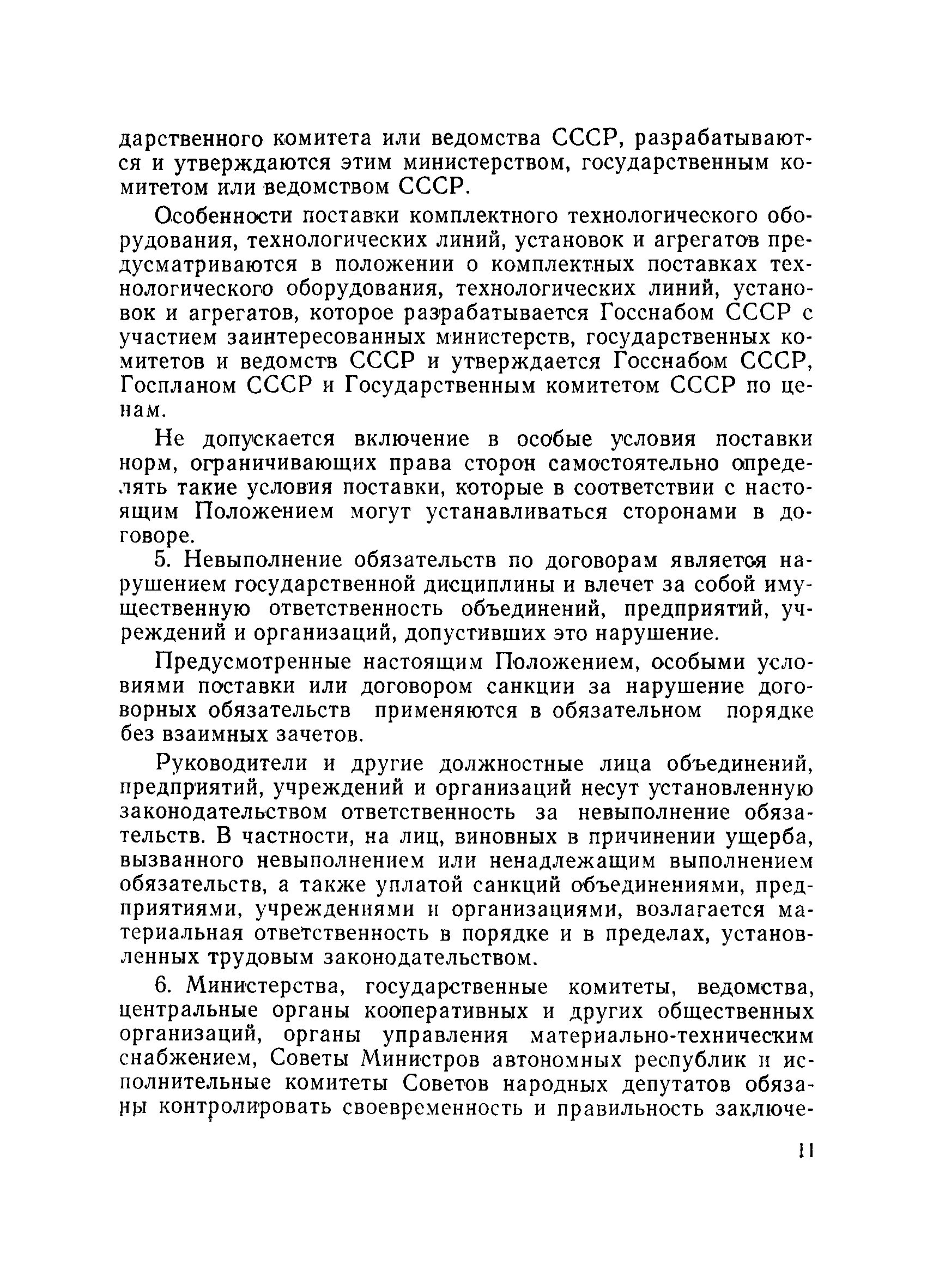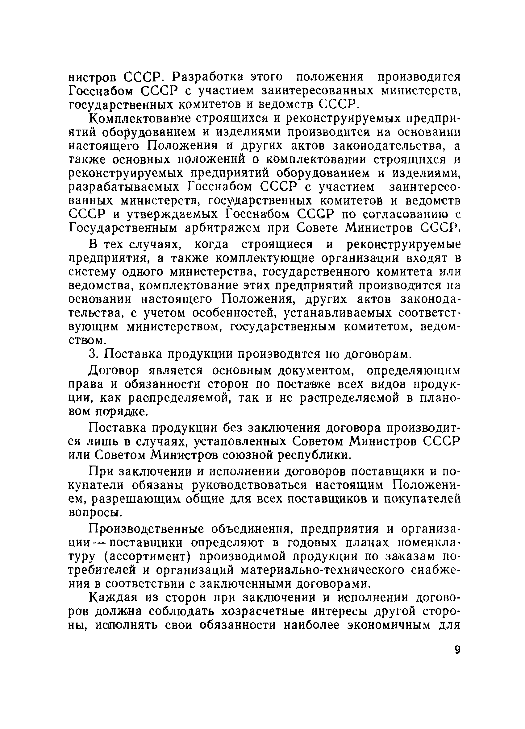 | Оглавление: | Положение о поставках продукции производственно-технического назначения I. Общие положения II. Плановые основания заключения договоров и организация хозяйственных связей III. Порядок и сроки заключения договоров IV. Количество, сроки и порядок поставки продукции V. Качество и комплектность продукции VI. Тара, упаковка и средства пакетирования продукции VII. Цены и порядок расчетов VIII. Имущественная ответственность Положение о поставках товаров народного потребления I. Общие положения II. Плановые основания заключения договоров и организация хозяйственных связей III. Порядок и сроки заключения договоров на поставку товаров IV. Количество, ассортимент, сроки и порядок поставки товаров V. Качество и комплектность товаров VI. Тара, упаковка и средства пакетирования товаров VII. Цены и порядок расчетов VIII. Имущественная ответственность Перечень утративших силу решений Правительства СССР Изменения, которые вносятся в решения Правительства СССР |