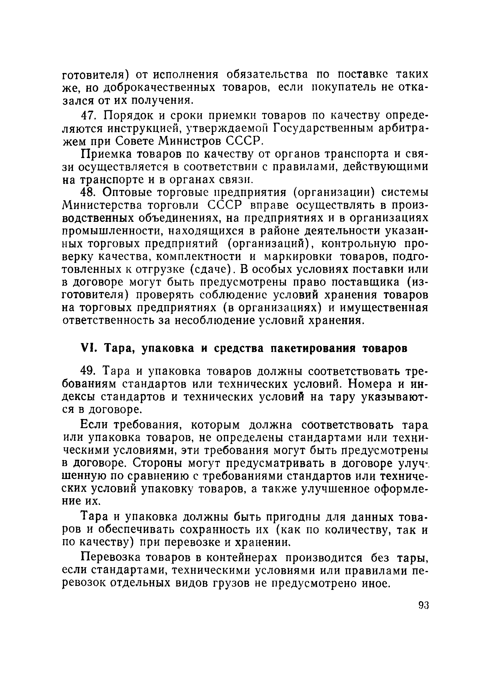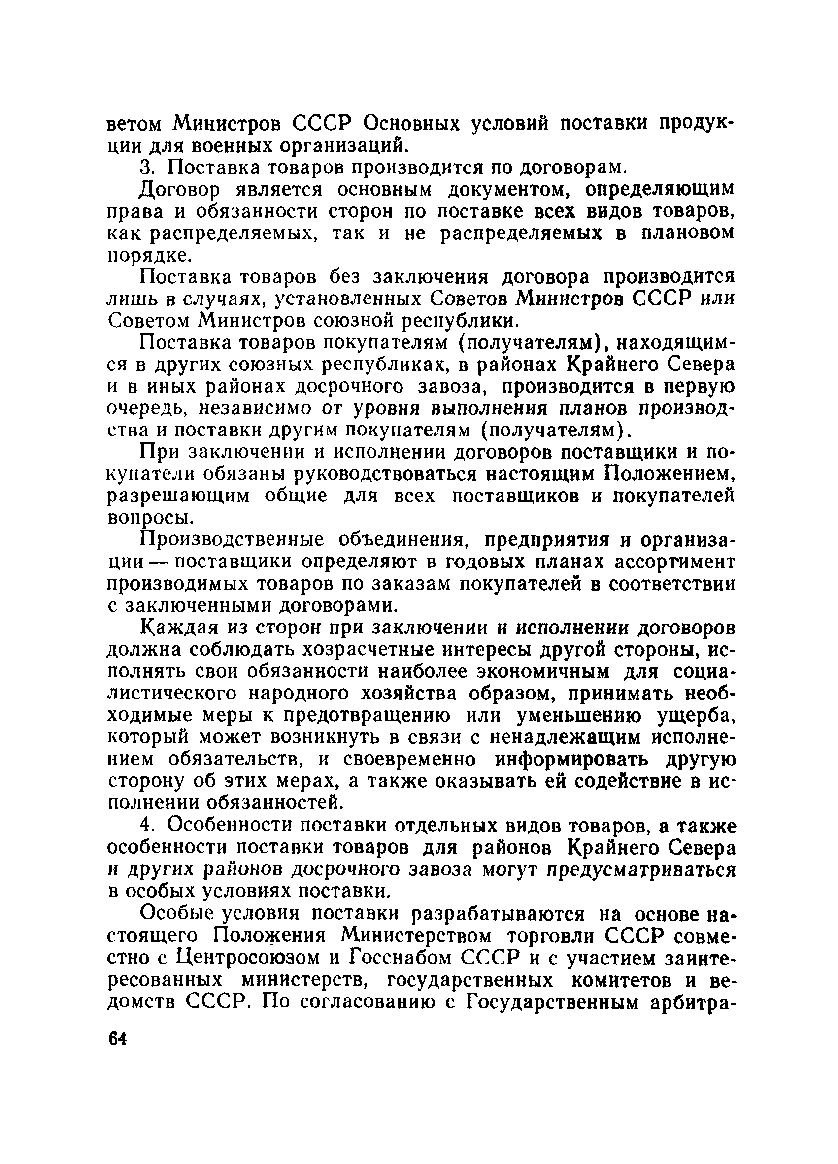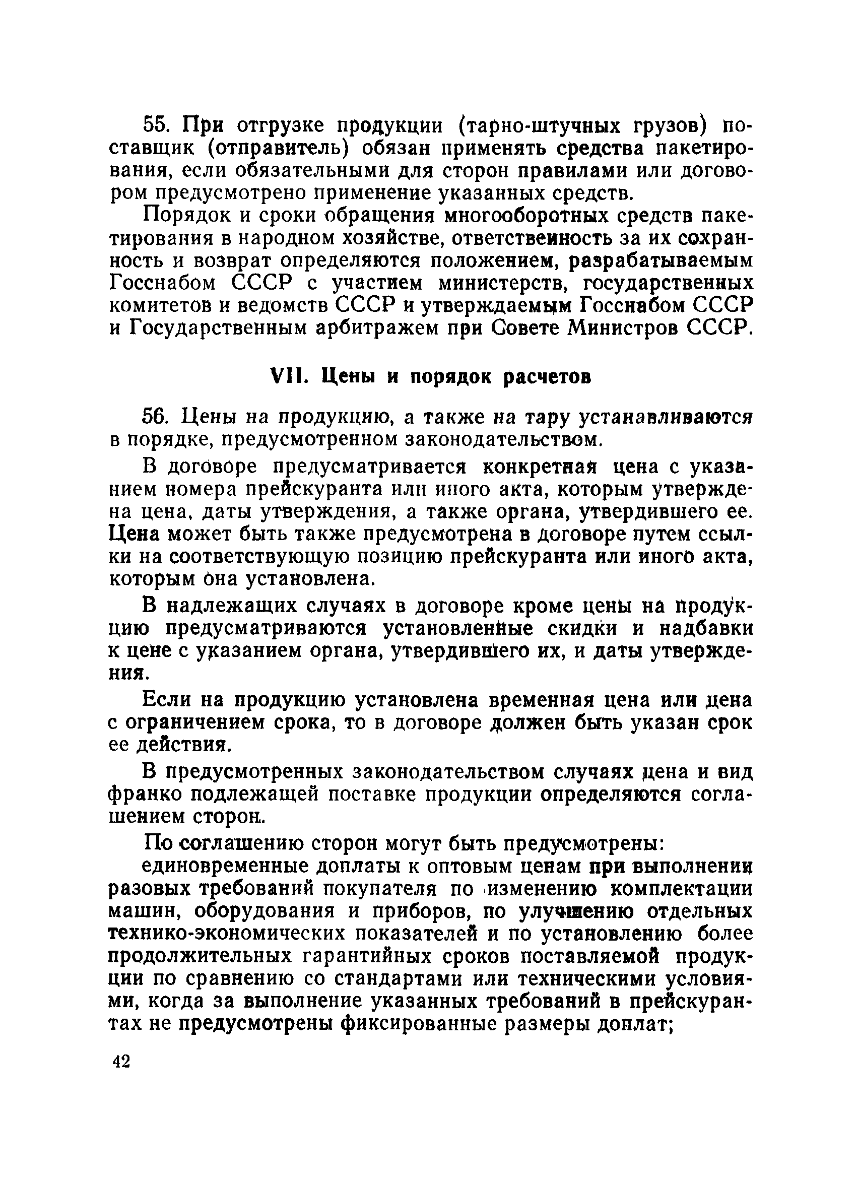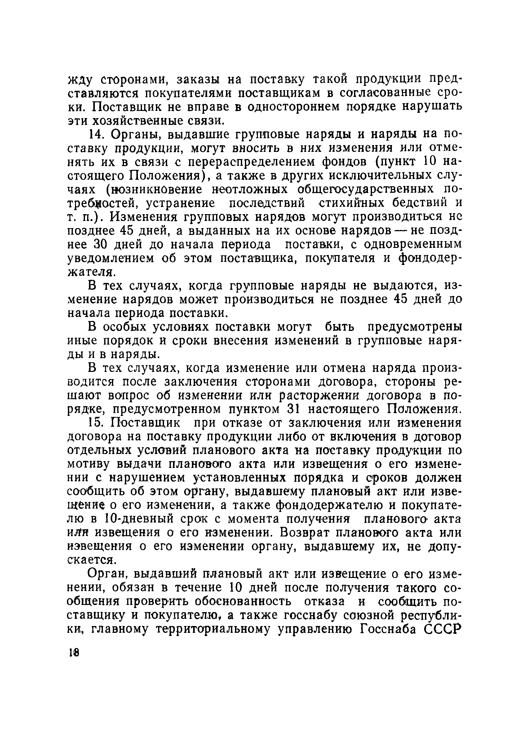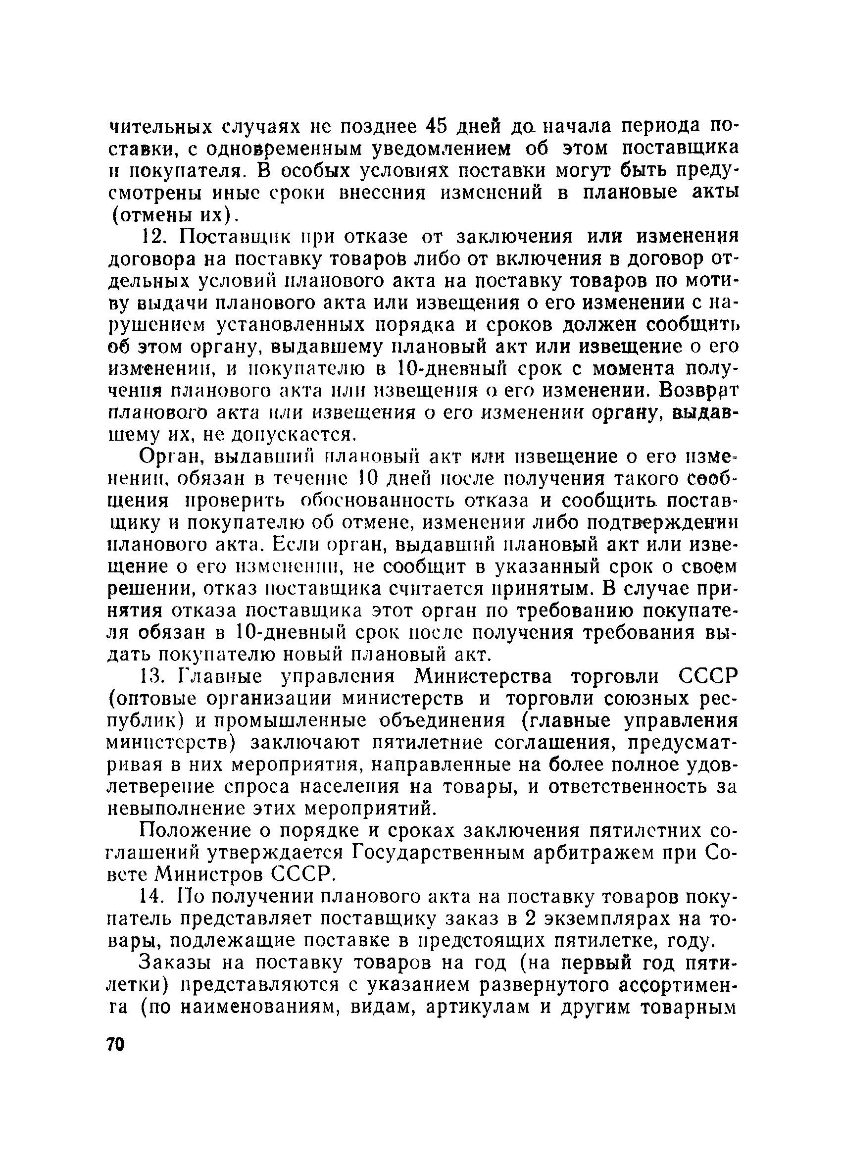| Оглавление: | Положение о поставках продукции производственно-технического назначения I. Общие положения II. Плановые основания заключения договоров и организация хозяйственных связей III. Порядок и сроки заключения договоров IV. Количество, сроки и порядок поставки продукции V. Качество и комплектность продукции VI. Тара, упаковка и средства пакетирования продукции VII. Цены и порядок расчетов VIII. Имущественная ответственность Положение о поставках товаров народного потребления I. Общие положения II. Плановые основания заключения договоров и организация хозяйственных связей III. Порядок и сроки заключения договоров на поставку товаров IV. Количество, ассортимент, сроки и порядок поставки товаров V. Качество и комплектность товаров VI. Тара, упаковка и средства пакетирования товаров VII. Цены и порядок расчетов VIII. Имущественная ответственность Перечень утративших силу решений Правительства СССР Изменения, которые вносятся в решения Правительства СССР |