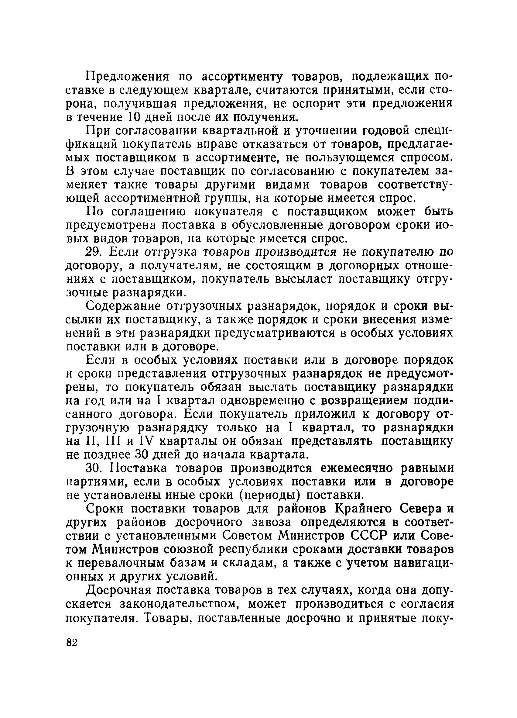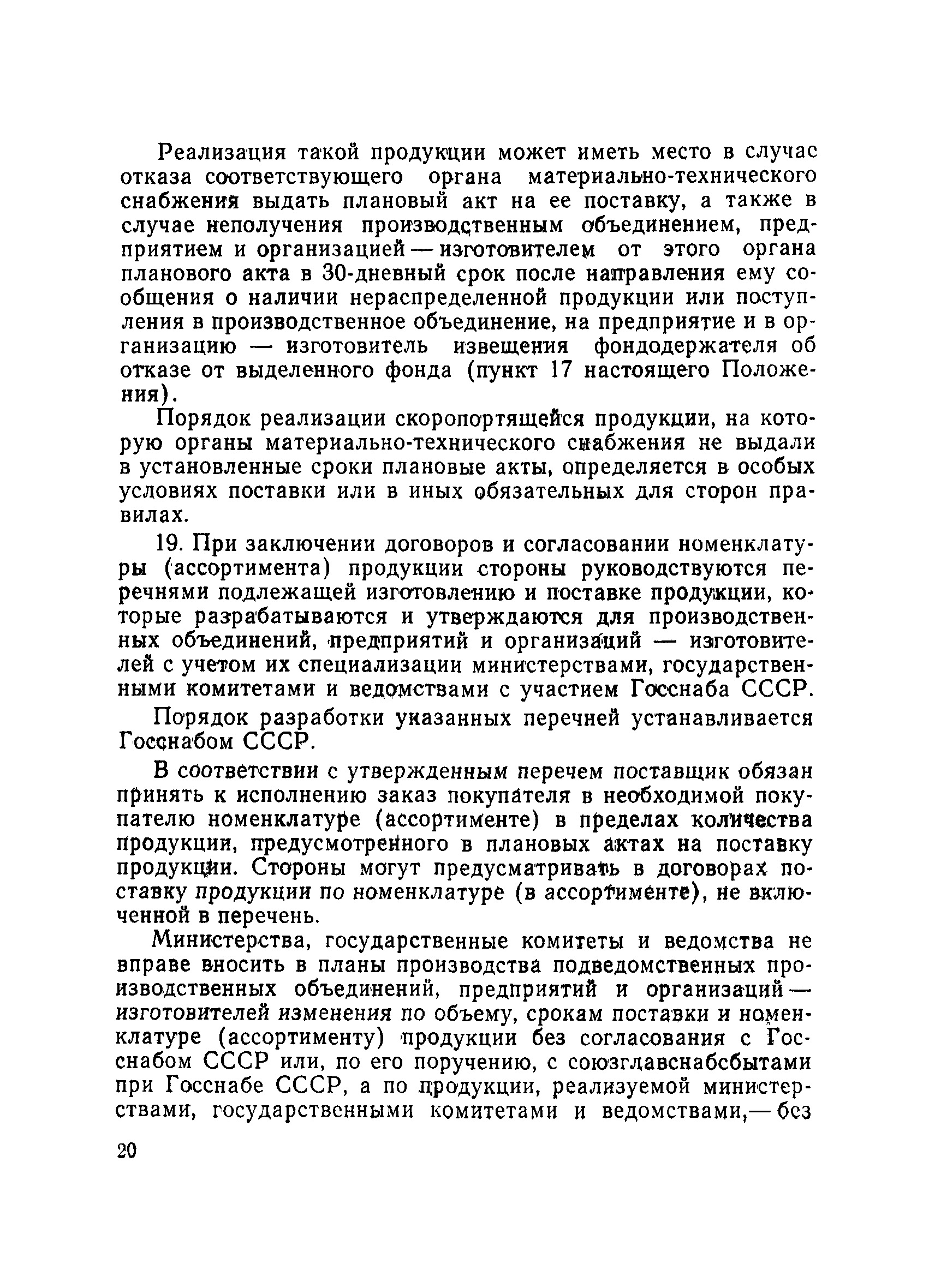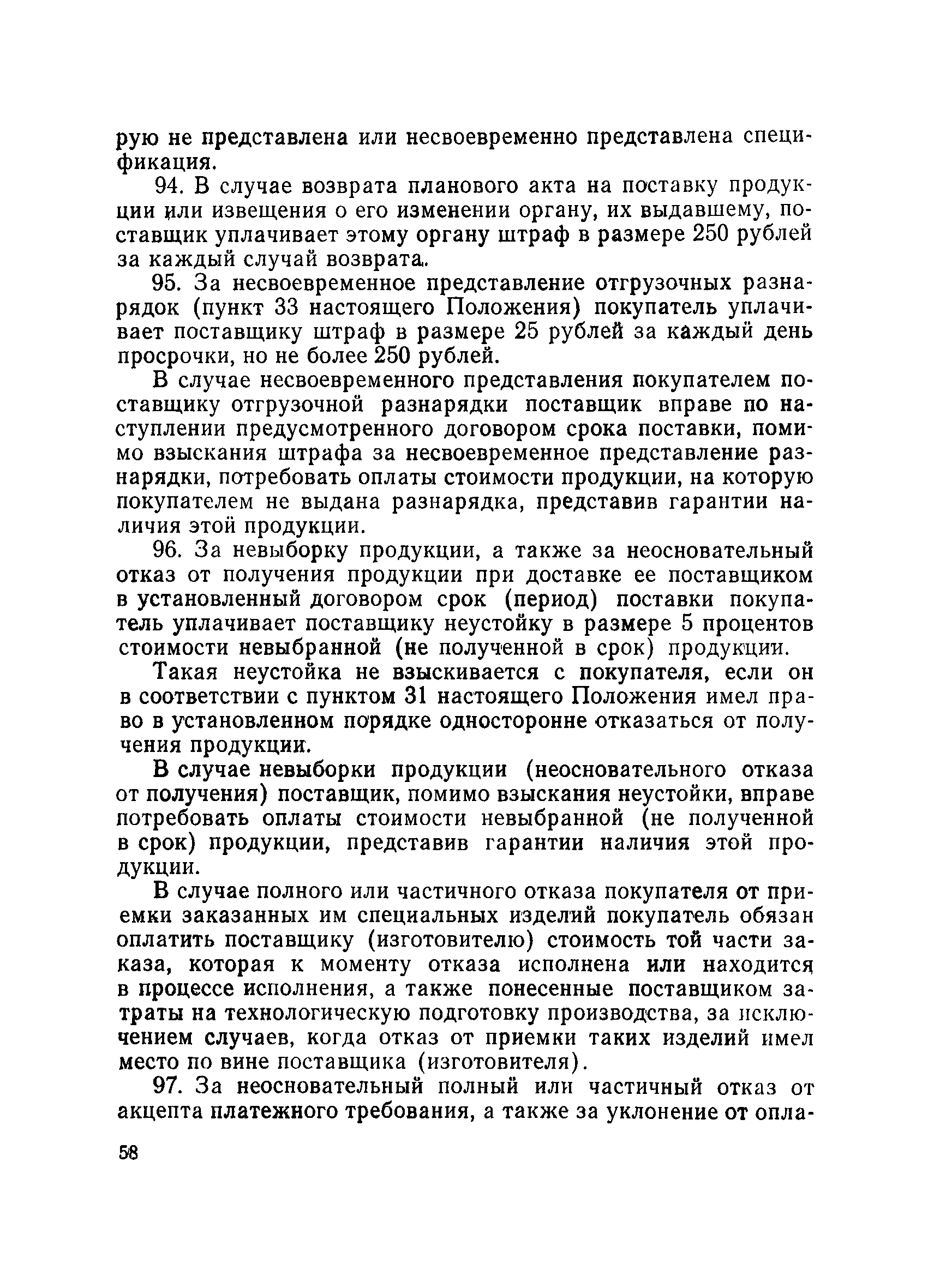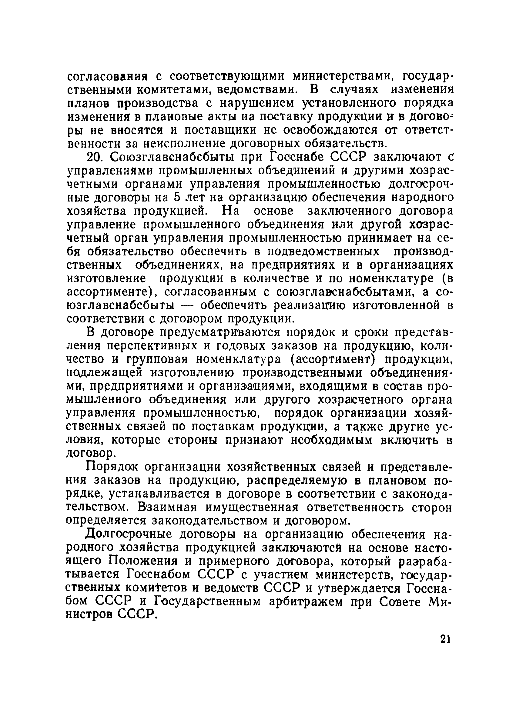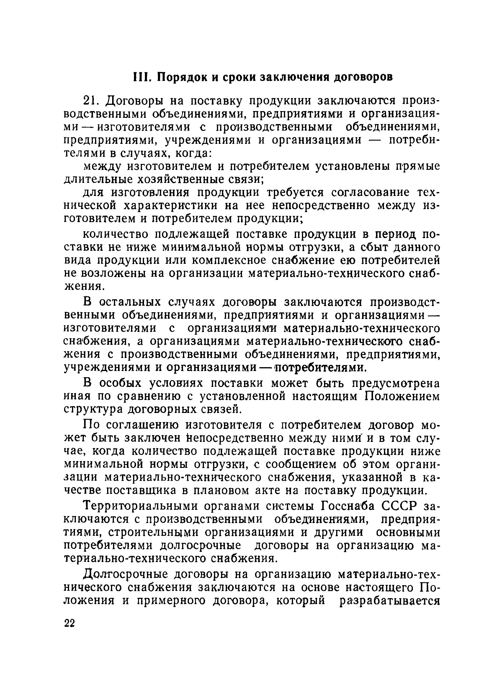 | Оглавление: | Положение о поставках продукции производственно-технического назначения I. Общие положения II. Плановые основания заключения договоров и организация хозяйственных связей III. Порядок и сроки заключения договоров IV. Количество, сроки и порядок поставки продукции V. Качество и комплектность продукции VI. Тара, упаковка и средства пакетирования продукции VII. Цены и порядок расчетов VIII. Имущественная ответственность Положение о поставках товаров народного потребления I. Общие положения II. Плановые основания заключения договоров и организация хозяйственных связей III. Порядок и сроки заключения договоров на поставку товаров IV. Количество, ассортимент, сроки и порядок поставки товаров V. Качество и комплектность товаров VI. Тара, упаковка и средства пакетирования товаров VII. Цены и порядок расчетов VIII. Имущественная ответственность Перечень утративших силу решений Правительства СССР Изменения, которые вносятся в решения Правительства СССР |