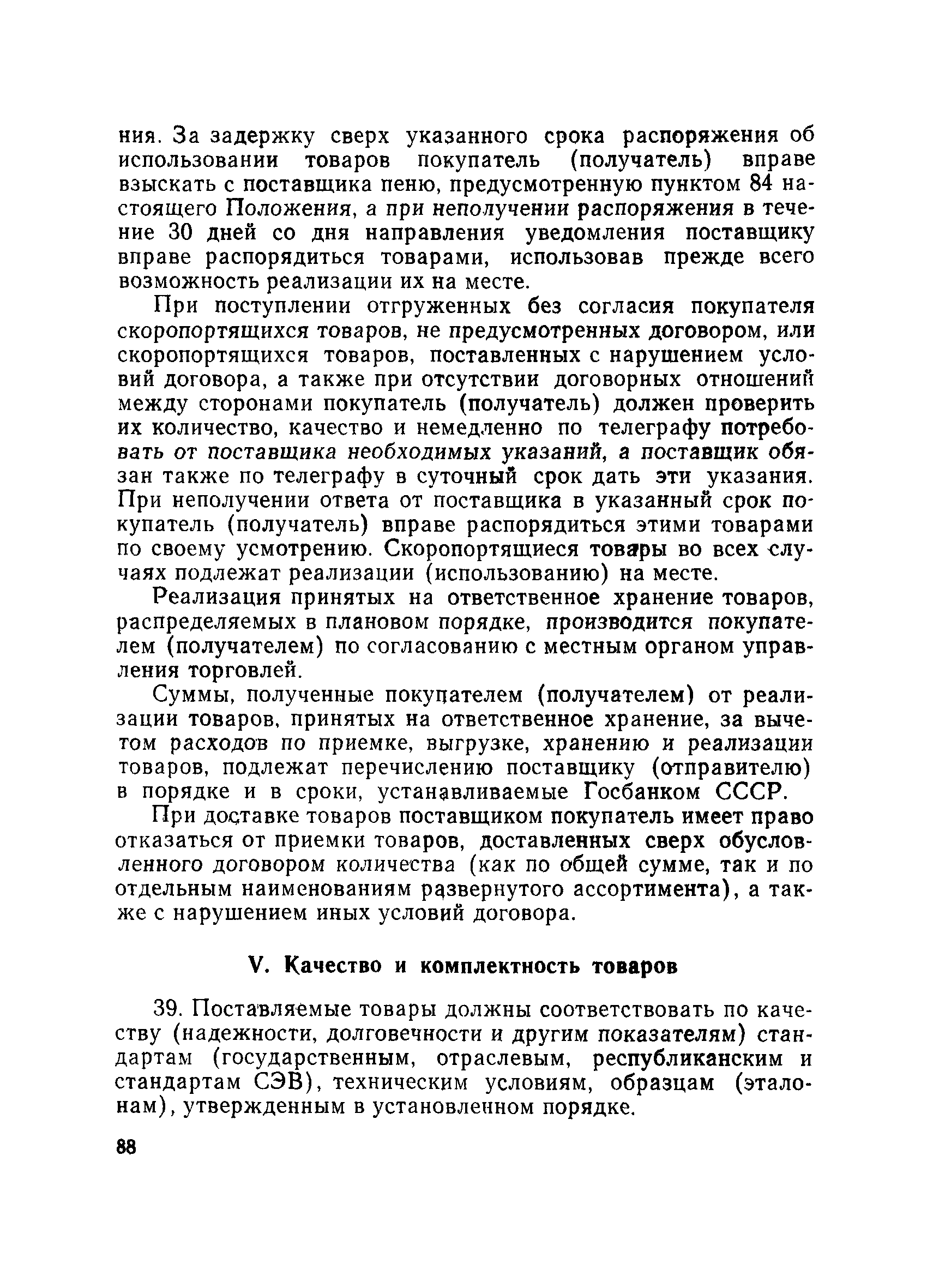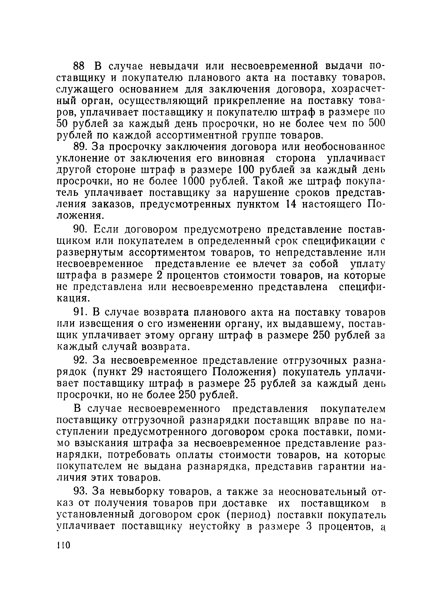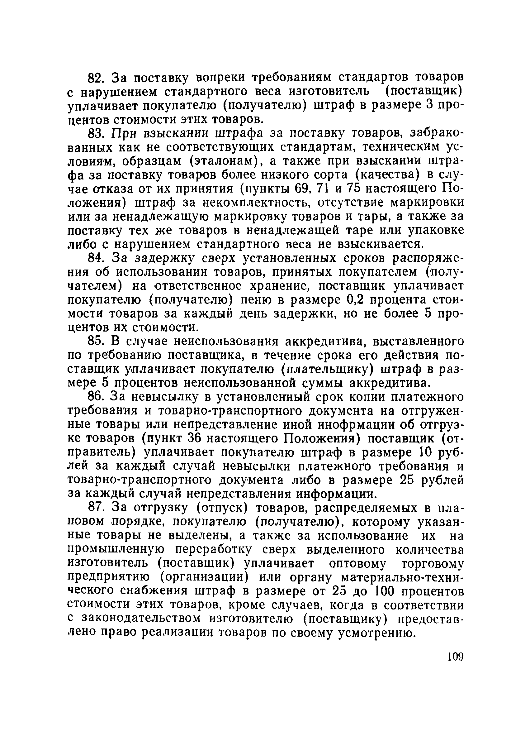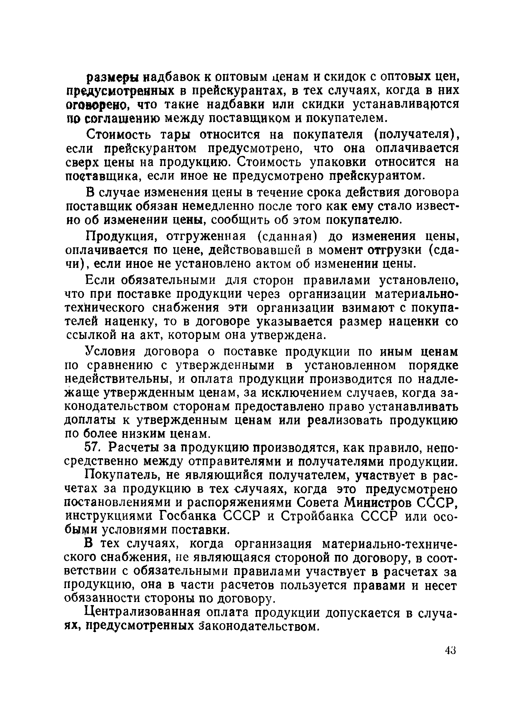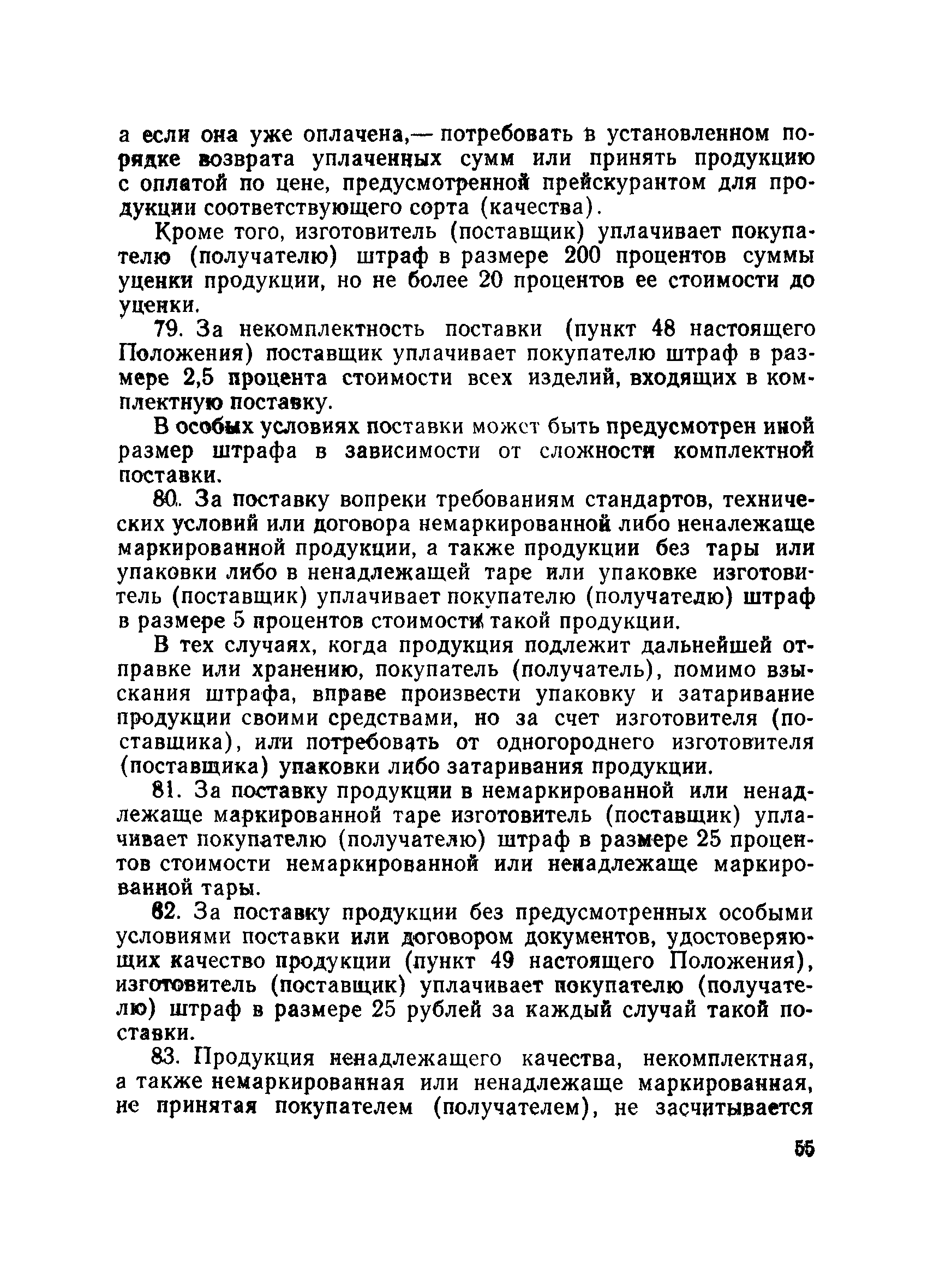 | Оглавление: | Положение о поставках продукции производственно-технического назначения I. Общие положения II. Плановые основания заключения договоров и организация хозяйственных связей III. Порядок и сроки заключения договоров IV. Количество, сроки и порядок поставки продукции V. Качество и комплектность продукции VI. Тара, упаковка и средства пакетирования продукции VII. Цены и порядок расчетов VIII. Имущественная ответственность Положение о поставках товаров народного потребления I. Общие положения II. Плановые основания заключения договоров и организация хозяйственных связей III. Порядок и сроки заключения договоров на поставку товаров IV. Количество, ассортимент, сроки и порядок поставки товаров V. Качество и комплектность товаров VI. Тара, упаковка и средства пакетирования товаров VII. Цены и порядок расчетов VIII. Имущественная ответственность Перечень утративших силу решений Правительства СССР Изменения, которые вносятся в решения Правительства СССР |